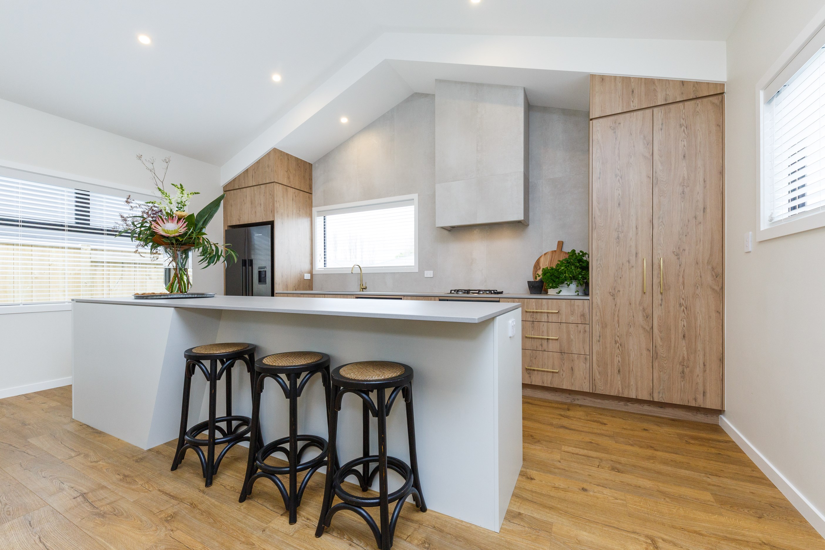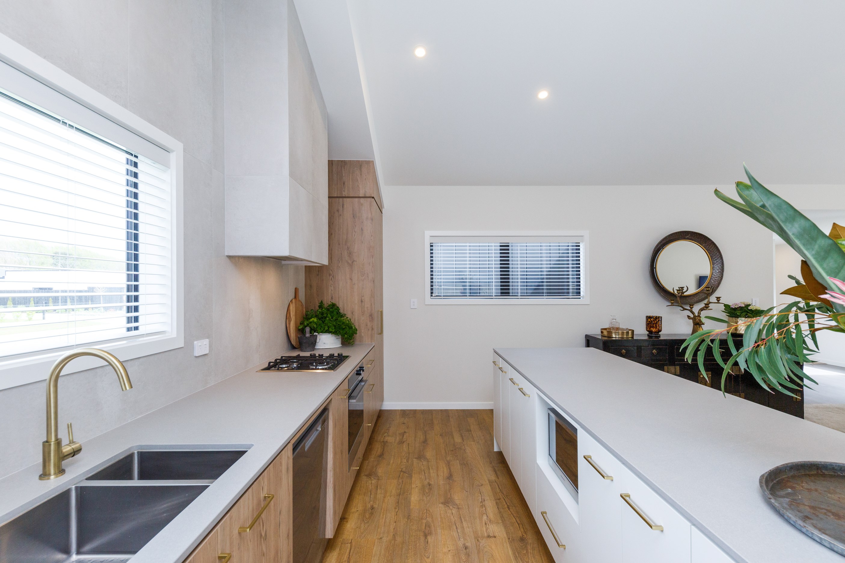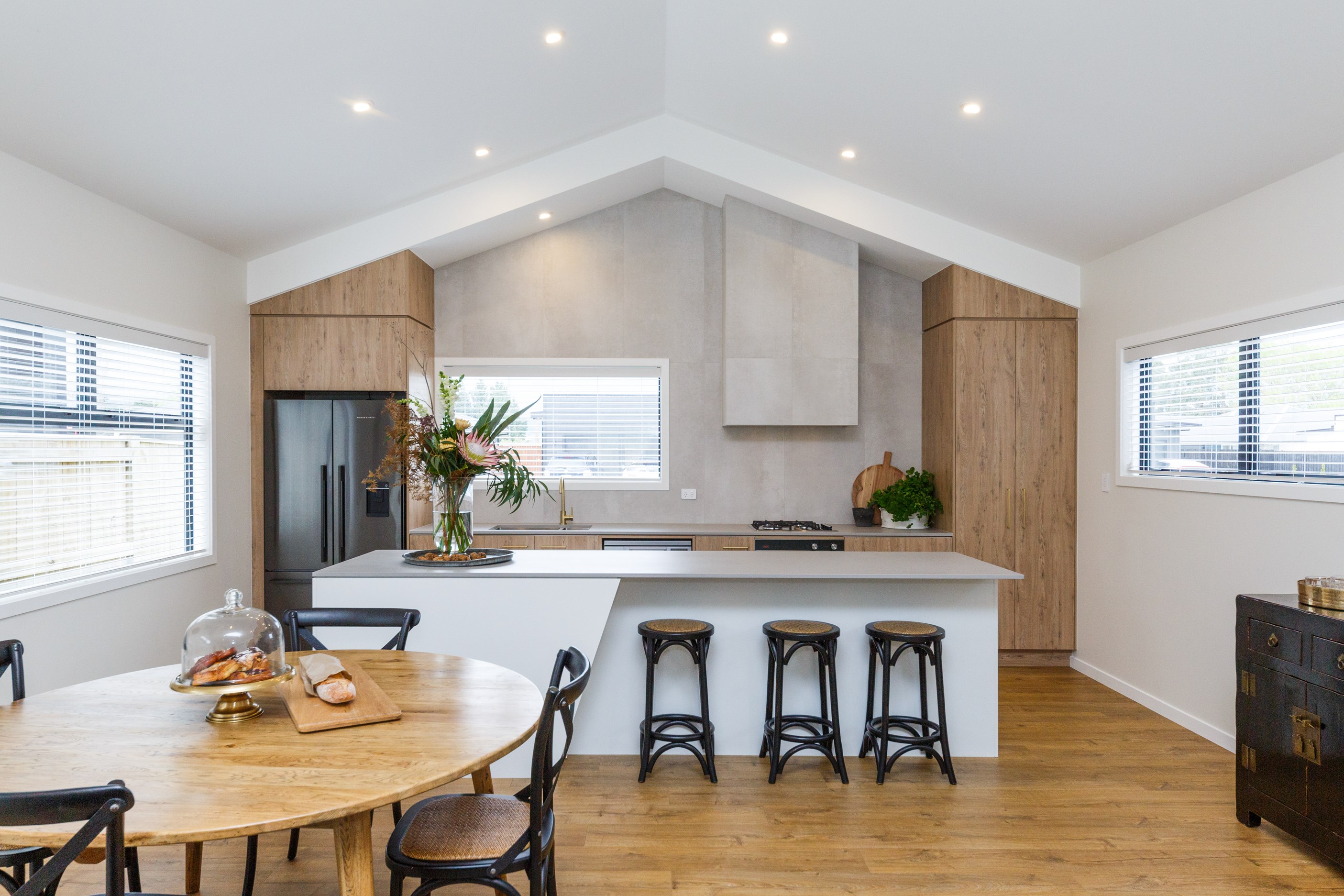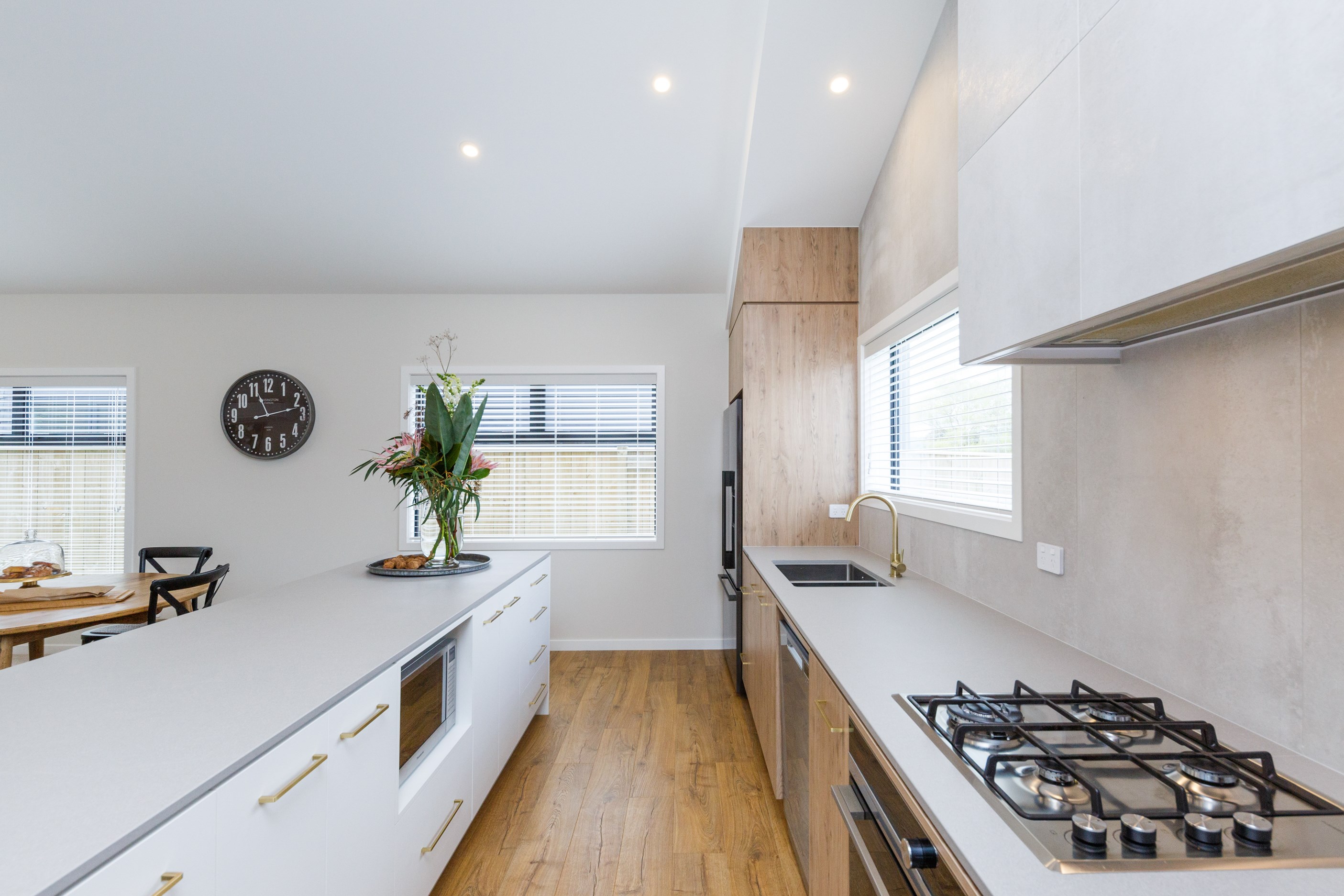 One pavilion has uninterrupted open-plan living anchored by a designer kitchen. With raked ceilings rising to 2.7m, followed by bulkheads, the space is airy and spacious feeling. A tiled feature wall with an integrated rangehood in the kitchen adds to the sense of openness and Dekton benchtops complete the stylish picture.