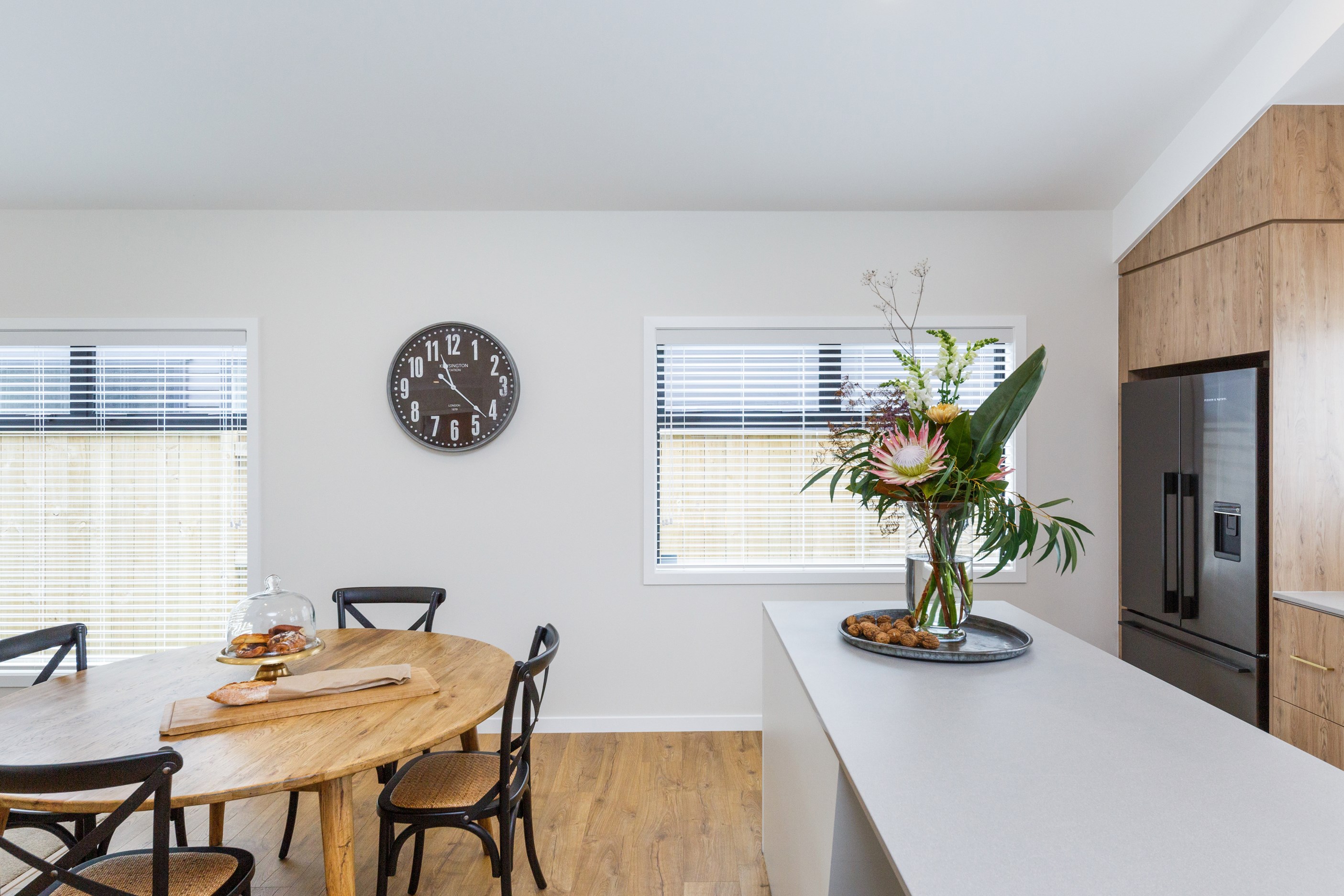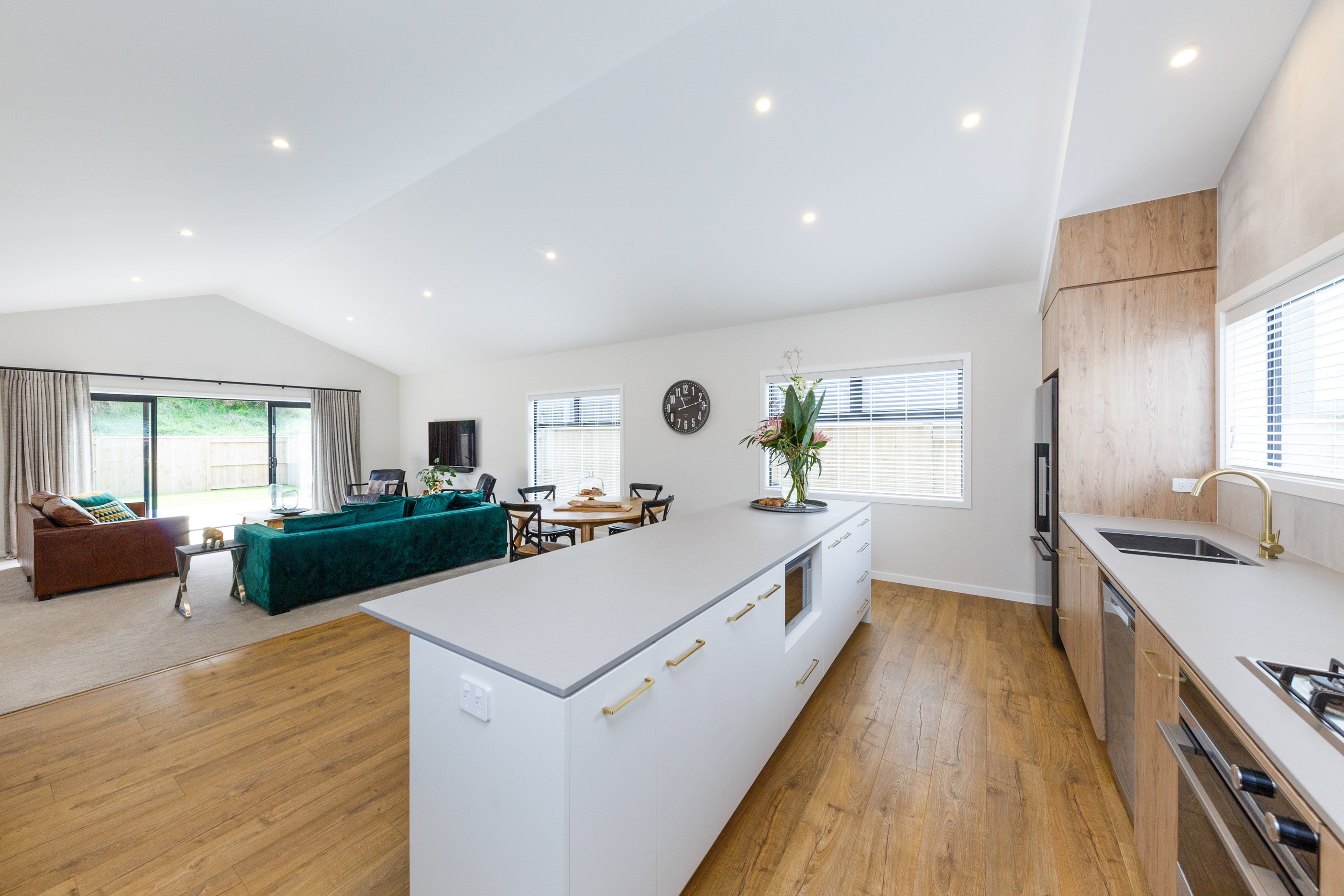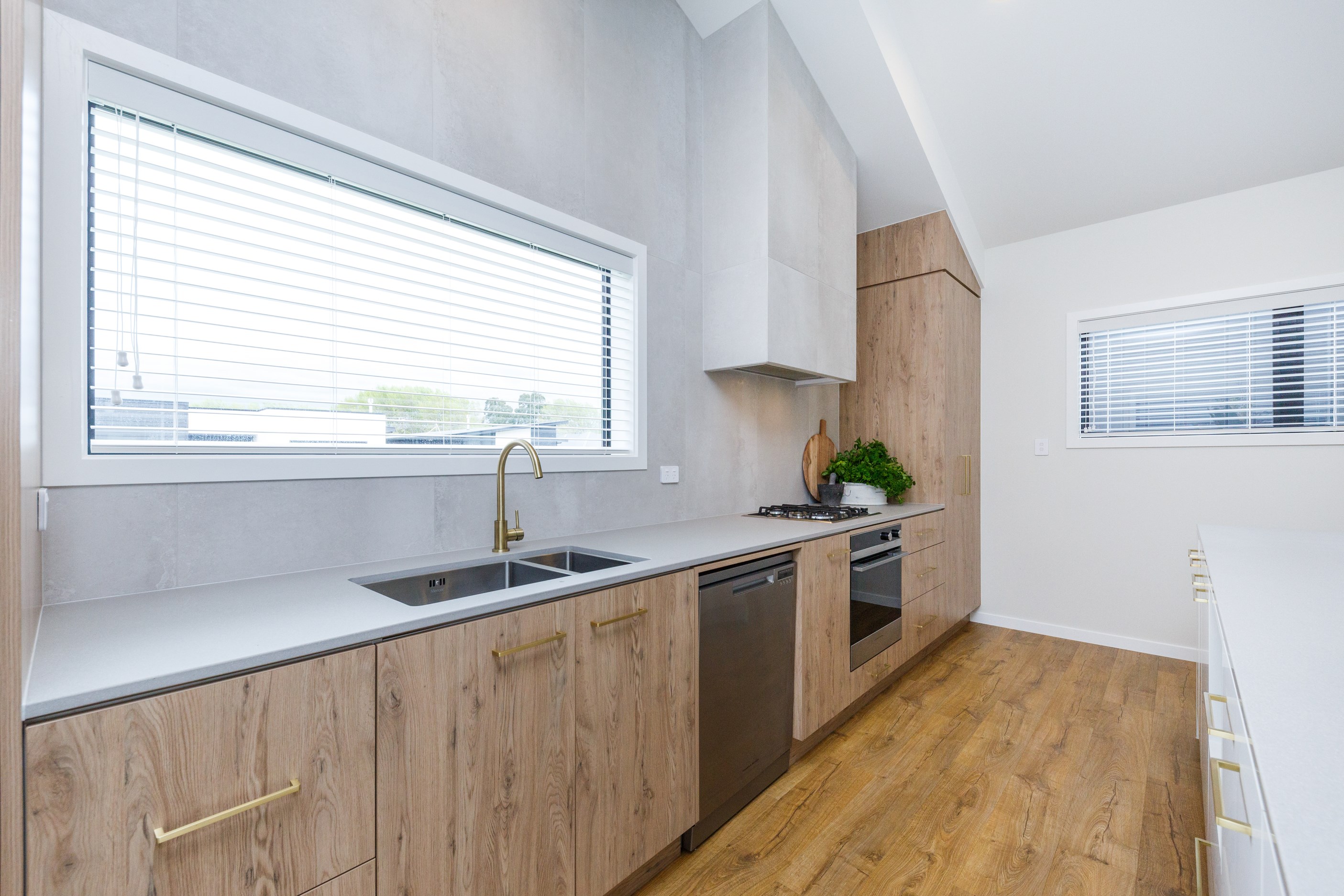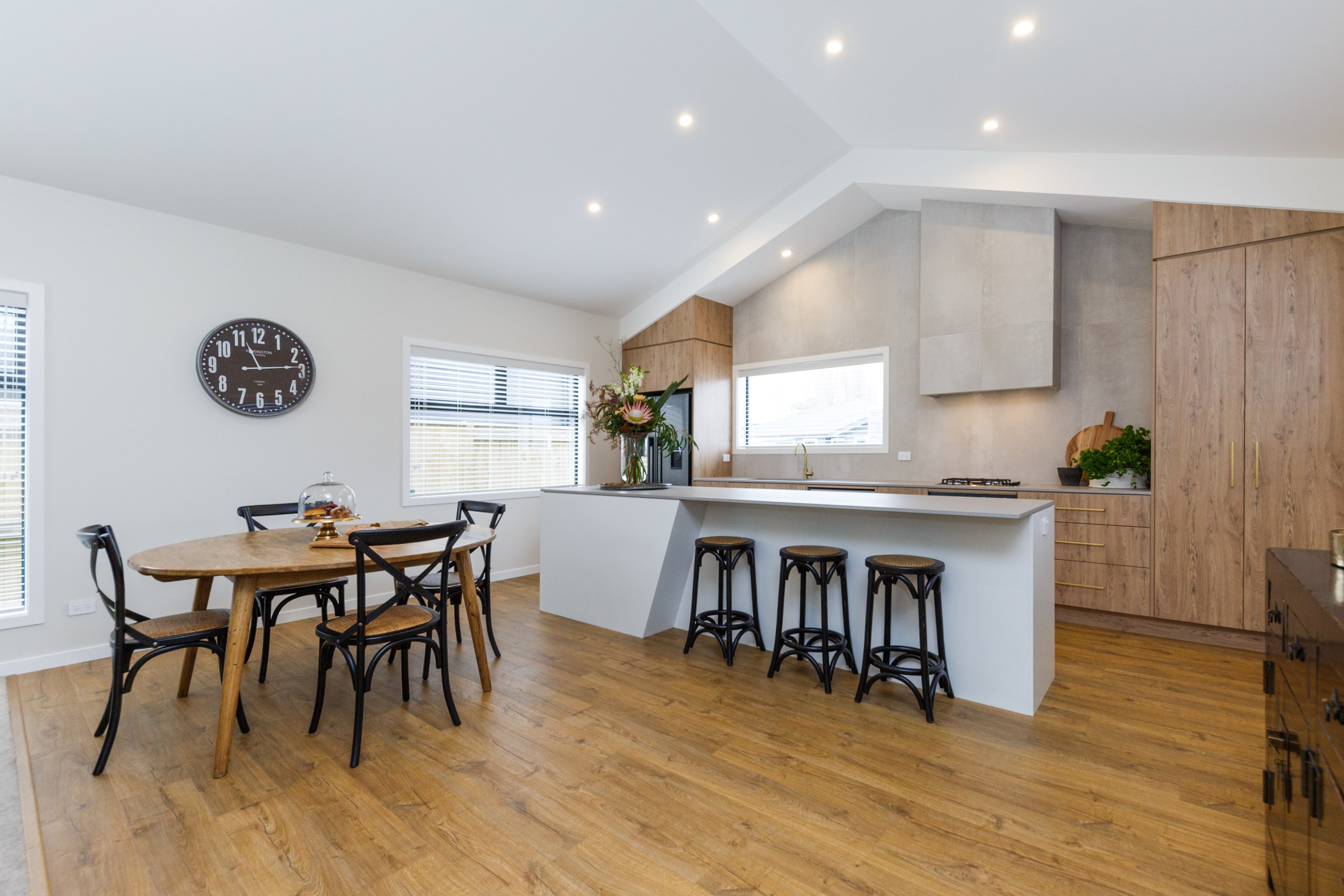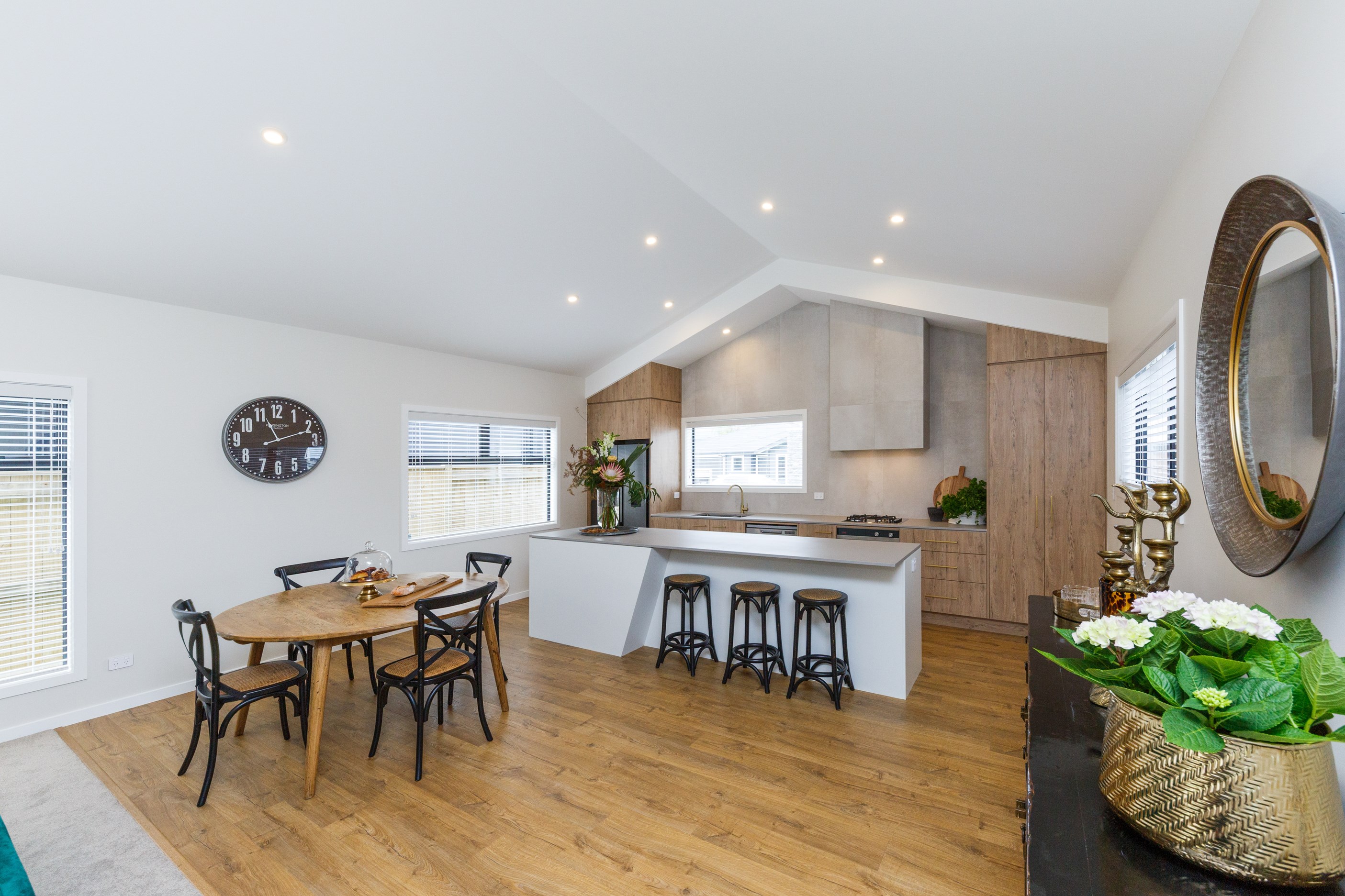 One pavilion has uninterrupted open-plan living anchored by a designer kitchen. With raked ceilings rising to 2.7m, followed by bulkheads, the space is airy and spacious feeling. A tiled feature wall with an integrated rangehood in the kitchen adds to the sense of openness and Dekton benchtops complete the stylish picture.