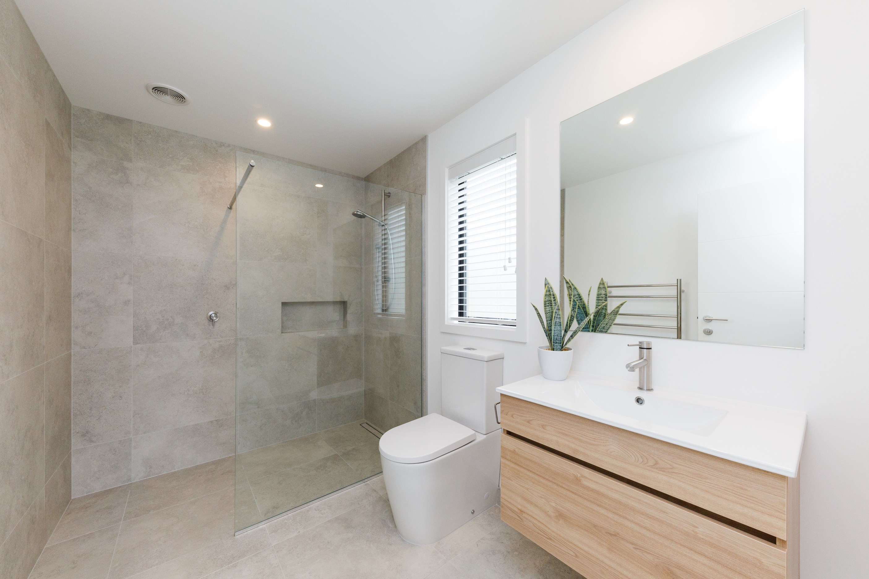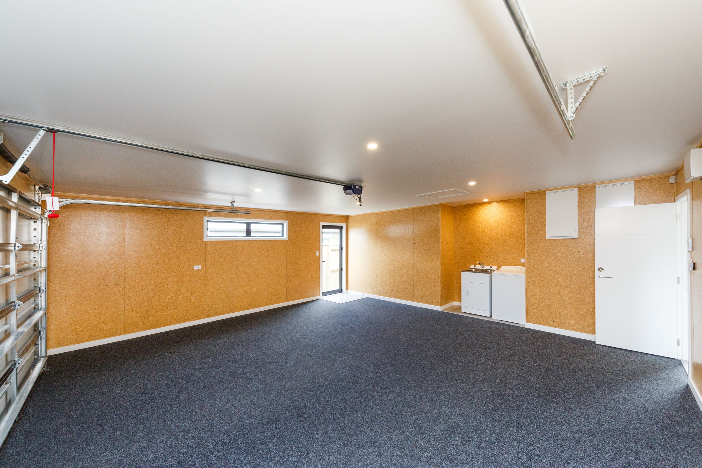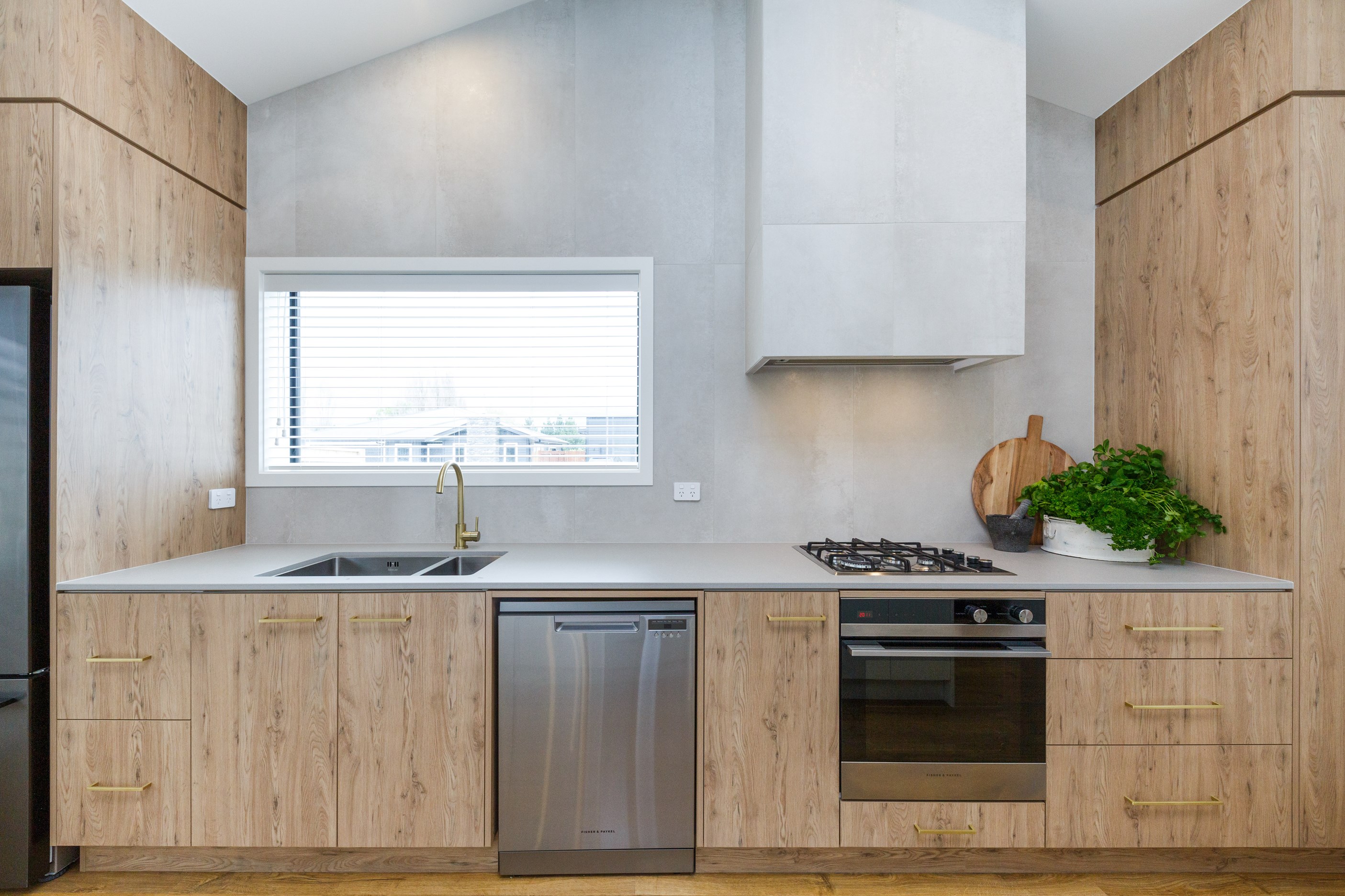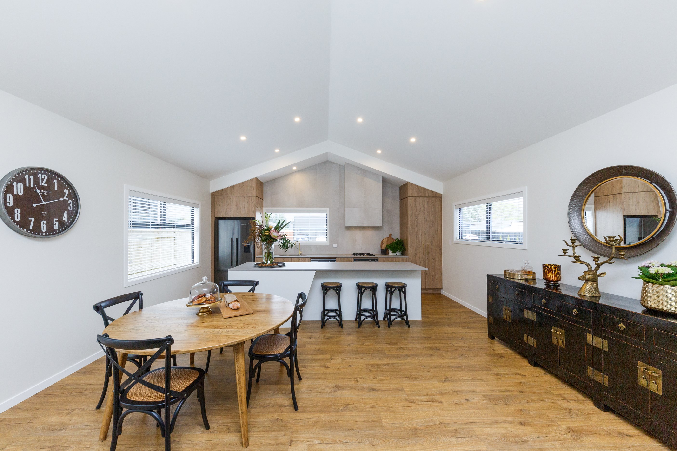One pavilion has uninterrupted open-plan living anchored by a designer kitchen. With raked ceilings rising to 2.7m, followed by bulkheads, the space is airy and spacious feeling. A tiled feature wall with an integrated rangehood in the kitchen adds to the sense of openness and Dekton benchtops complete the stylish picture.