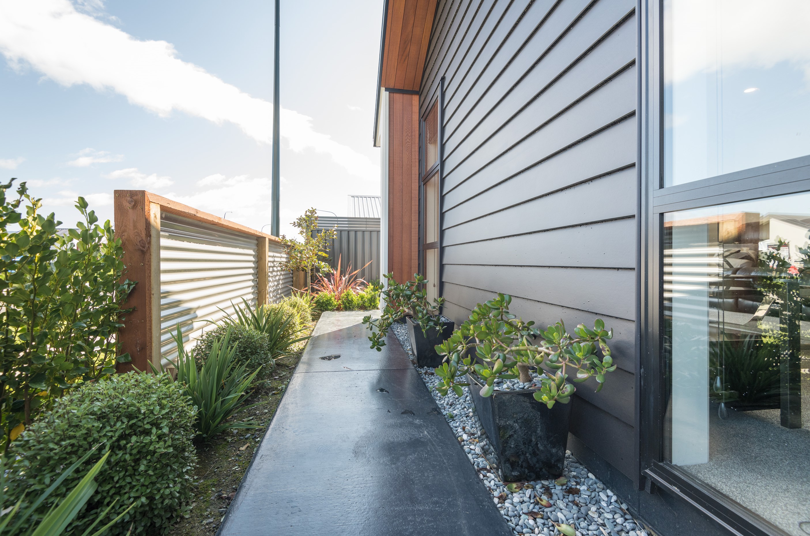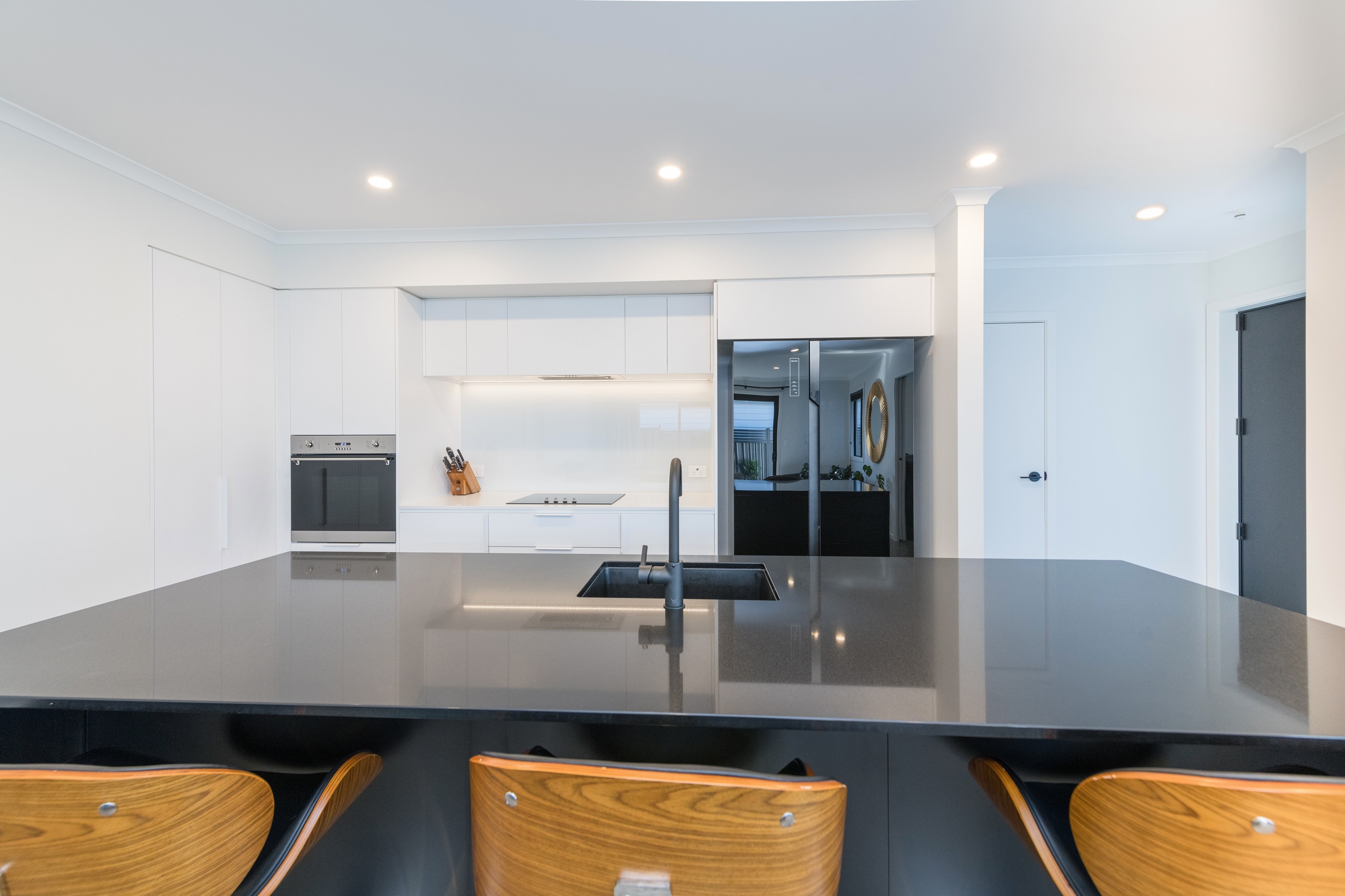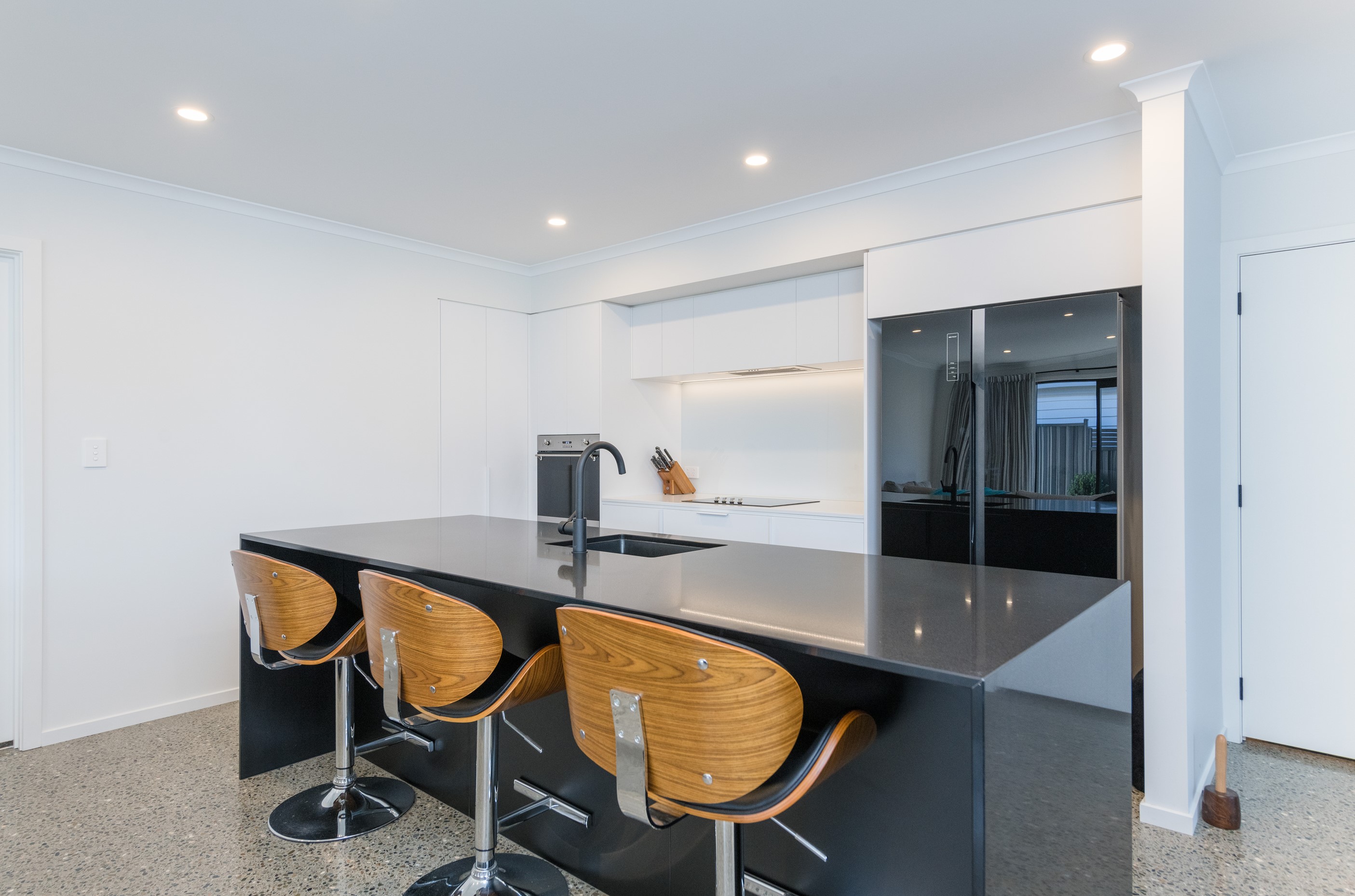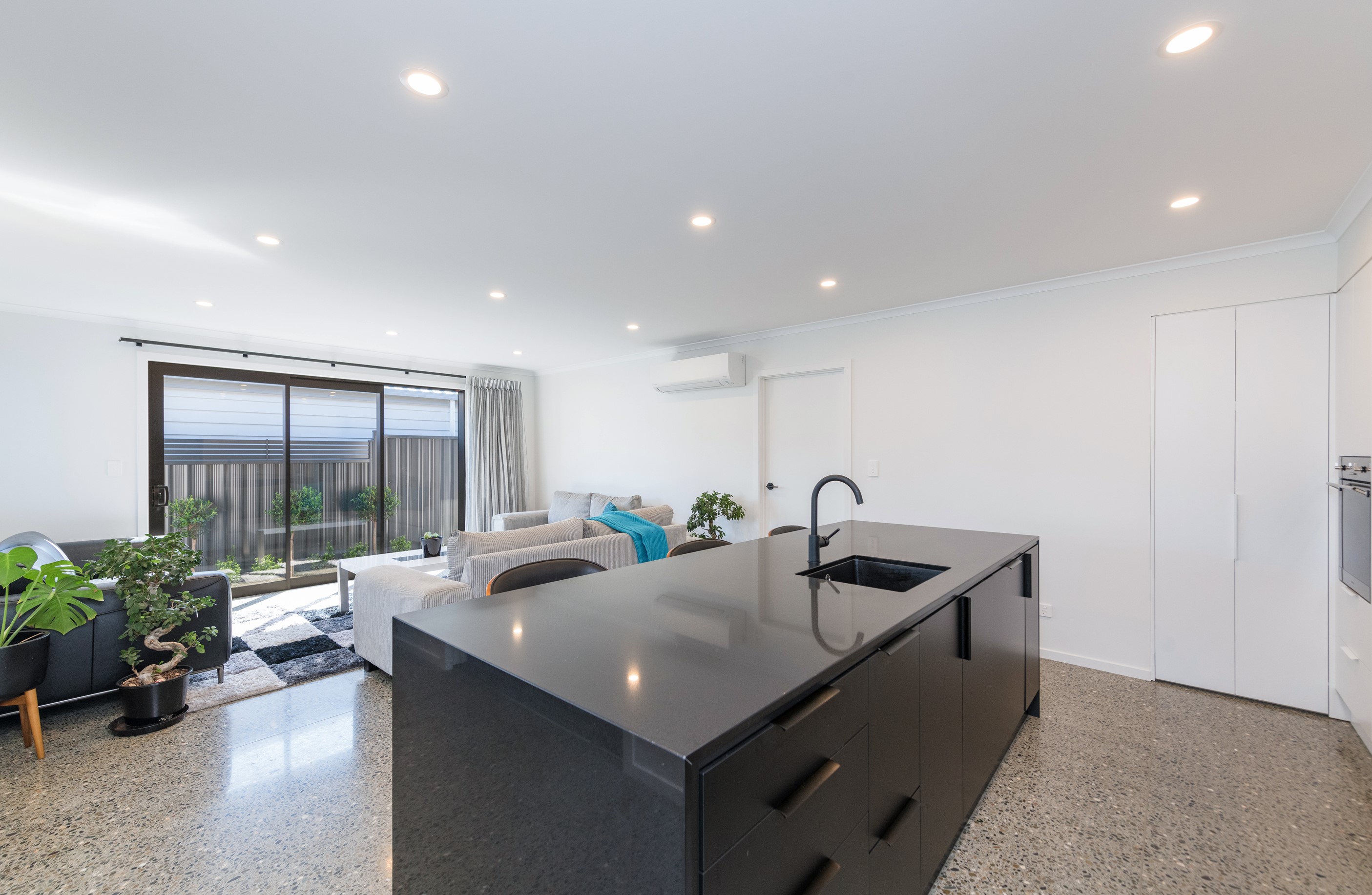 You’ll find a main-bedroom ensuite – with white and grey tiles and premium fittings – as well as a family bathroom. On one side, the living area opens out onto smart paving and considered landscaping. The kitchen’s dark statement benchtop echoes the tones of the Rockcote/Linea cladding found on the home’s sharp exterior. The clever use of recessed lighting makes for an increased feeling of spaciousness and the neutral palette provides a blank canvas onto which the residents can stamp their personal style. The inclusion of a double garage in keeping with the lines of the house is an added bonus.