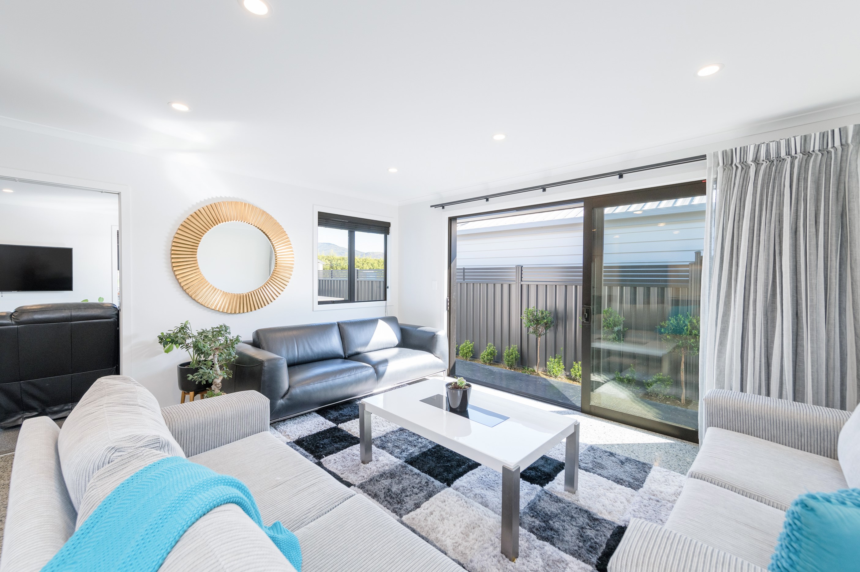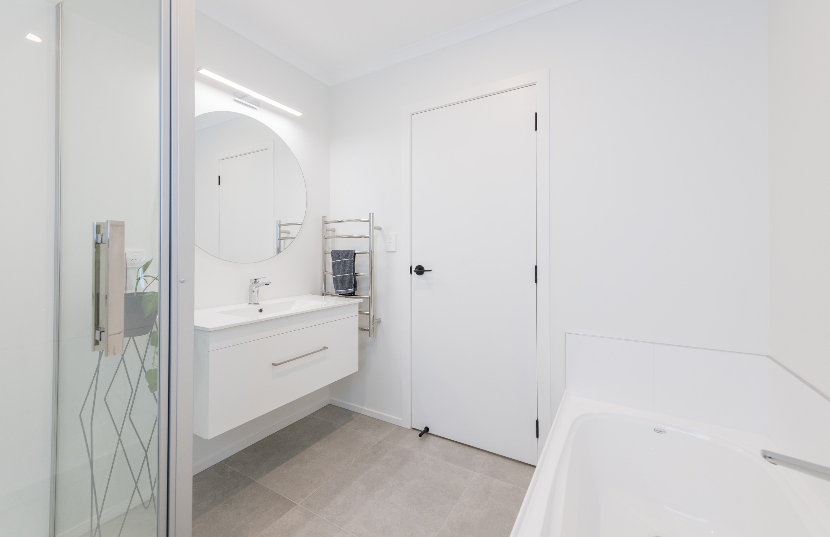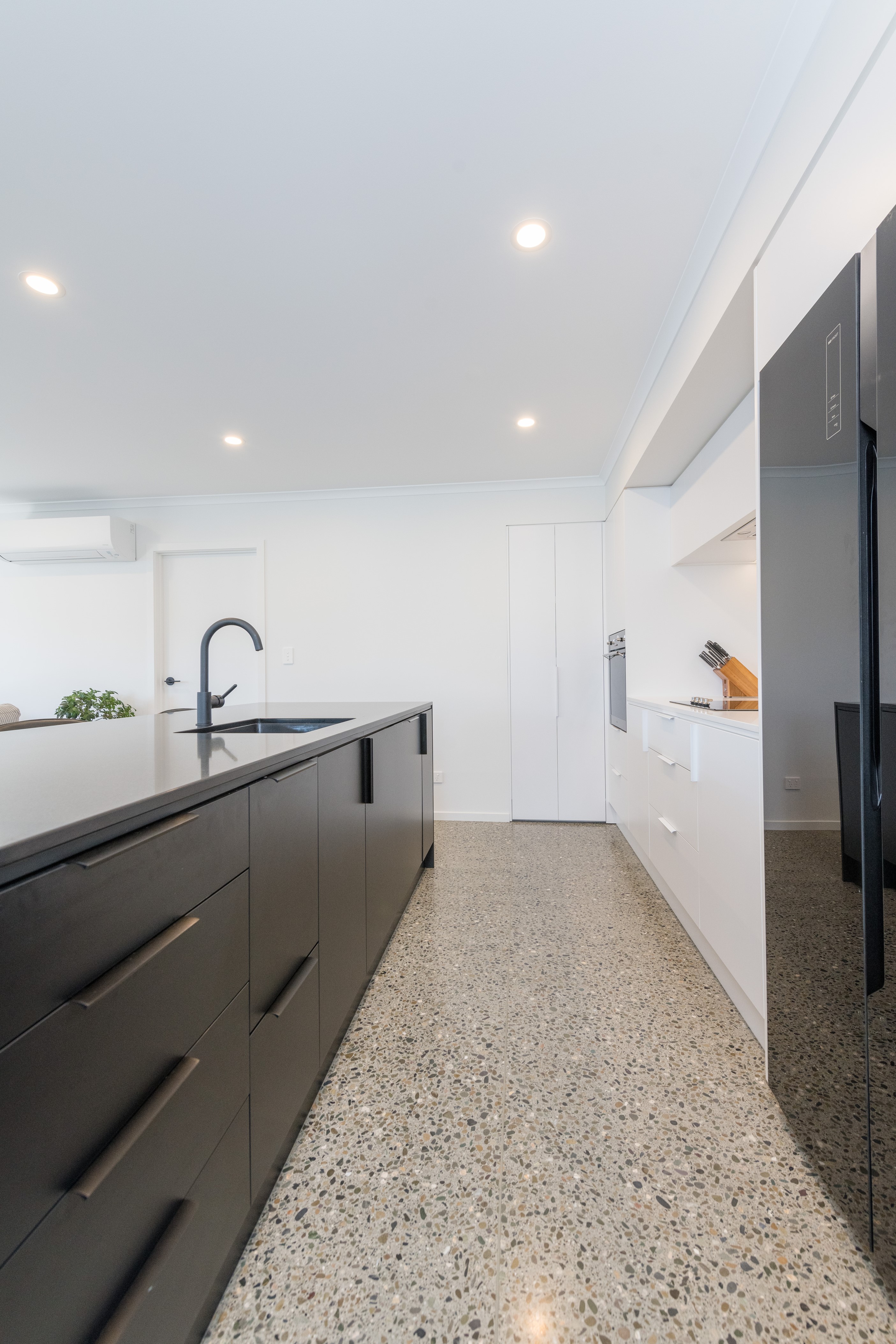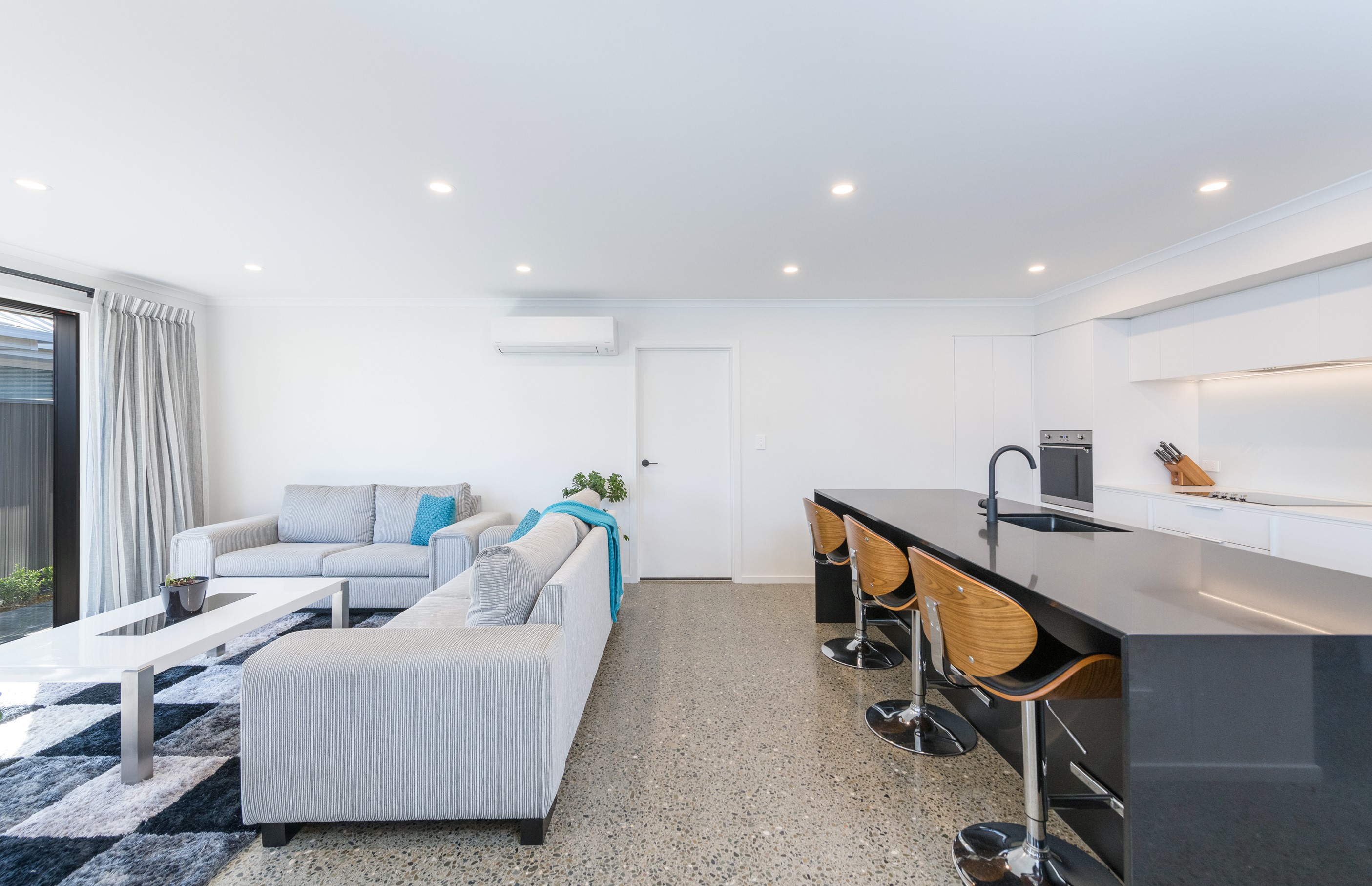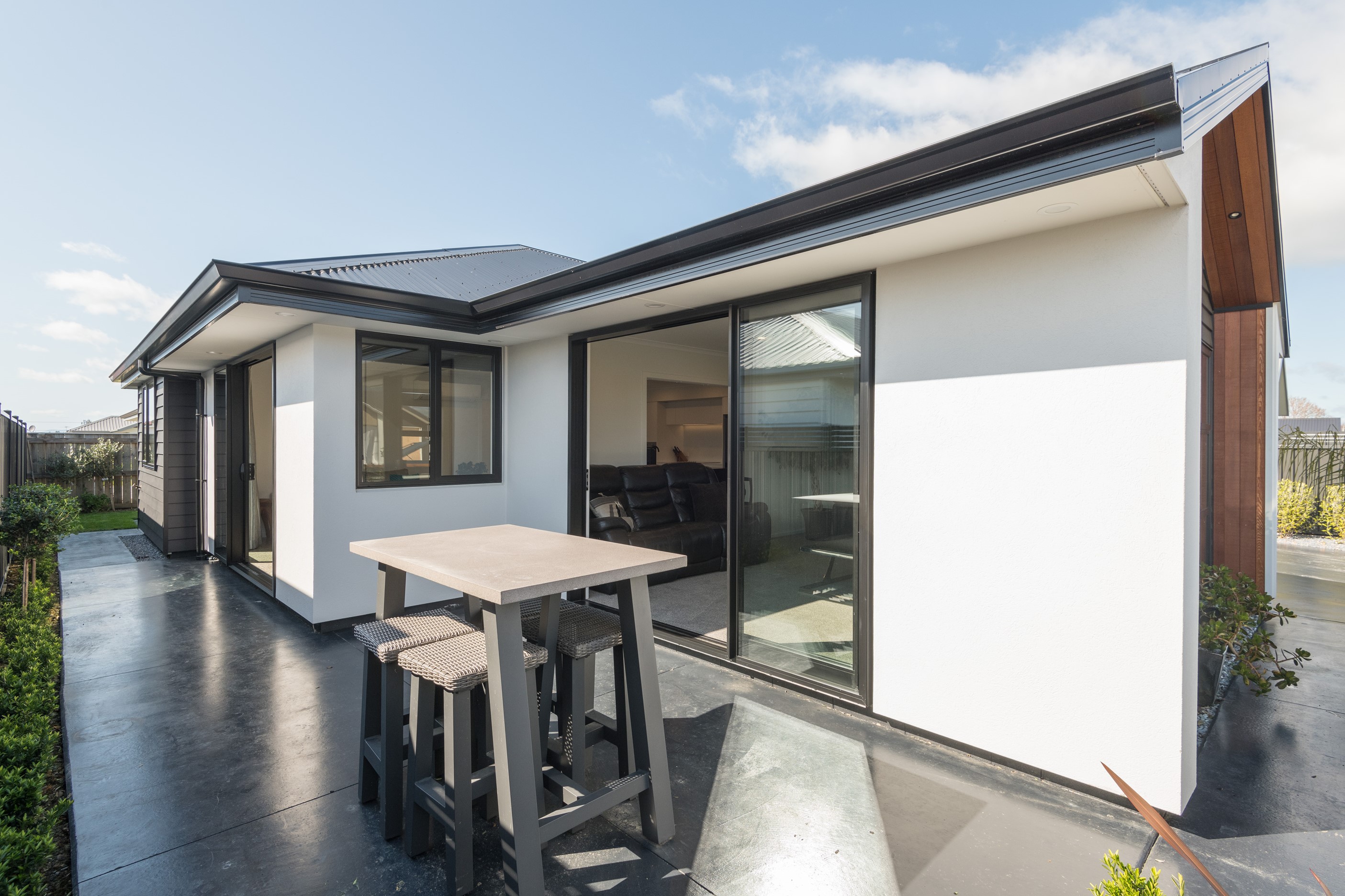 You’ll find a main-bedroom ensuite – with white and grey tiles and premium fittings – as well as a family bathroom. On one side, the living area opens out onto smart paving and considered landscaping. The kitchen’s dark statement benchtop echoes the tones of the Rockcote/Linea cladding found on the home’s sharp exterior. The clever use of recessed lighting makes for an increased feeling of spaciousness and the neutral palette provides a blank canvas onto which the residents can stamp their personal style. The inclusion of a double garage in keeping with the lines of the house is an added bonus.