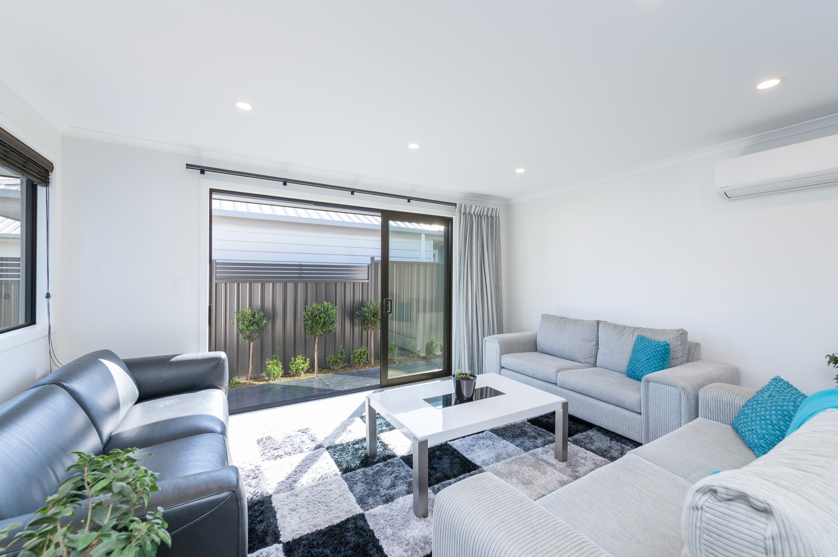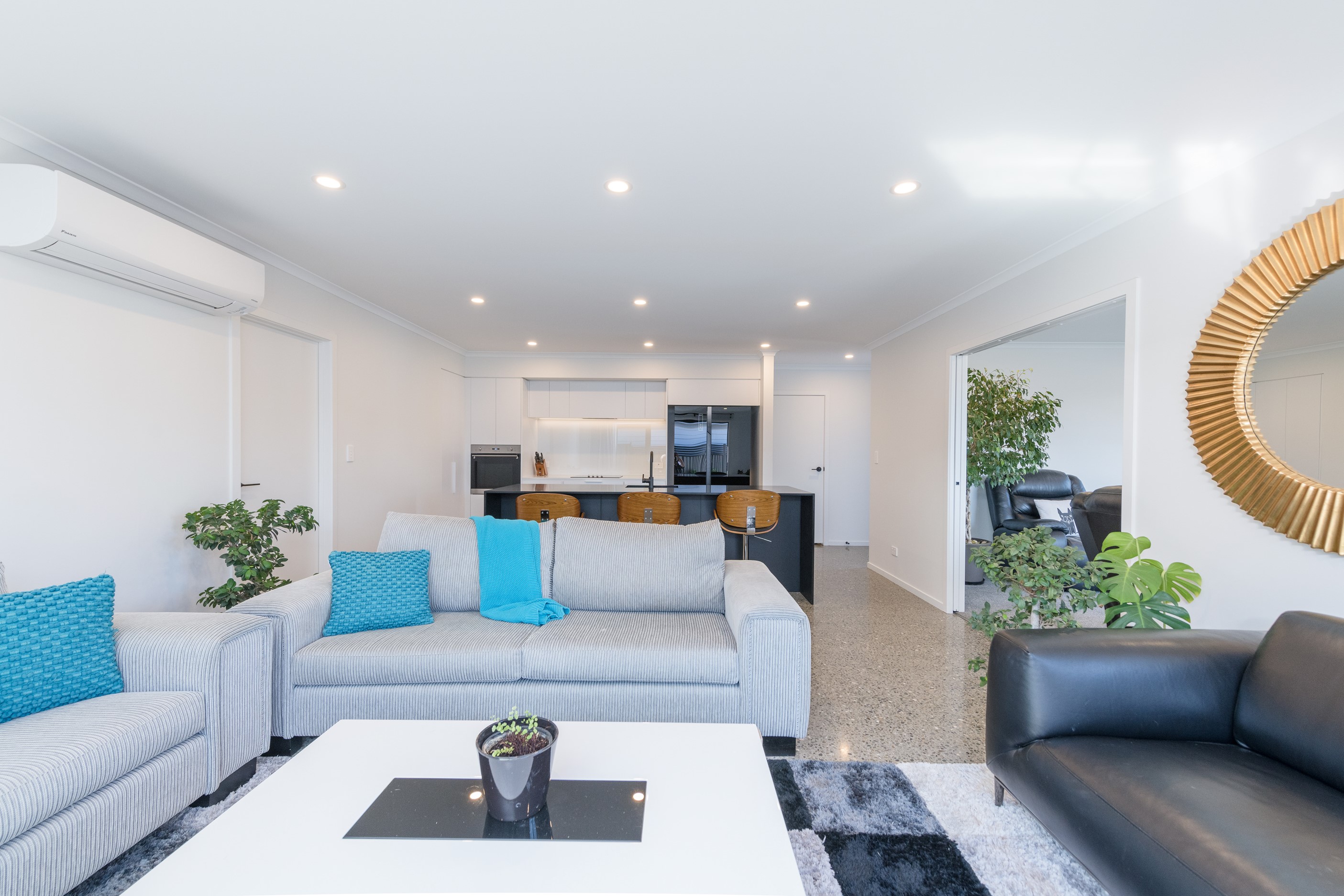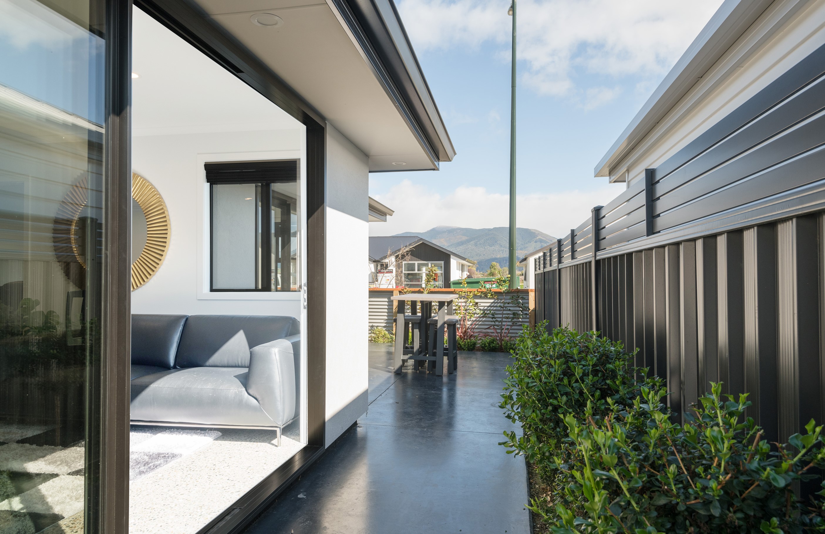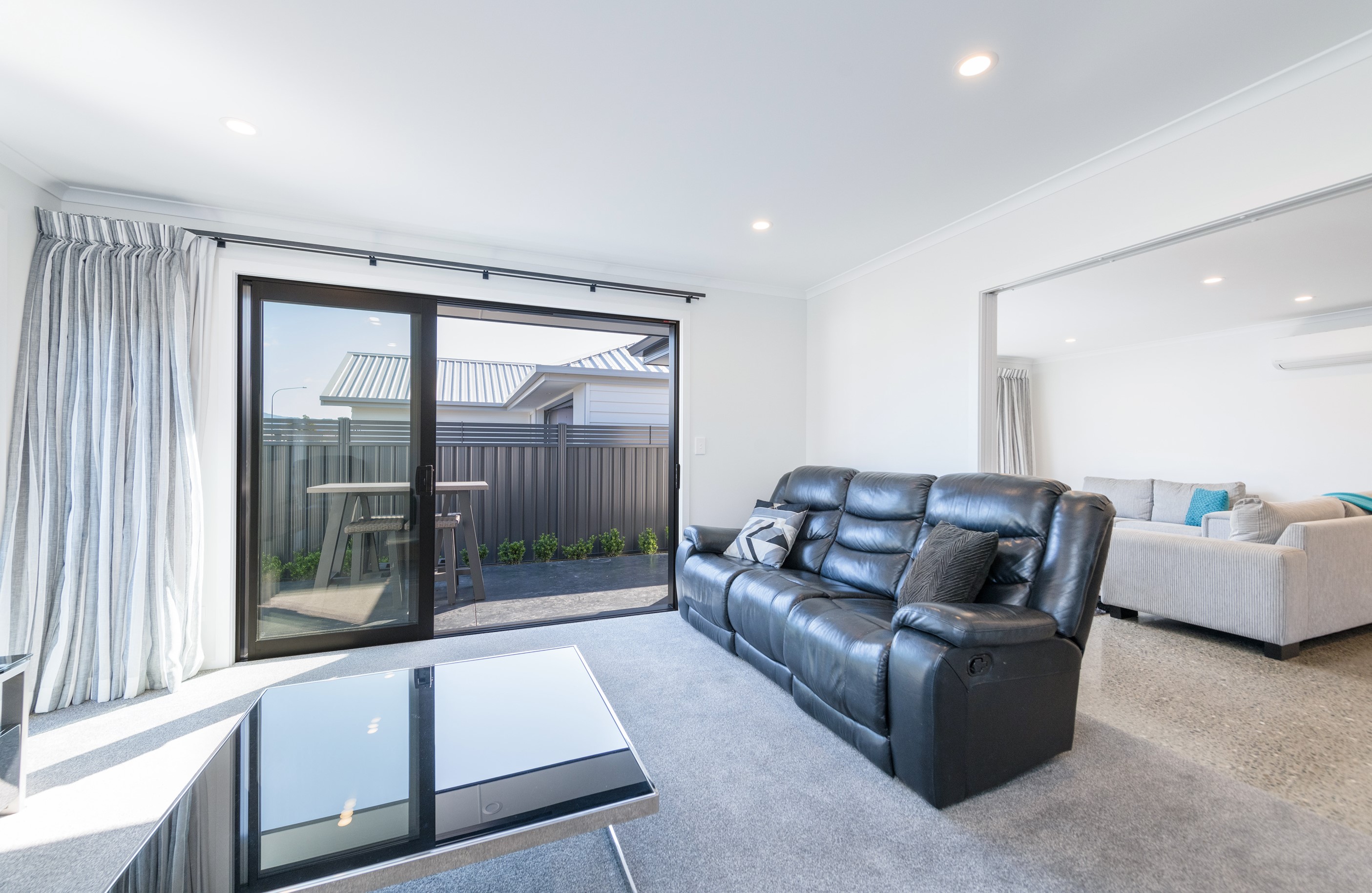 You’ll find a main-bedroom ensuite – with white and grey tiles and premium fittings – as well as a family bathroom. On one side, the living area opens out onto smart paving and considered landscaping. The kitchen’s dark statement benchtop echoes the tones of the Rockcote/Linea cladding found on the home’s sharp exterior. The clever use of recessed lighting makes for an increased feeling of spaciousness and the neutral palette provides a blank canvas onto which the residents can stamp their personal style. The inclusion of a double garage in keeping with the lines of the house is an added bonus.