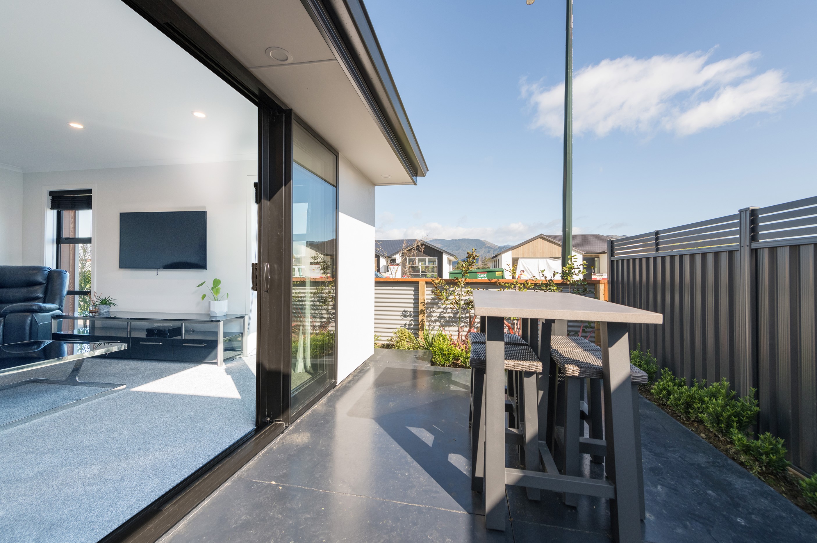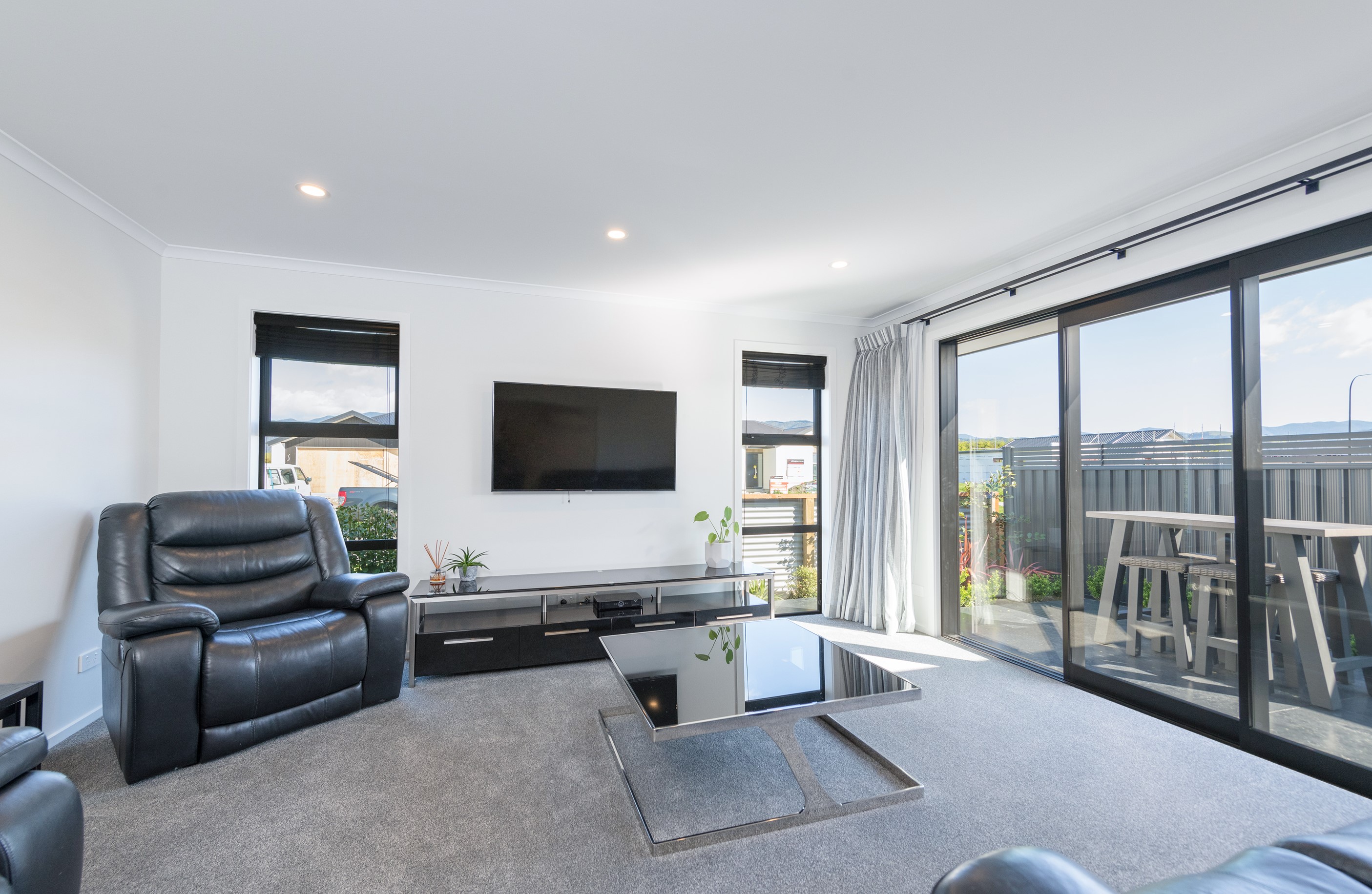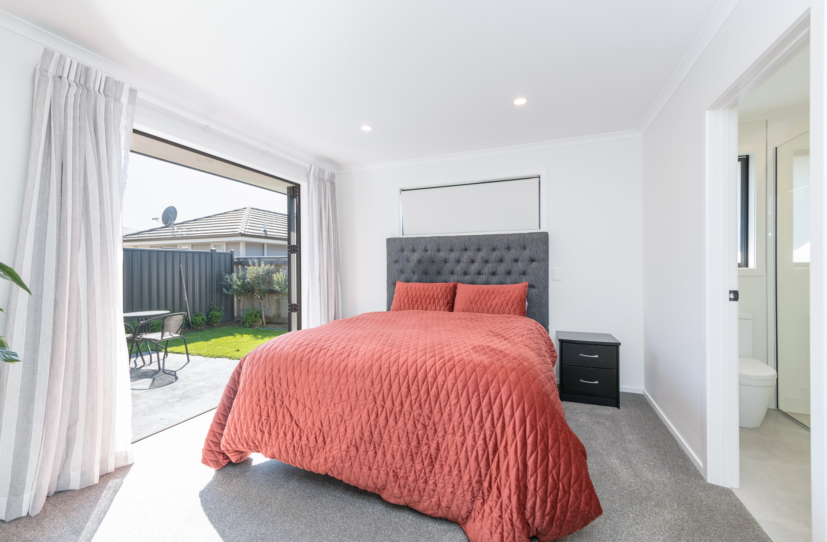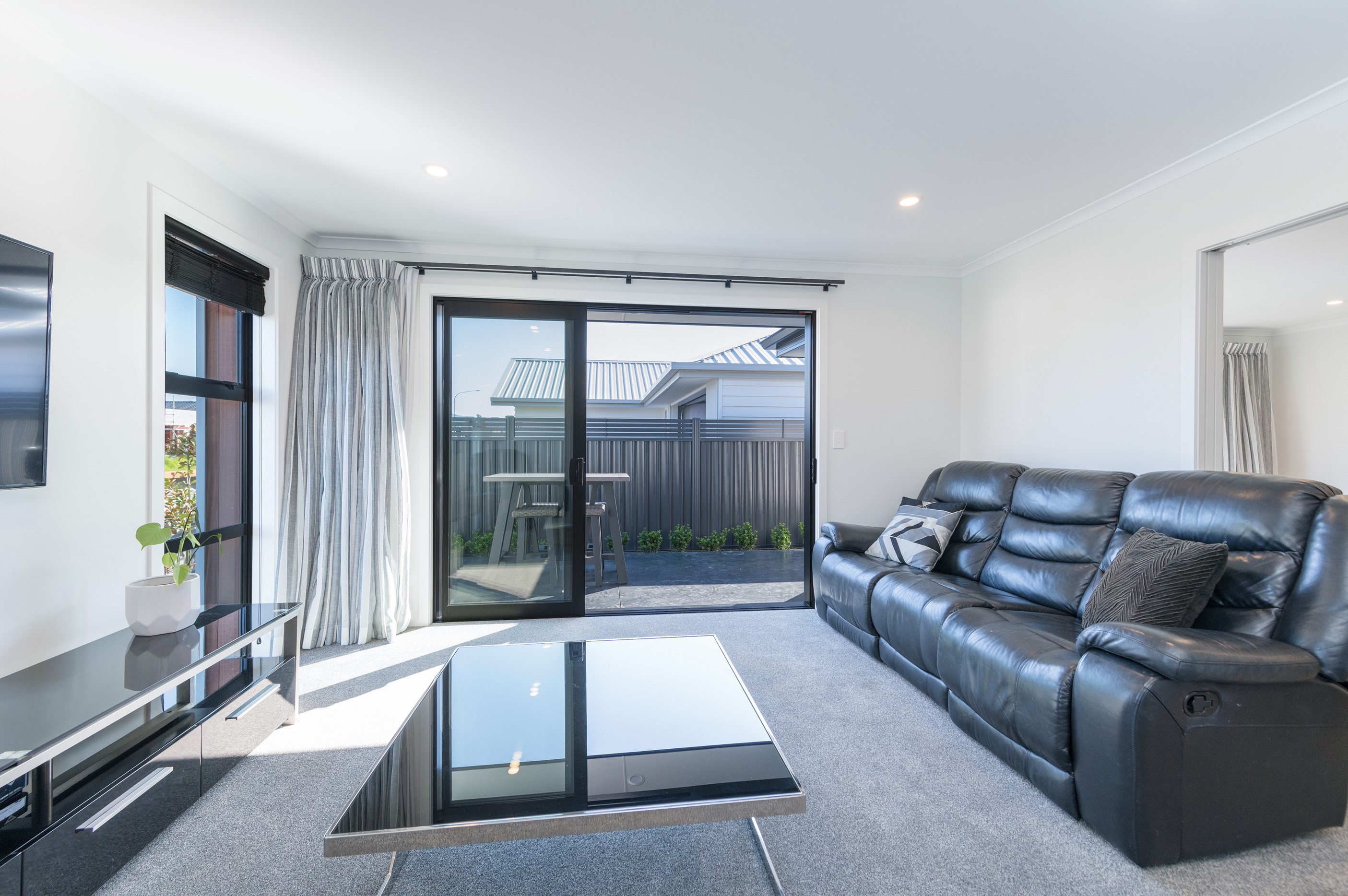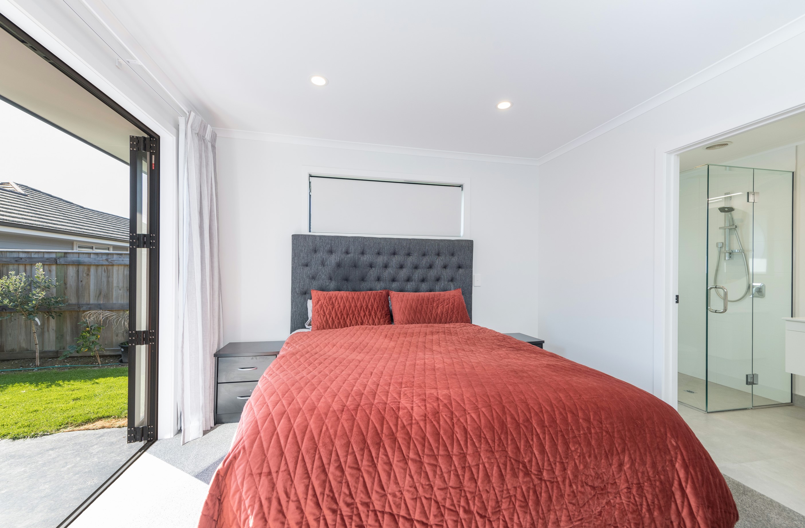 You’ll find a main-bedroom ensuite – with white and grey tiles and premium fittings – as well as a family bathroom. On one side, the living area opens out onto smart paving and considered landscaping. The kitchen’s dark statement benchtop echoes the tones of the Rockcote/Linea cladding found on the home’s sharp exterior. The clever use of recessed lighting makes for an increased feeling of spaciousness and the neutral palette provides a blank canvas onto which the residents can stamp their personal style. The inclusion of a double garage in keeping with the lines of the house is an added bonus.