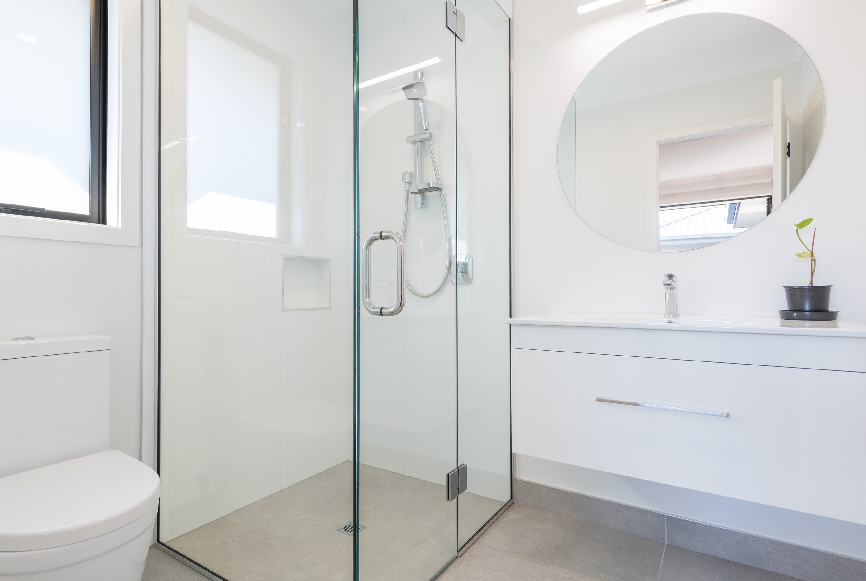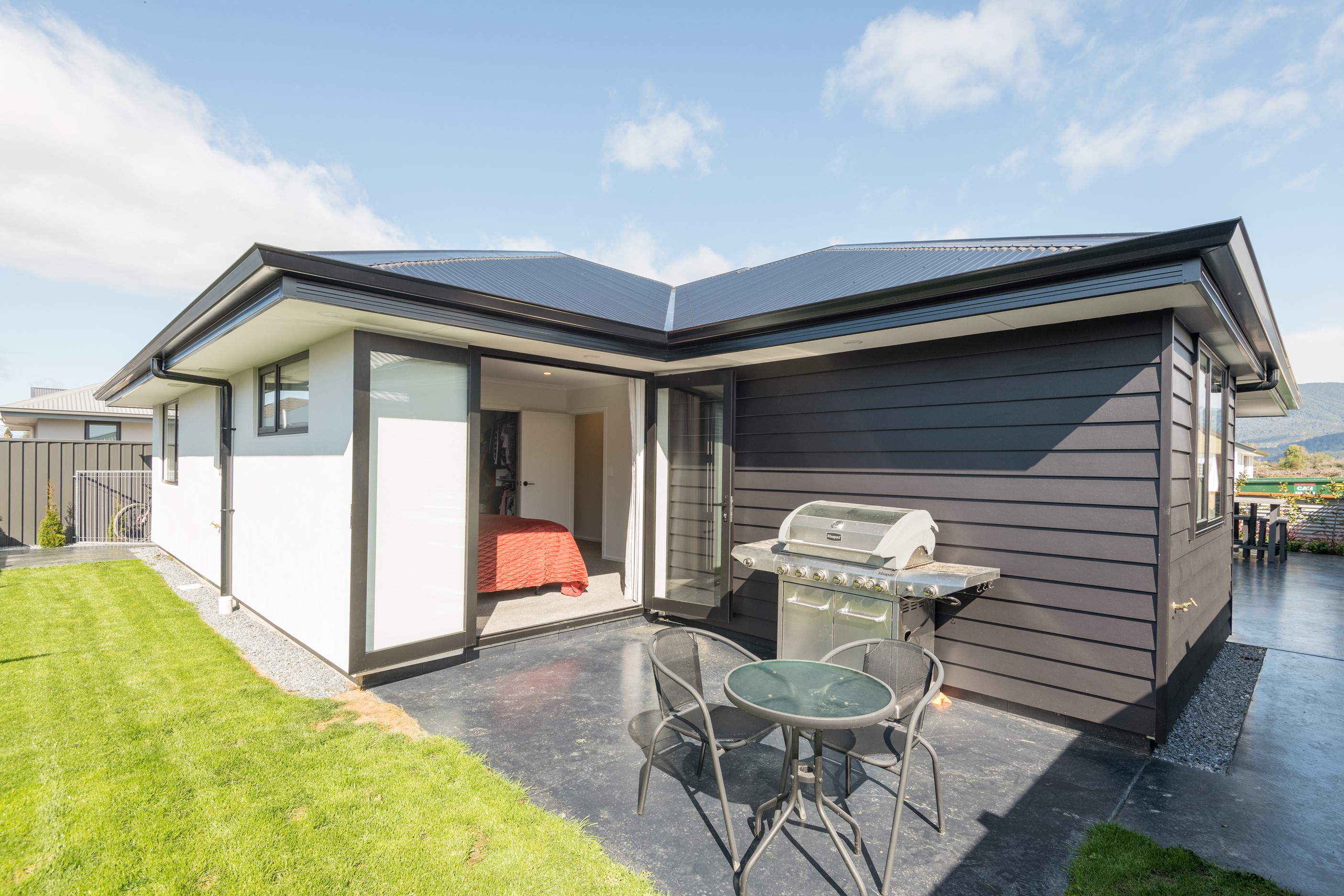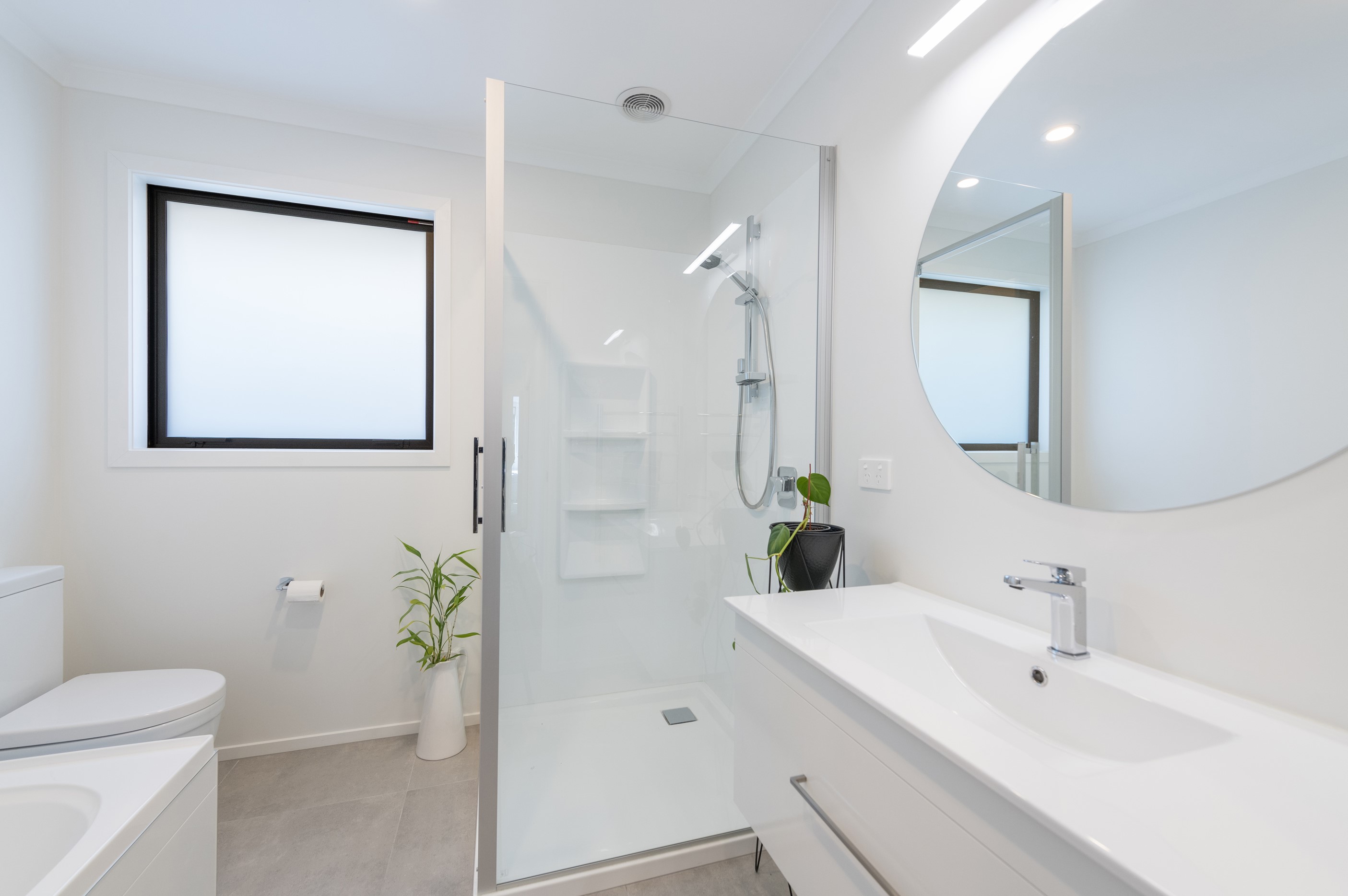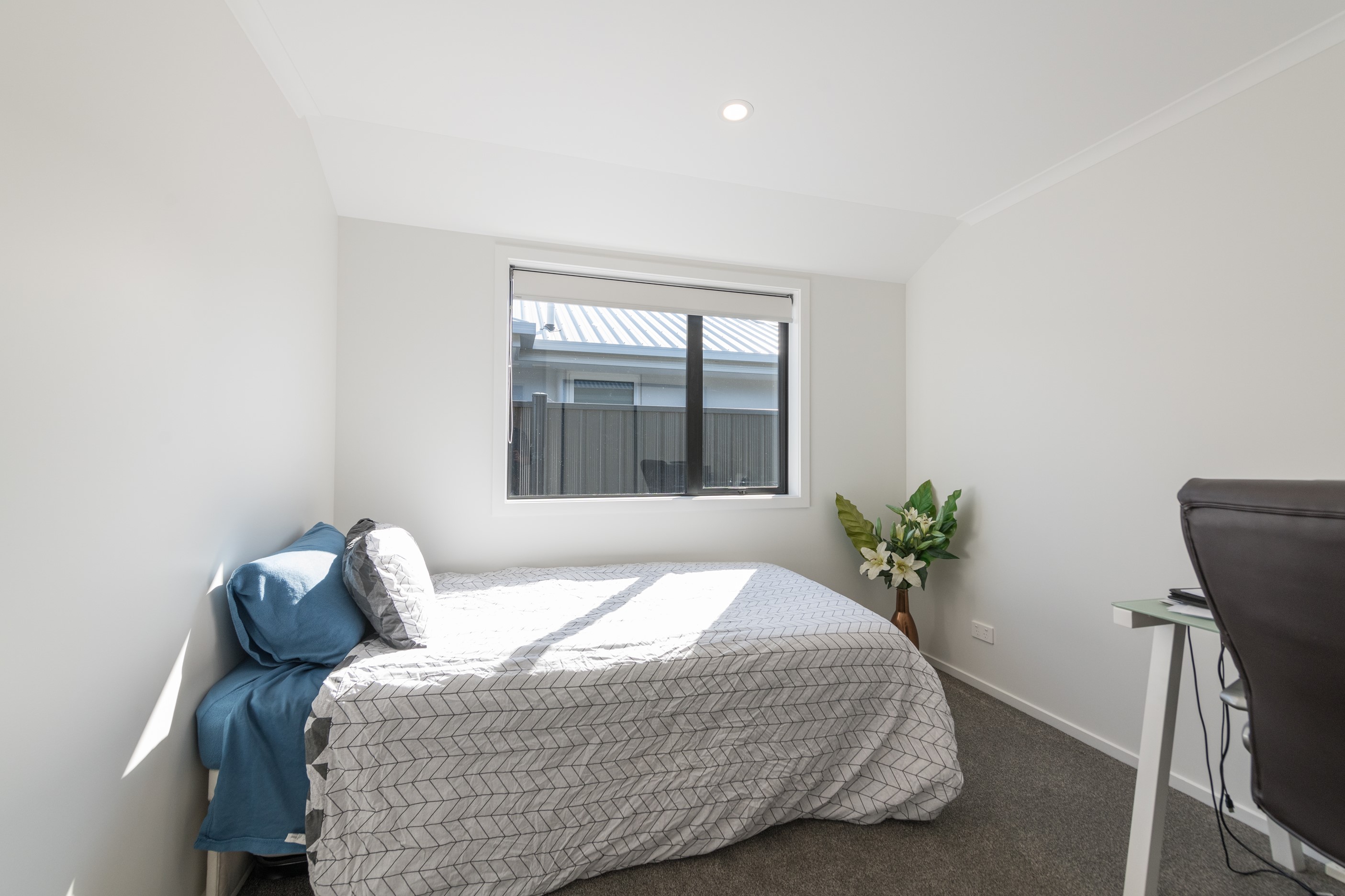 You’ll find a main-bedroom ensuite – with white and grey tiles and premium fittings – as well as a family bathroom. On one side, the living area opens out onto smart paving and considered landscaping. The kitchen’s dark statement benchtop echoes the tones of the Rockcote/Linea cladding found on the home’s sharp exterior. The clever use of recessed lighting makes for an increased feeling of spaciousness and the neutral palette provides a blank canvas onto which the residents can stamp their personal style. The inclusion of a double garage in keeping with the lines of the house is an added bonus.