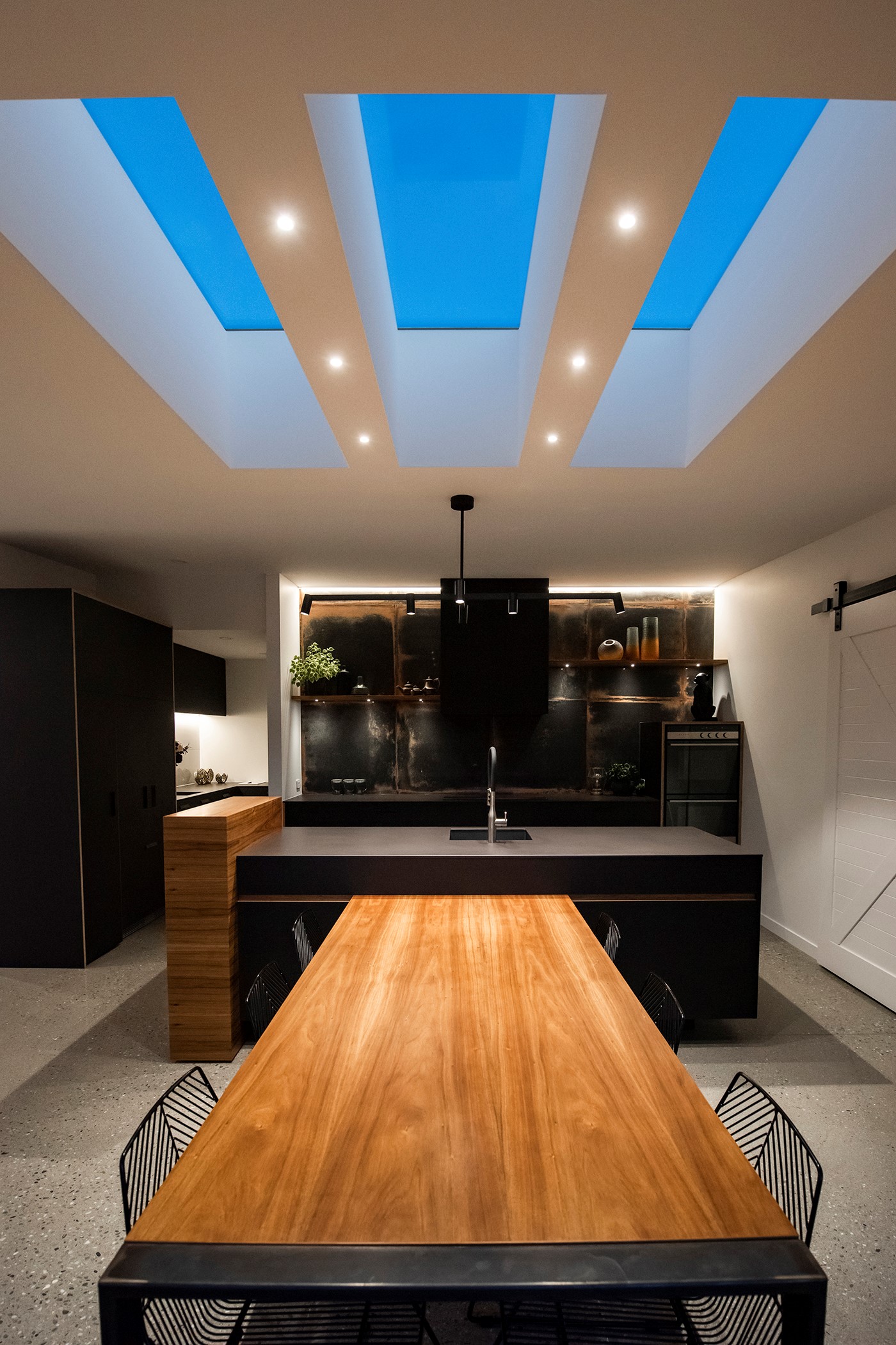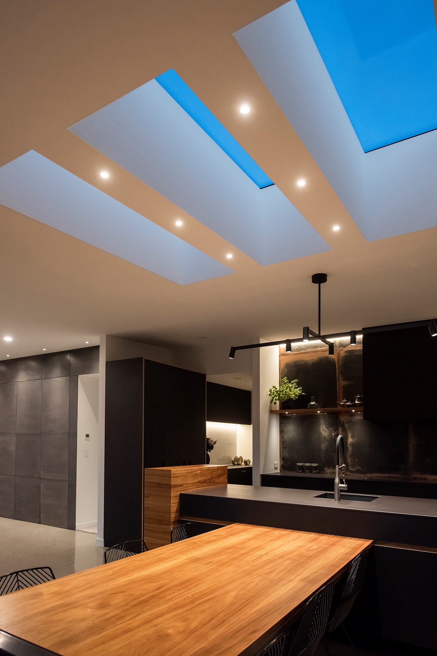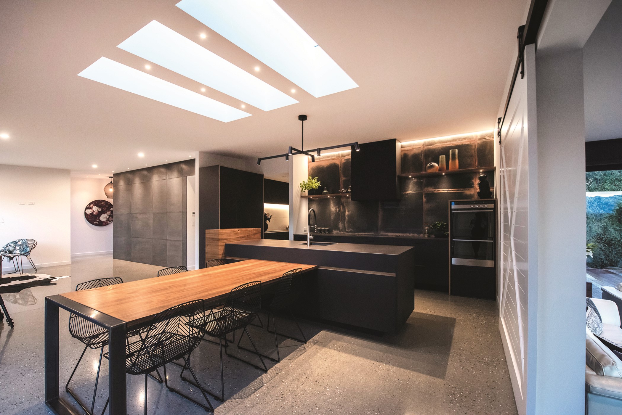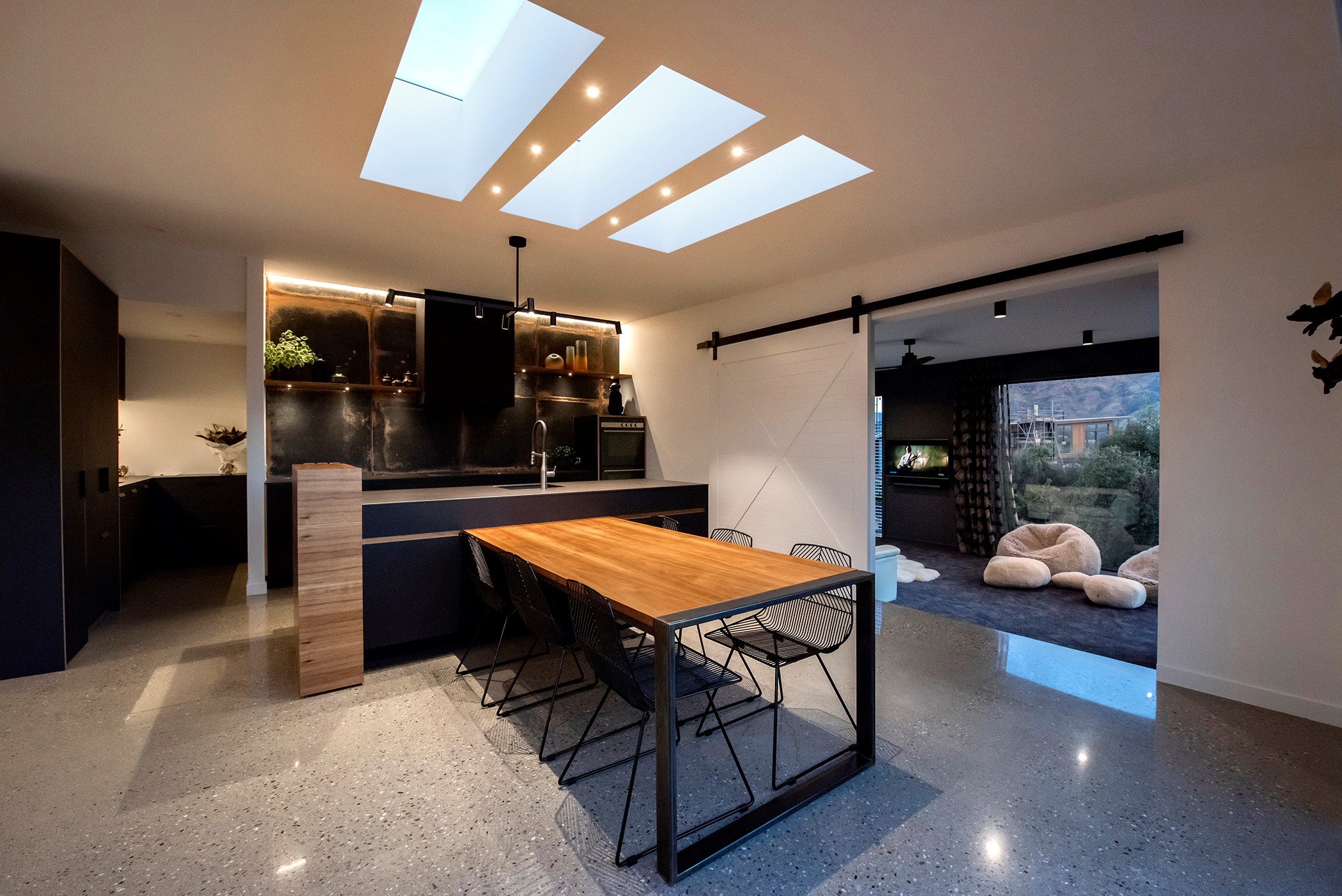 Contemporary considerations, such as underfloor heating, are boosted by polished floors for solar gain, while fixed and opening skylights create light and space. Even the garage is perfection, with insulation, underfloor heating and skylights – so well planned, it’s ideal as a fourth bedroom when there are guests to accommodate. There are extras such as electric-opening kitchen drawers and a heat pump, and the solar-power system keeps the home’s running costs low. A pleasure to live and play in, this home is a stunning example of what can be achieved with smart planning, great design and top-notch craftsmanship.