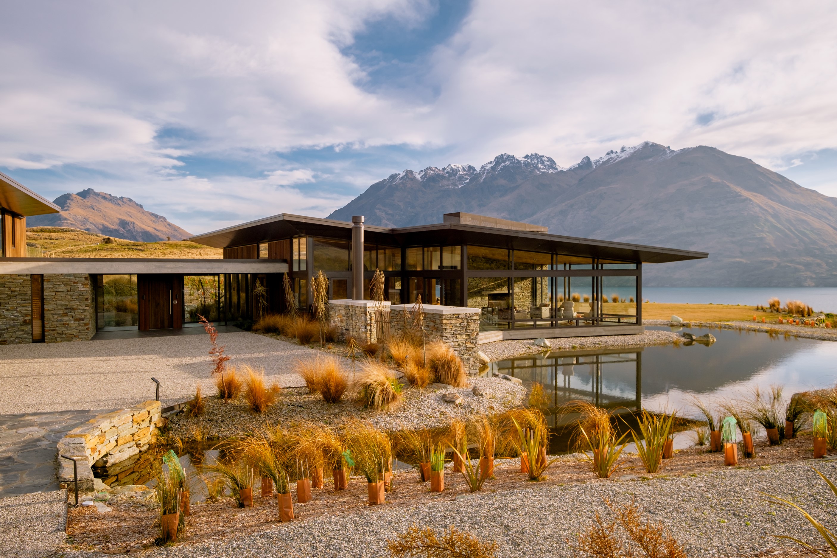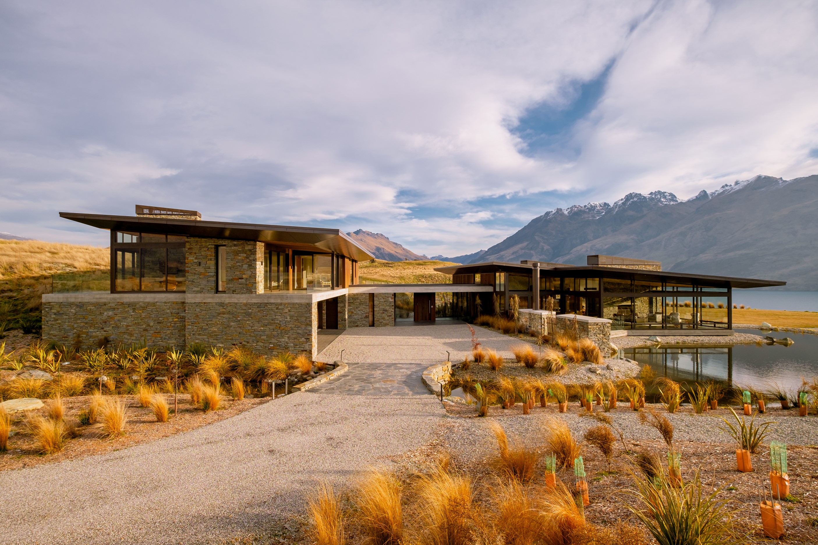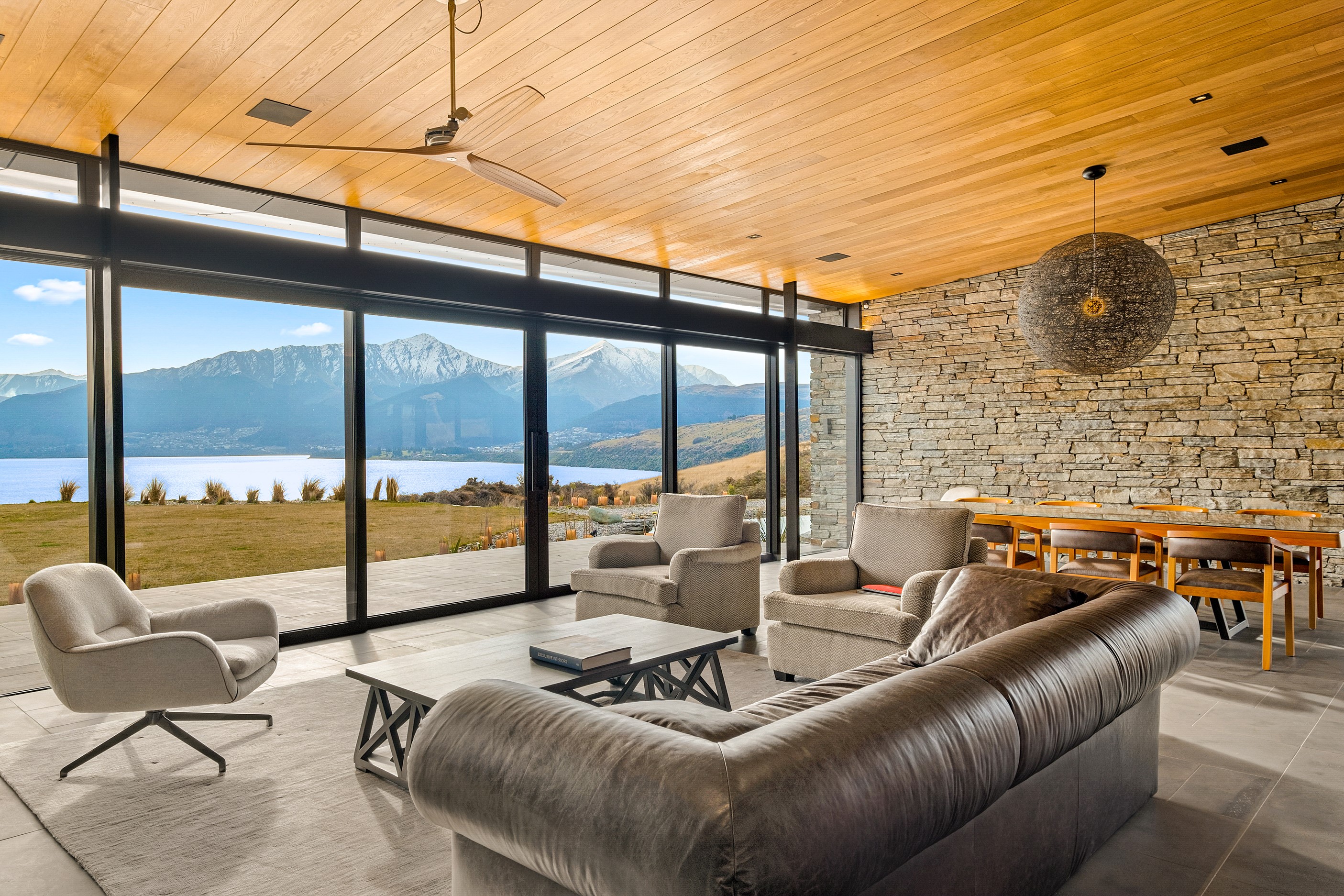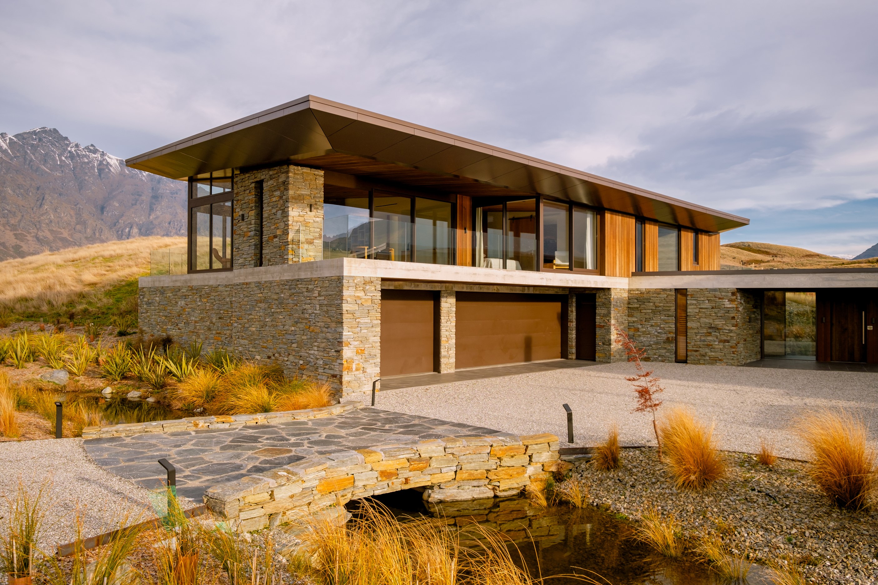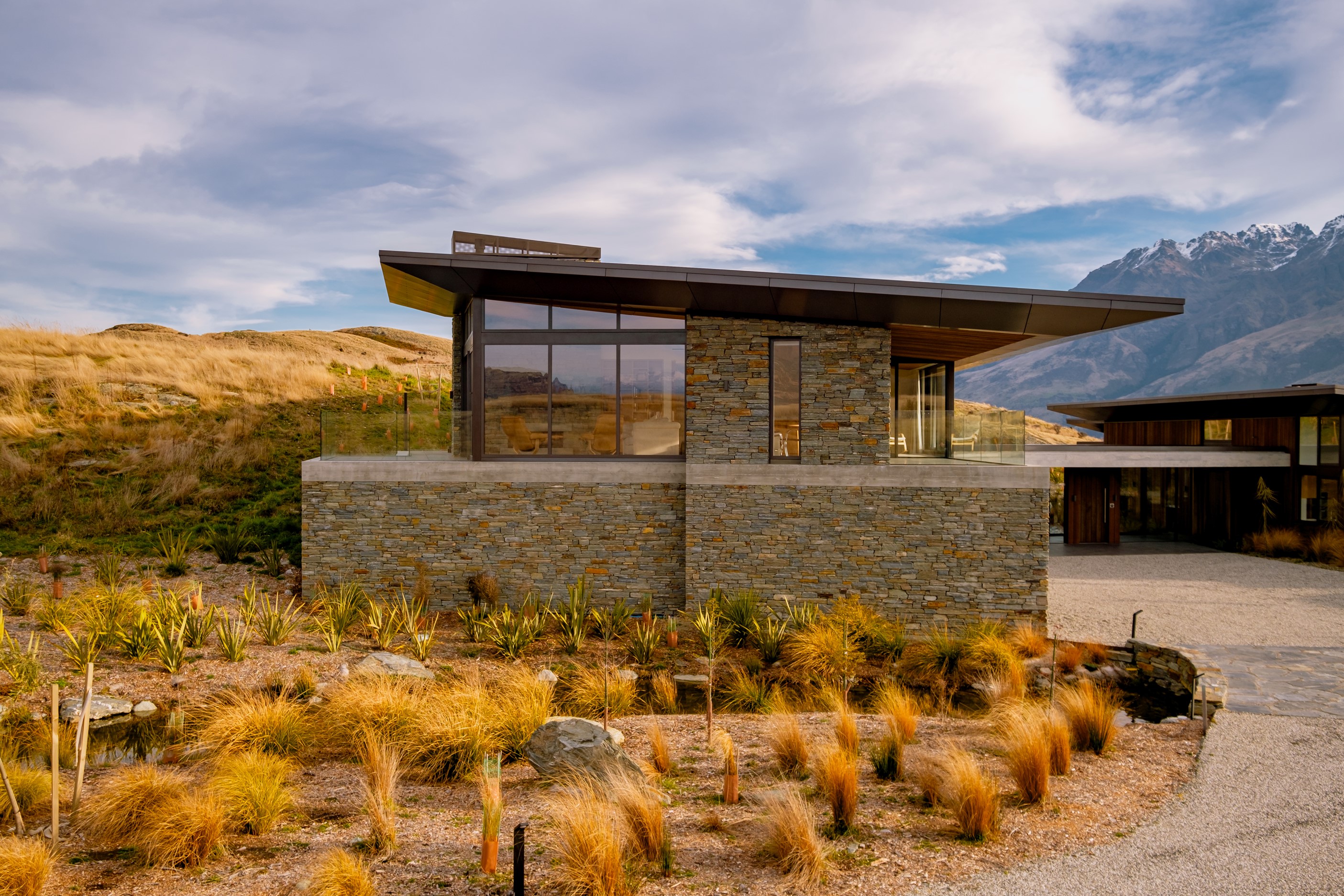 Two house forms are set into the natural ridgeline beneath the Remarkables and overlooking Lake Wakatipu and the Jack’s Point golf course. A two-storied wing faces the mountains to the east. The upper level contains three bedrooms, an office and a separate living area, while there are a garage, storage and laundry area below. The west wing faces the lake and has the main living spaces. A separate wing has guest suites.