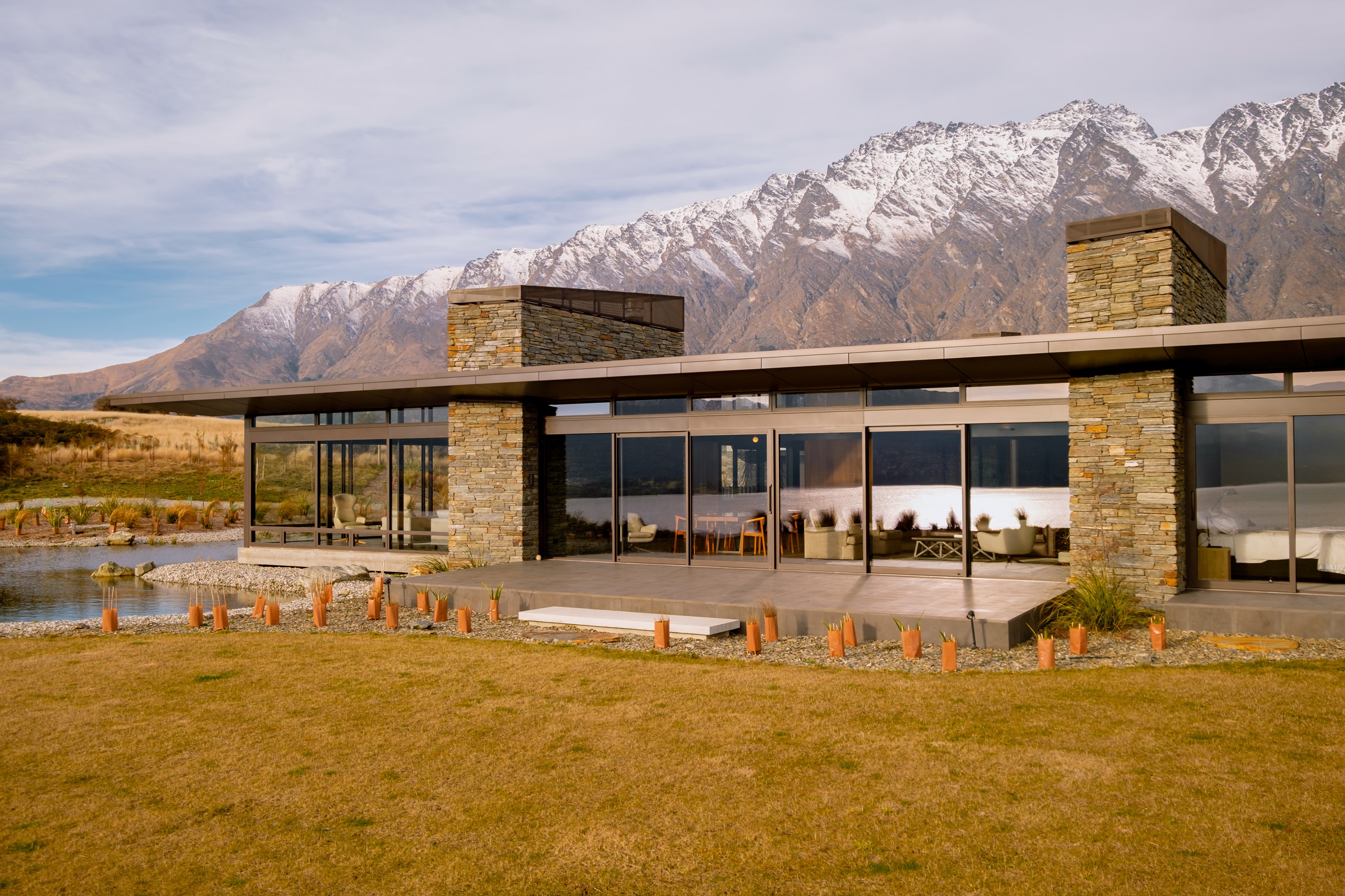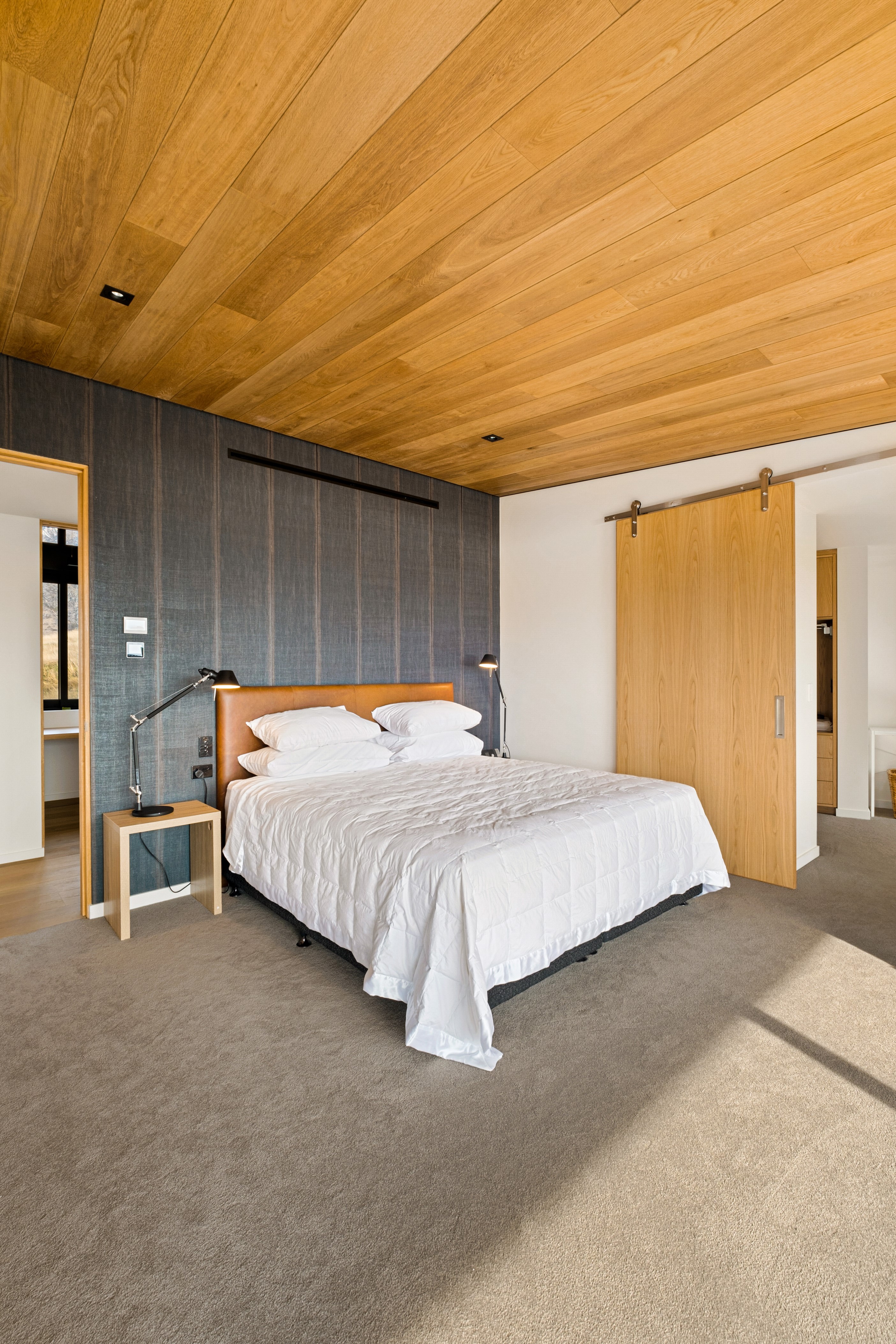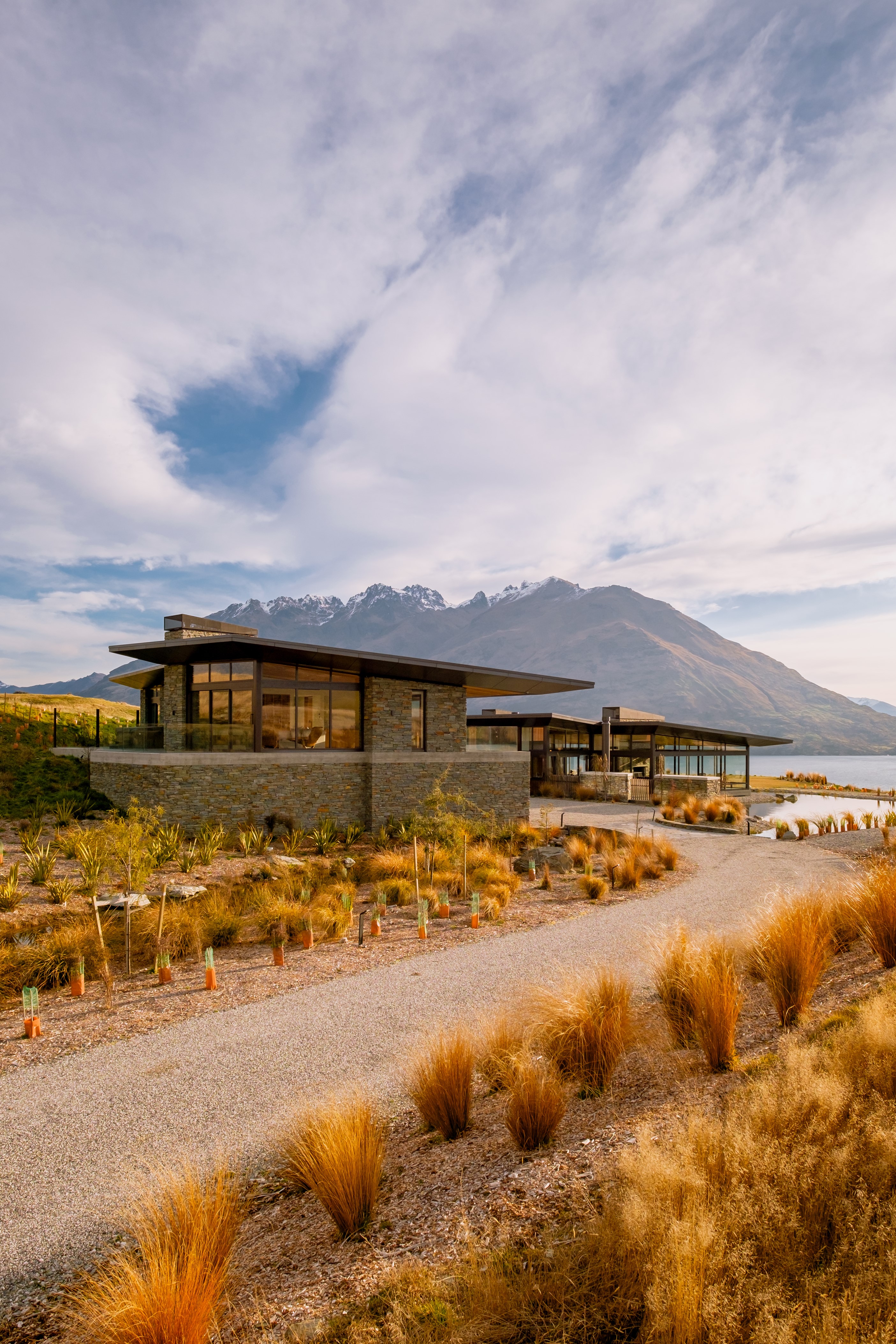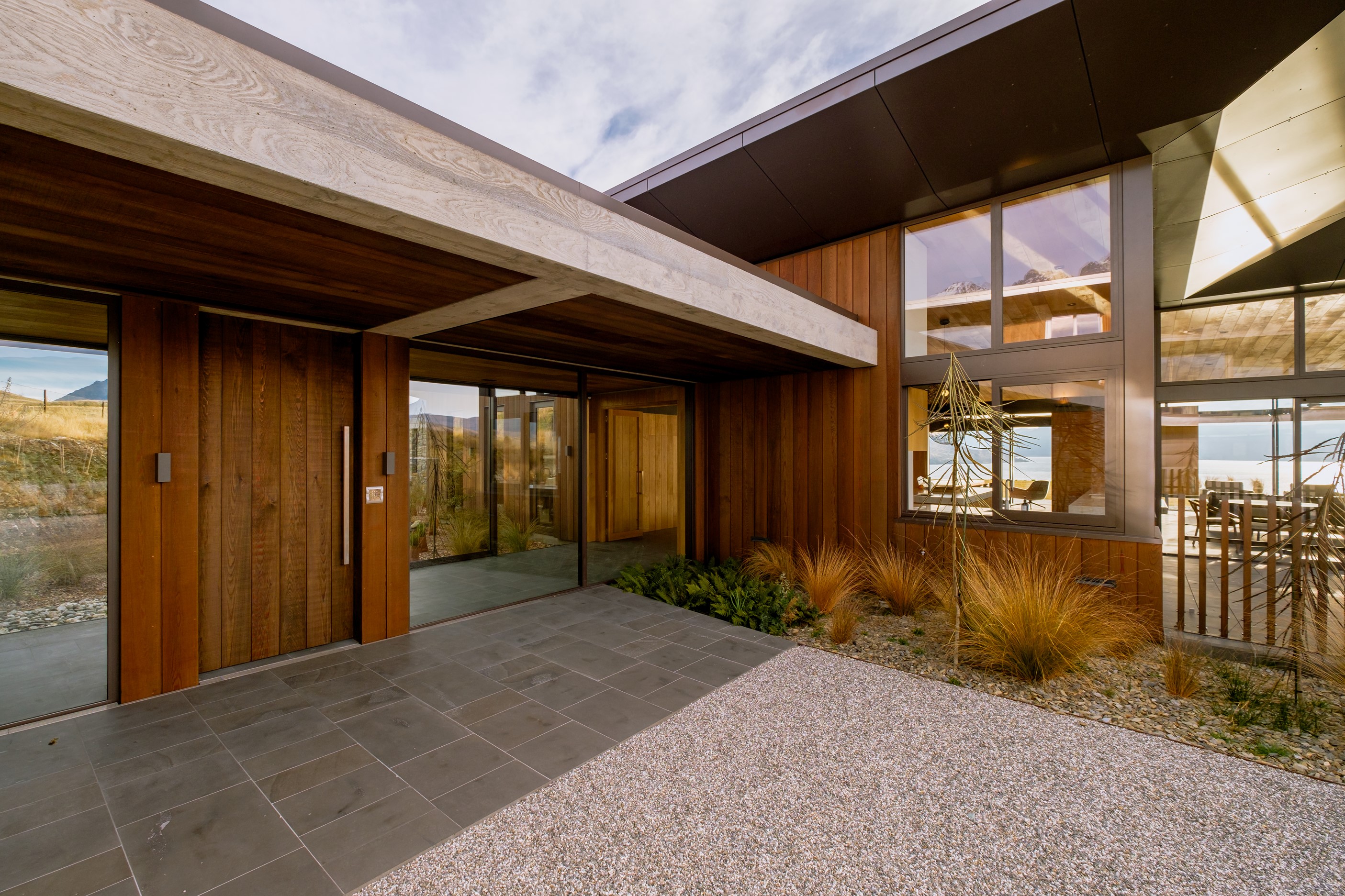 Two house forms are set into the natural ridgeline beneath the Remarkables and overlooking Lake Wakatipu and the Jack’s Point golf course. A two-storied wing faces the mountains to the east. The upper level contains three bedrooms, an office and a separate living area, while there are a garage, storage and laundry area below. The west wing faces the lake and has the main living spaces. A separate wing has guest suites.