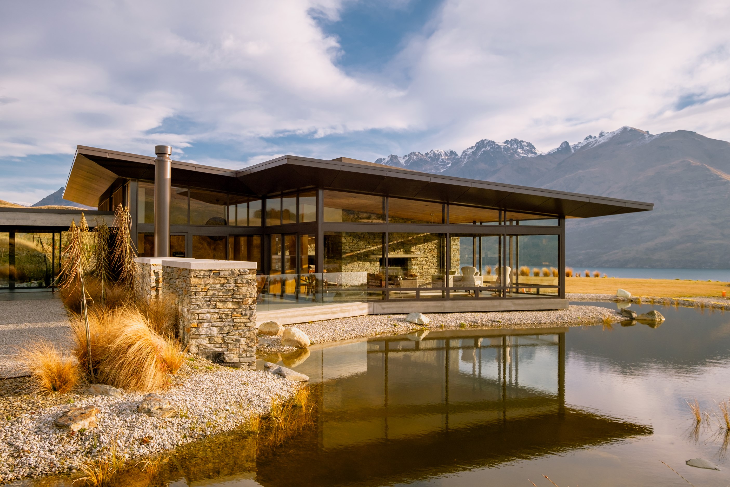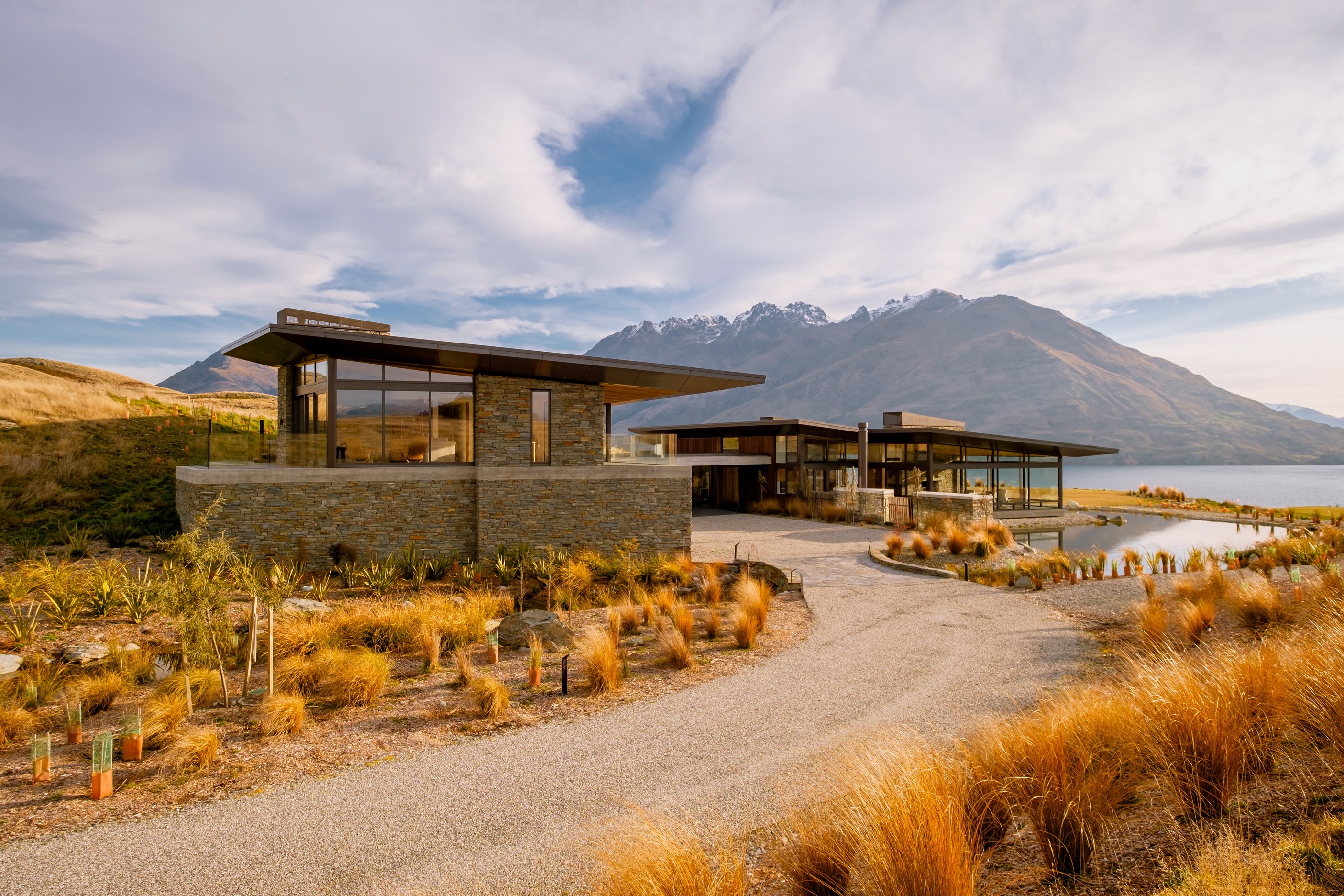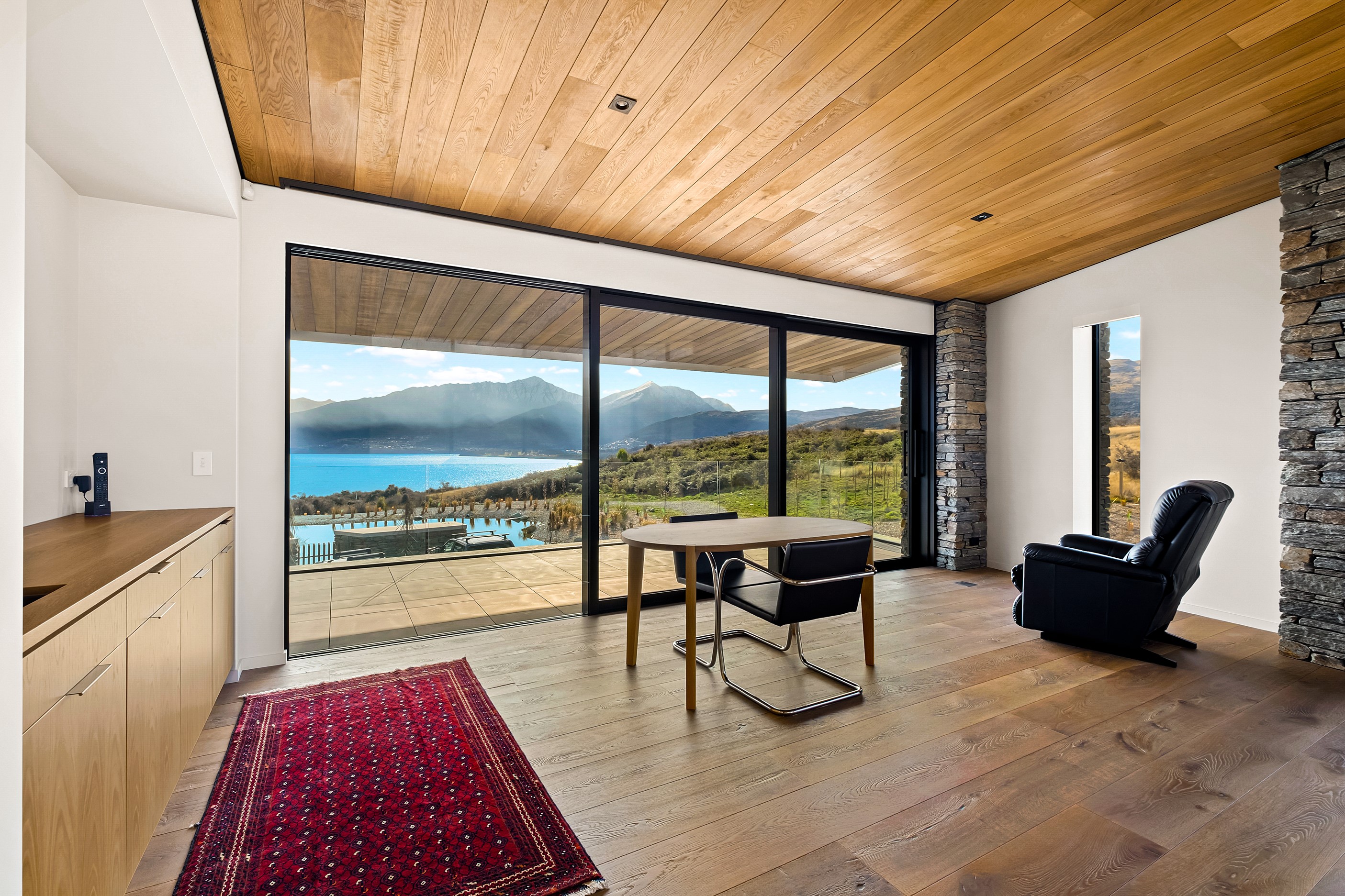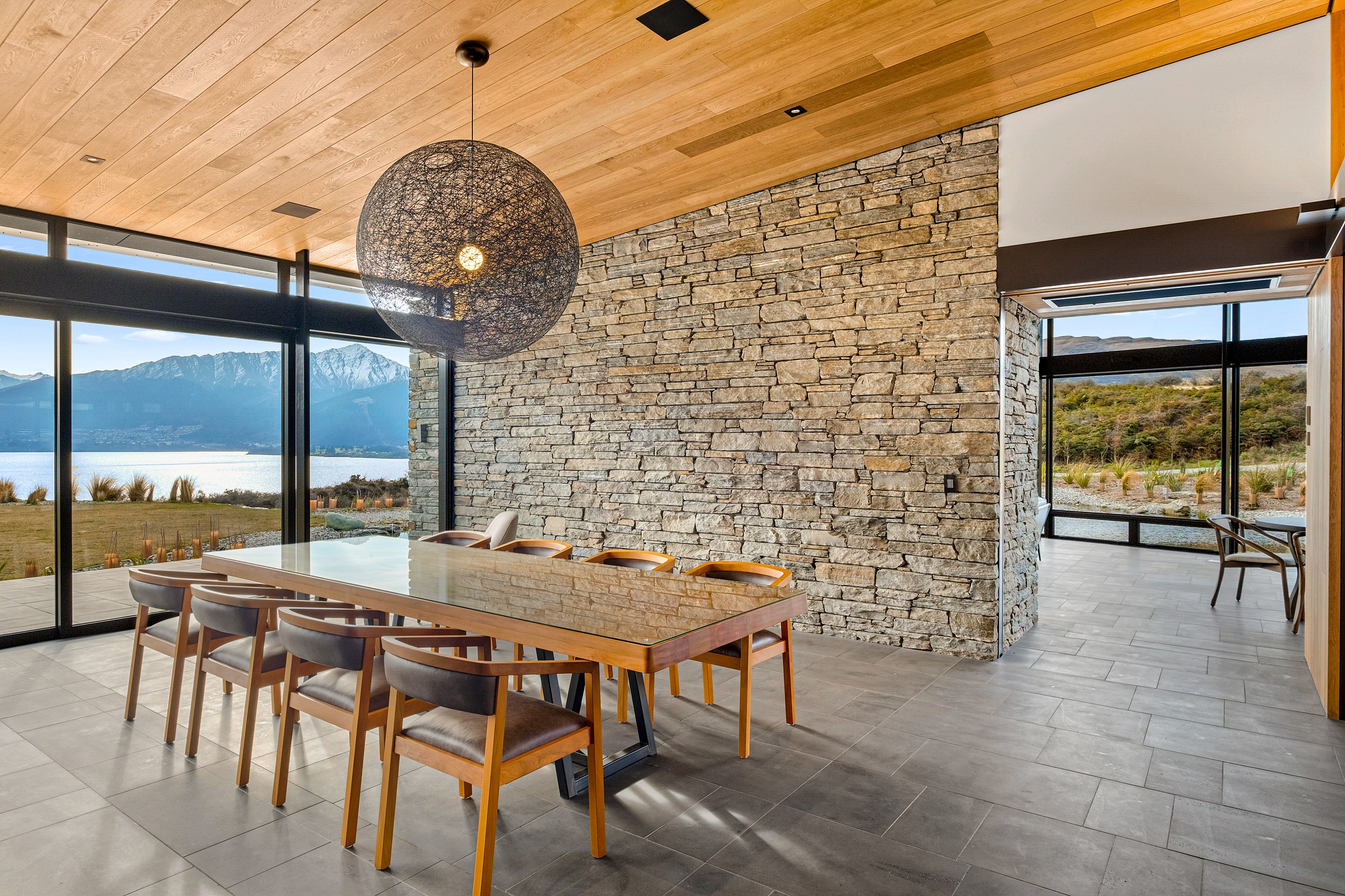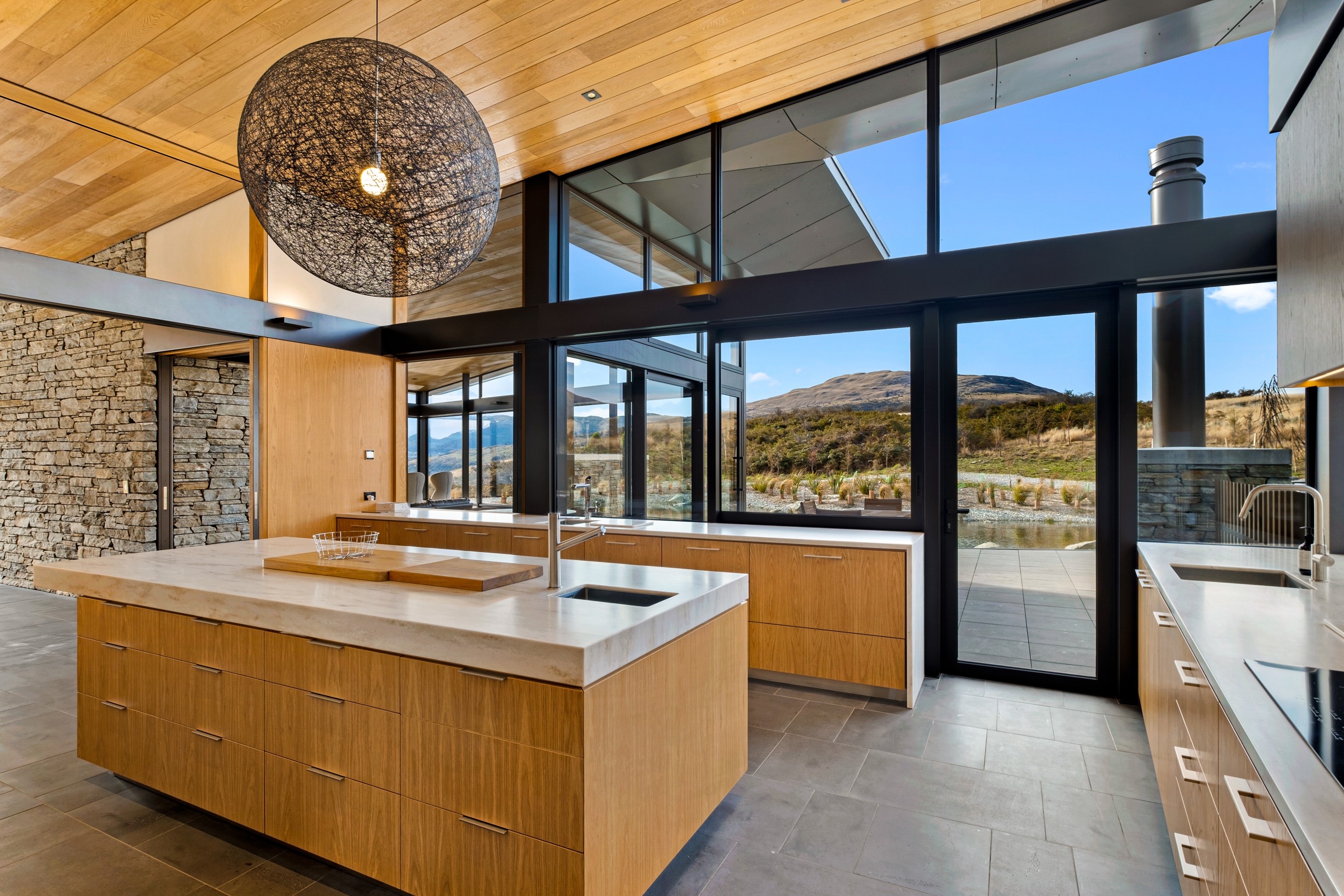 Two house forms are set into the natural ridgeline beneath the Remarkables and overlooking Lake Wakatipu and the Jack’s Point golf course. A two-storied wing faces the mountains to the east. The upper level contains three bedrooms, an office and a separate living area, while there are a garage, storage and laundry area below. The west wing faces the lake and has the main living spaces. A separate wing has guest suites.