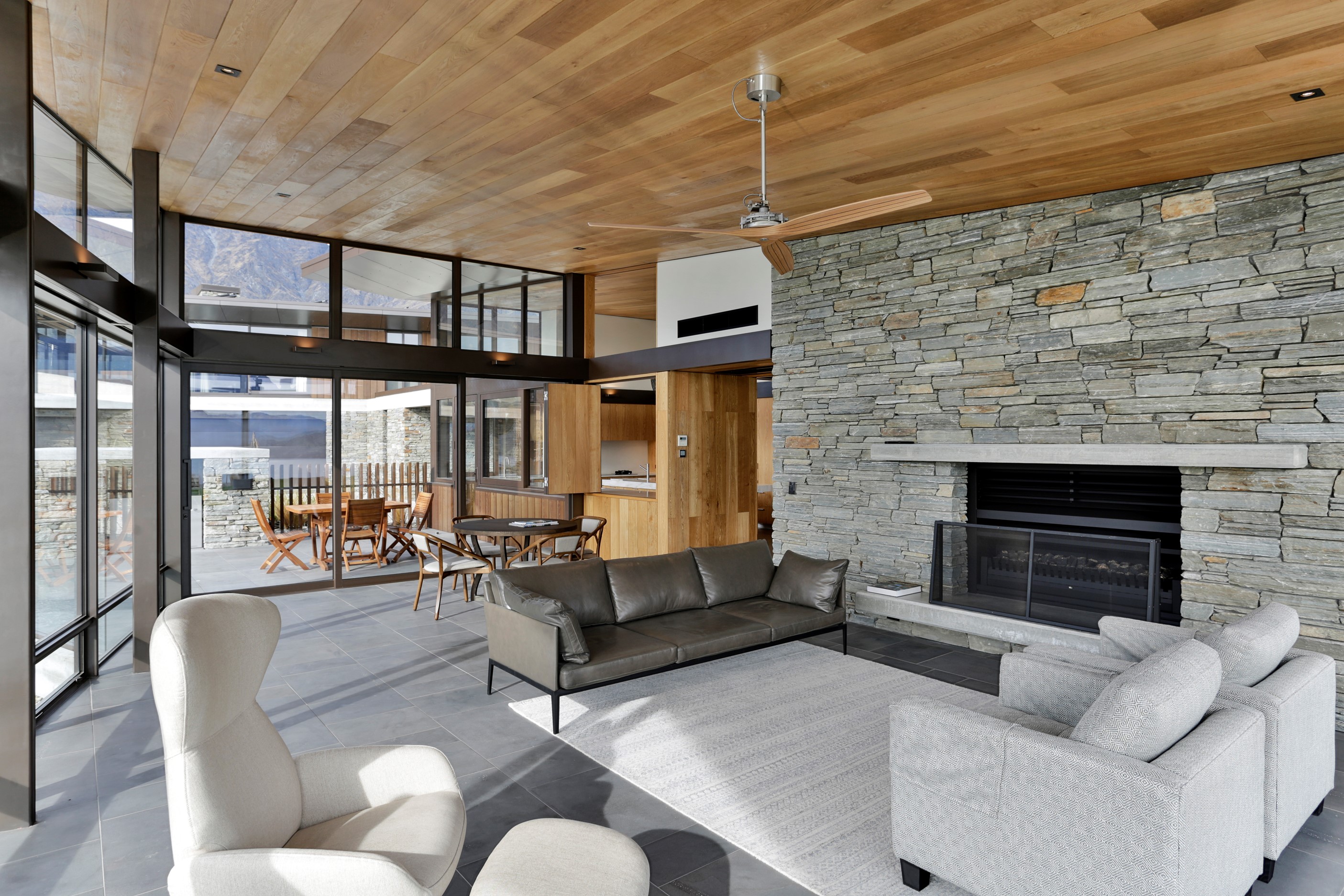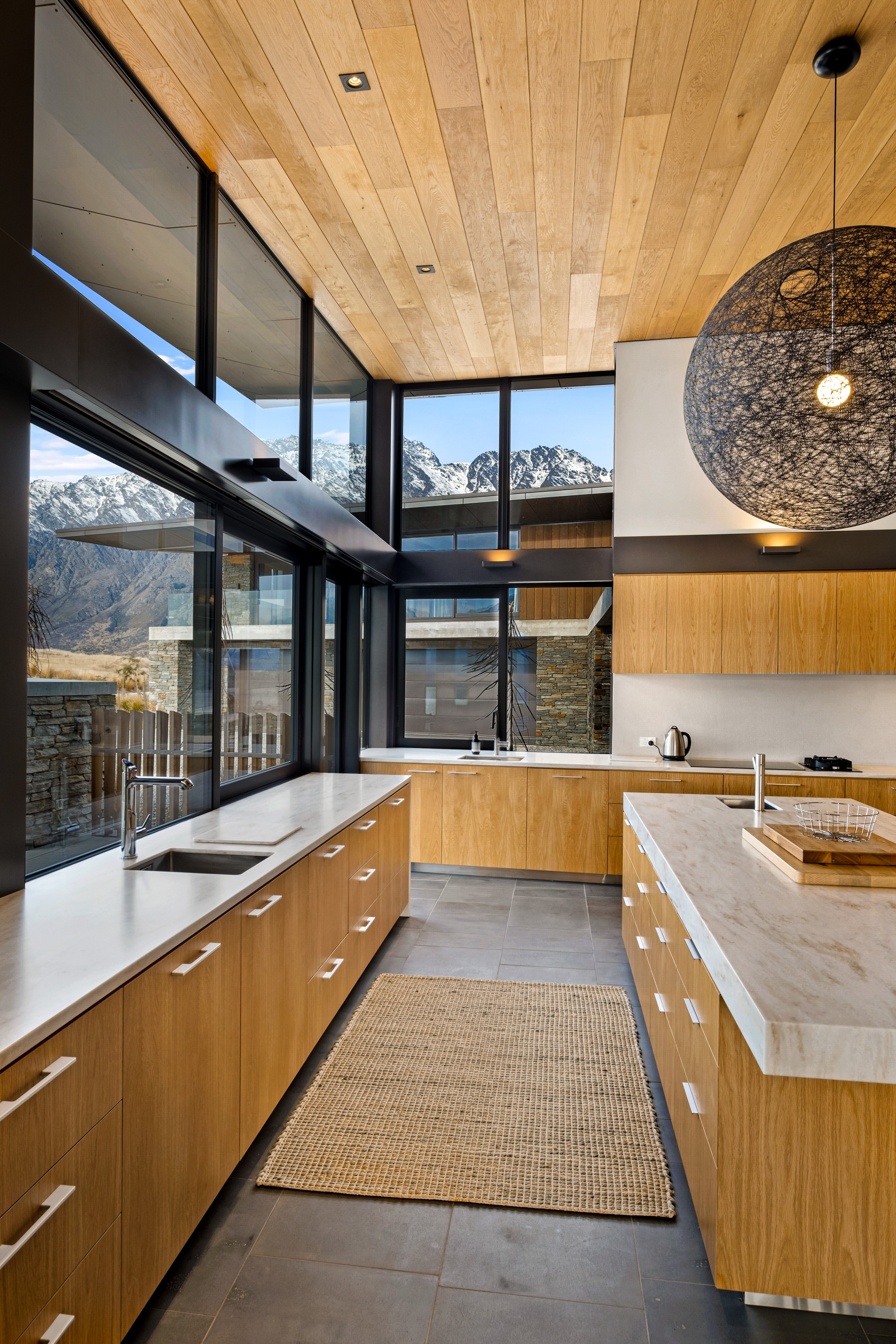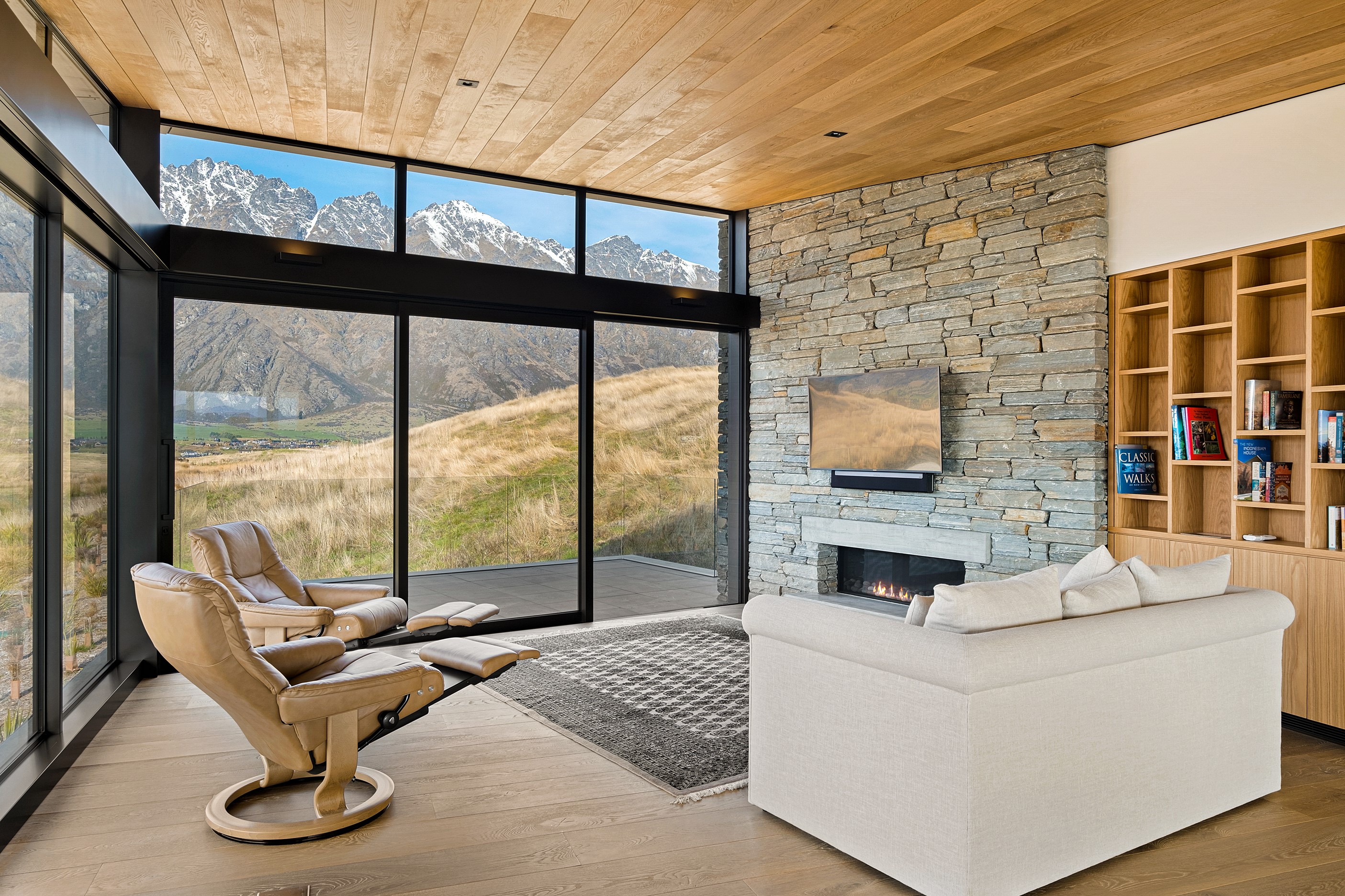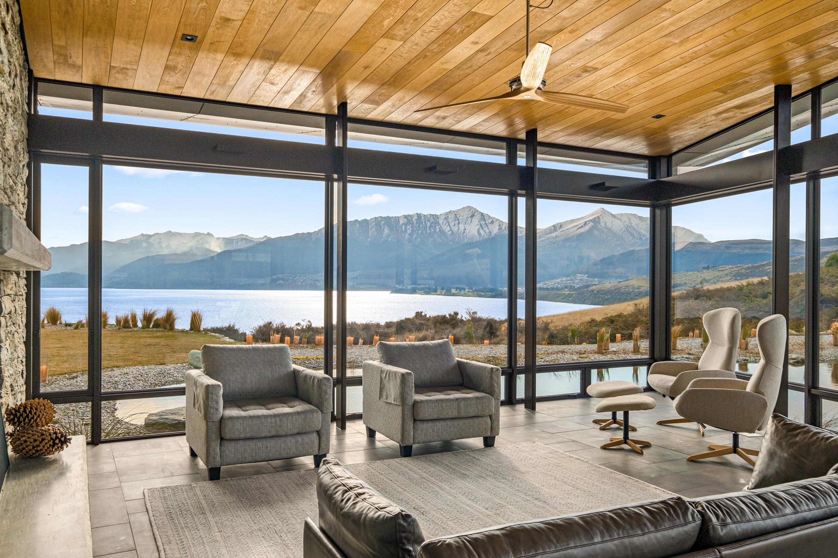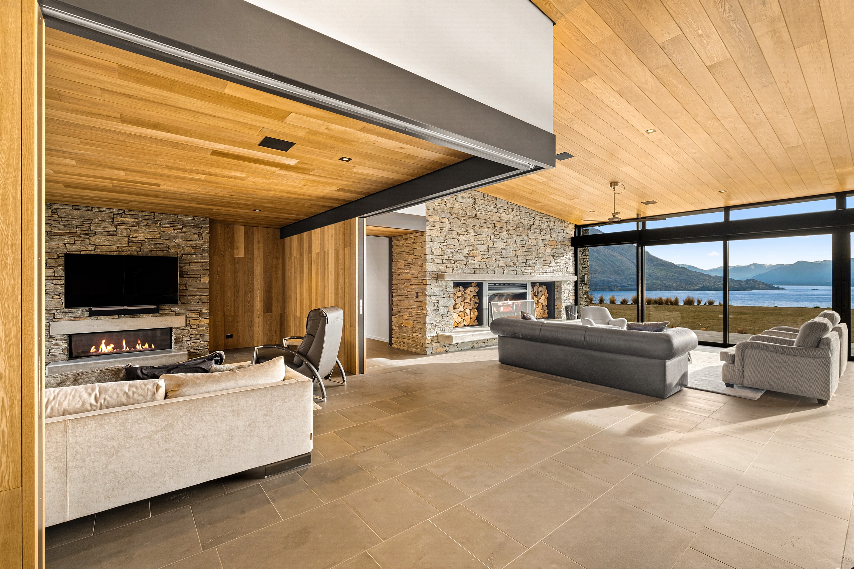 Two house forms are set into the natural ridgeline beneath the Remarkables and overlooking Lake Wakatipu and the Jack’s Point golf course. A two-storied wing faces the mountains to the east. The upper level contains three bedrooms, an office and a separate living area, while there are a garage, storage and laundry area below. The west wing faces the lake and has the main living spaces. A separate wing has guest suites.