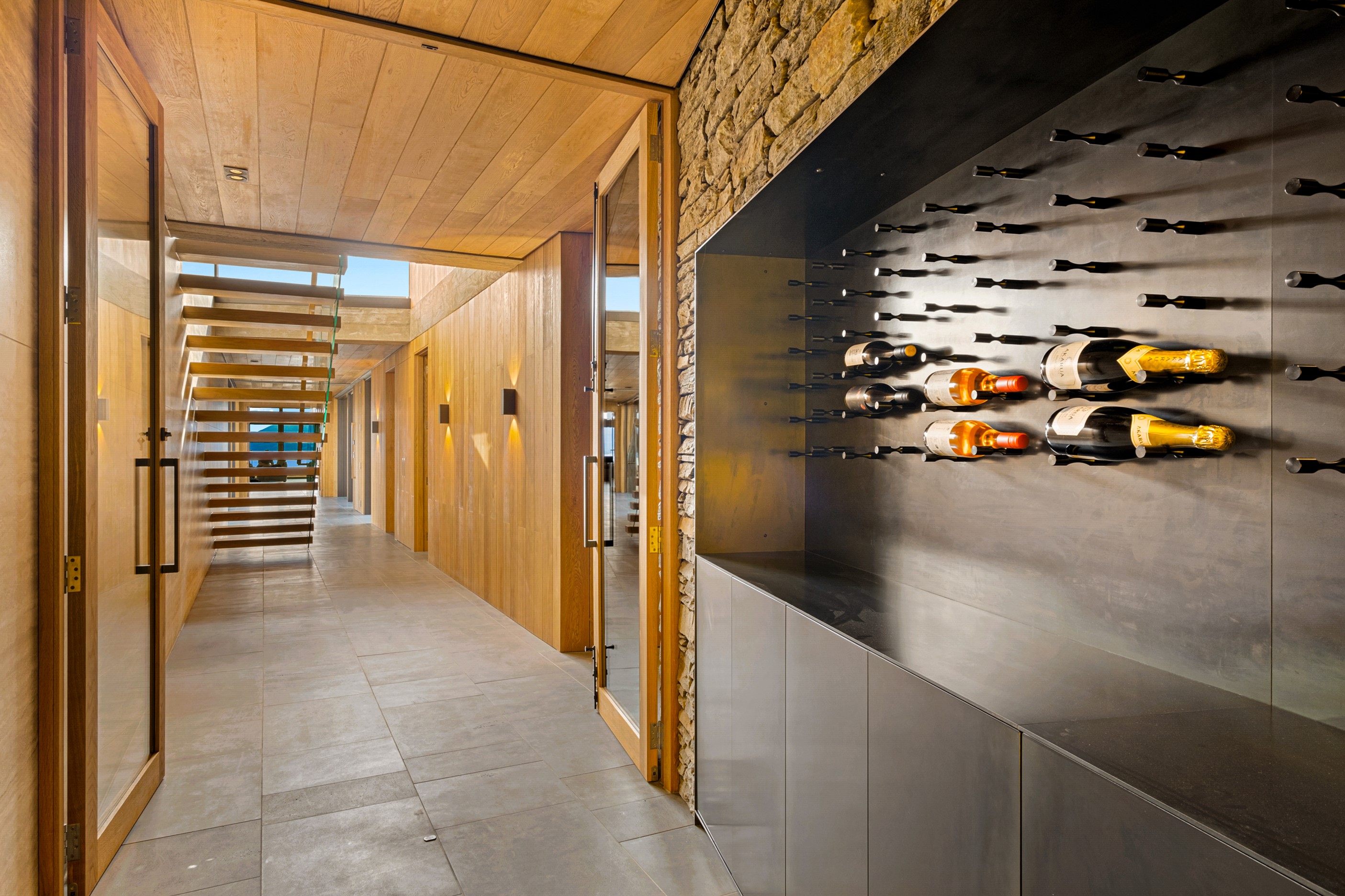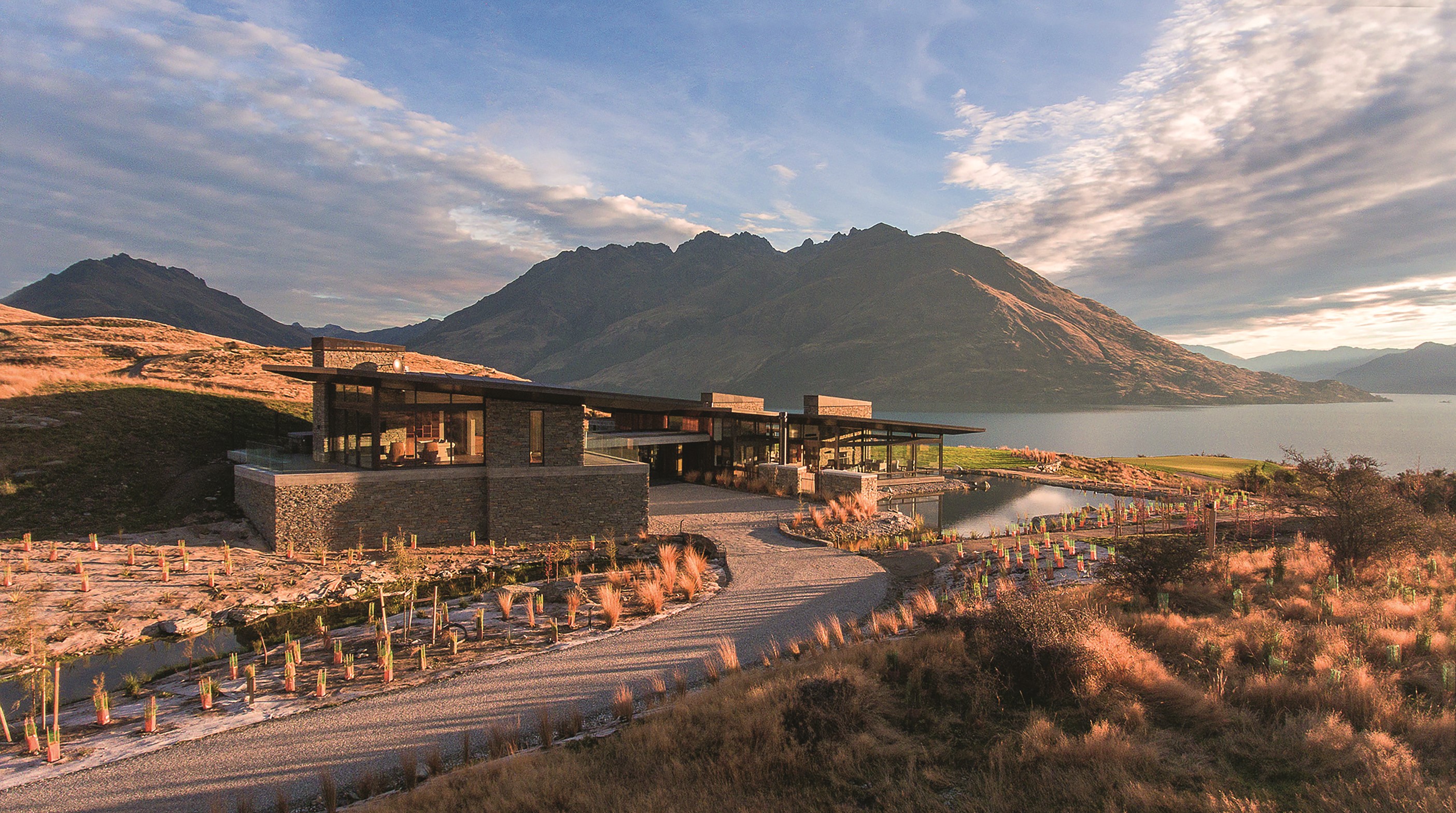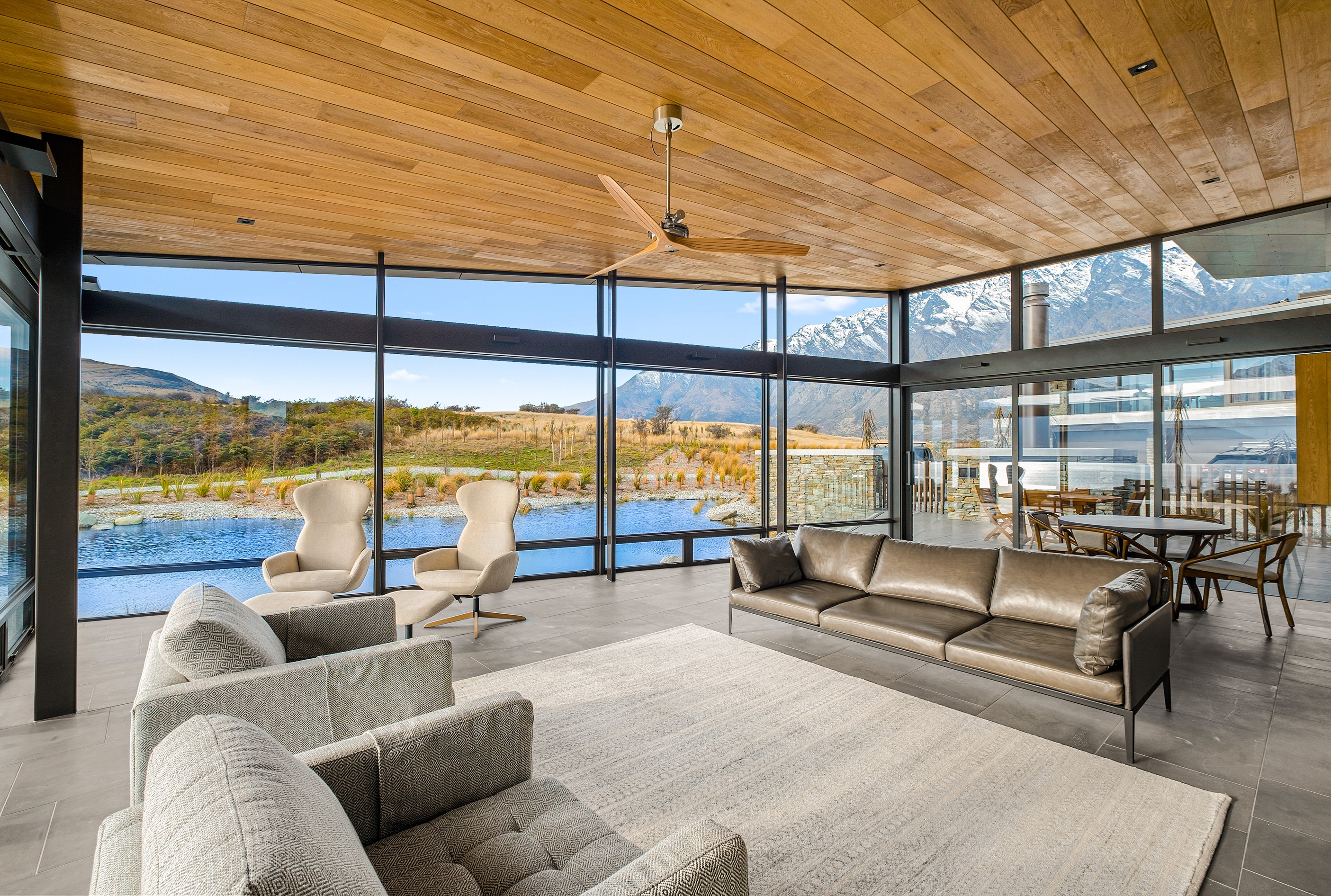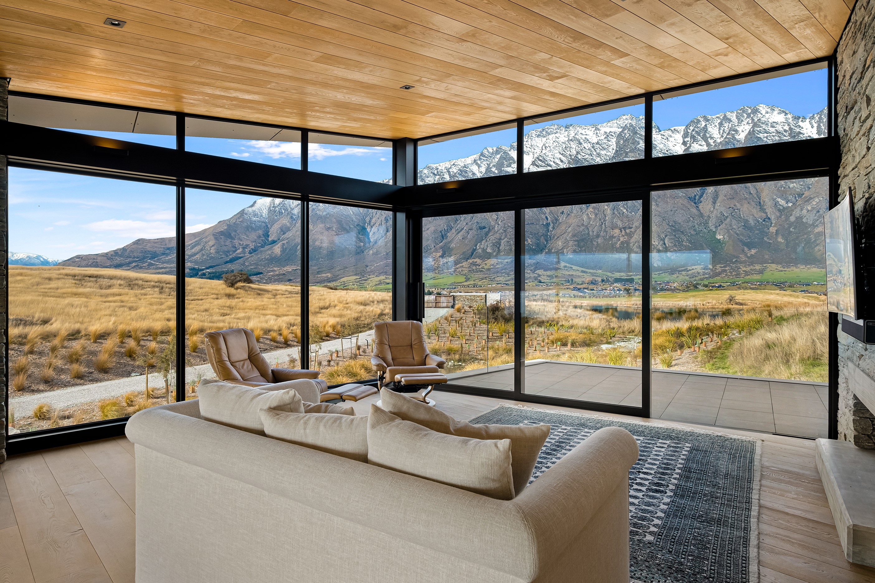 Two house forms are set into the natural ridgeline beneath the Remarkables and overlooking Lake Wakatipu and the Jack’s Point golf course. A two-storied wing faces the mountains to the east. The upper level contains three bedrooms, an office and a separate living area, while there are a garage, storage and laundry area below. The west wing faces the lake and has the main living spaces. A separate wing has guest suites.