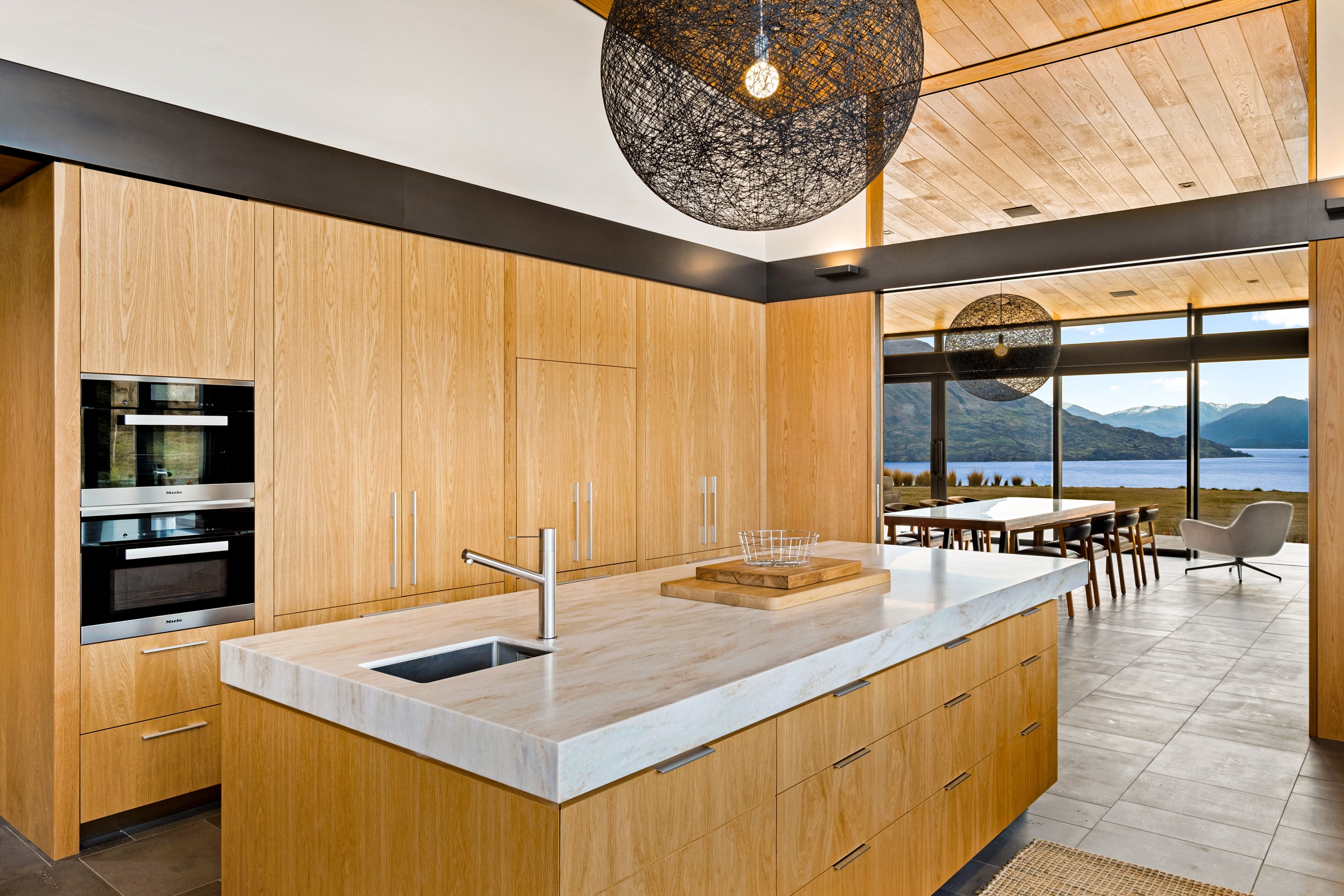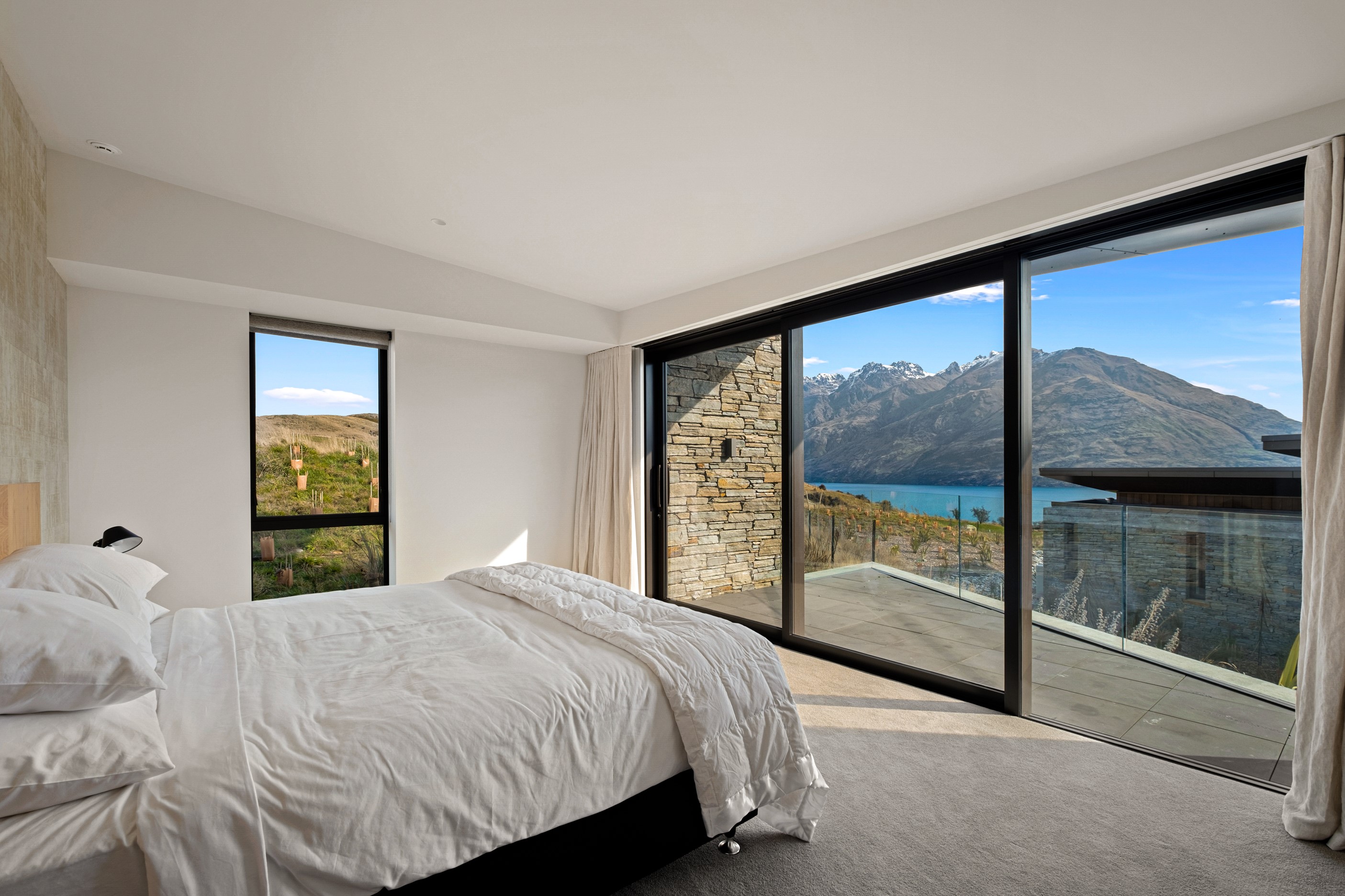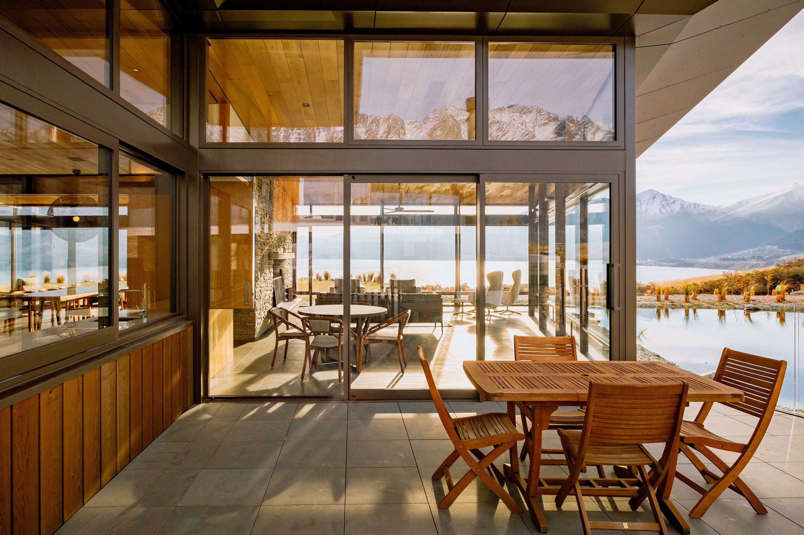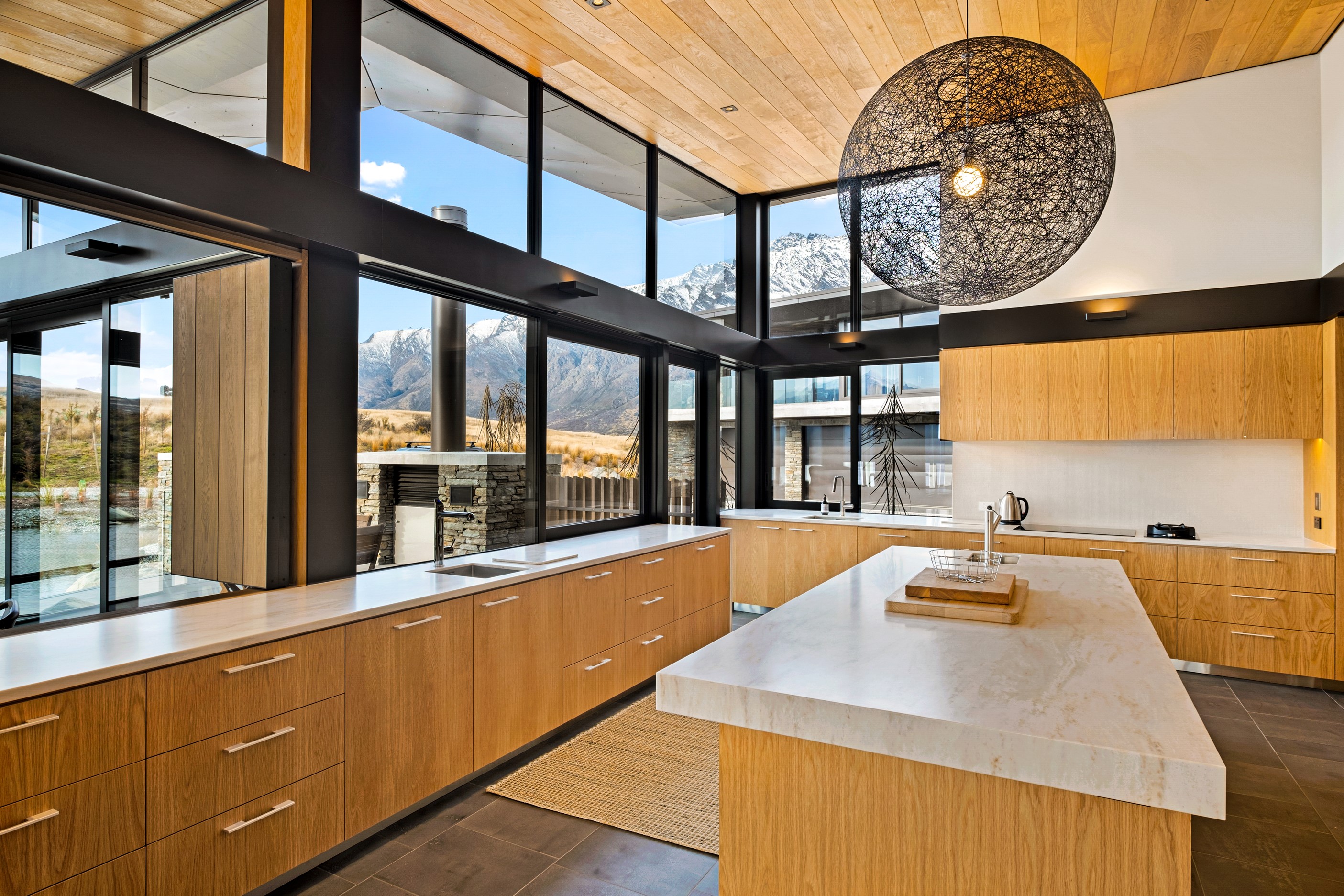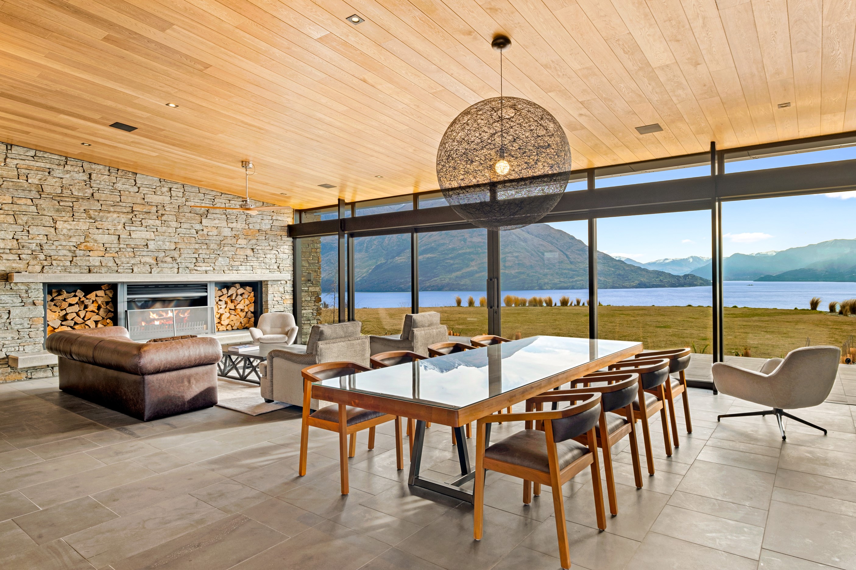 Two house forms are set into the natural ridgeline beneath the Remarkables and overlooking Lake Wakatipu and the Jack’s Point golf course. A two-storied wing faces the mountains to the east. The upper level contains three bedrooms, an office and a separate living area, while there are a garage, storage and laundry area below. The west wing faces the lake and has the main living spaces. A separate wing has guest suites.