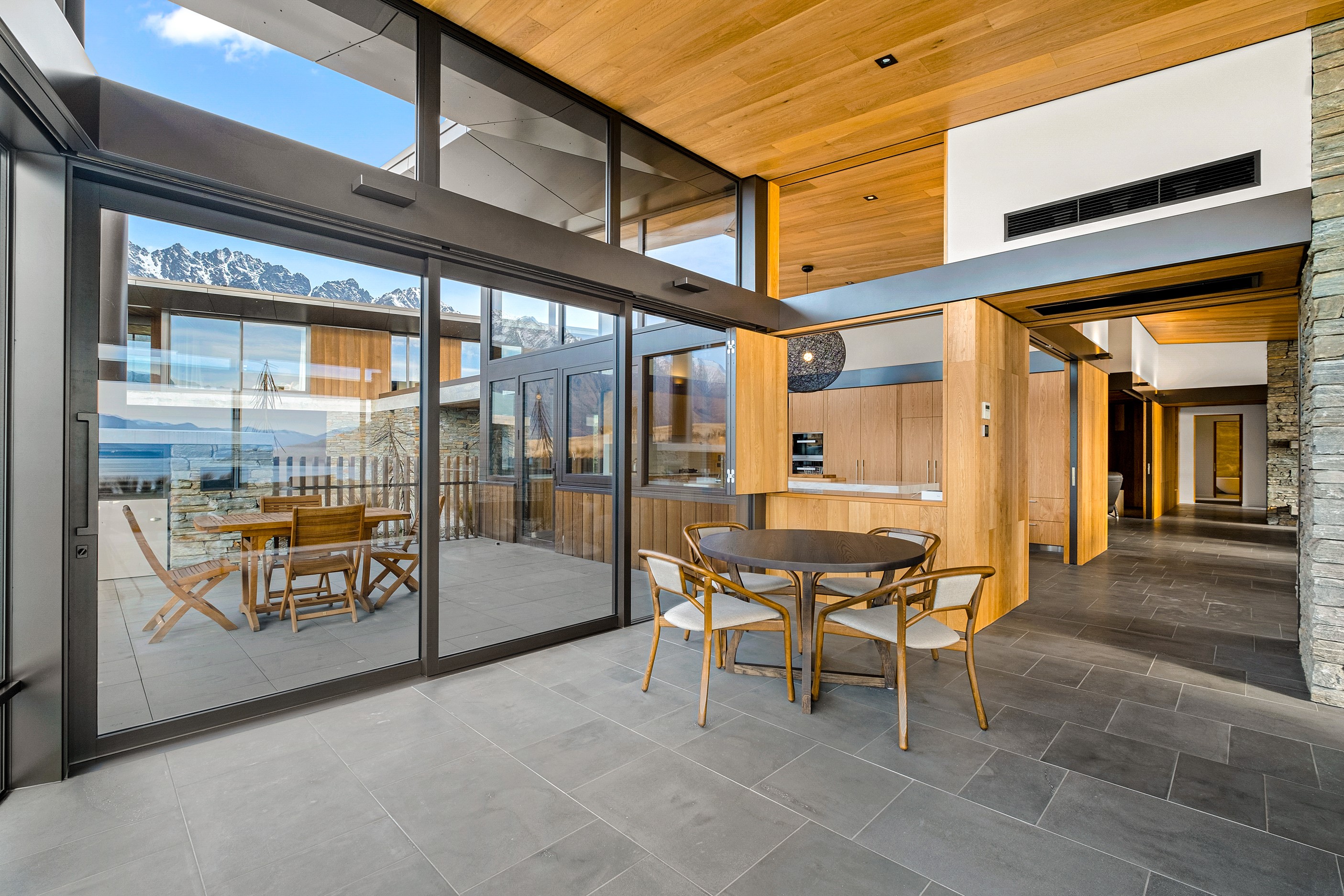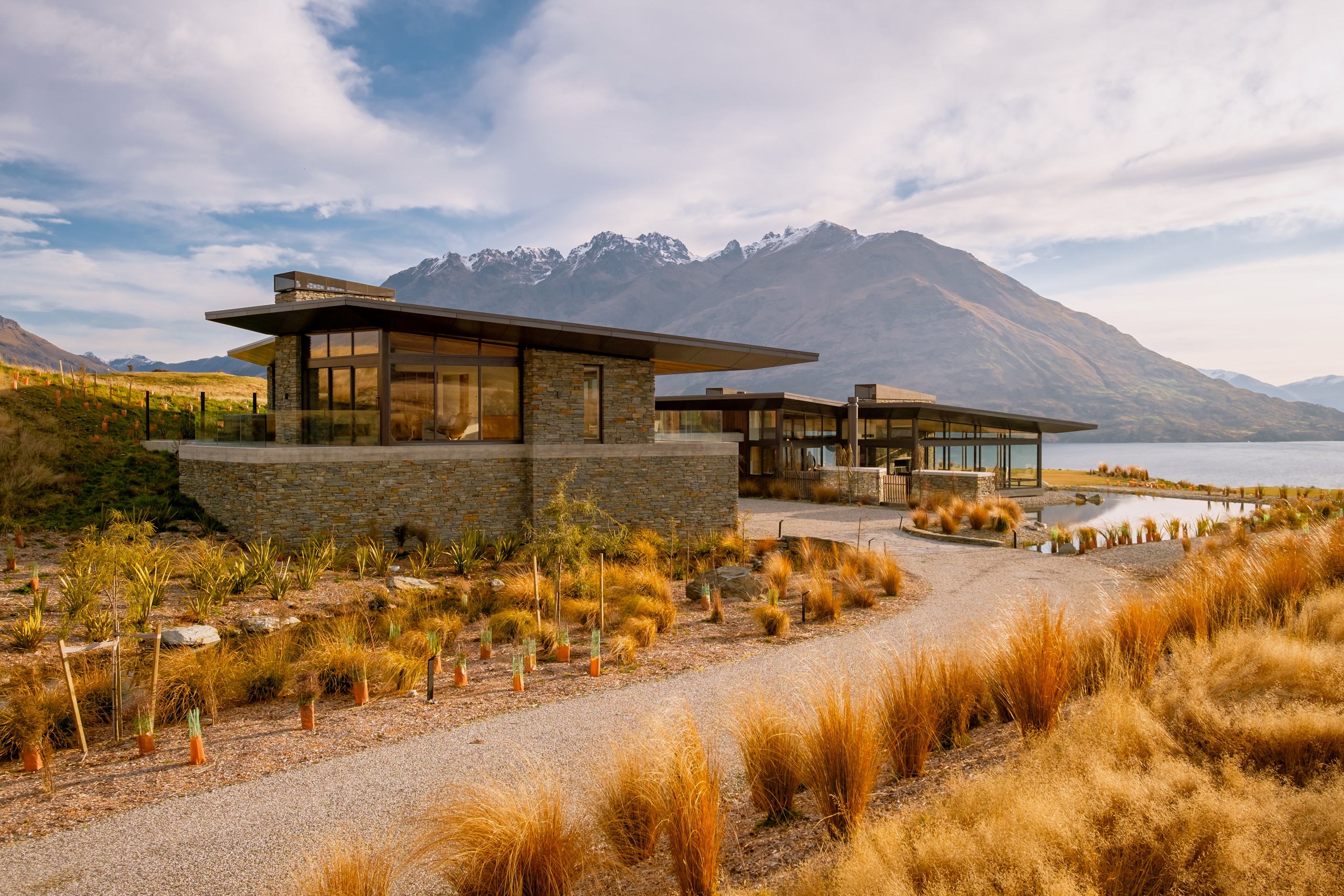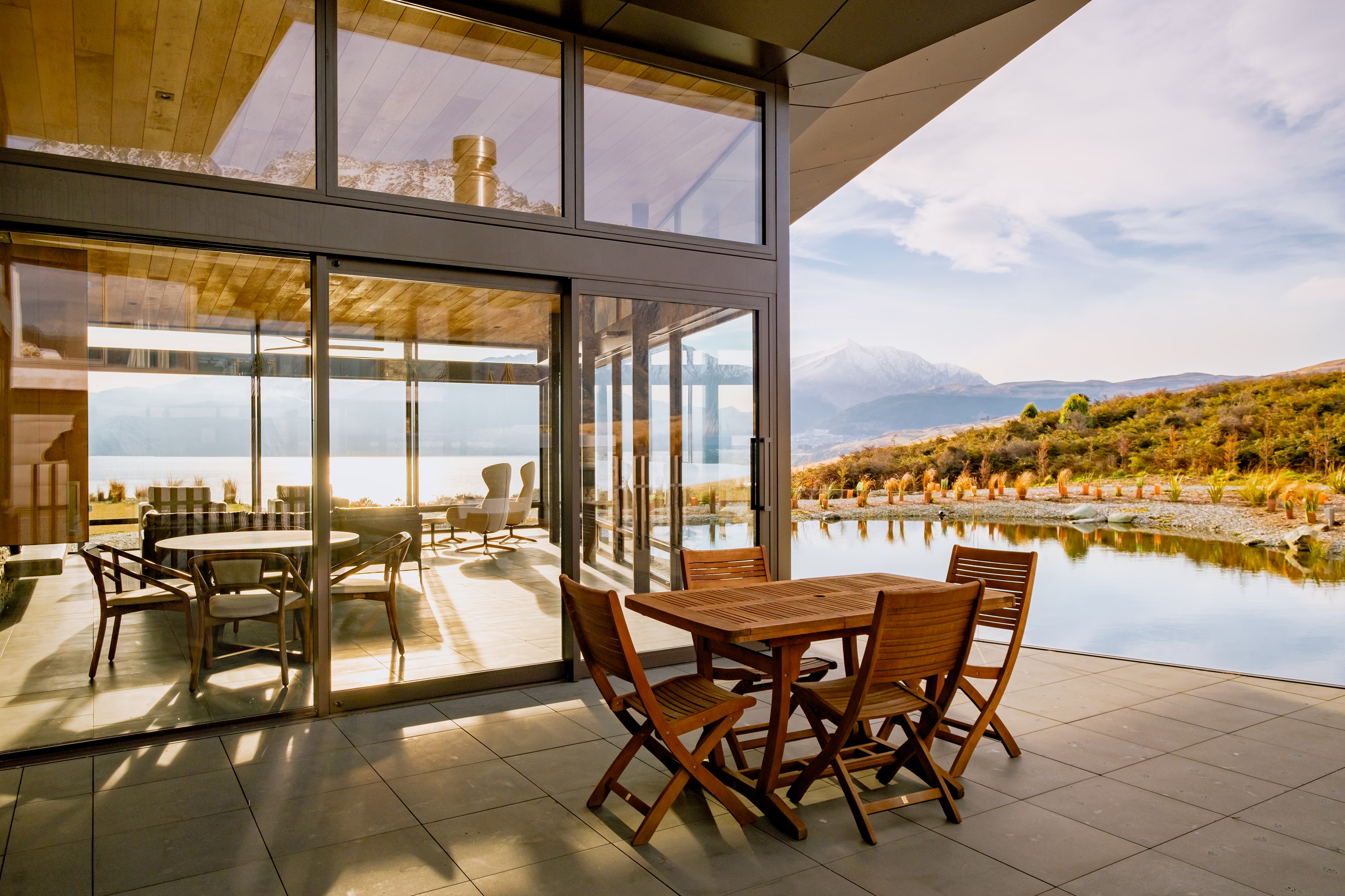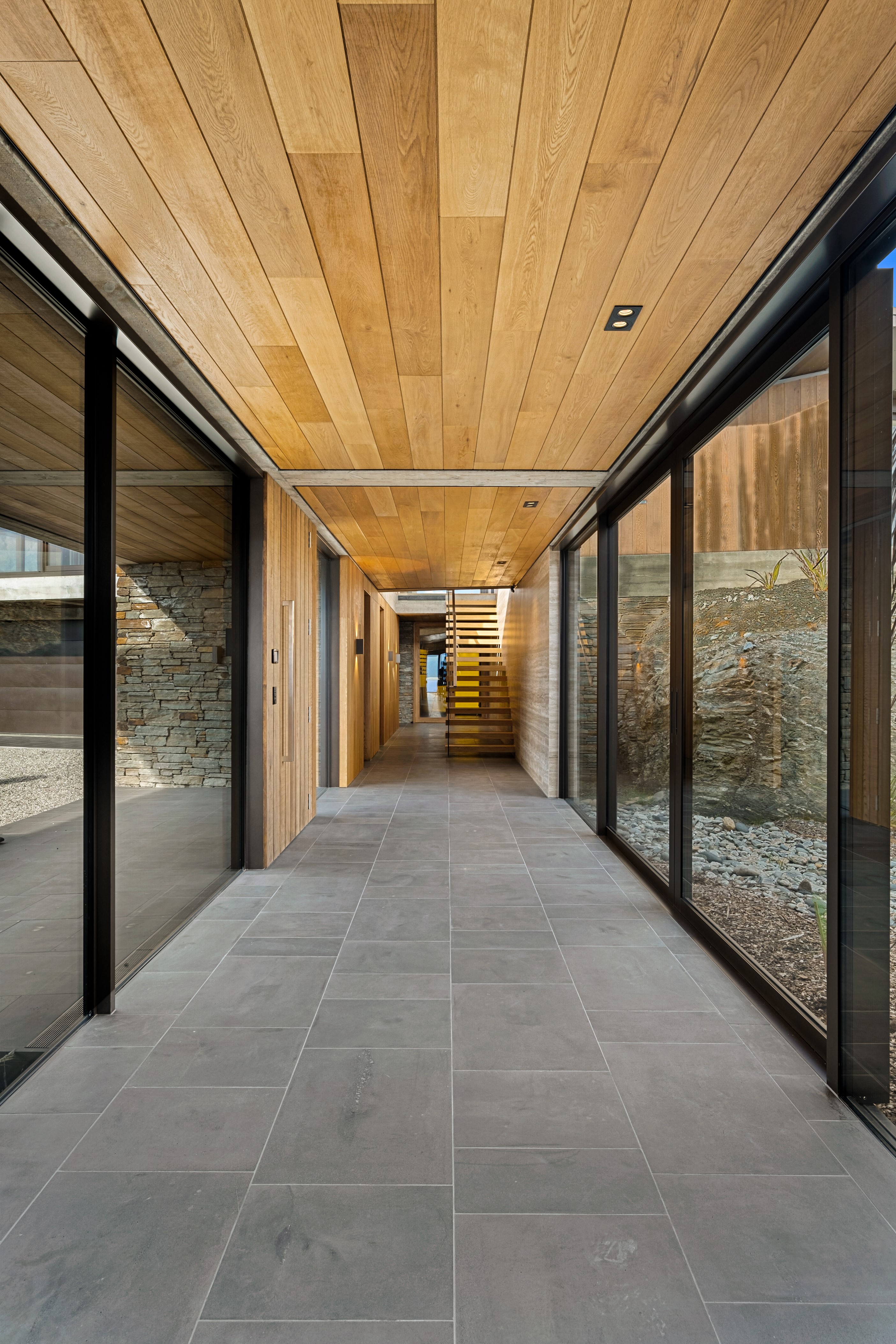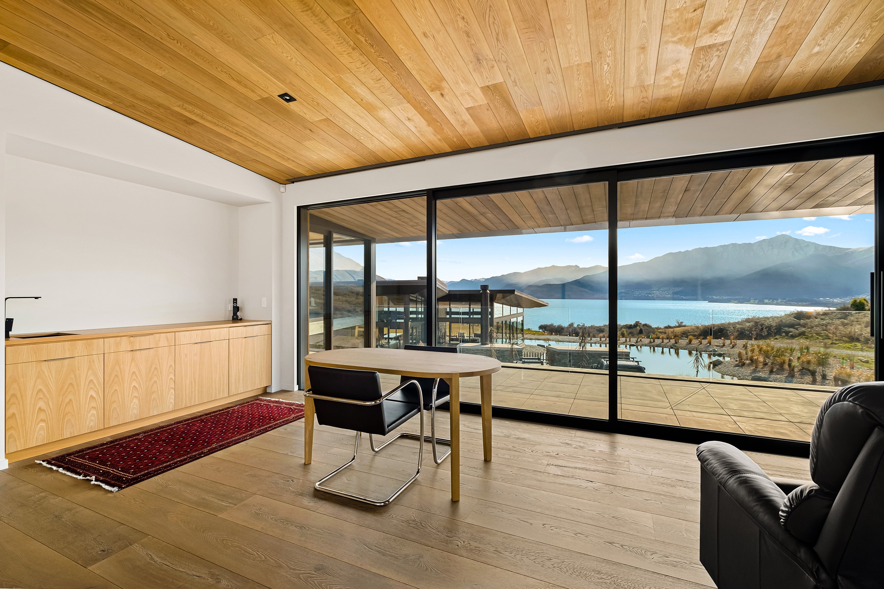 Two house forms are set into the natural ridgeline beneath the Remarkables and overlooking Lake Wakatipu and the Jack’s Point golf course. A two-storied wing faces the mountains to the east. The upper level contains three bedrooms, an office and a separate living area, while there are a garage, storage and laundry area below. The west wing faces the lake and has the main living spaces. A separate wing has guest suites.
