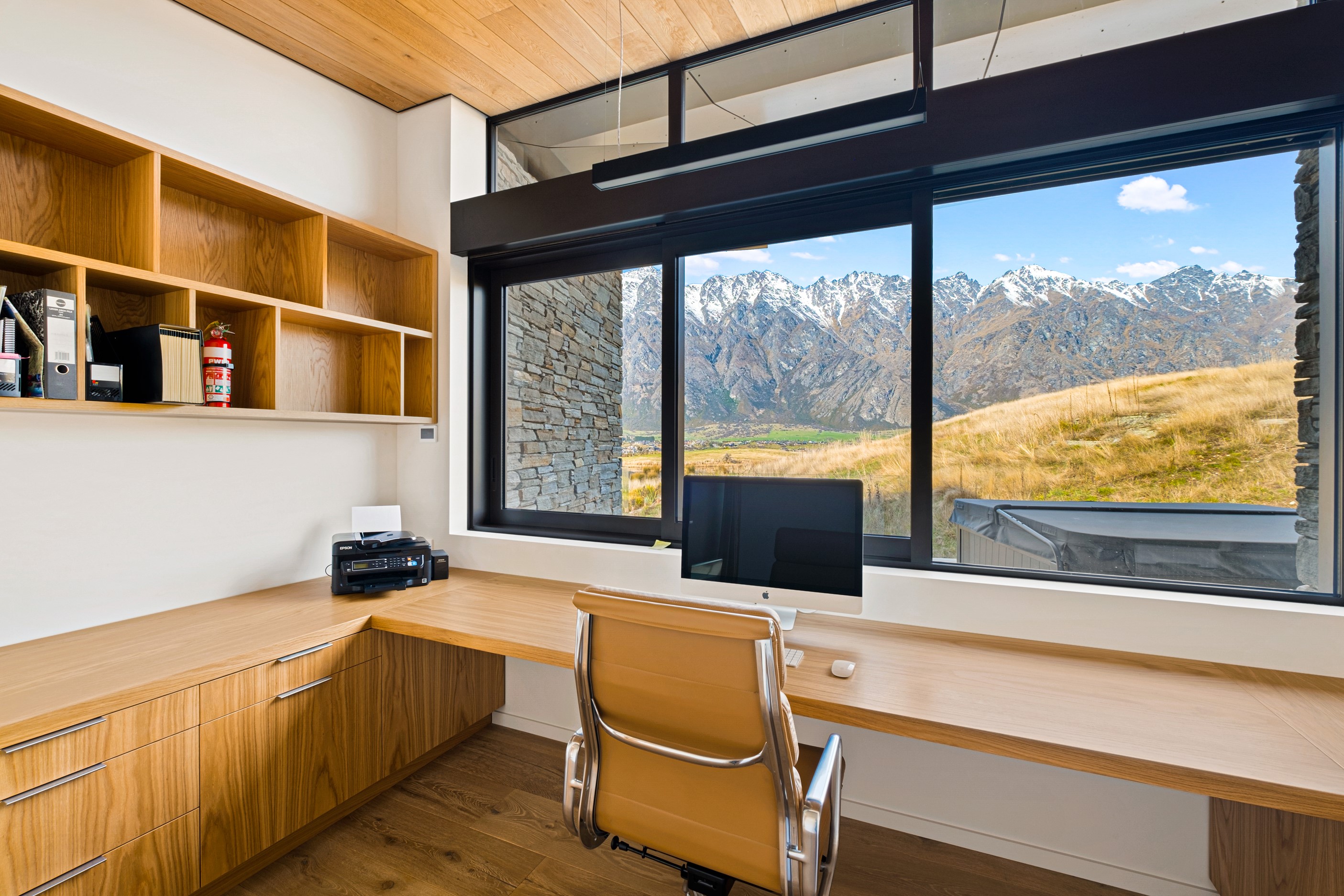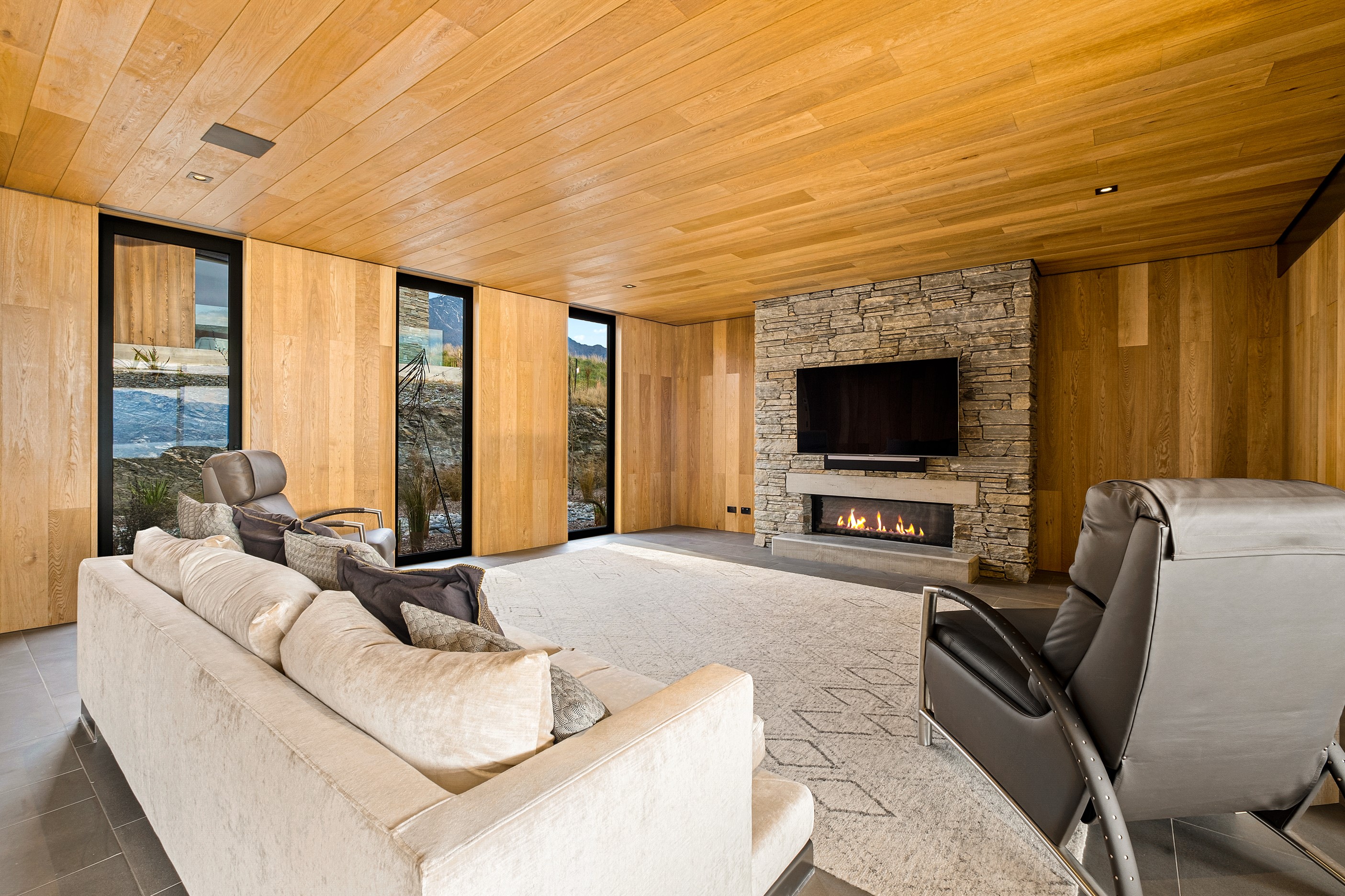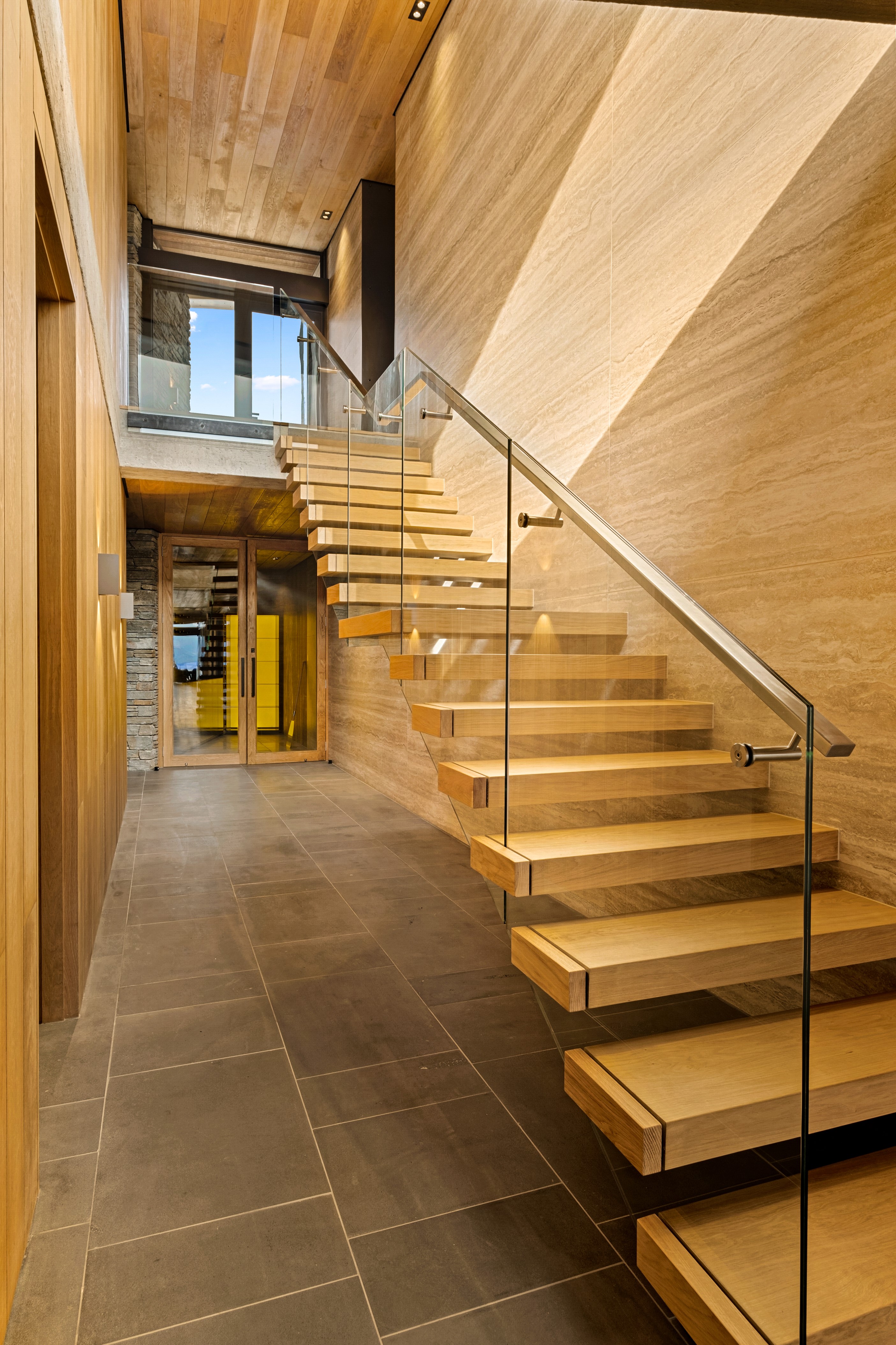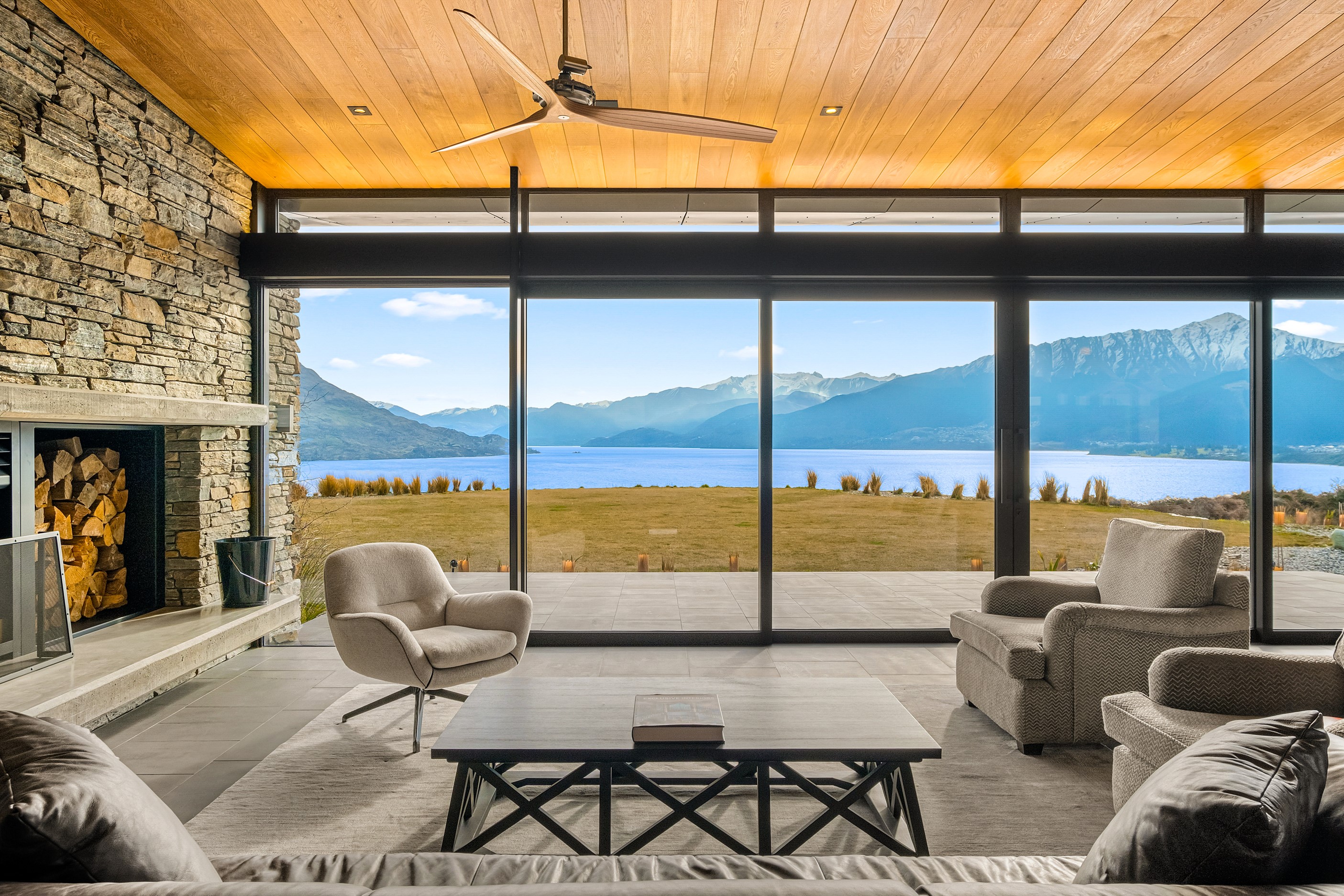 Two house forms are set into the natural ridgeline beneath the Remarkables and overlooking Lake Wakatipu and the Jack’s Point golf course. A two-storied wing faces the mountains to the east. The upper level contains three bedrooms, an office and a separate living area, while there are a garage, storage and laundry area below. The west wing faces the lake and has the main living spaces. A separate wing has guest suites.