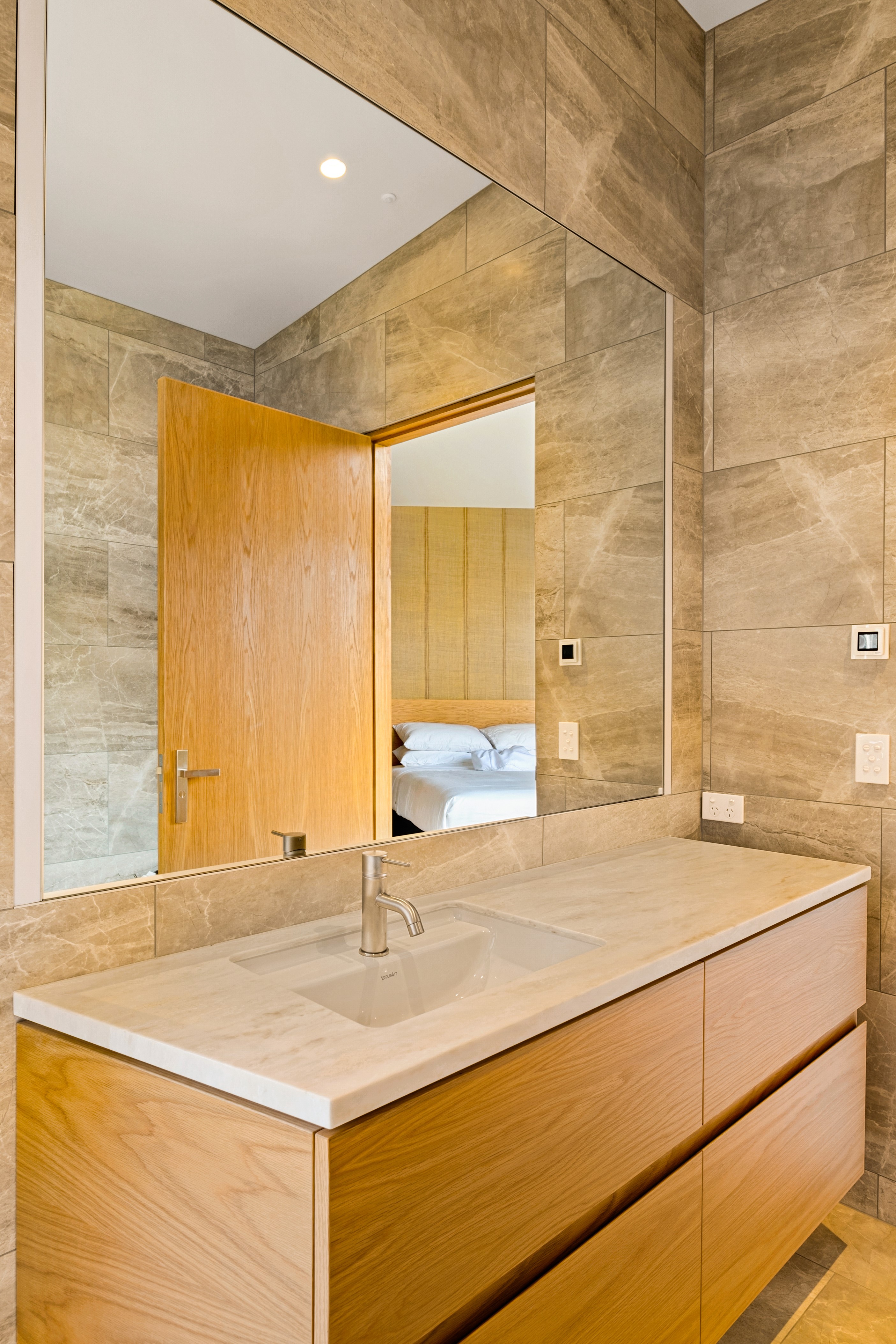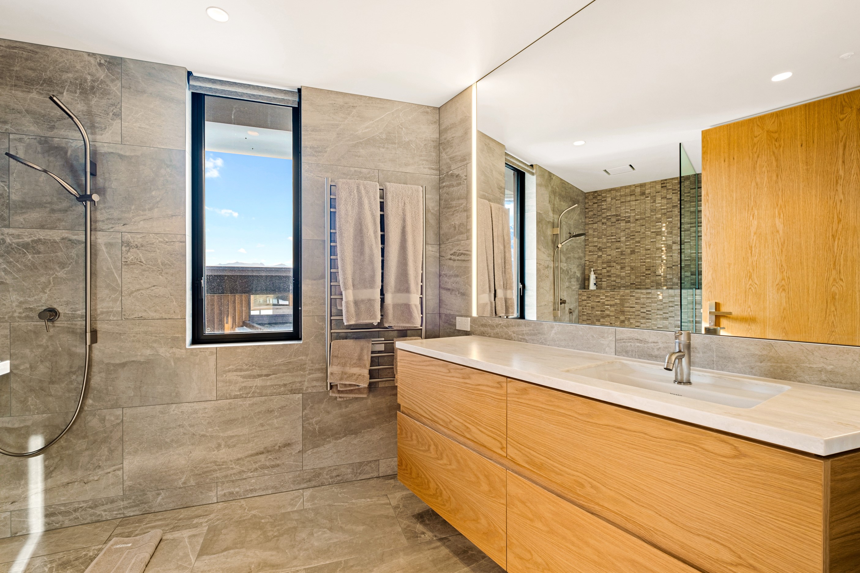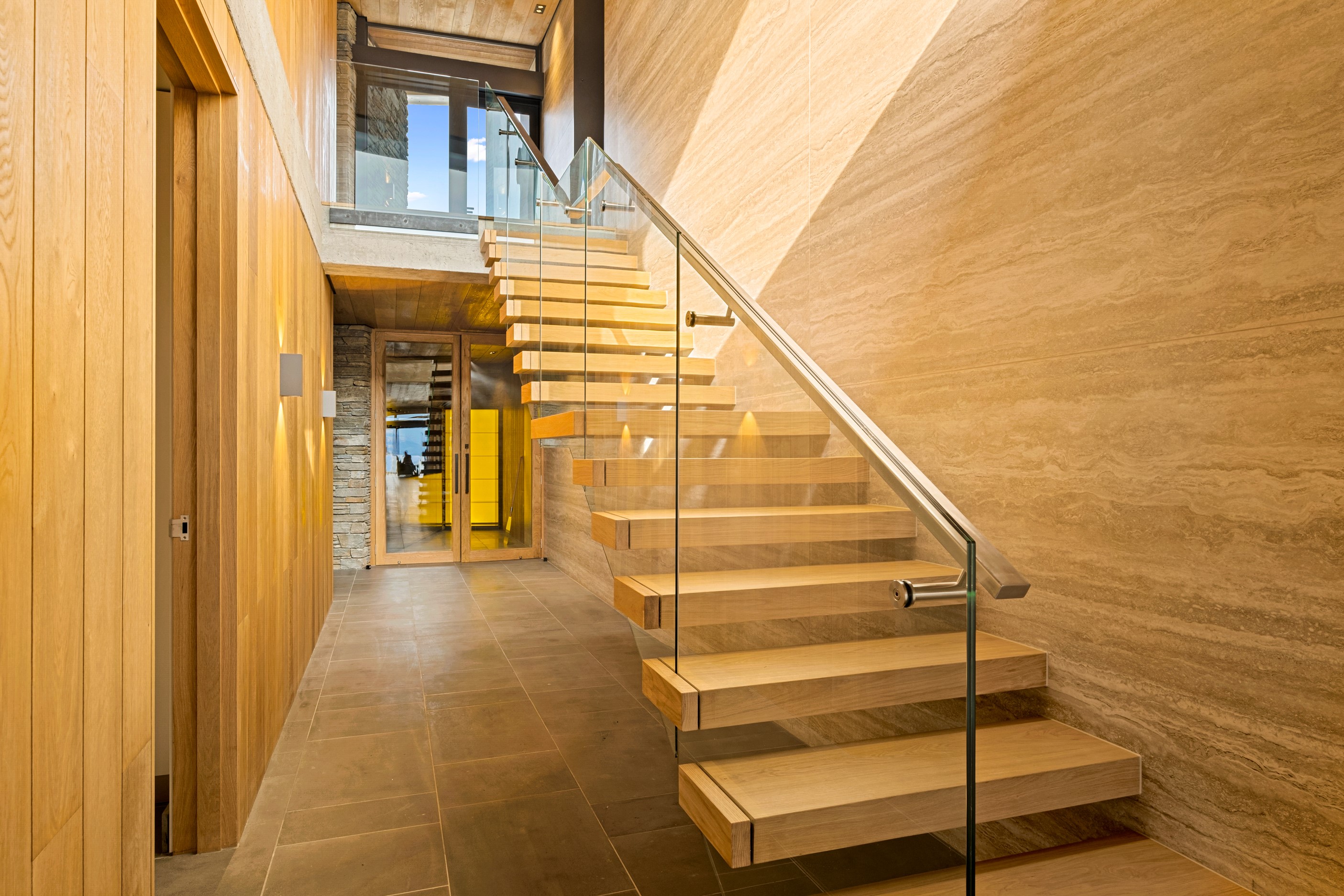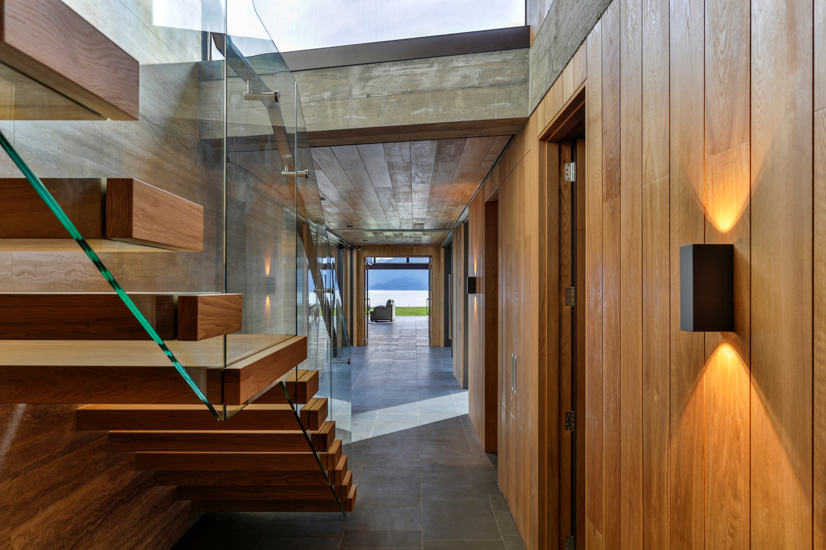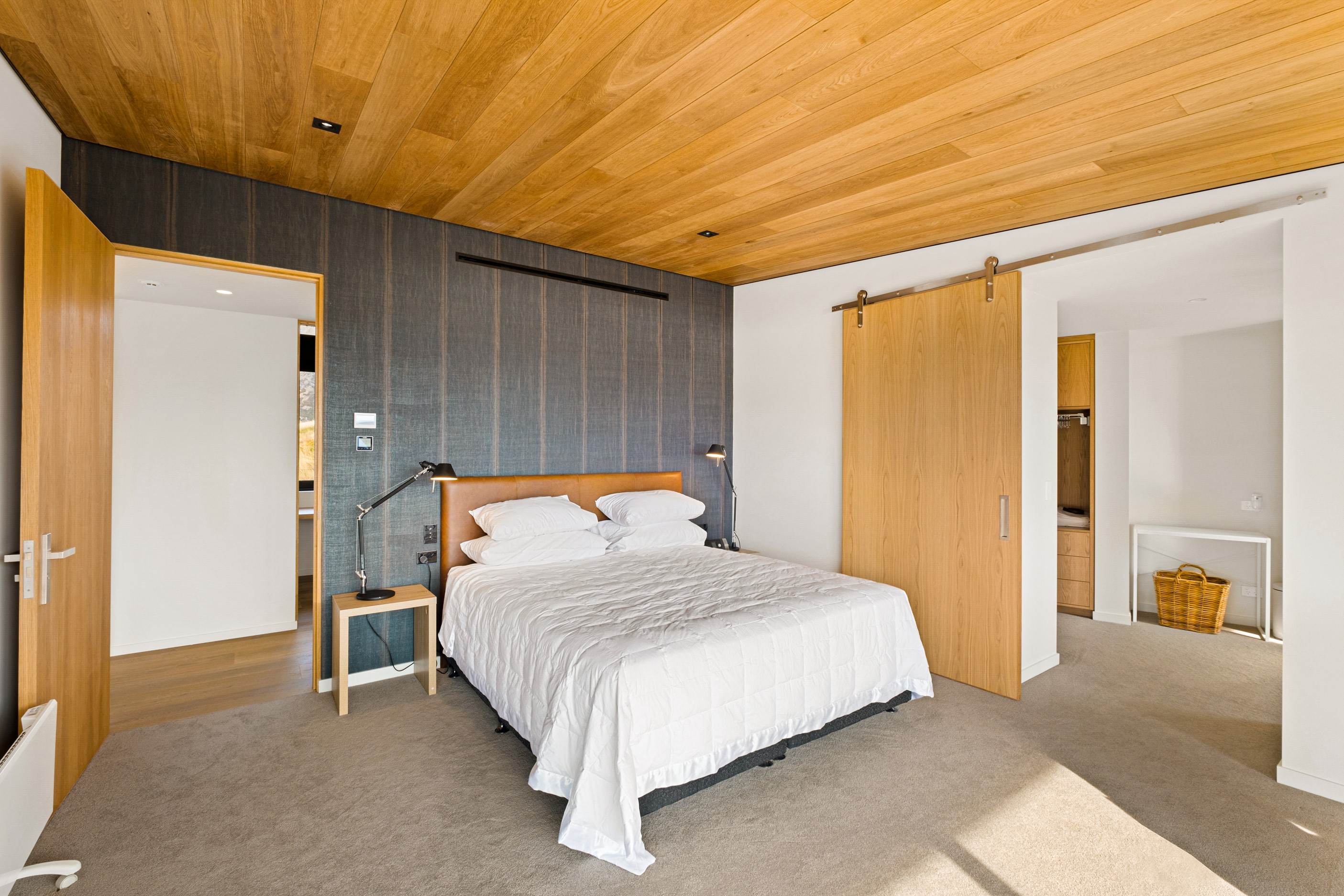 Two house forms are set into the natural ridgeline beneath the Remarkables and overlooking Lake Wakatipu and the Jack’s Point golf course. A two-storied wing faces the mountains to the east. The upper level contains three bedrooms, an office and a separate living area, while there are a garage, storage and laundry area below. The west wing faces the lake and has the main living spaces. A separate wing has guest suites.