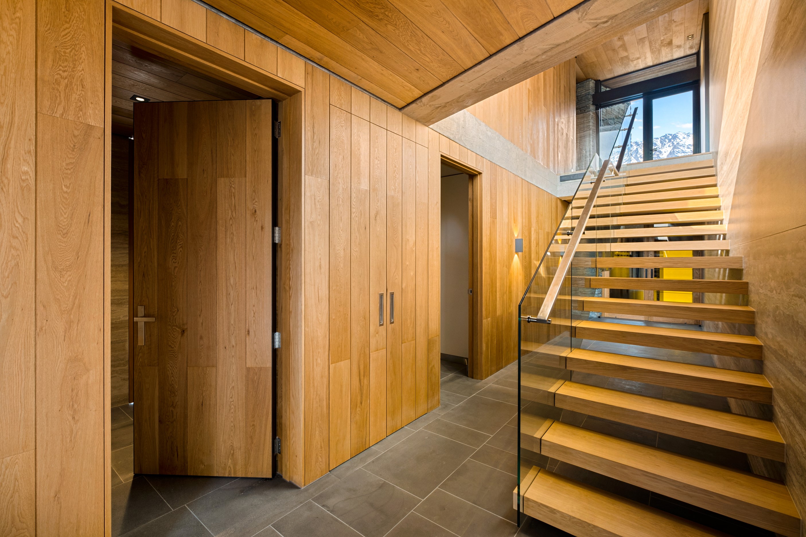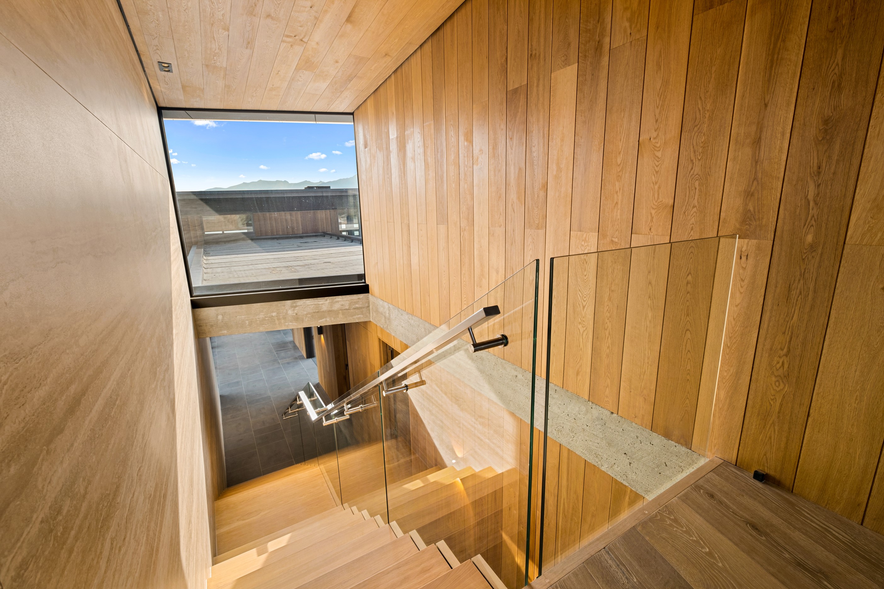 Elements such as the cantilevered staircase off a travertine wall, honed blue stone and feature steelwork demonstrate attention to detail. Achieving a thermally efficient and low-energy home was a critical part of the brief. The response is a high-performing thermal envelope with a heavily insulated roof, while thermally broken, double-glazing and large eaves regulate heat during the summer. A ground-source heating system and photo-voltaic solar panels were also installed.