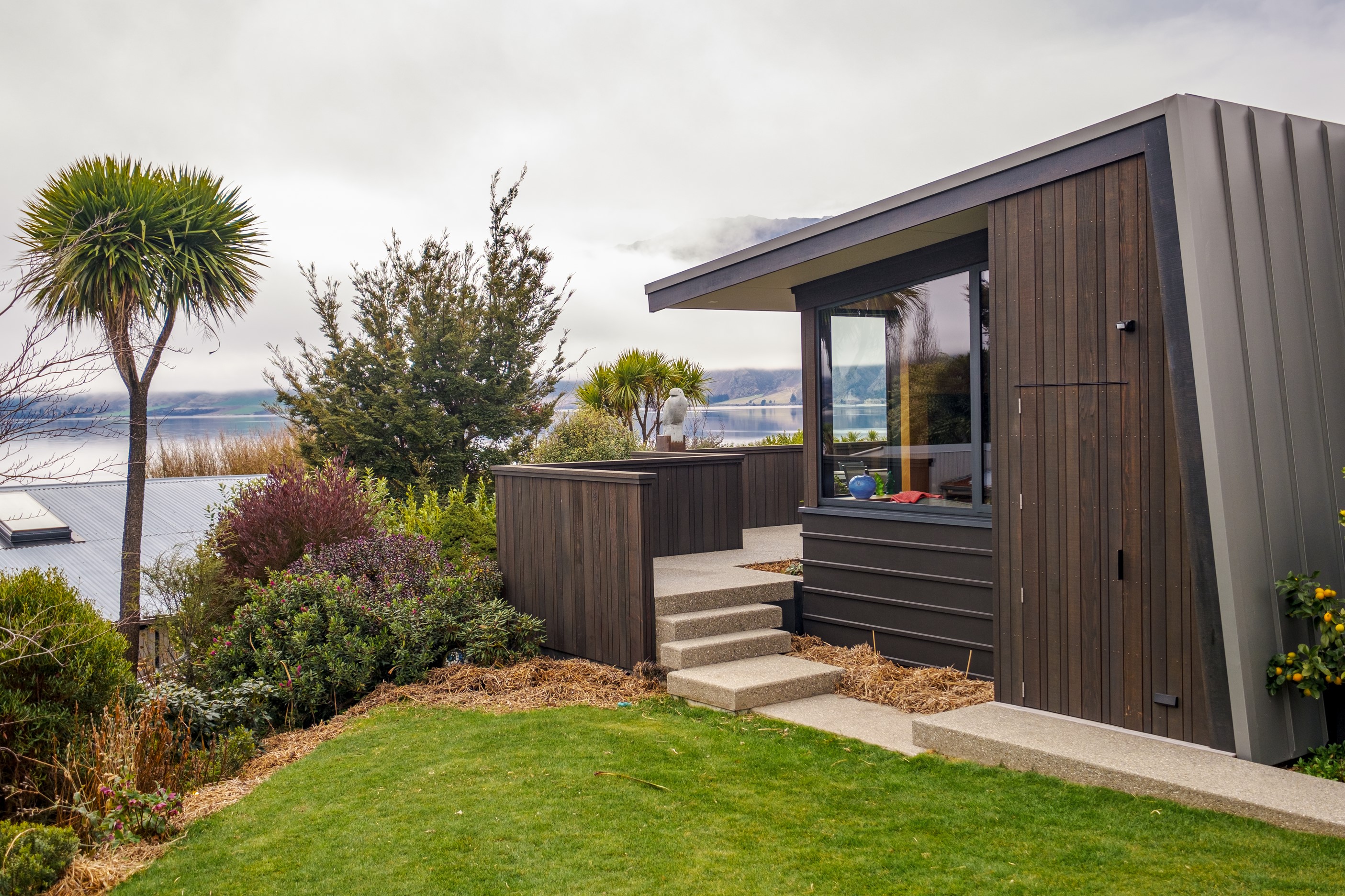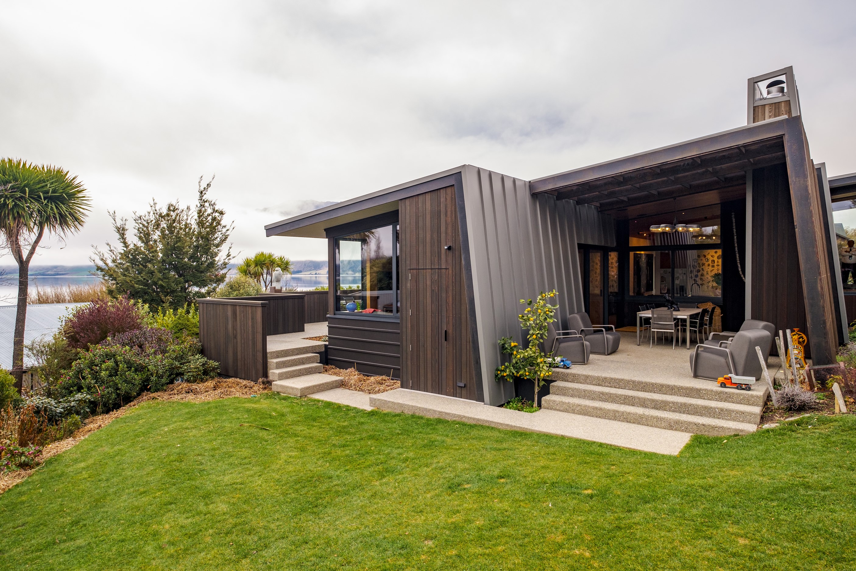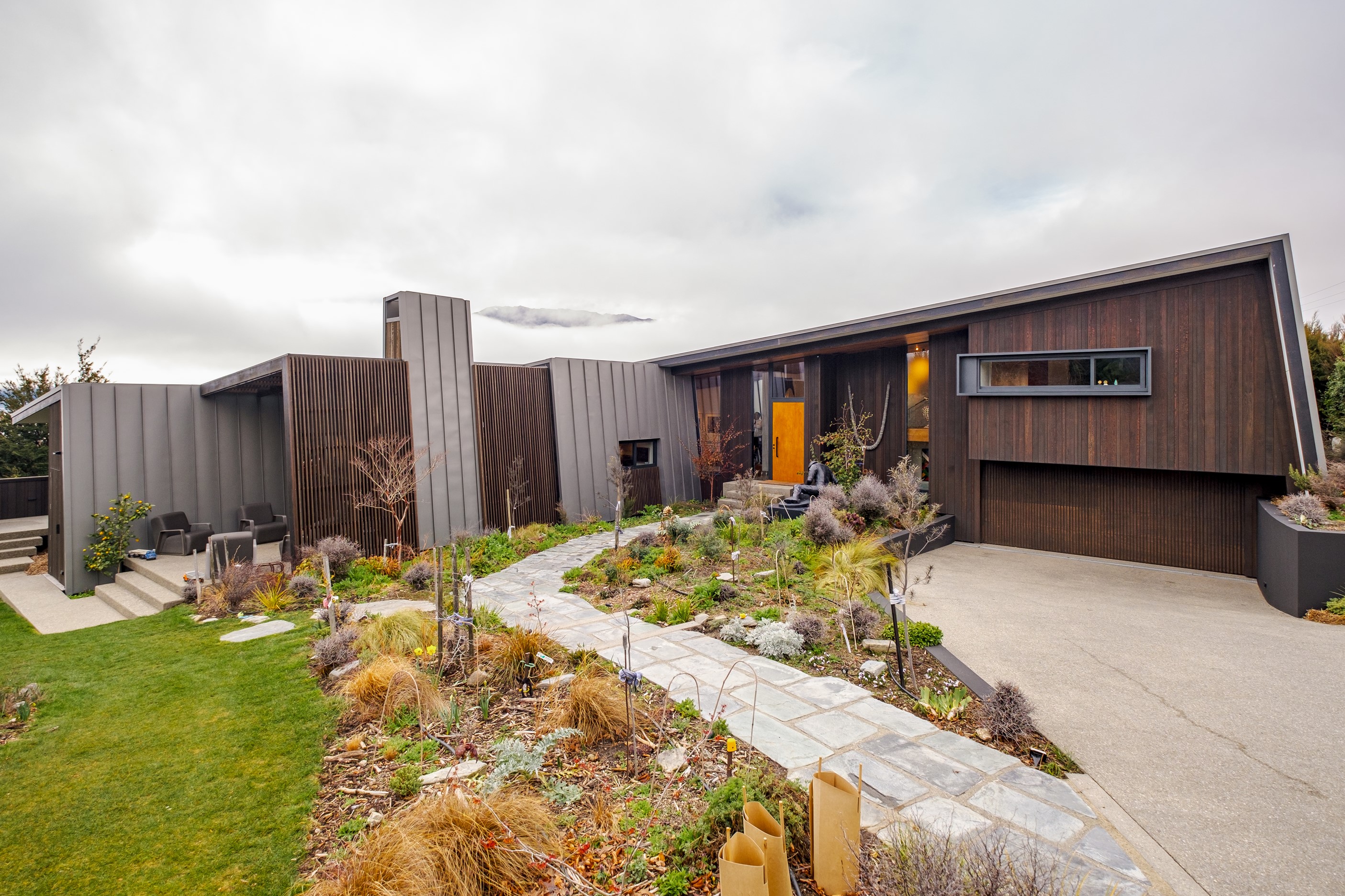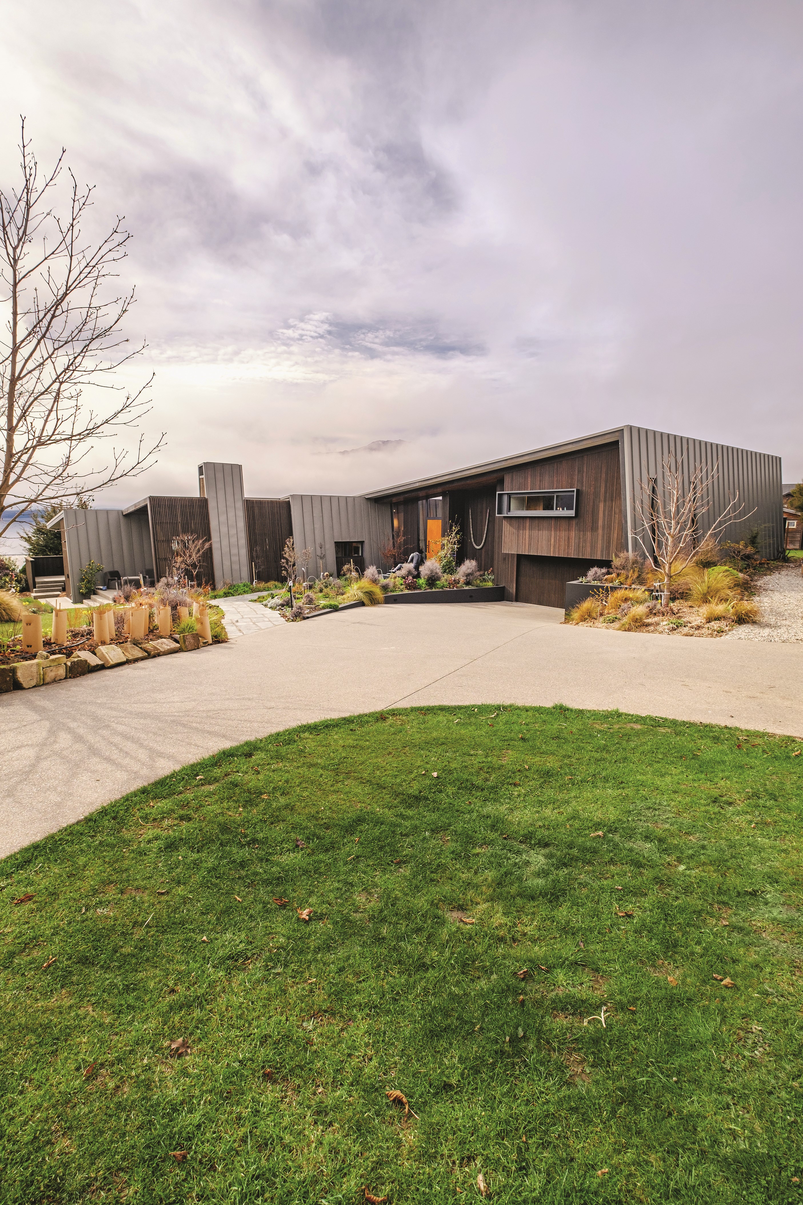 A large sculptural form has appeared on the shores of Lake Hāwea – but it doesn’t dominate the landscape. That’s because the five-bedroom luxury home has been designed so it can never be seen in its entirety from outside the property. On the street, the higher parts of the southern roof are only visible through vegetation, and the northern roof is low so the house can’t be spotted from the lake. Zinc roofing, stained cedar and charcoal-coloured aluminium also help it merge into its surroundings.