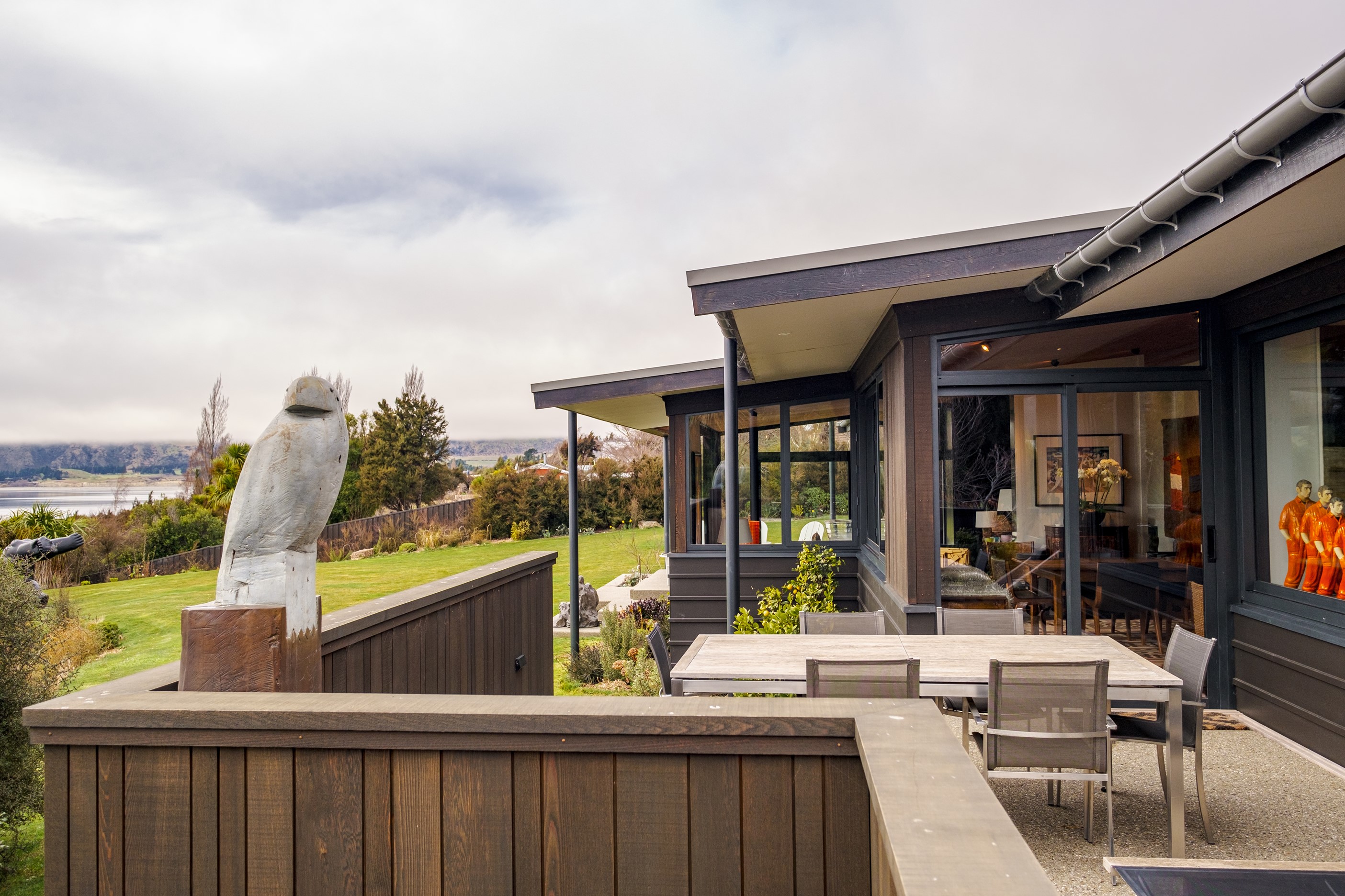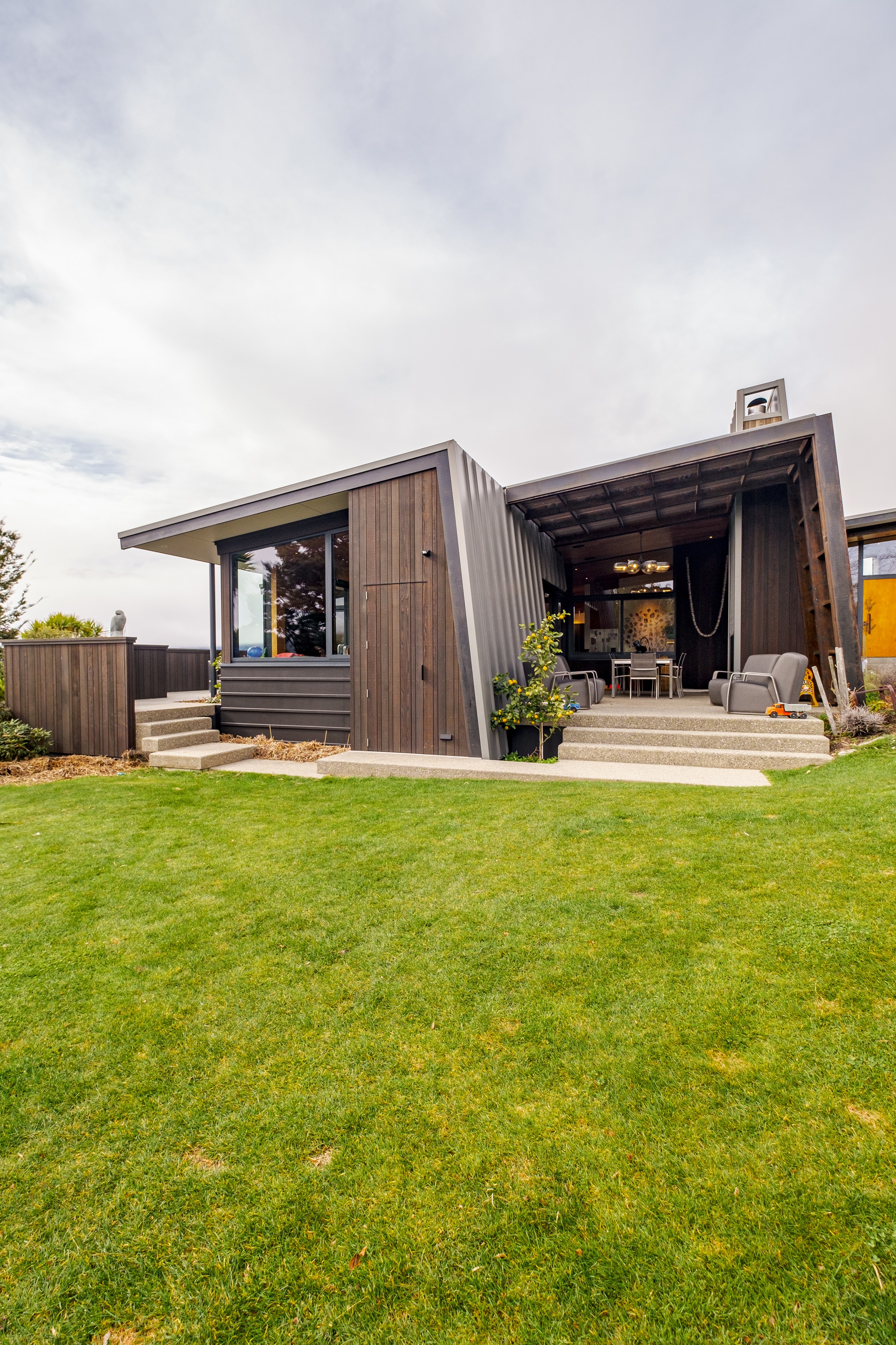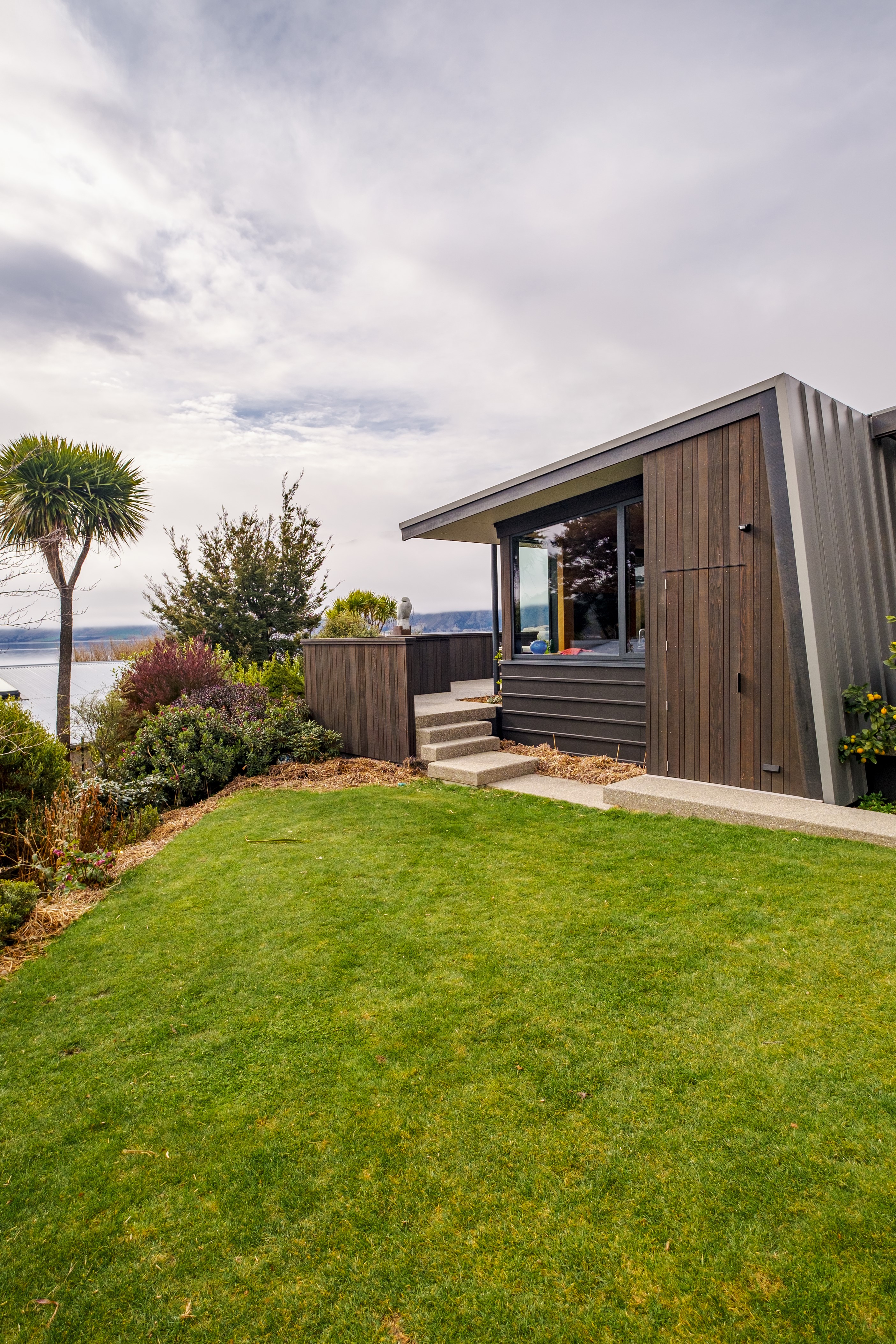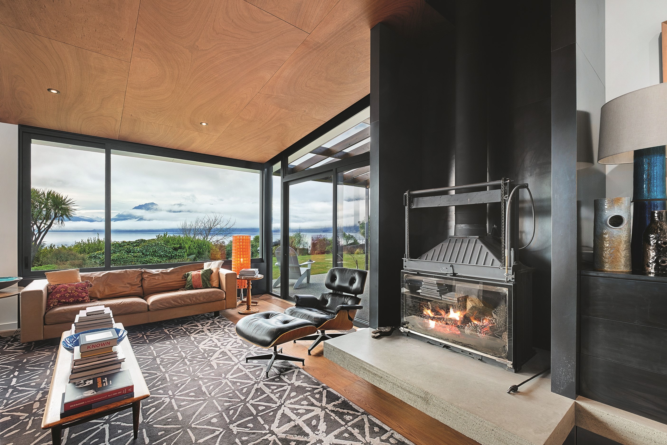 A large sculptural form has appeared on the shores of Lake Hāwea – but it doesn’t dominate the landscape. That’s because the five-bedroom luxury home has been designed so it can never be seen in its entirety from outside the property. On the street, the higher parts of the southern roof are only visible through vegetation, and the northern roof is low so the house can’t be spotted from the lake. Zinc roofing, stained cedar and charcoal-coloured aluminium also help it merge into its surroundings.