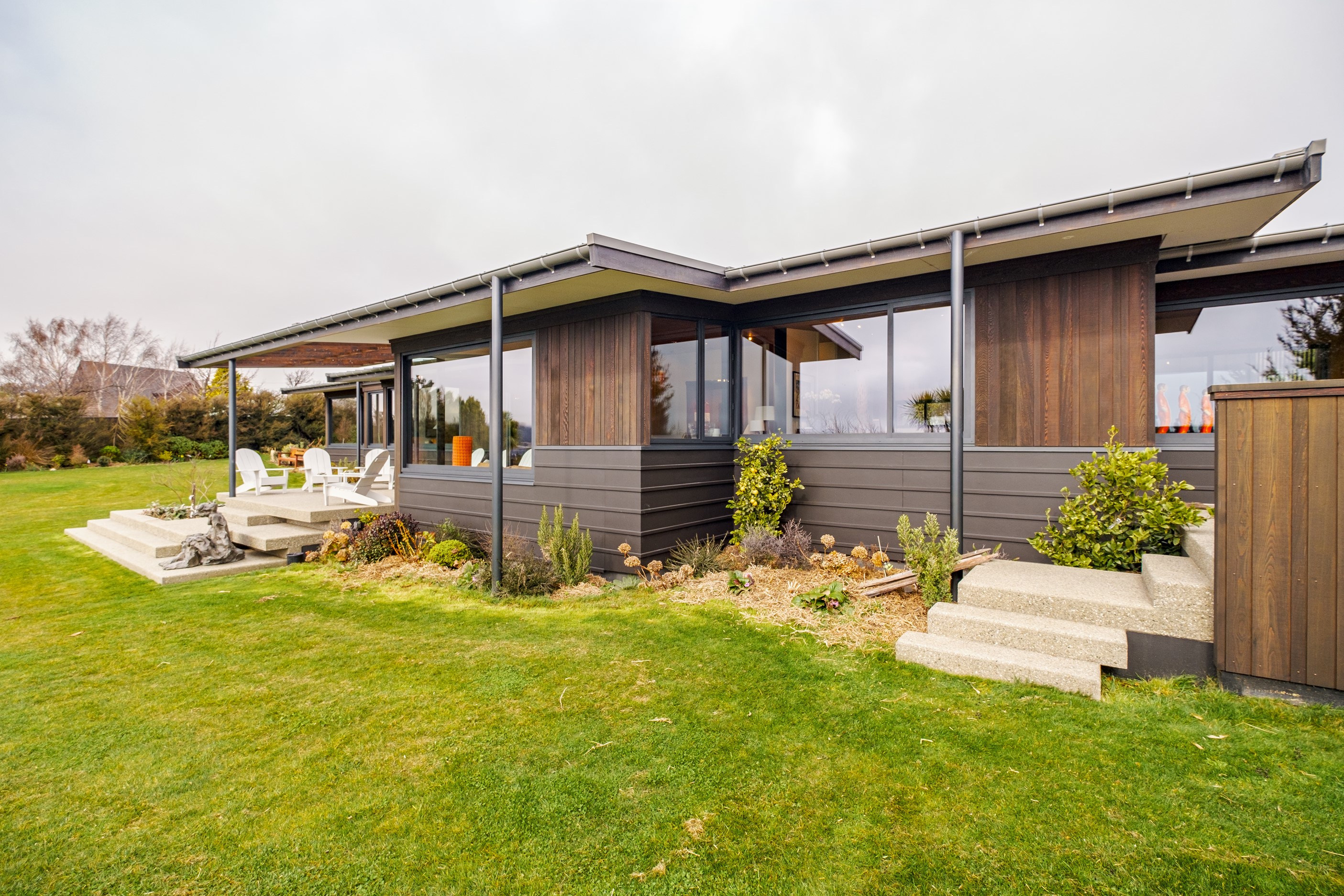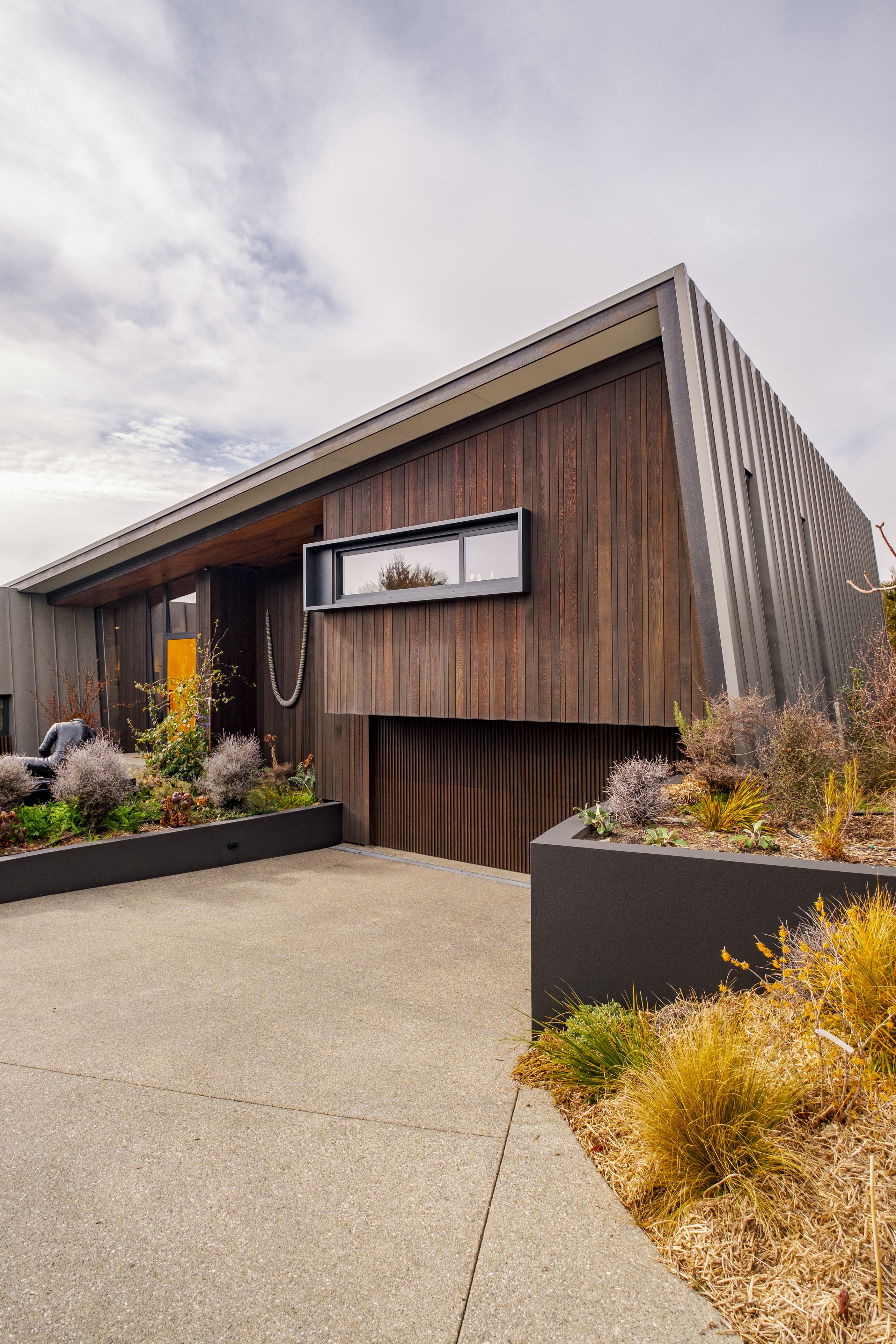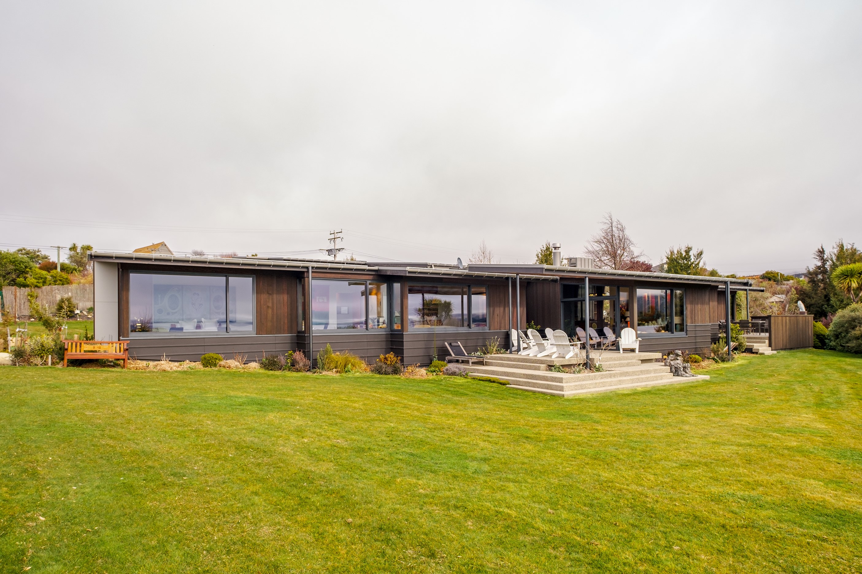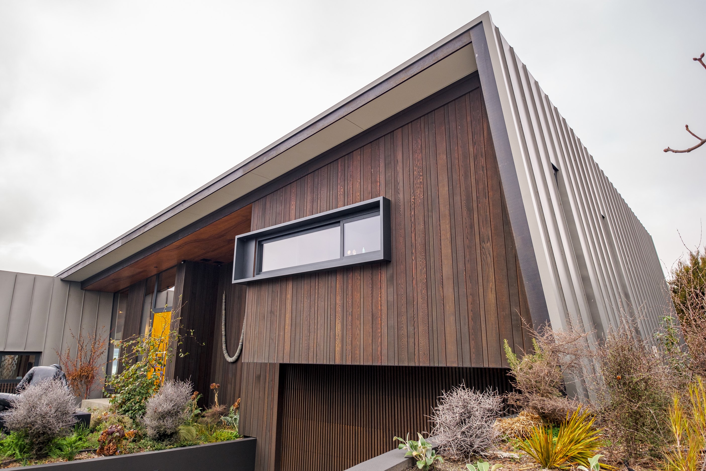 A large sculptural form has appeared on the shores of Lake Hāwea – but it doesn’t dominate the landscape. That’s because the five-bedroom luxury home has been designed so it can never be seen in its entirety from outside the property. On the street, the higher parts of the southern roof are only visible through vegetation, and the northern roof is low so the house can’t be spotted from the lake. Zinc roofing, stained cedar and charcoal-coloured aluminium also help it merge into its surroundings.