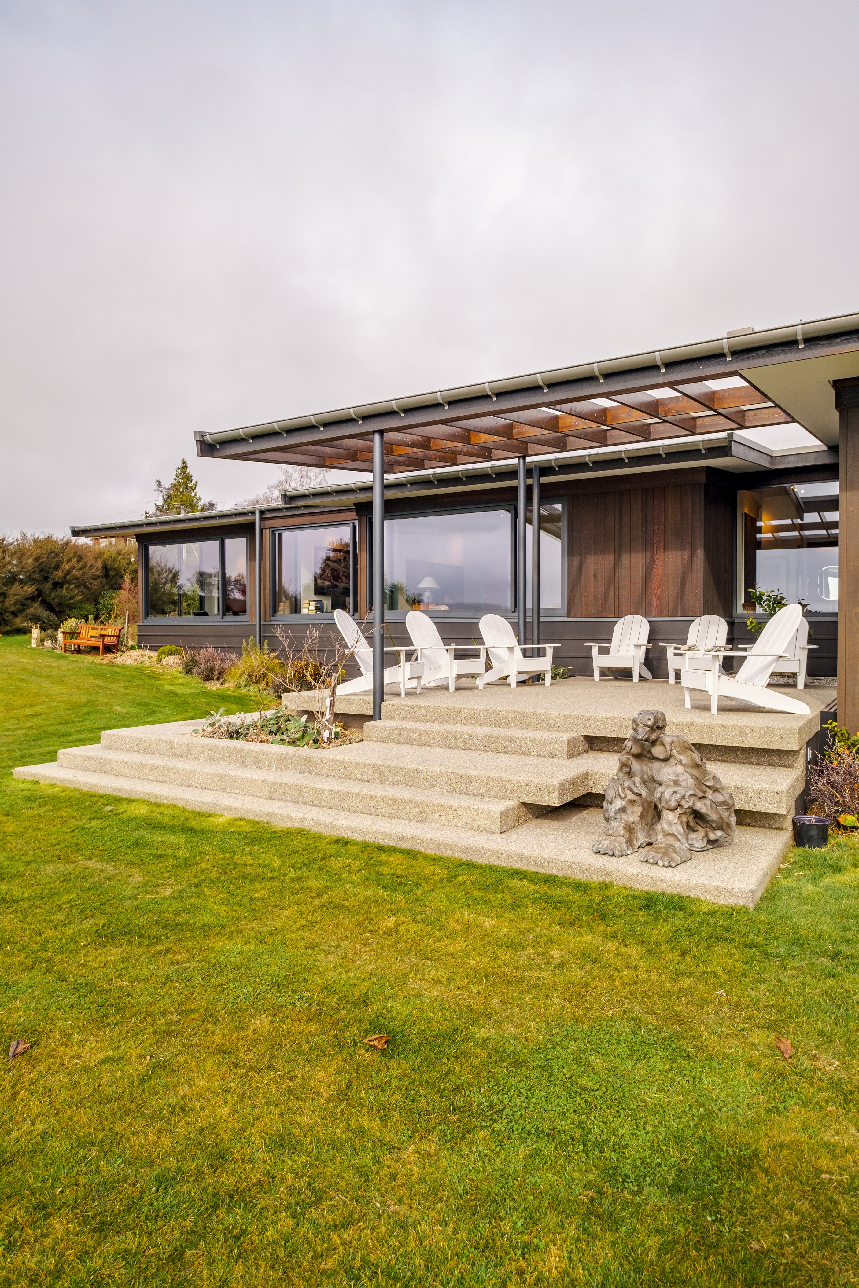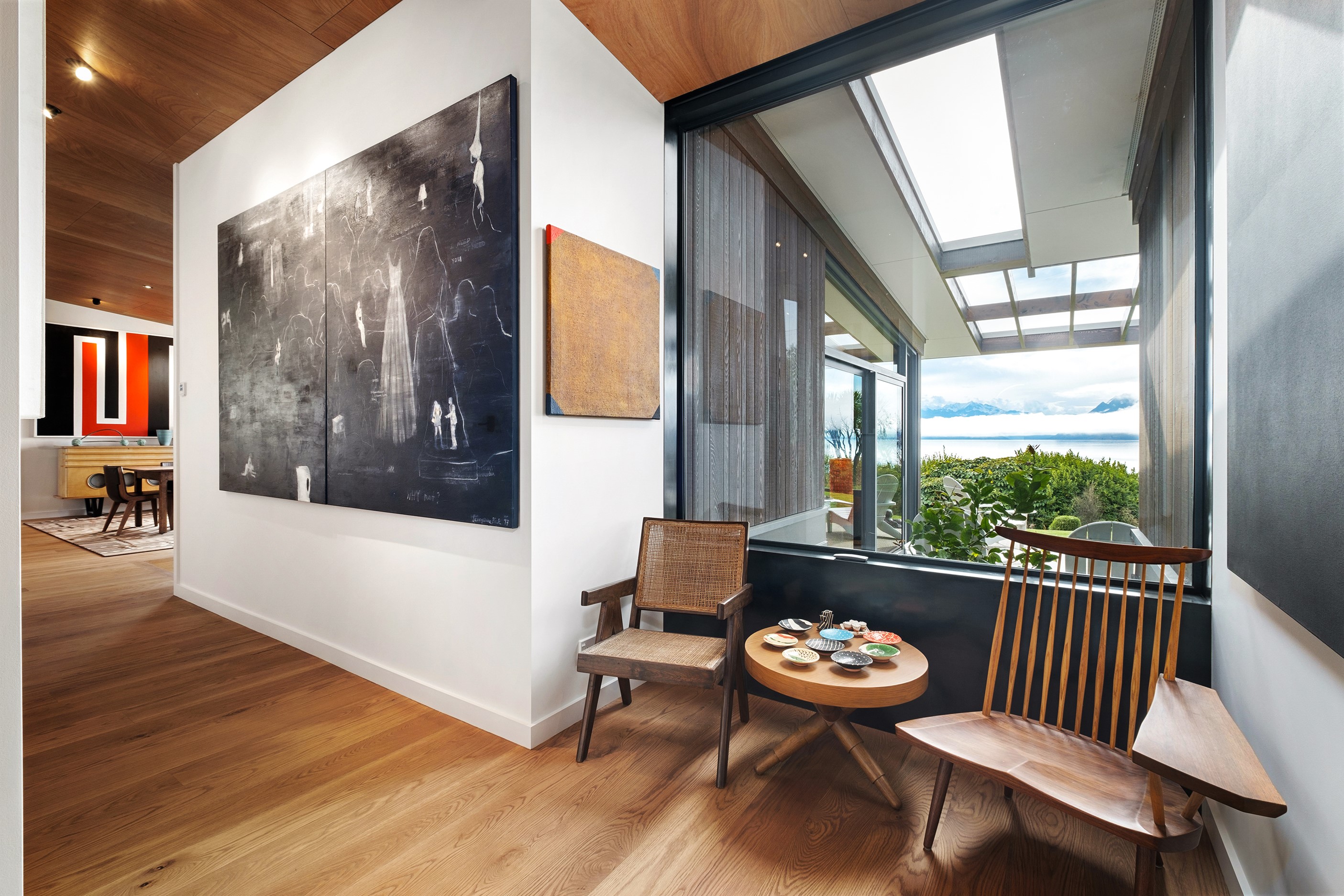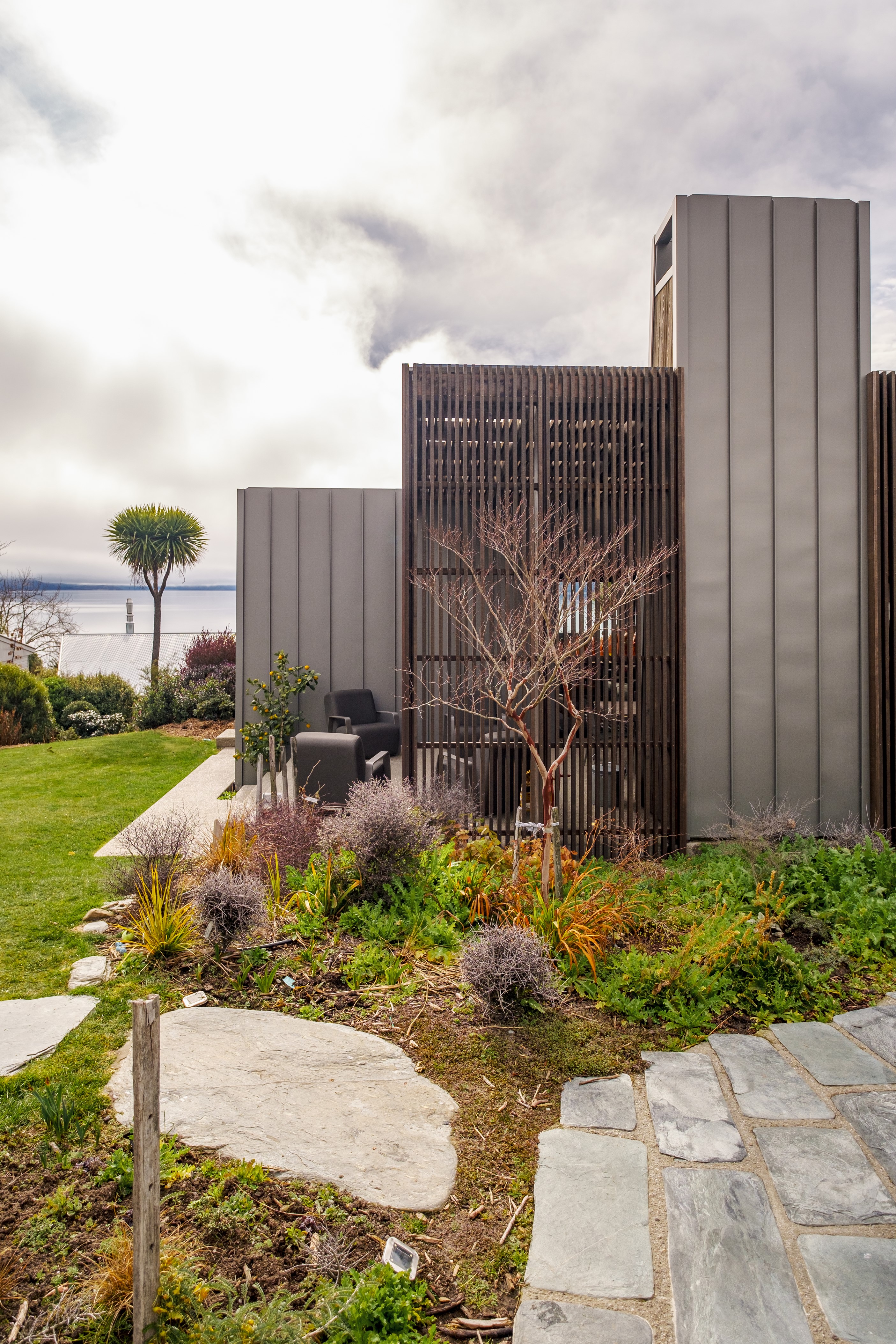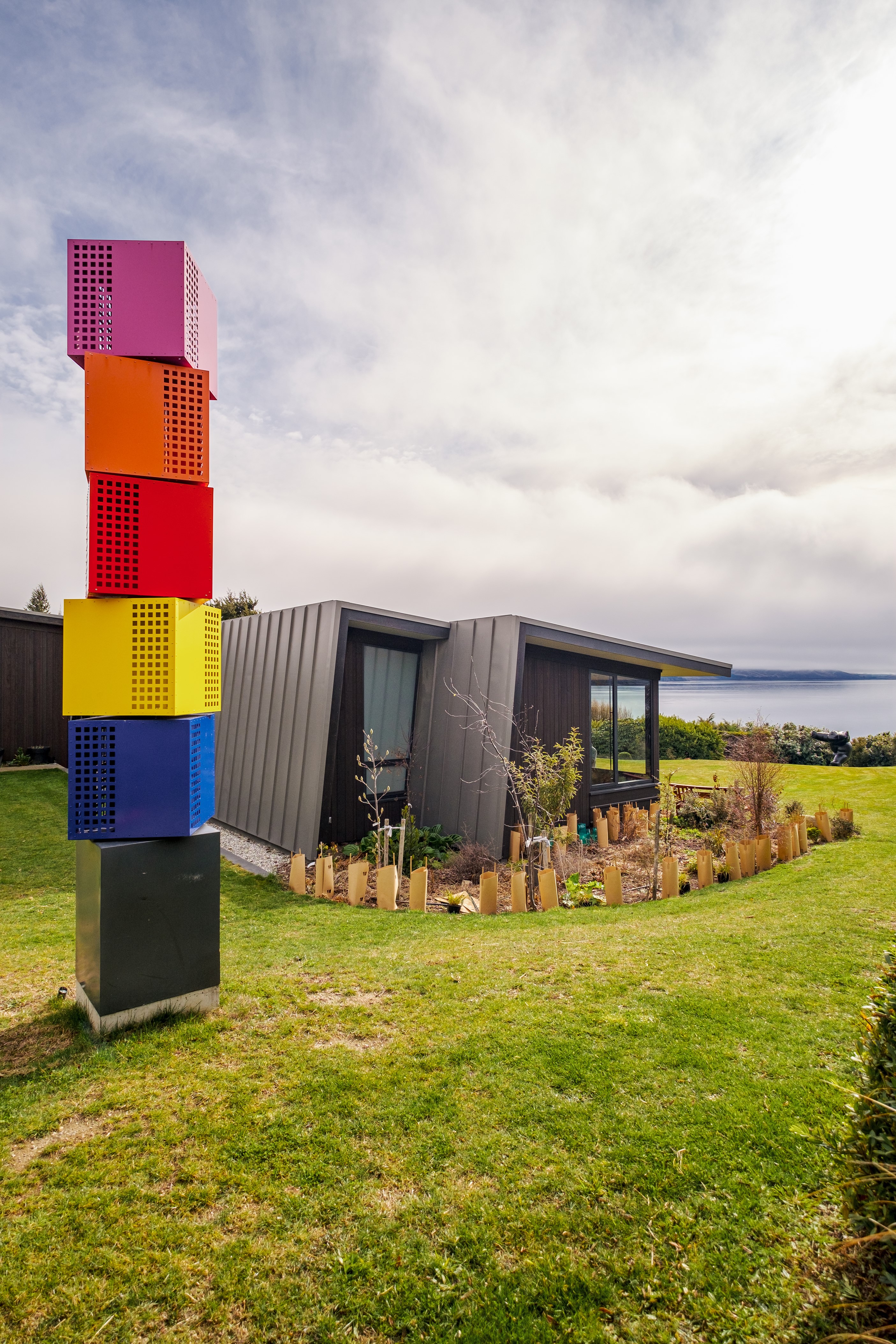 A large sculptural form has appeared on the shores of Lake Hāwea – but it doesn’t dominate the landscape. That’s because the five-bedroom luxury home has been designed so it can never be seen in its entirety from outside the property. On the street, the higher parts of the southern roof are only visible through vegetation, and the northern roof is low so the house can’t be spotted from the lake. Zinc roofing, stained cedar and charcoal-coloured aluminium also help it merge into its surroundings.