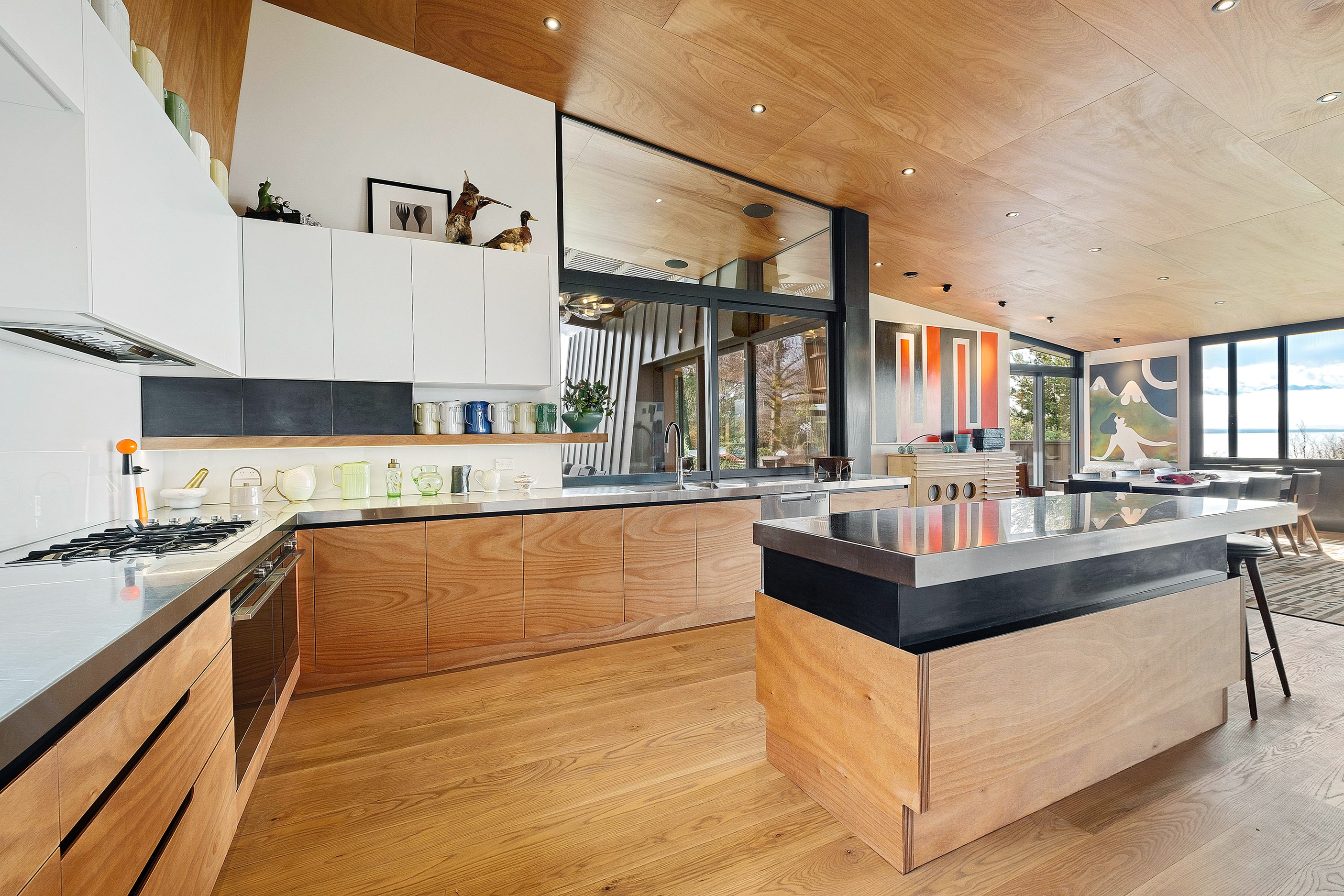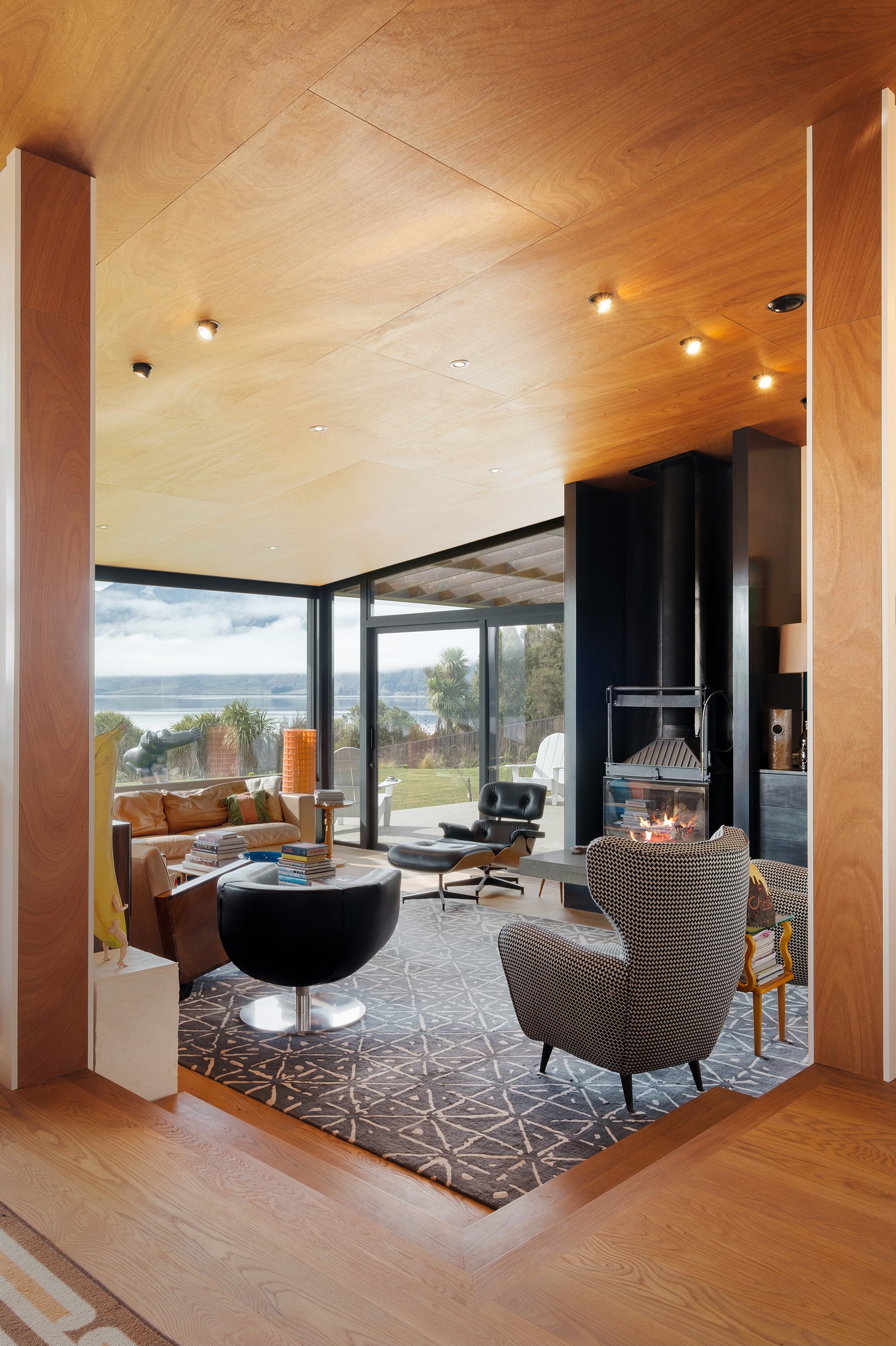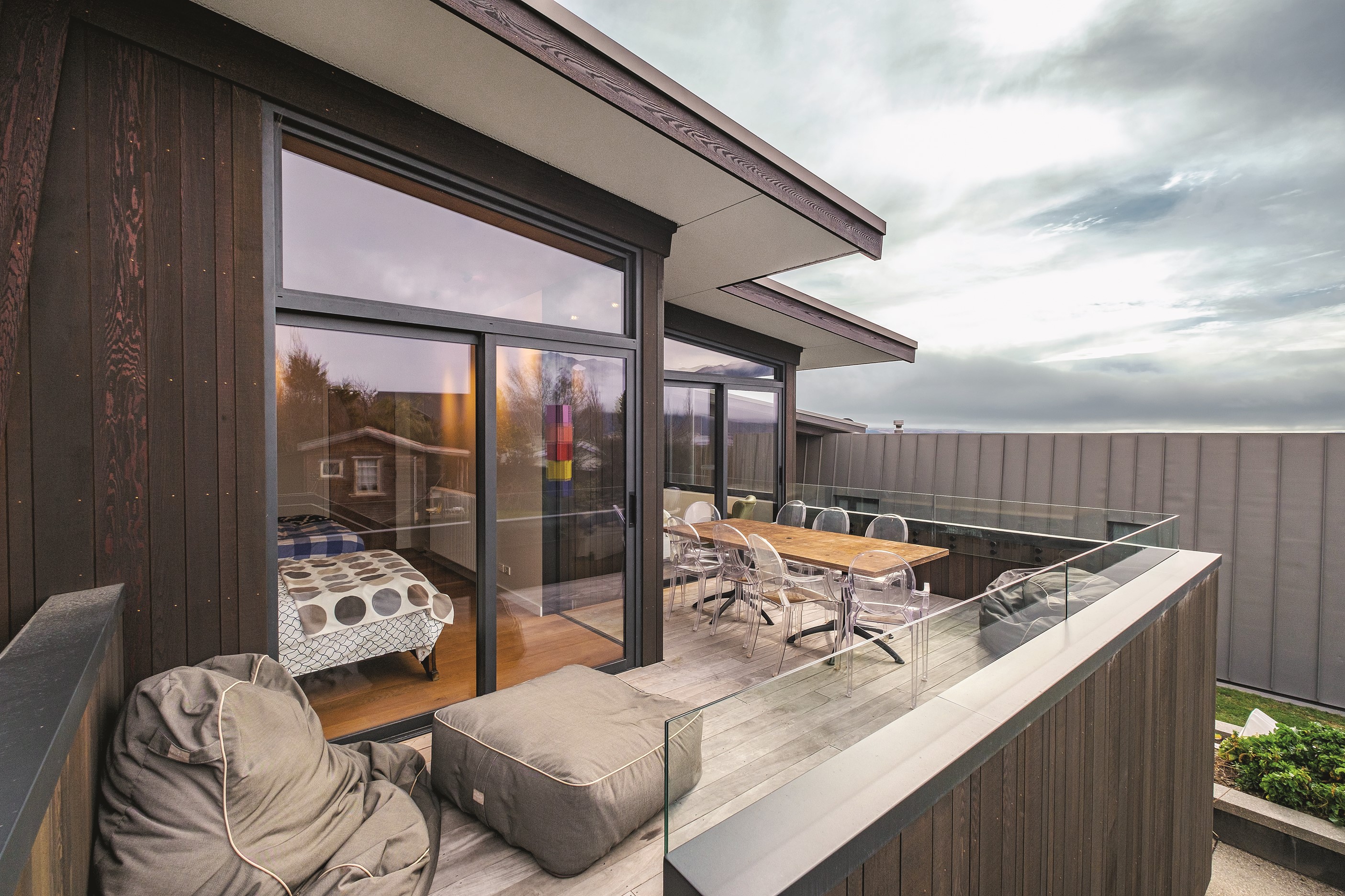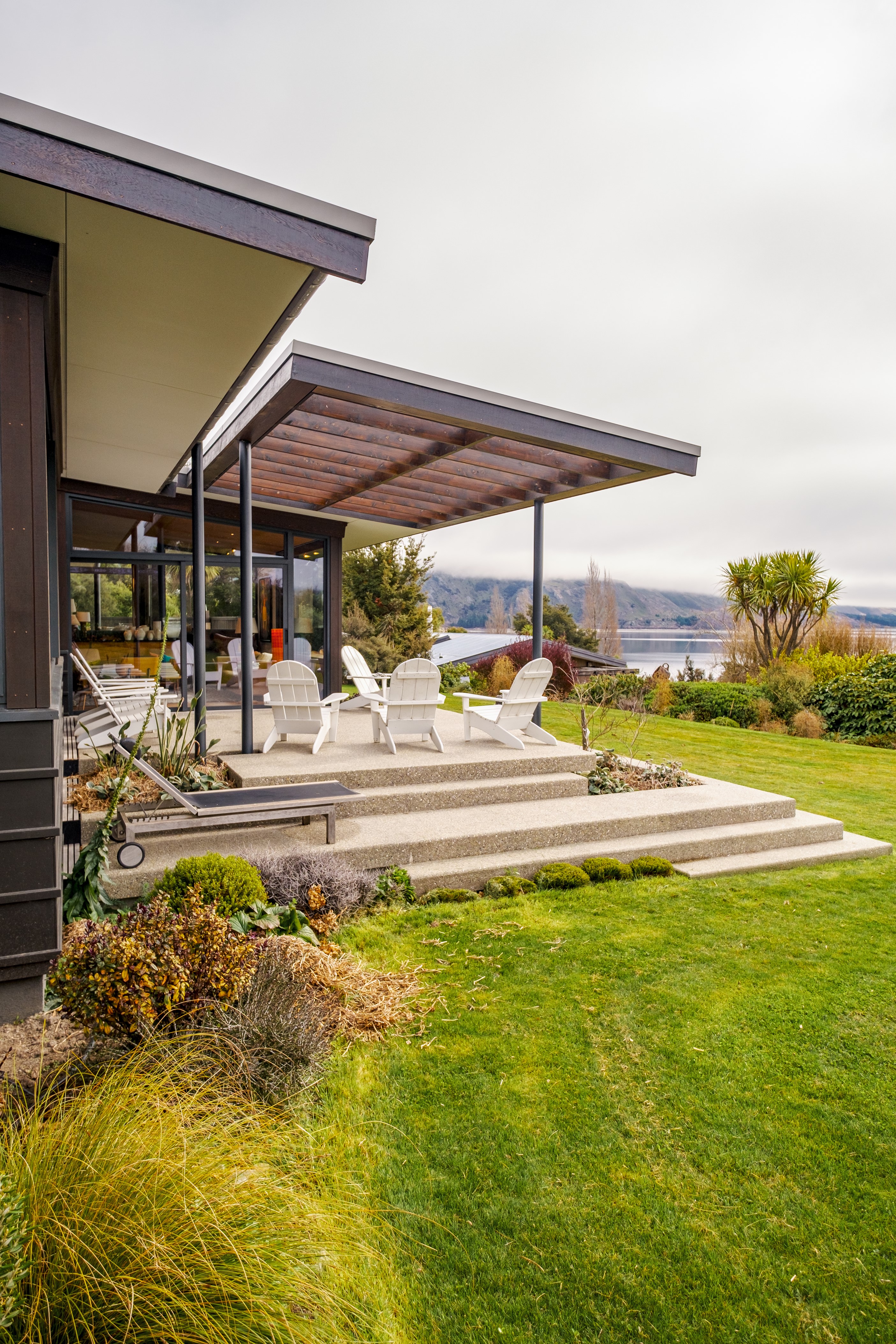 Built to replace a much-loved family crib, the 470sqm home rolls out across two wings and is oriented to the lake and mountain views in the same way the original cottage was. The lower wing is where you’ll find the living, dining and kitchen hub, along with two bedrooms. The kitchen, situated between living areas and opening to a sheltered outdoor area, has a combination of stainless steel, blackened steel and Gaboon Plywood joinery. The upper wing, on top of a double garage, houses guest bedrooms. The home is laid out for passive solar gain. Roofs that angle down to the north have eaves that screen high-summer sun but let in the lower winter rays.