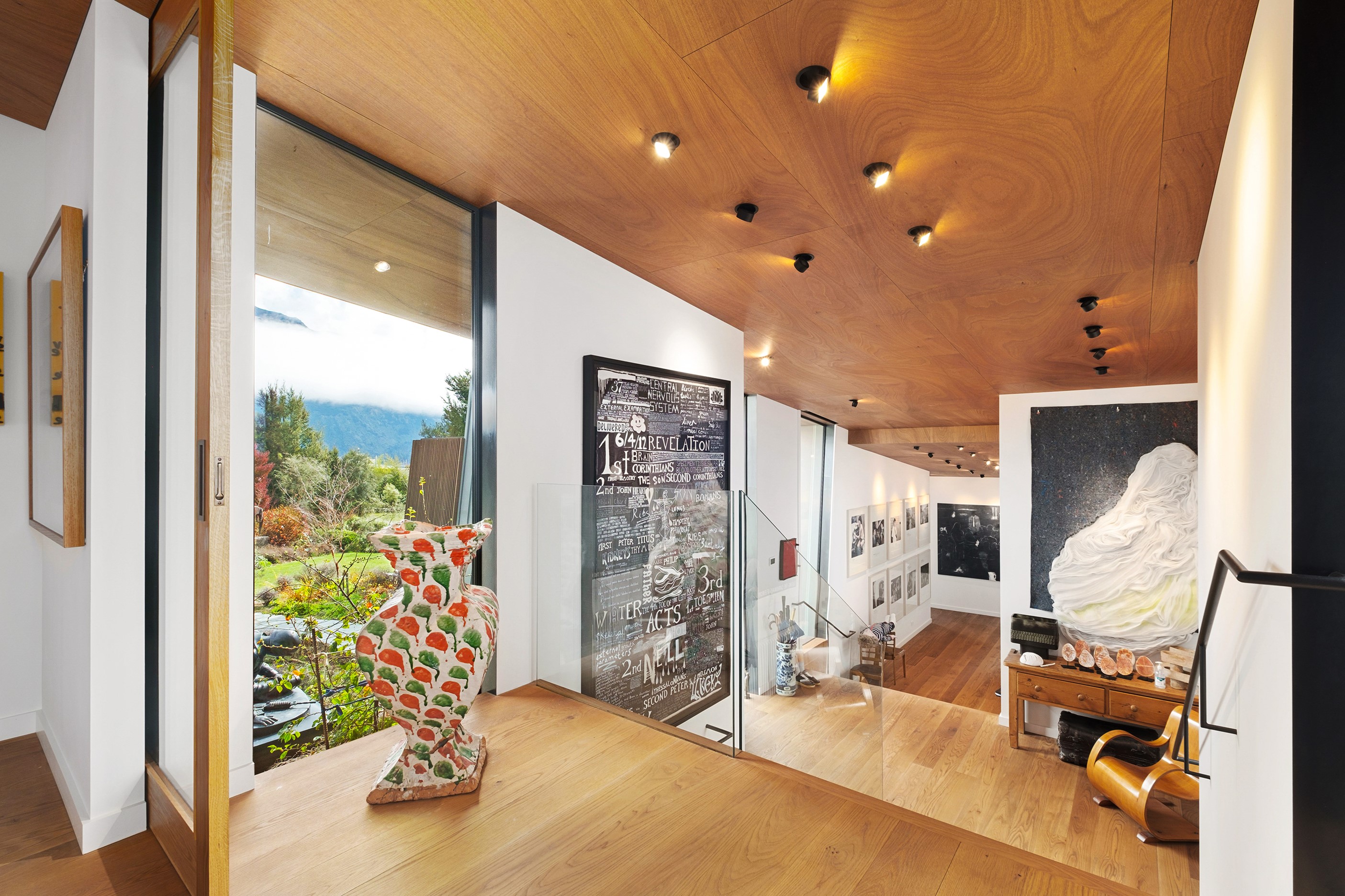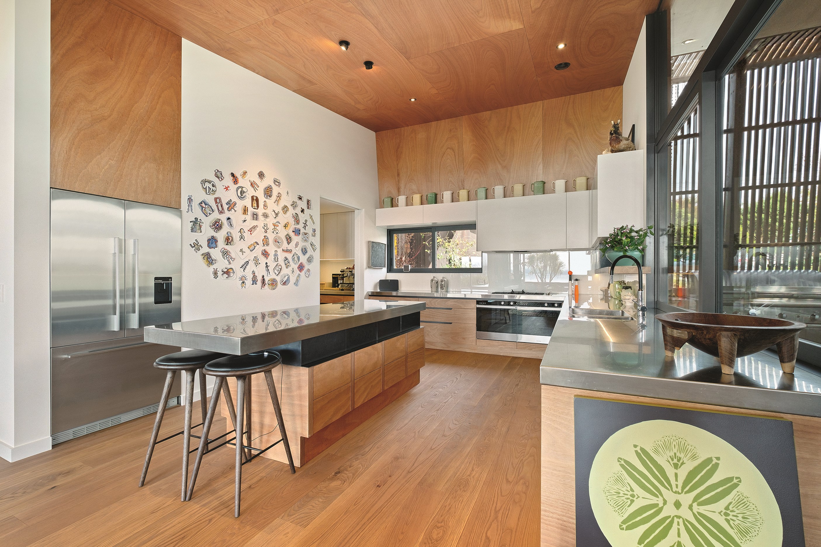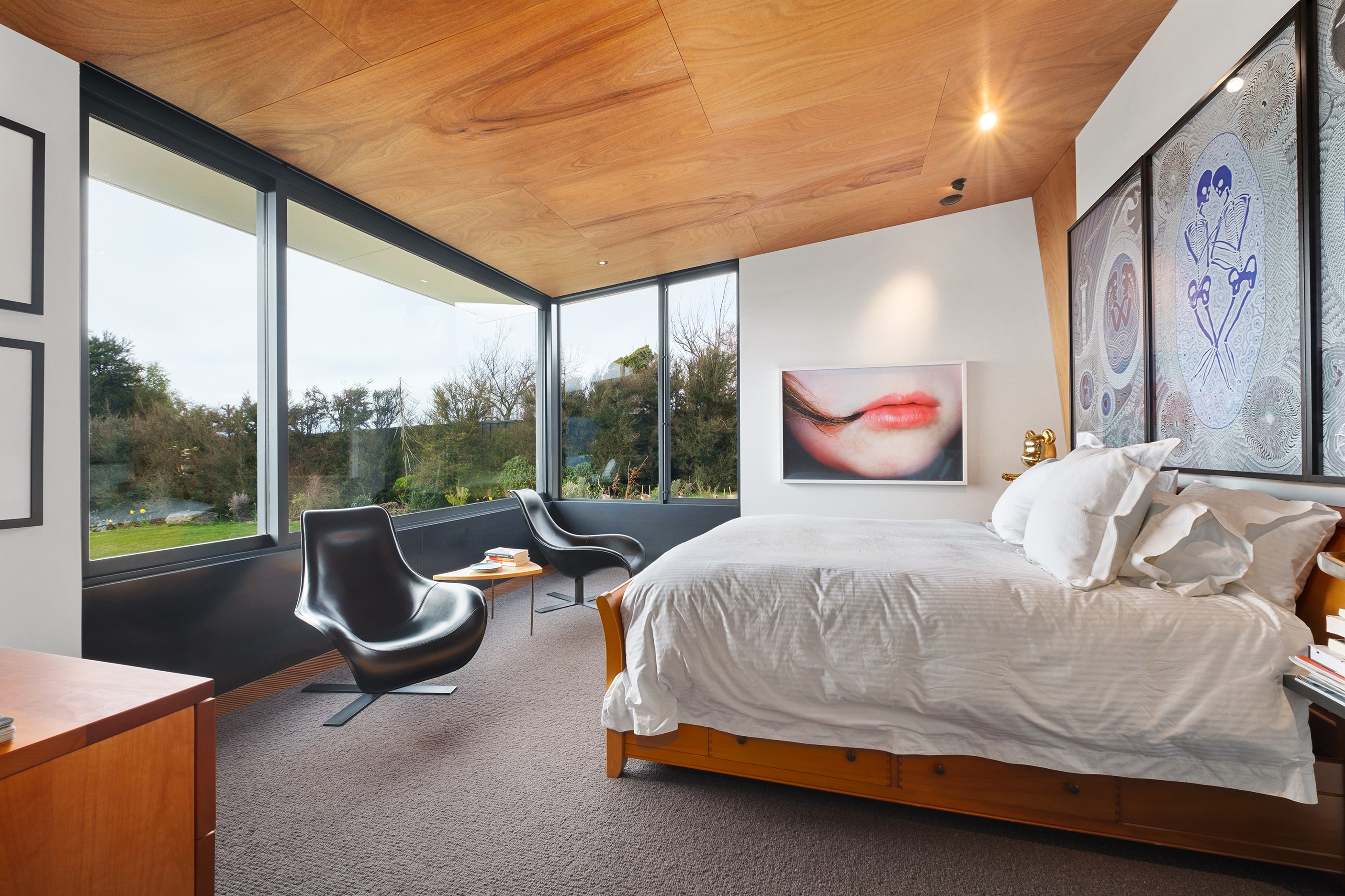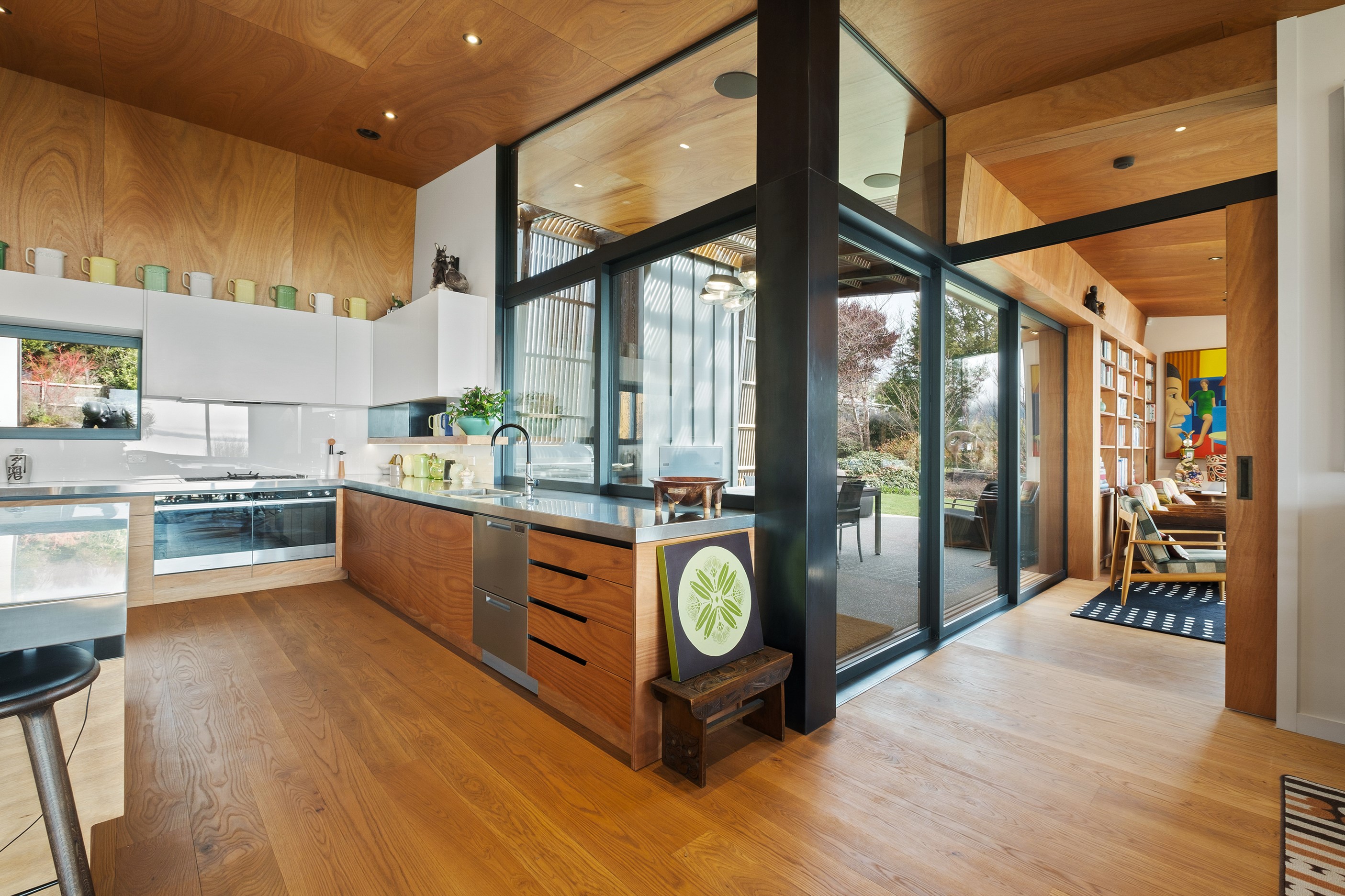 Built to replace a much-loved family crib, the 470sqm home rolls out across two wings and is oriented to the lake and mountain views in the same way the original cottage was. The lower wing is where you’ll find the living, dining and kitchen hub, along with two bedrooms. The kitchen, situated between living areas and opening to a sheltered outdoor area, has a combination of stainless steel, blackened steel and Gaboon Plywood joinery. The upper wing, on top of a double garage, houses guest bedrooms. The home is laid out for passive solar gain. Roofs that angle down to the north have eaves that screen high-summer sun but let in the lower winter rays.