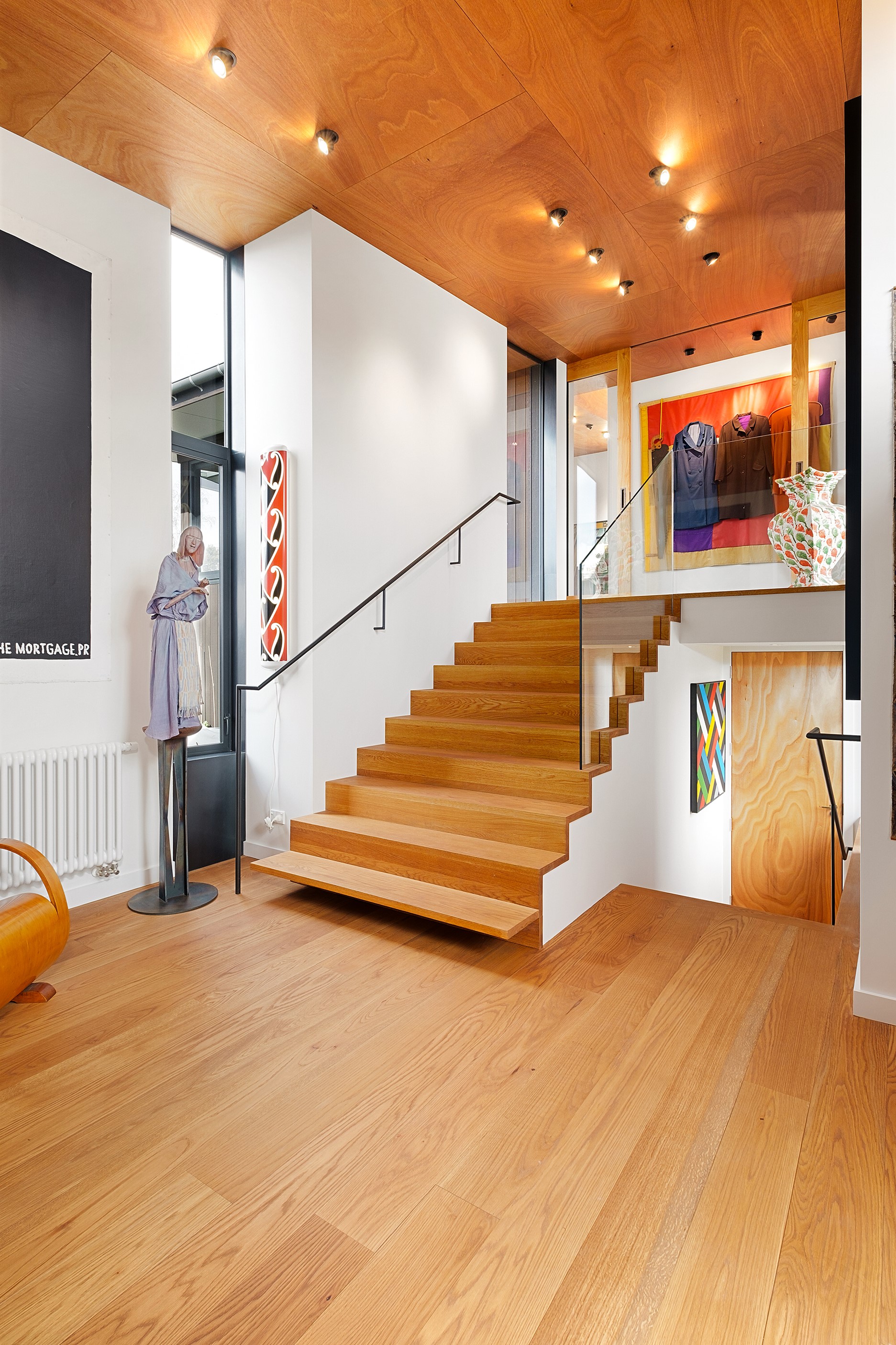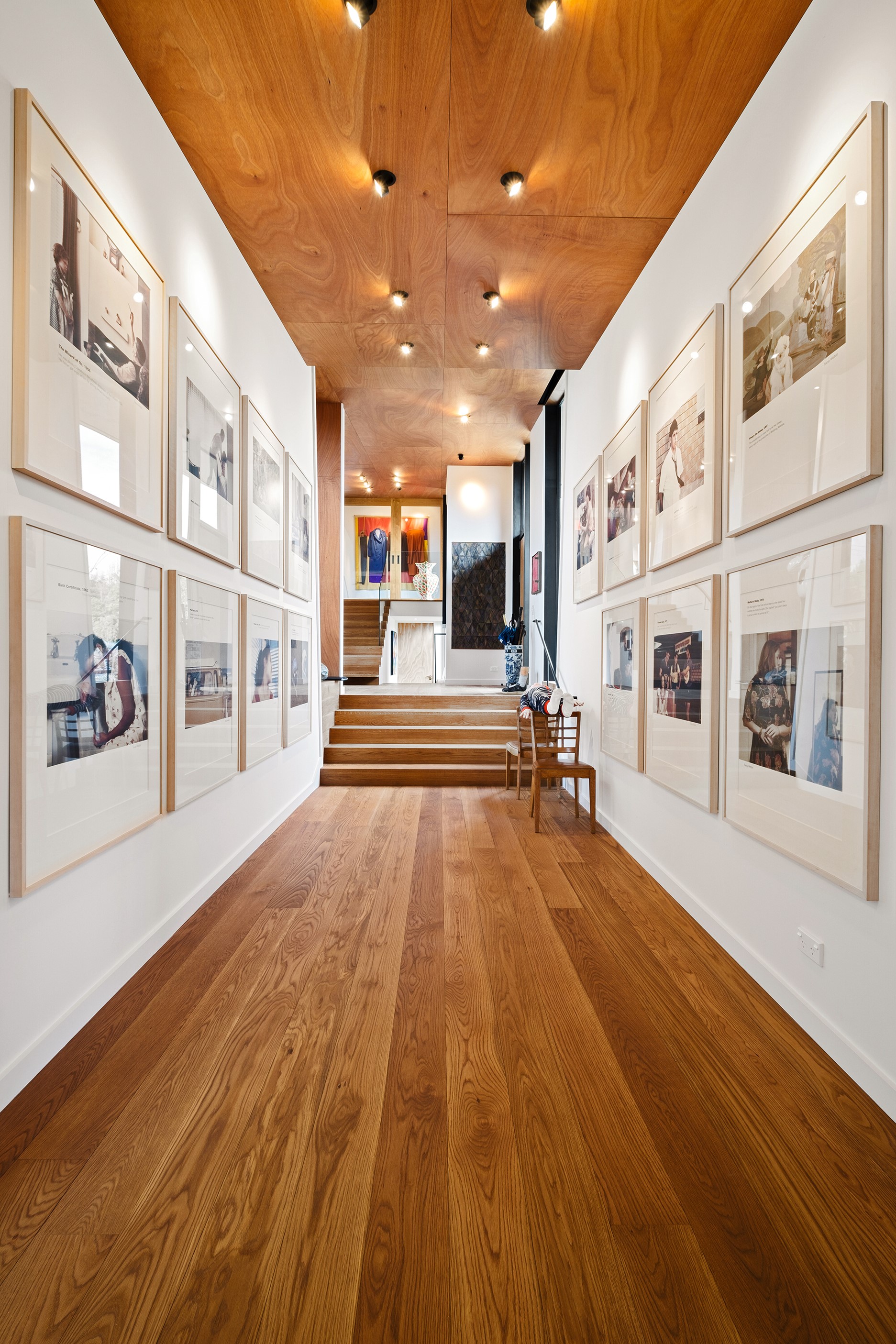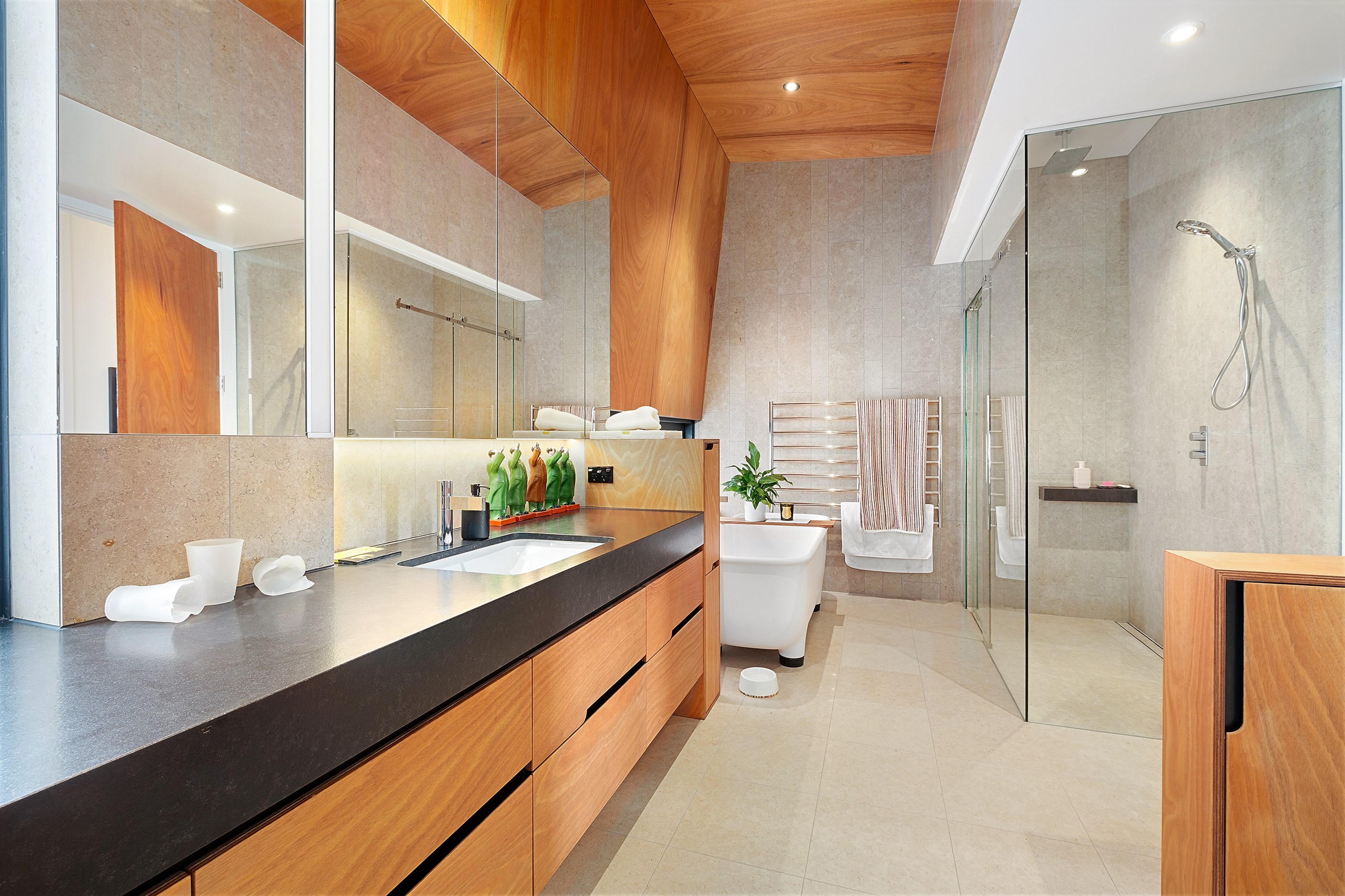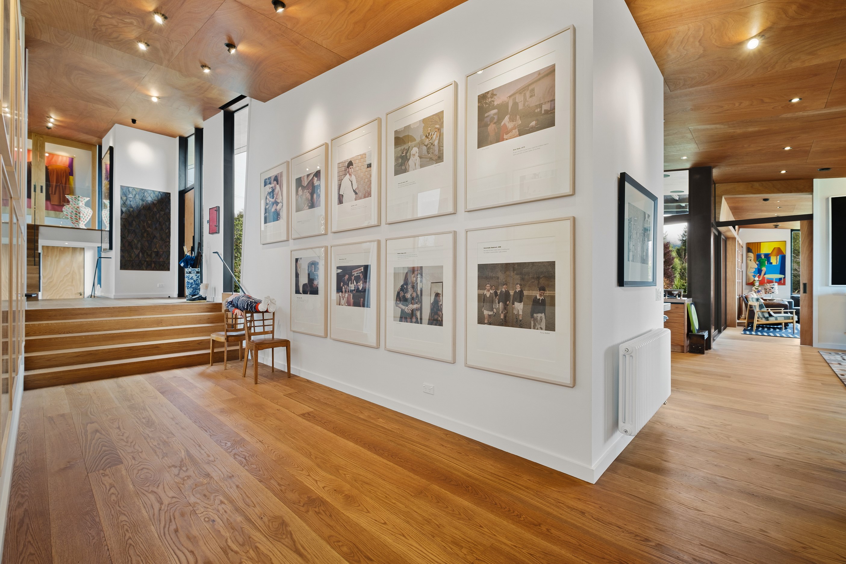Built to replace a much-loved family crib, the 470sqm home rolls out across two wings and is oriented to the lake and mountain views in the same way the original cottage was. The lower wing is where you’ll find the living, dining and kitchen hub, along with two bedrooms. The kitchen, situated between living areas and opening to a sheltered outdoor area, has a combination of stainless steel, blackened steel and Gaboon Plywood joinery. The upper wing, on top of a double garage, houses guest bedrooms. The home is laid out for passive solar gain. Roofs that angle down to the north have eaves that screen high-summer sun but let in the lower winter rays.