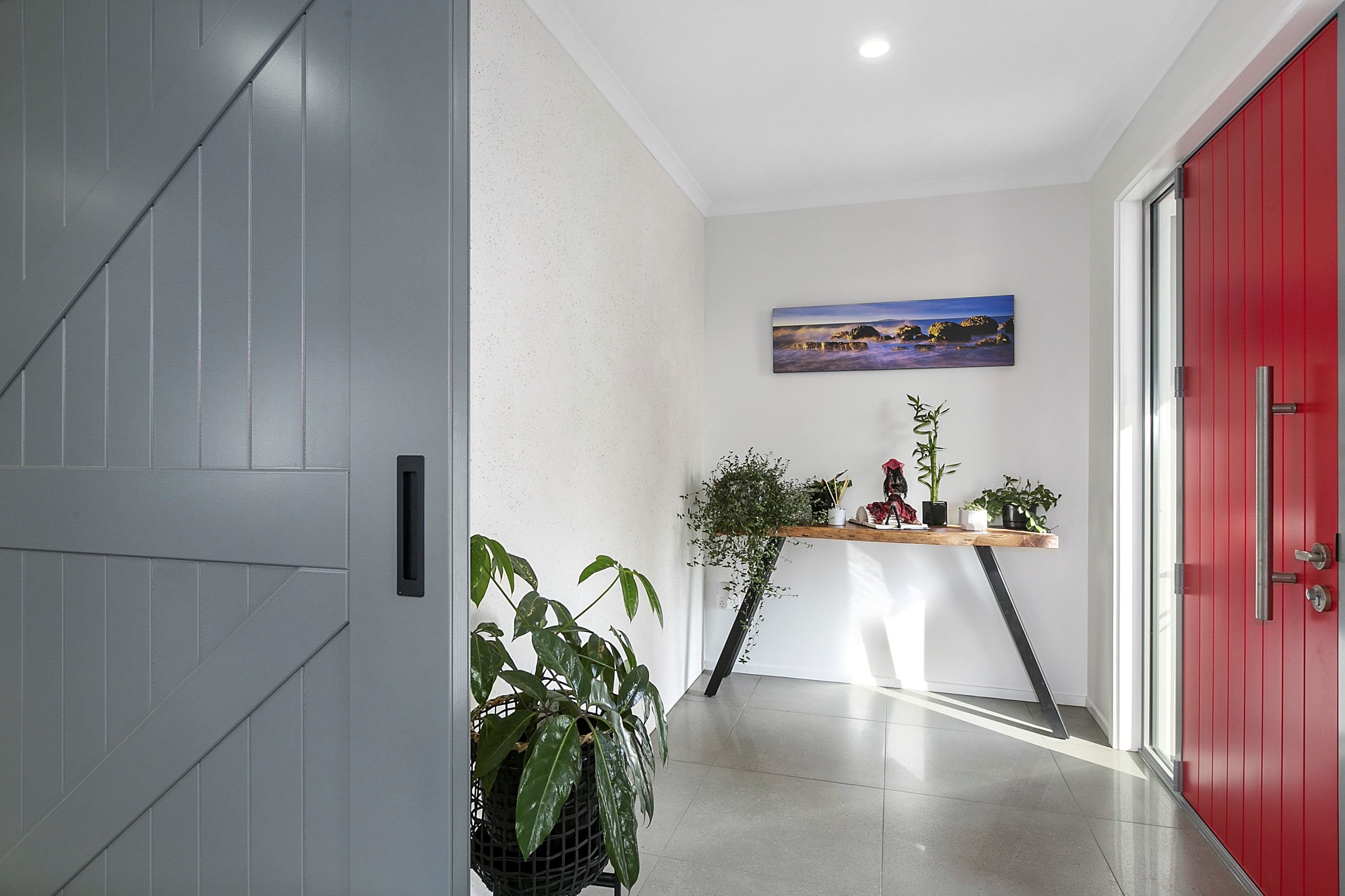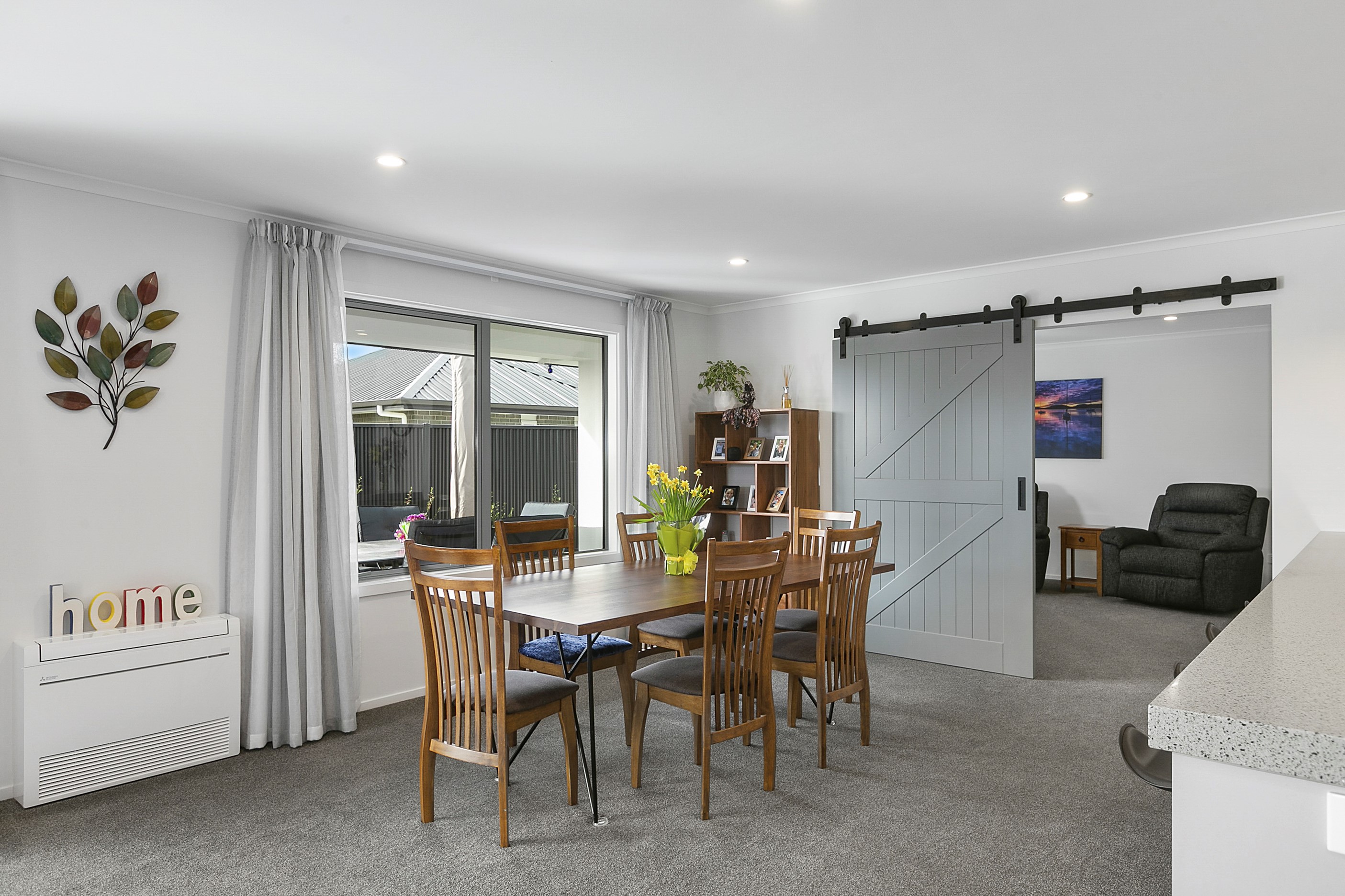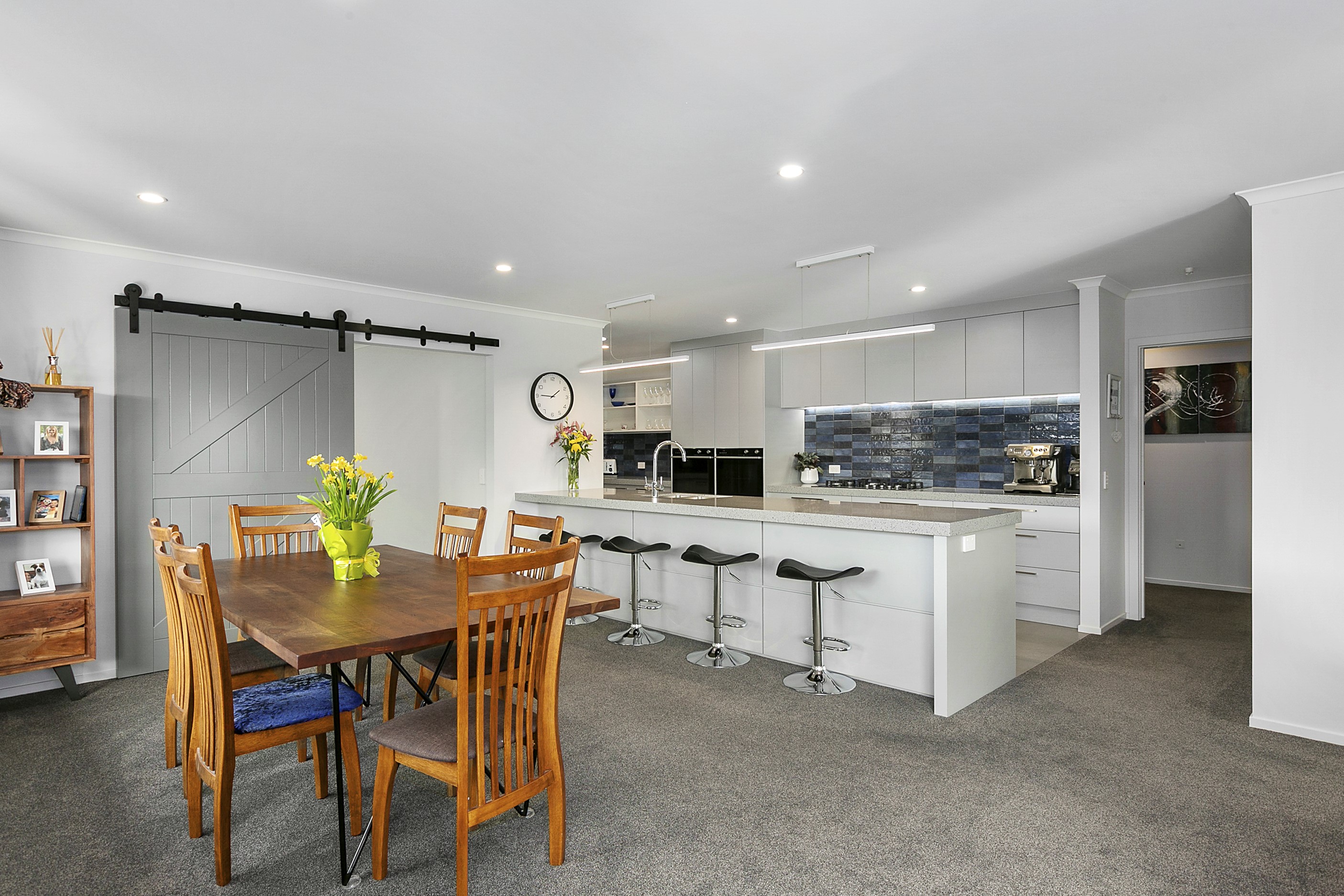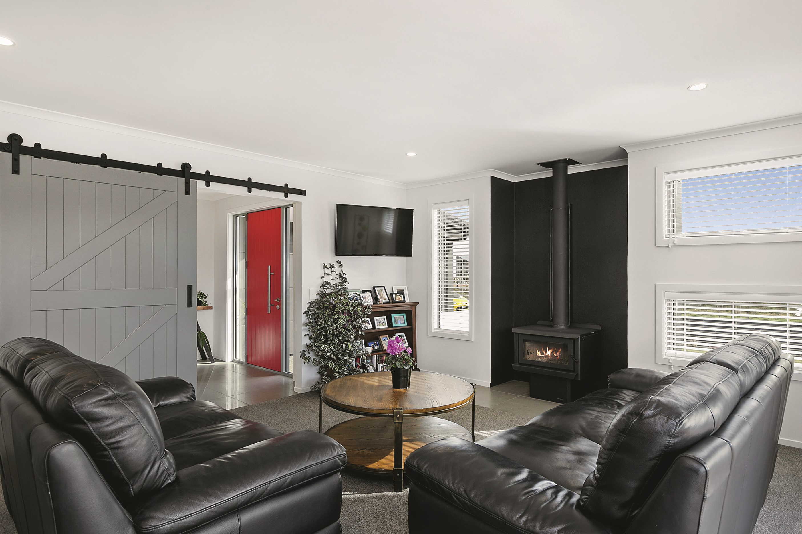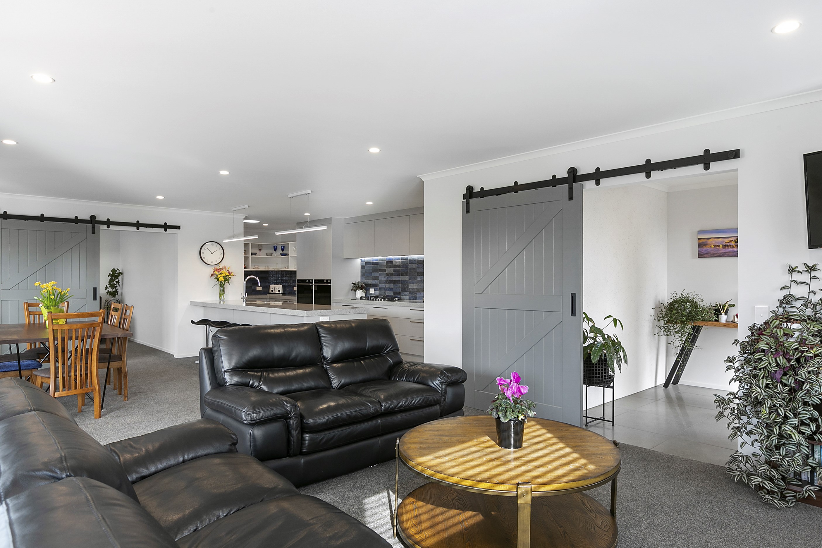 At the heart of this family home is a wonderful open-plan kitchen and scullery featuring TriStone bench tops and a tiled splashback, the lack of dividing walls creating flow. This looks out to the dining and living rooms, where ranch slider doors lead to a covered alfresco area. A separate lounge leads from the open-plan design through a feature timber barn door, providing flexible use of the living spaces. A matching feature door separates the entry from the living room, providing the handy option of being able to close off the entry as required.