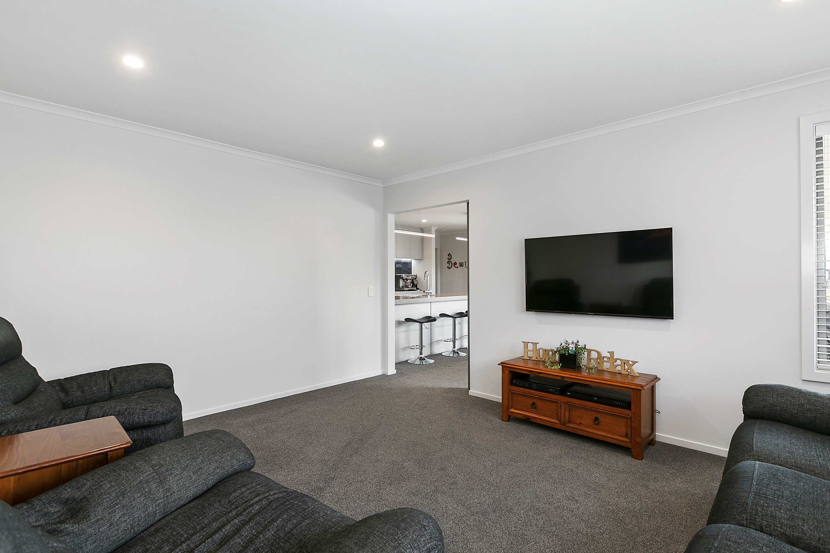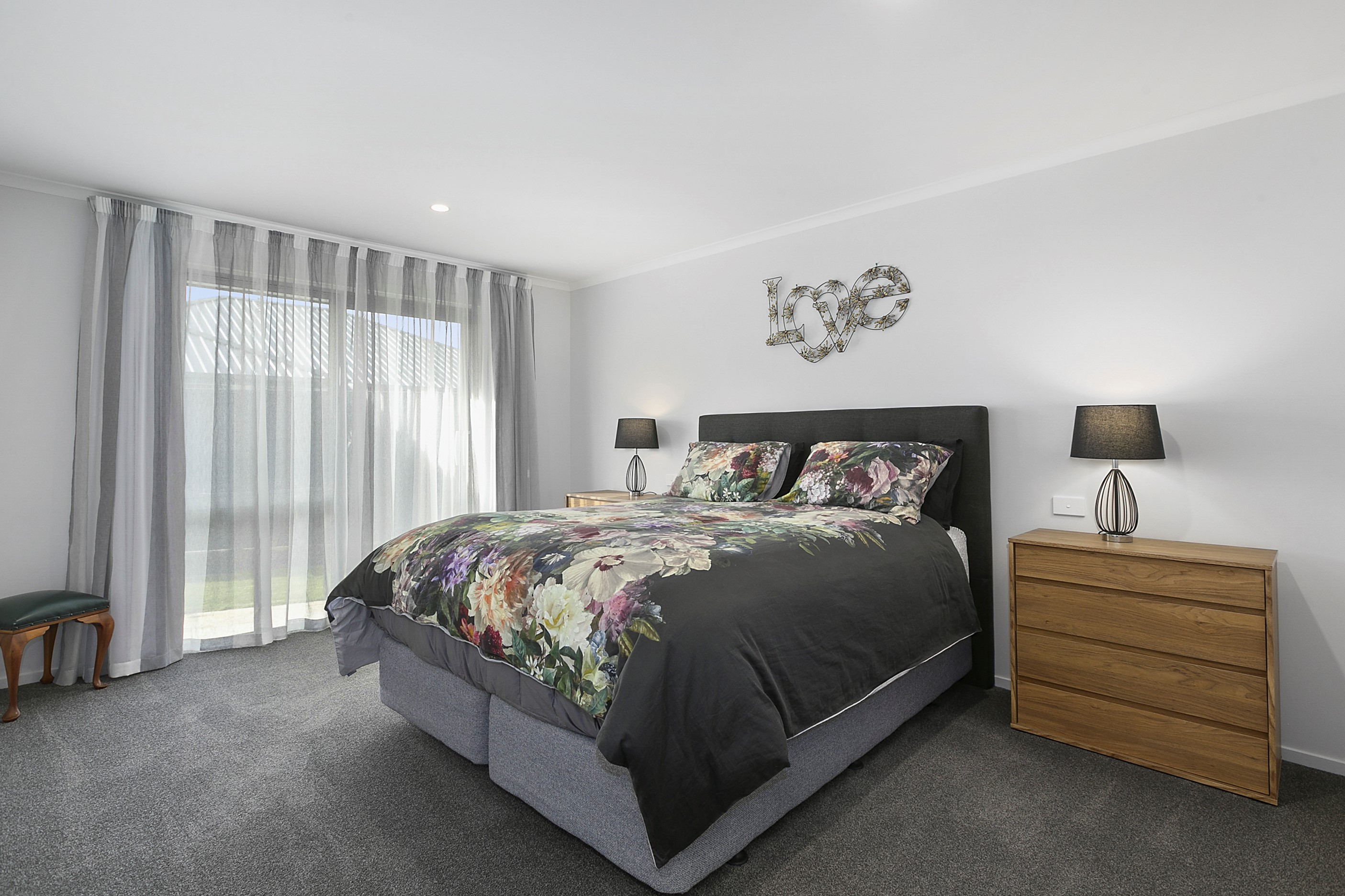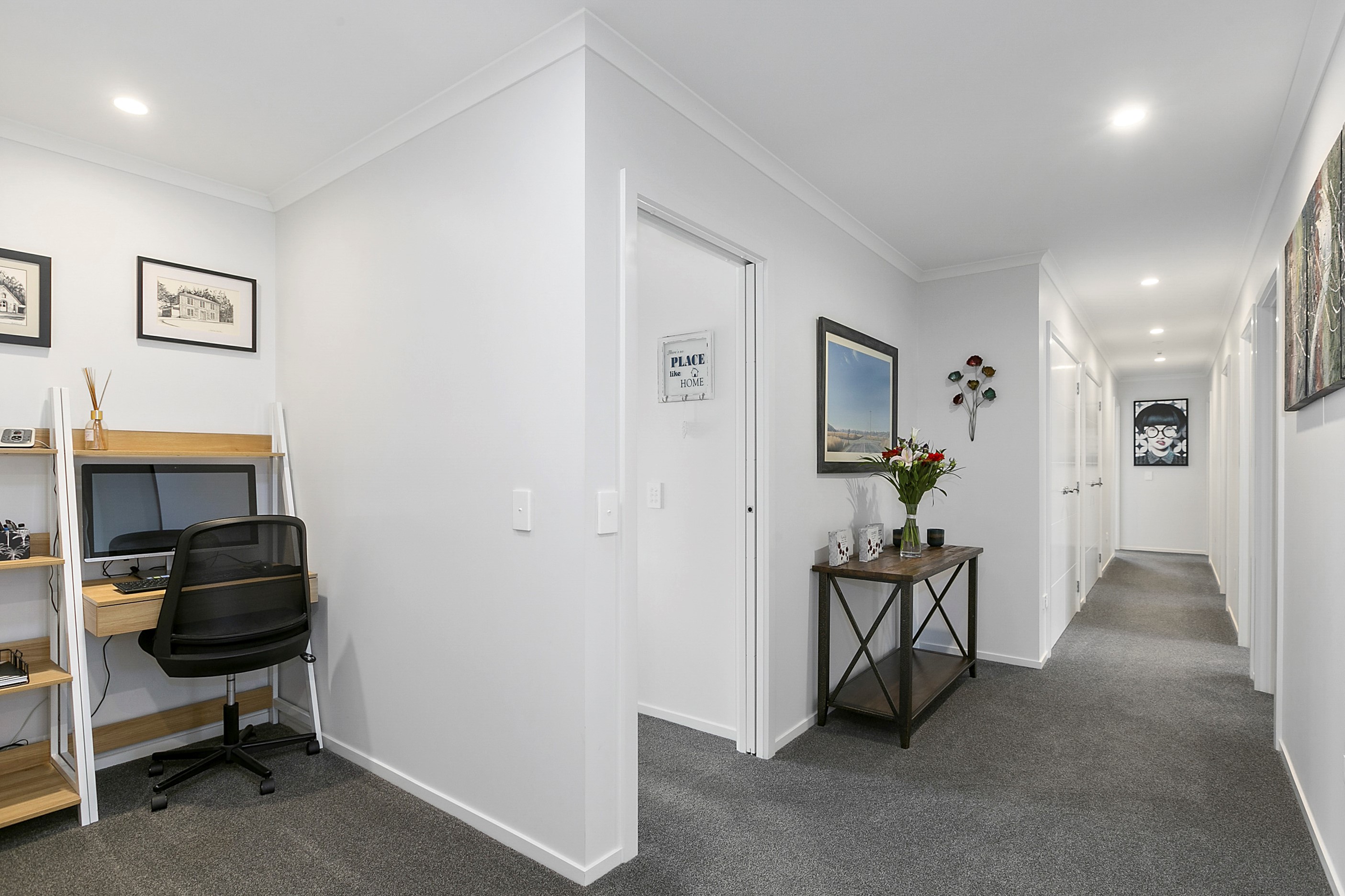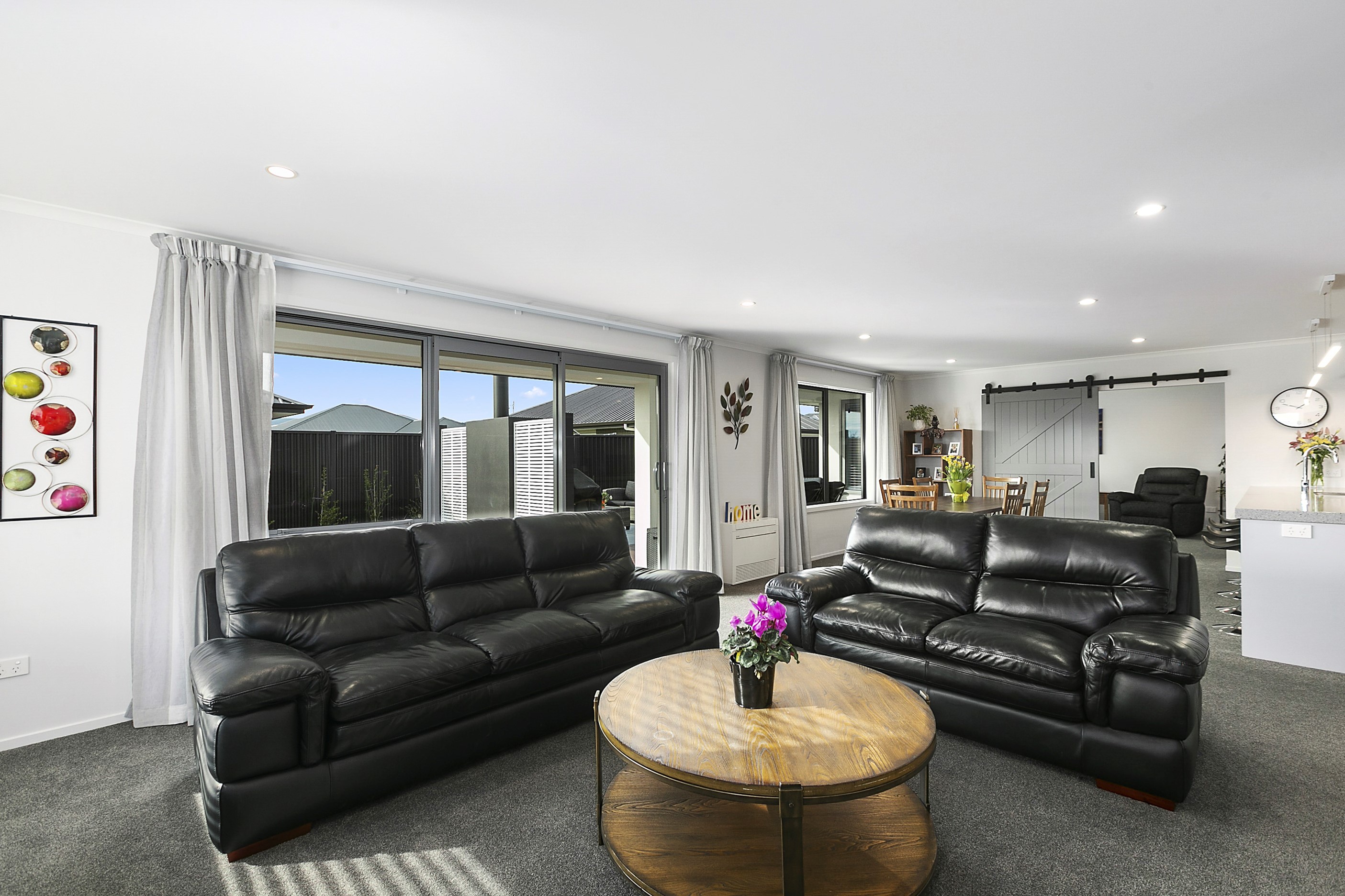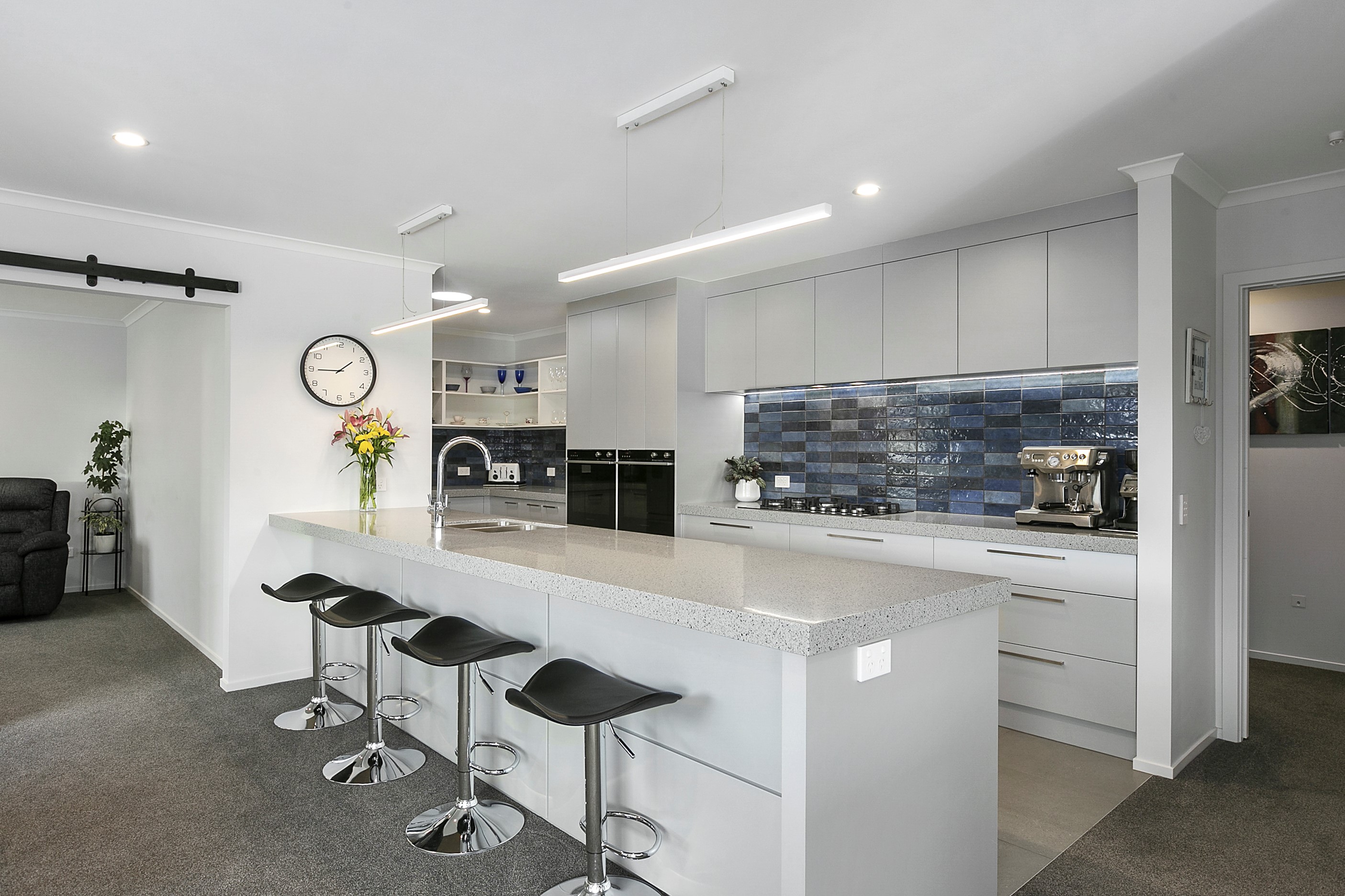 At the heart of this family home is a wonderful open-plan kitchen and scullery featuring TriStone bench tops and a tiled splashback, the lack of dividing walls creating flow. This looks out to the dining and living rooms, where ranch slider doors lead to a covered alfresco area. A separate lounge leads from the open-plan design through a feature timber barn door, providing flexible use of the living spaces. A matching feature door separates the entry from the living room, providing the handy option of being able to close off the entry as required.