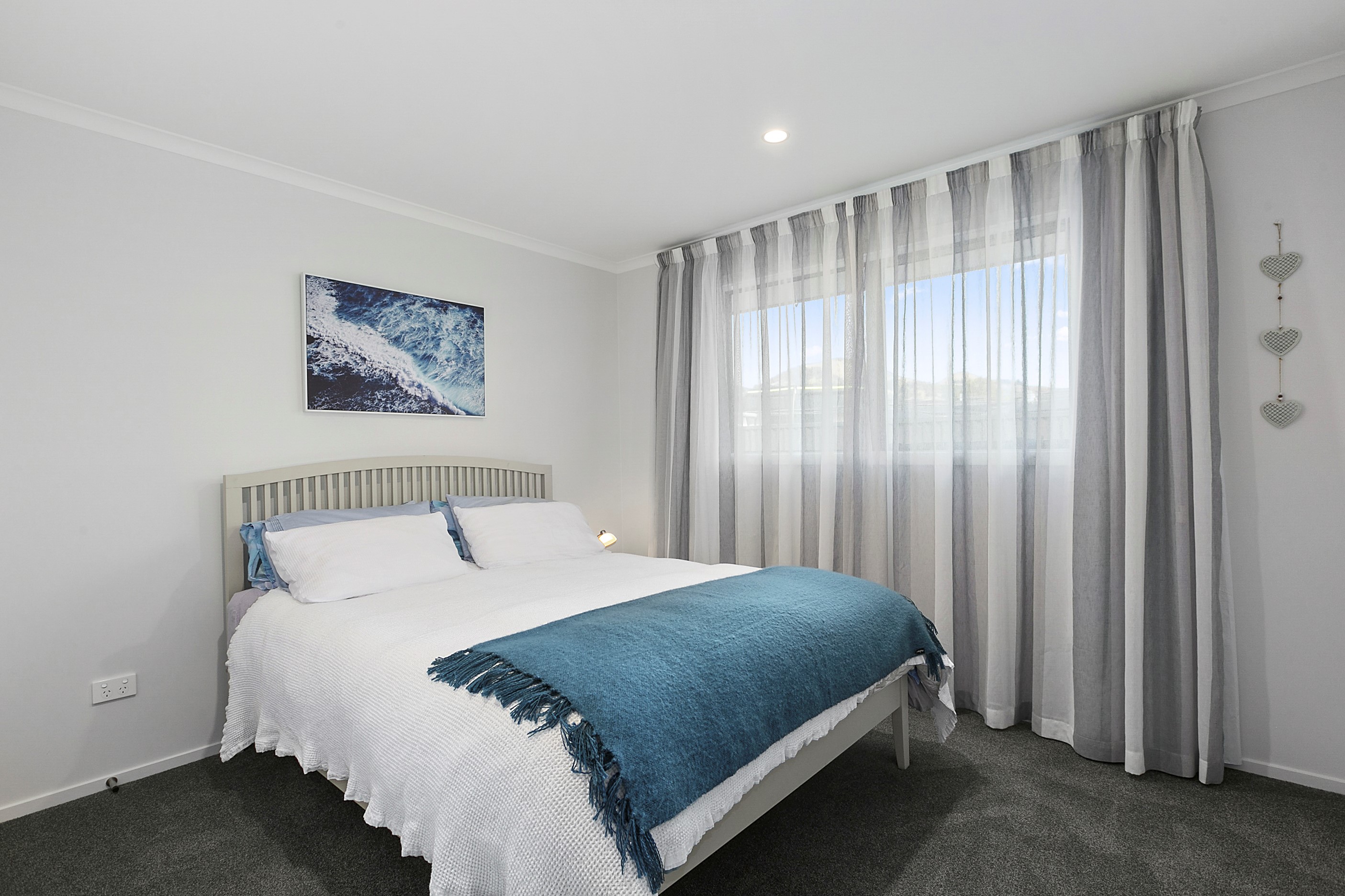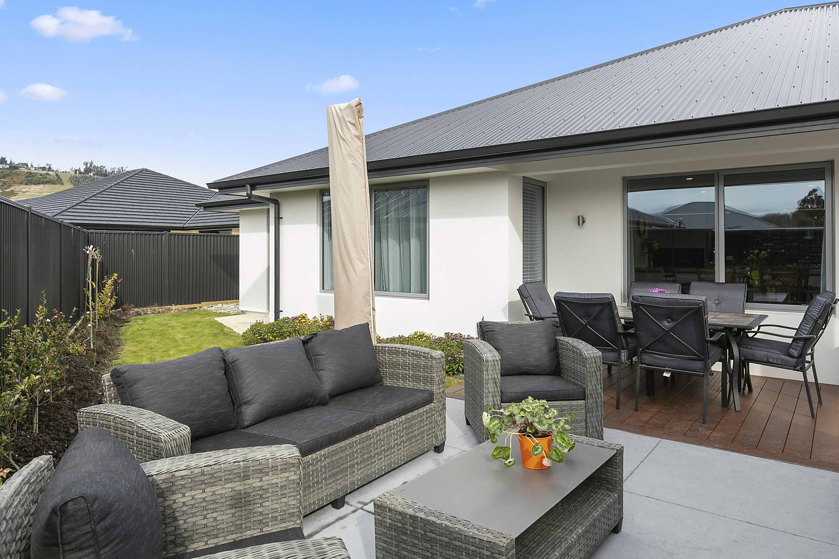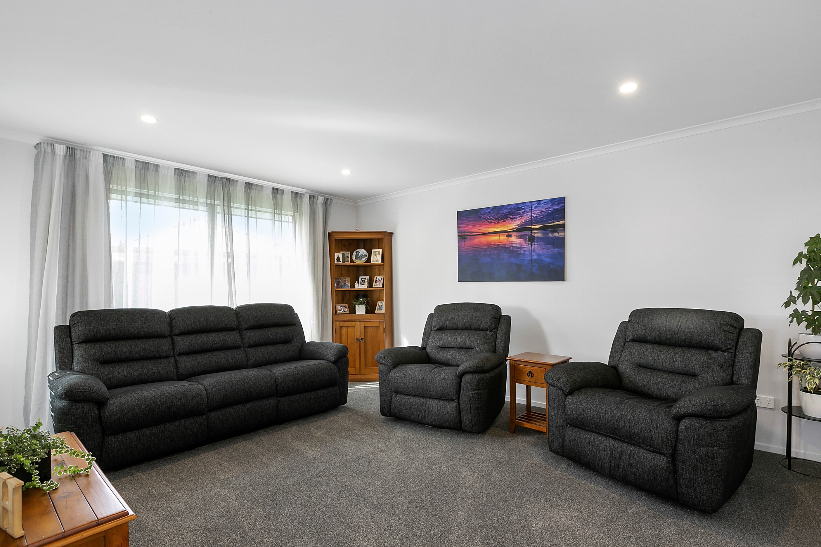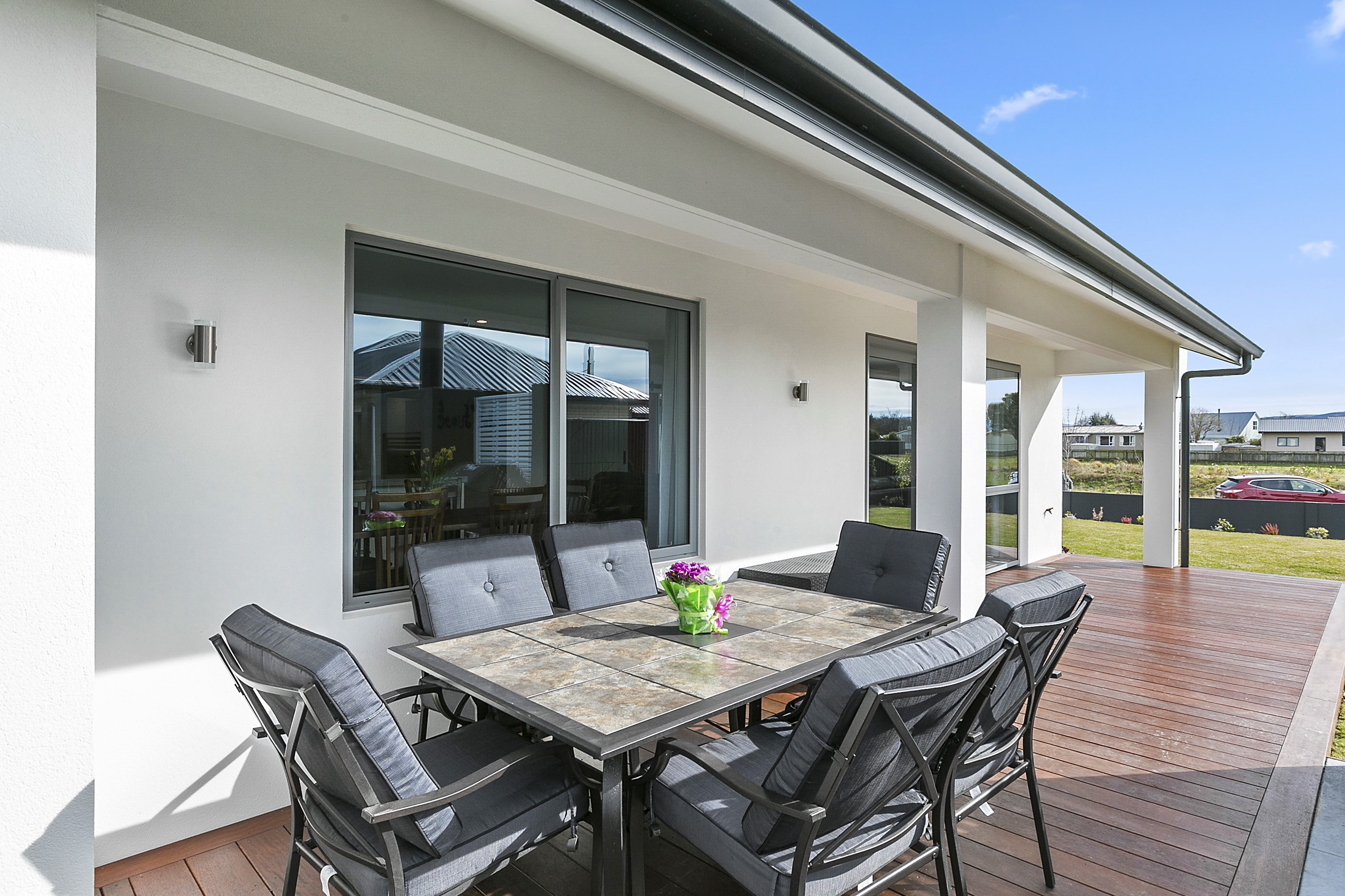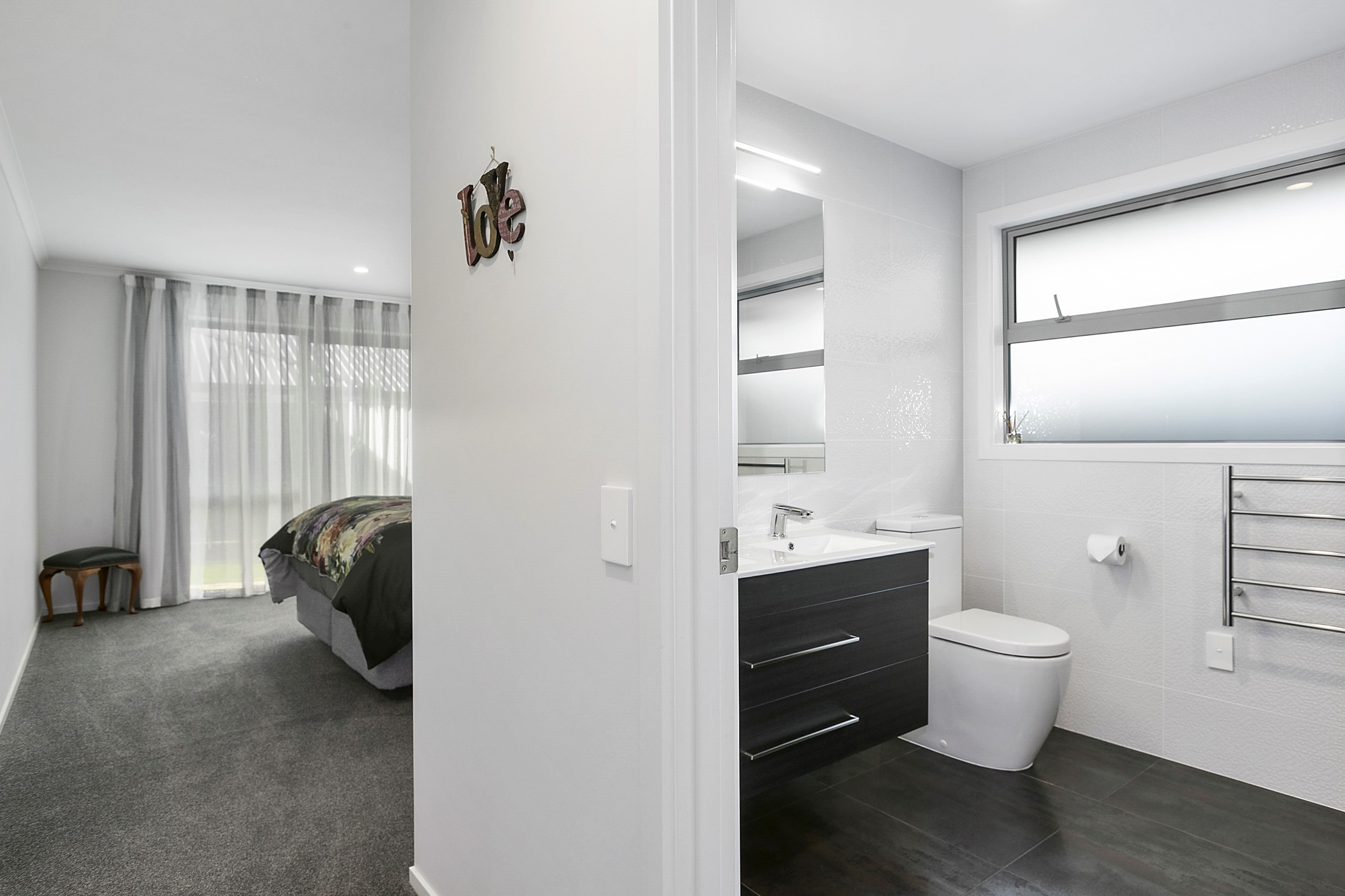 At the heart of this family home is a wonderful open-plan kitchen and scullery featuring TriStone bench tops and a tiled splashback, the lack of dividing walls creating flow. This looks out to the dining and living rooms, where ranch slider doors lead to a covered alfresco area. A separate lounge leads from the open-plan design through a feature timber barn door, providing flexible use of the living spaces. A matching feature door separates the entry from the living room, providing the handy option of being able to close off the entry as required.