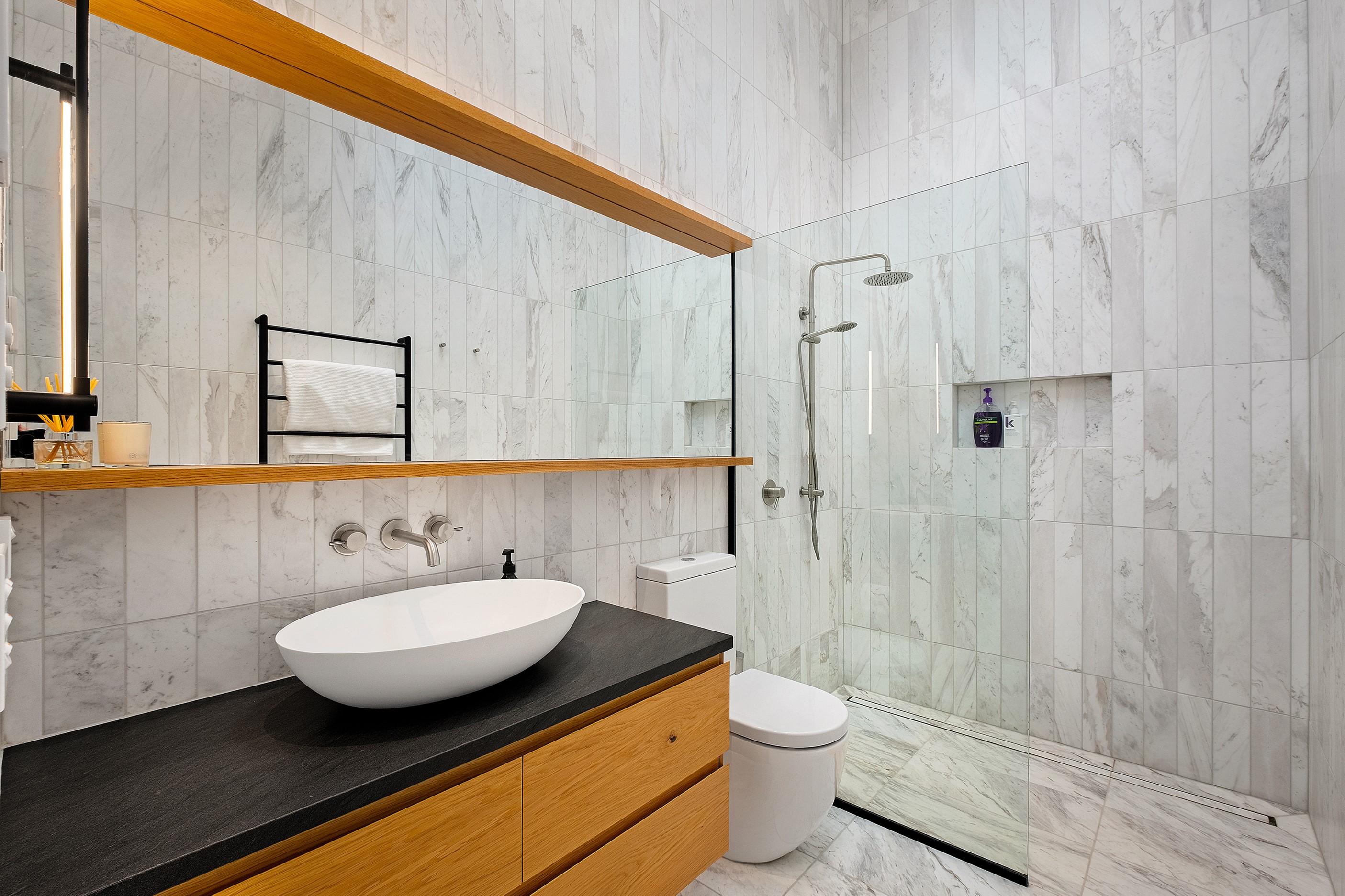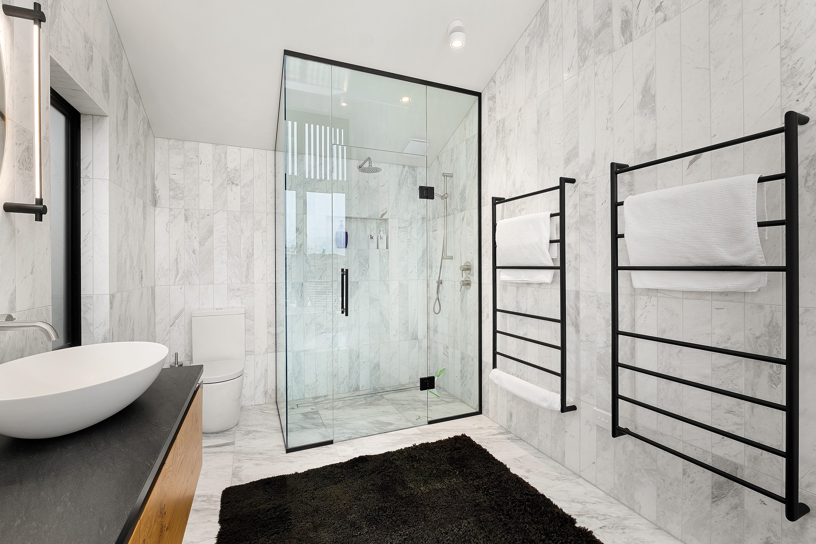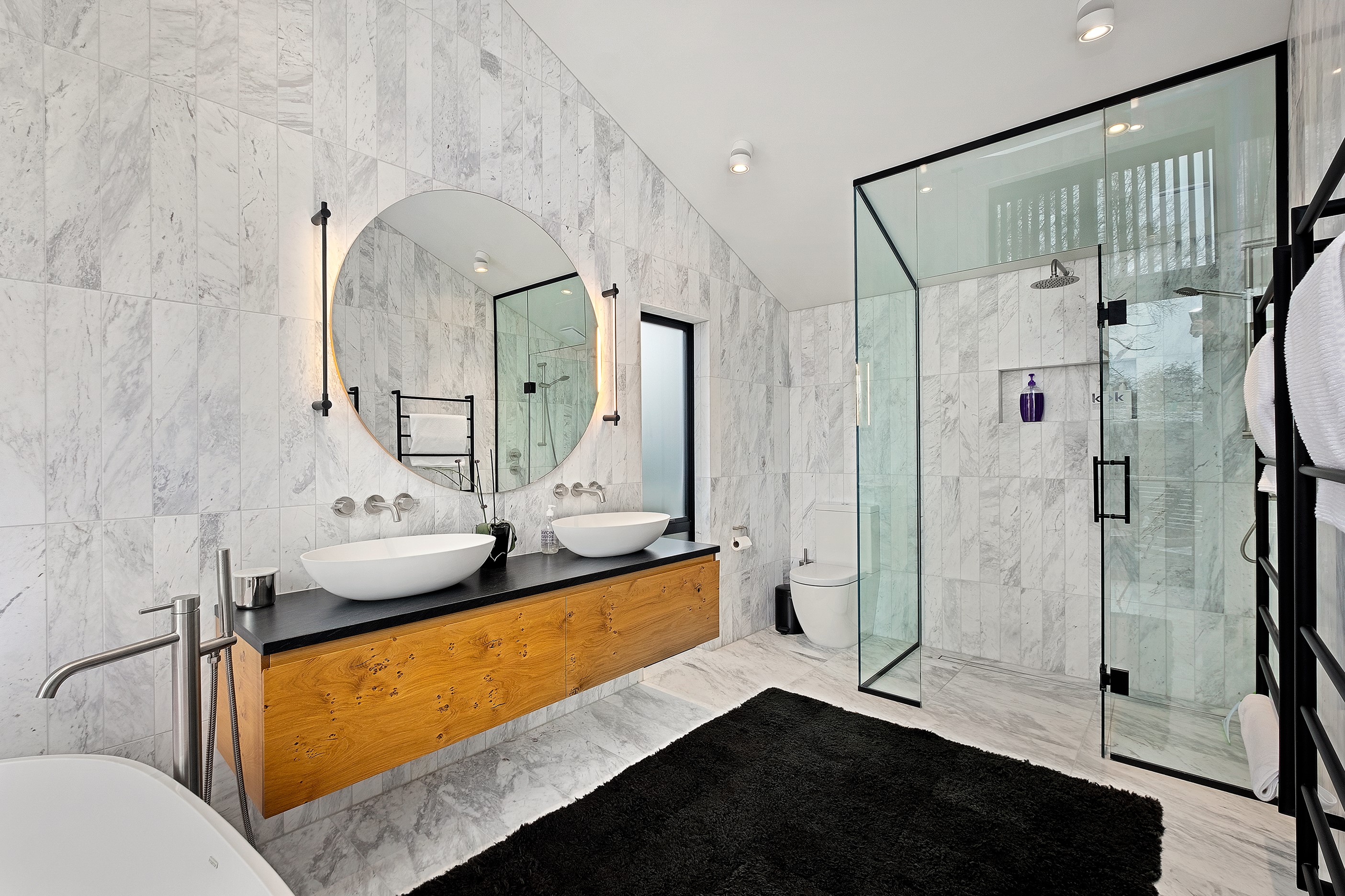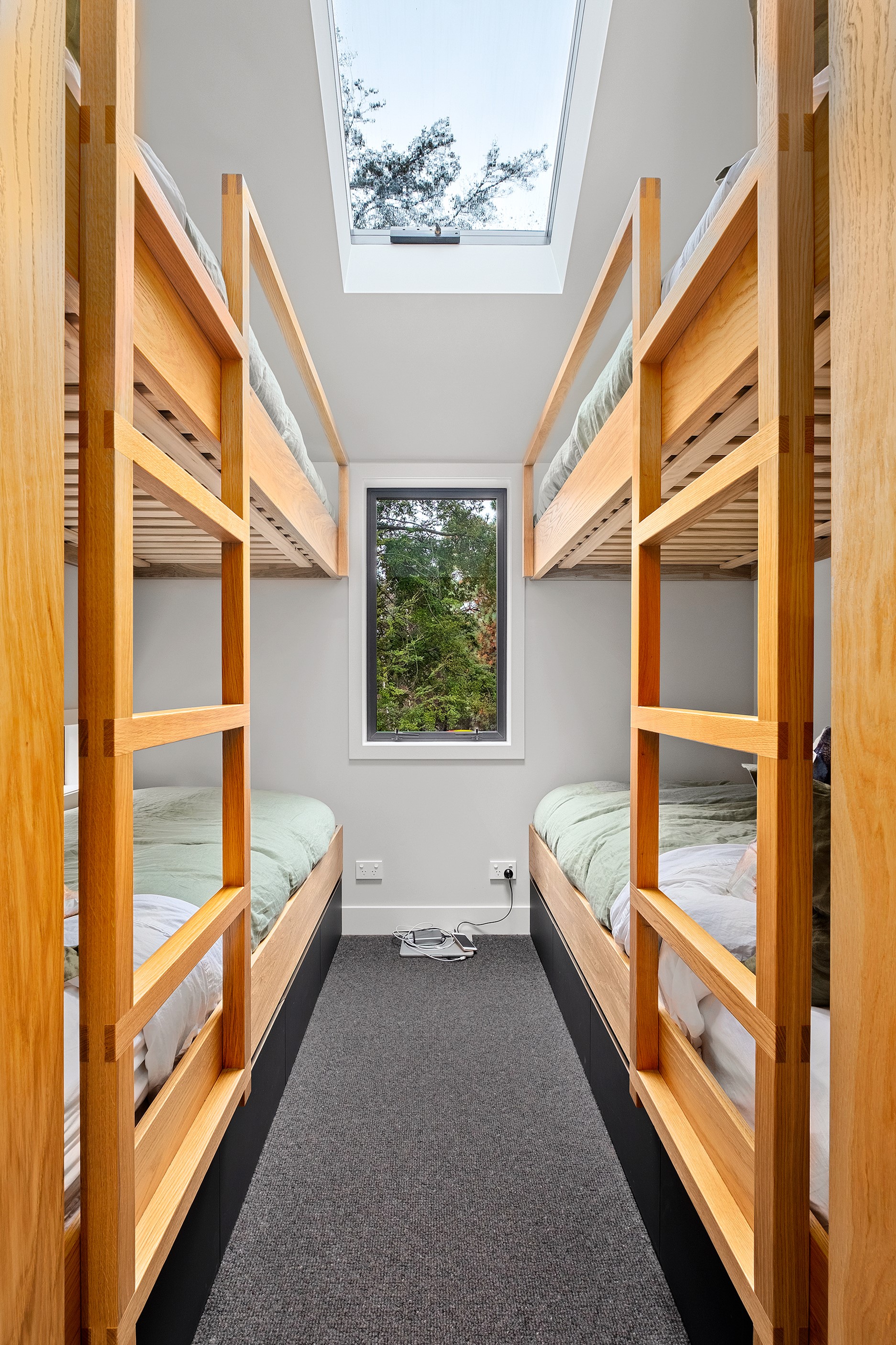 Solid oak parquet flooring, custom oak joinery and a concrete fireplace in the living area make for a very special space. All three bedrooms open onto decking for the ultimate in indoor-outdoor flow. A solid granite kitchen benchtop and marble bathrooms further emphasise the attention to detail that has gone into every part of the project.
