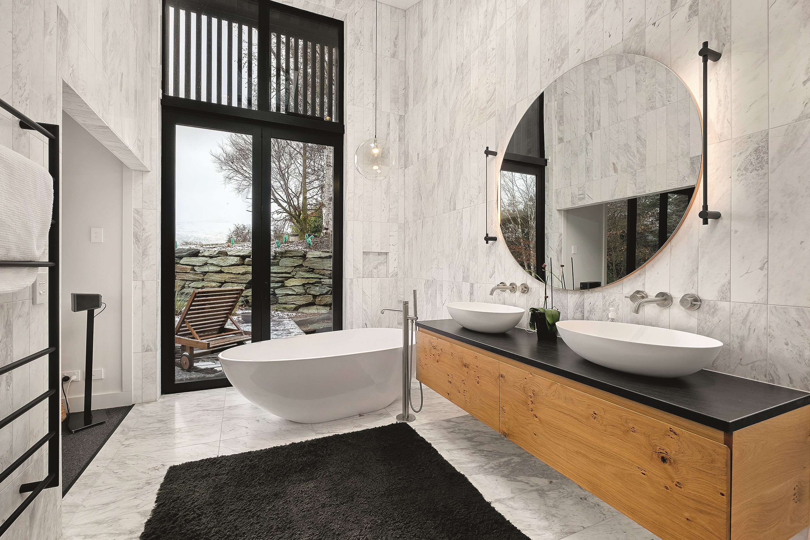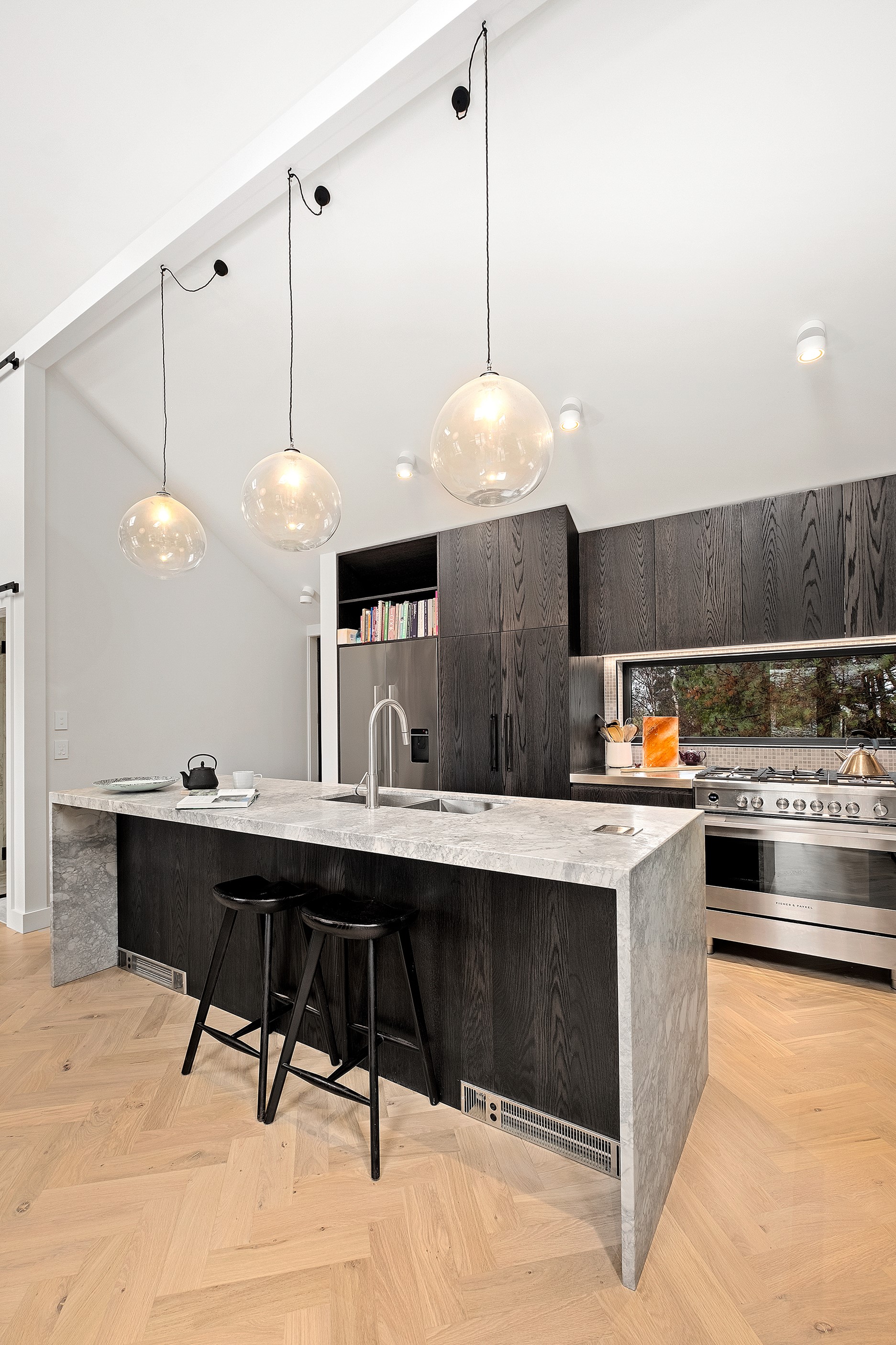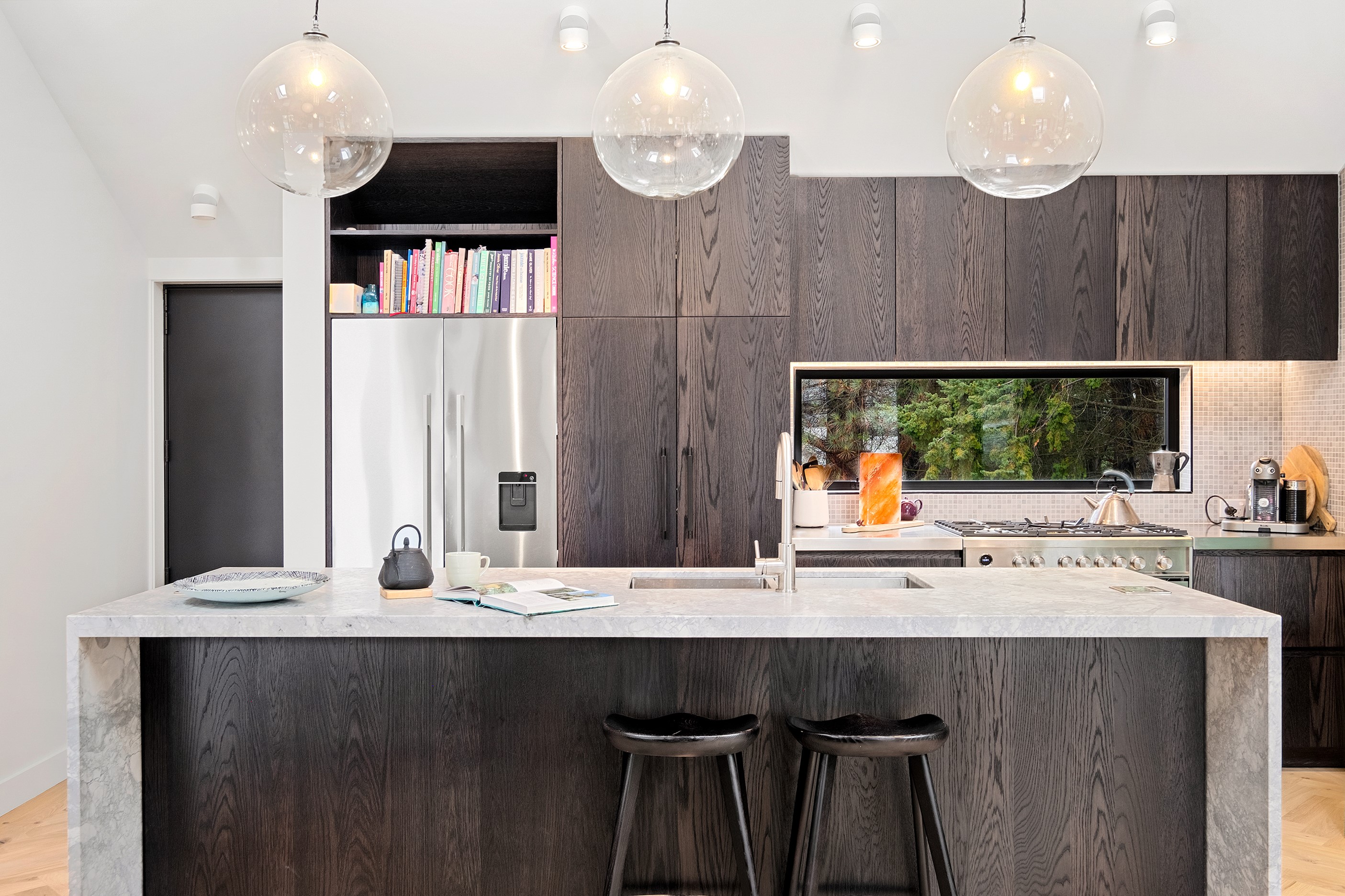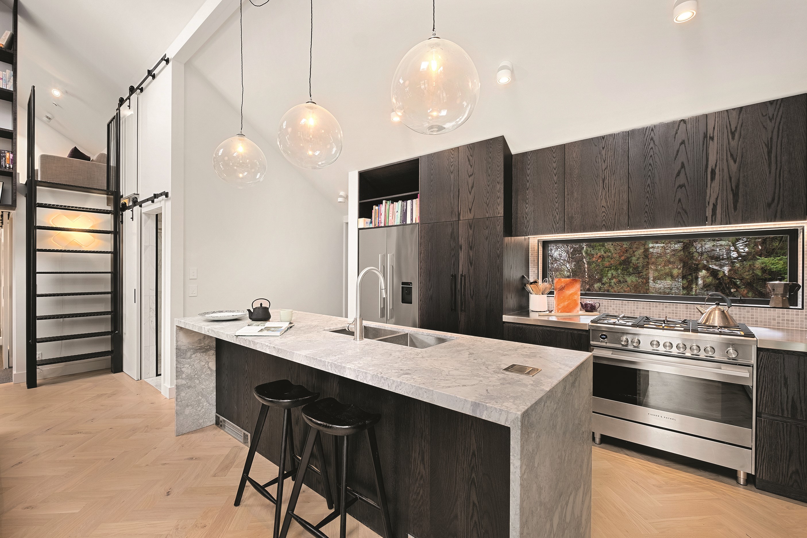 The same care has gone into the exterior, which has detailed vertical, dark-stained shiplap cedar. It was important to the client to protect the established trees on site, which made for some interesting logistics. Working within the constraints of the existing home, the renovation delivers a result that’s worlds away from the original and provides the owners with a warm, comfortable and stylish retreat.