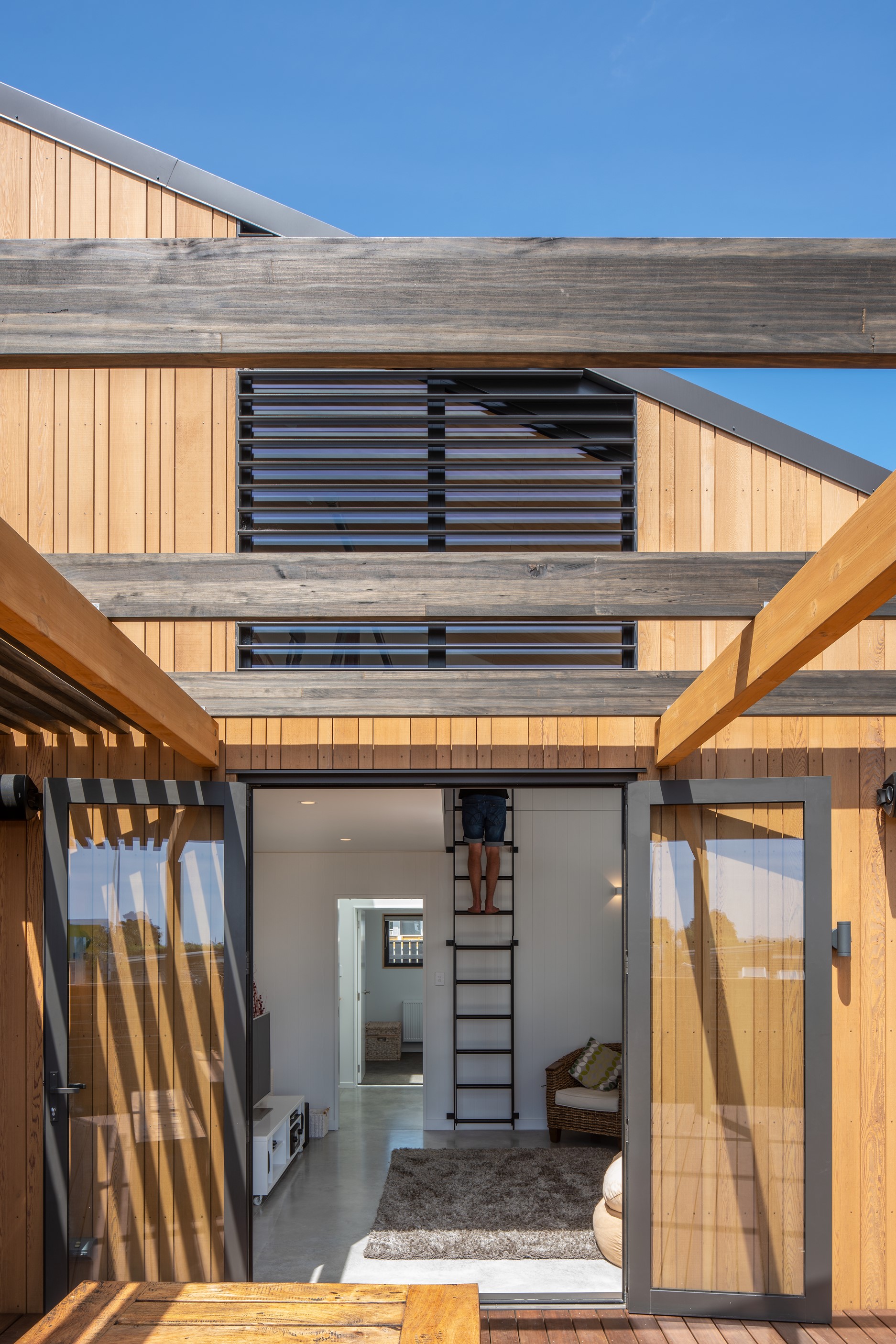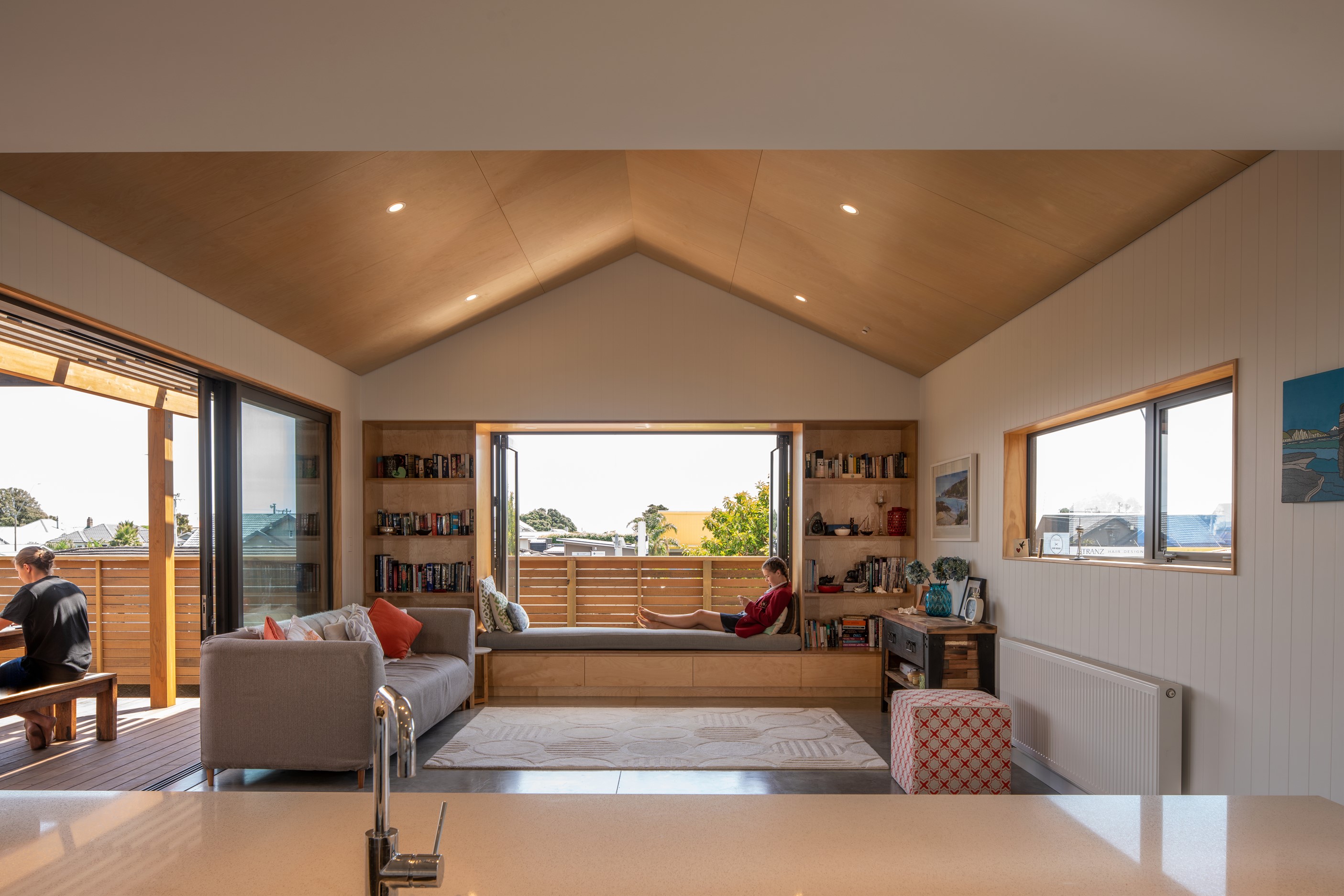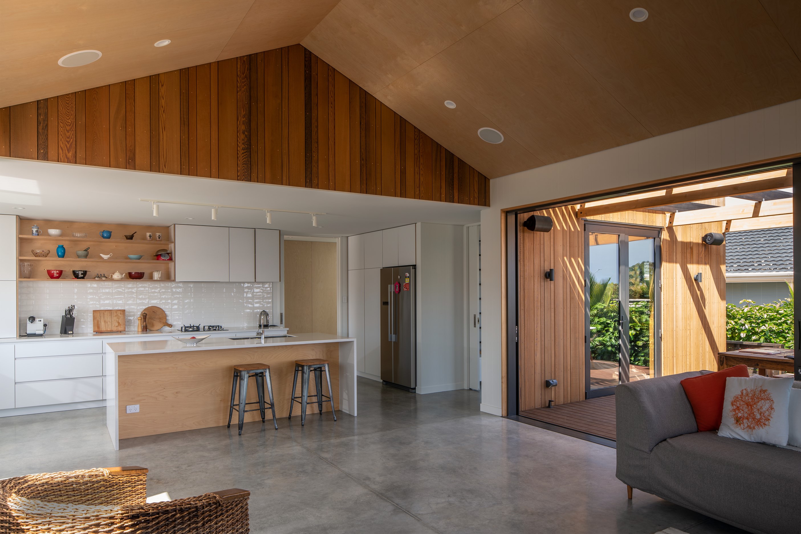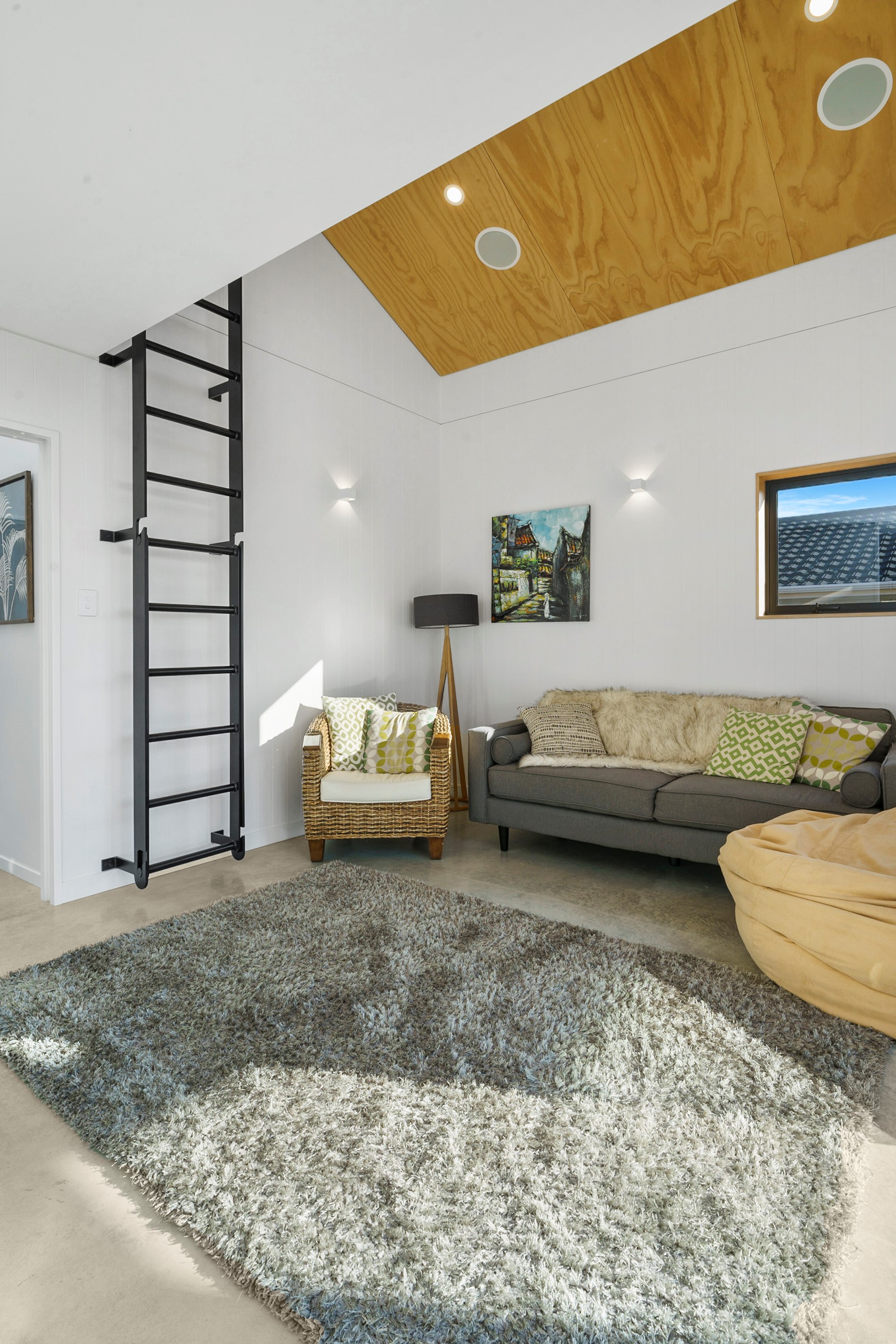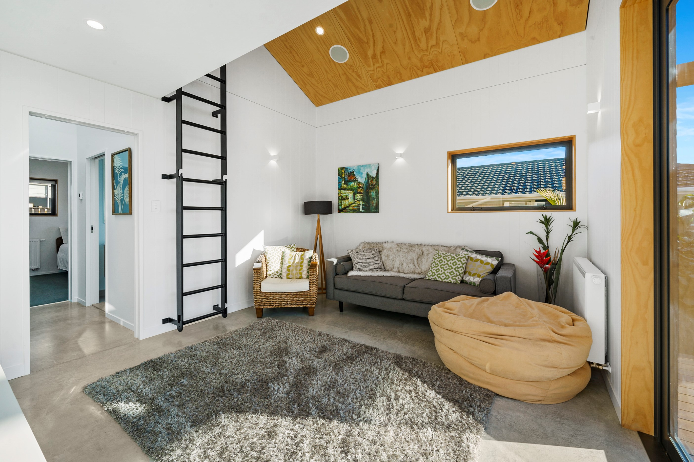 Other impressive features include grooved plywood linings, birch plywood ceilings and built-in joinery. There’s even an aluminium ladder which leads to the mezzanine floor – perfect for those seeking some ‘me’ time. With various timber ceiling and wall surfaces combined with white kitchen cupboards and decor, the aesthetic is light and fresh. Concrete floors are durable and easy to clean. After a busy day, wind down on the window seat which opens out through bifold windows, or in the outdoor living area that’s also perfect for entertaining. As the beach is just a five-minute walk away, the outdoor shower is the ideal addition for washing off sandy feet.