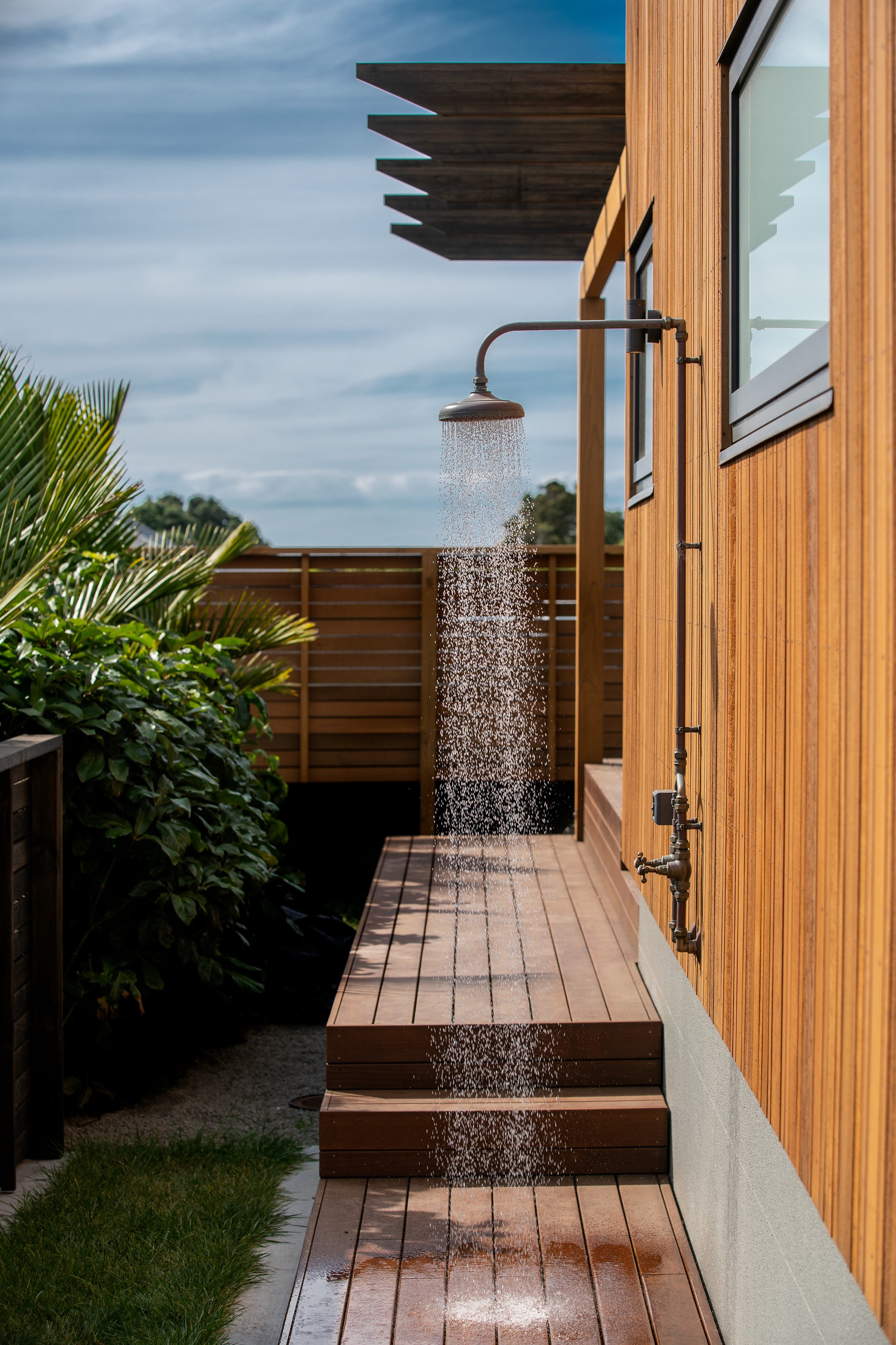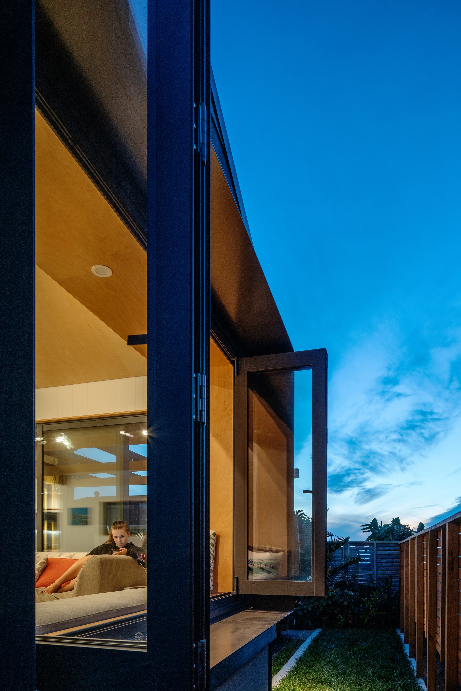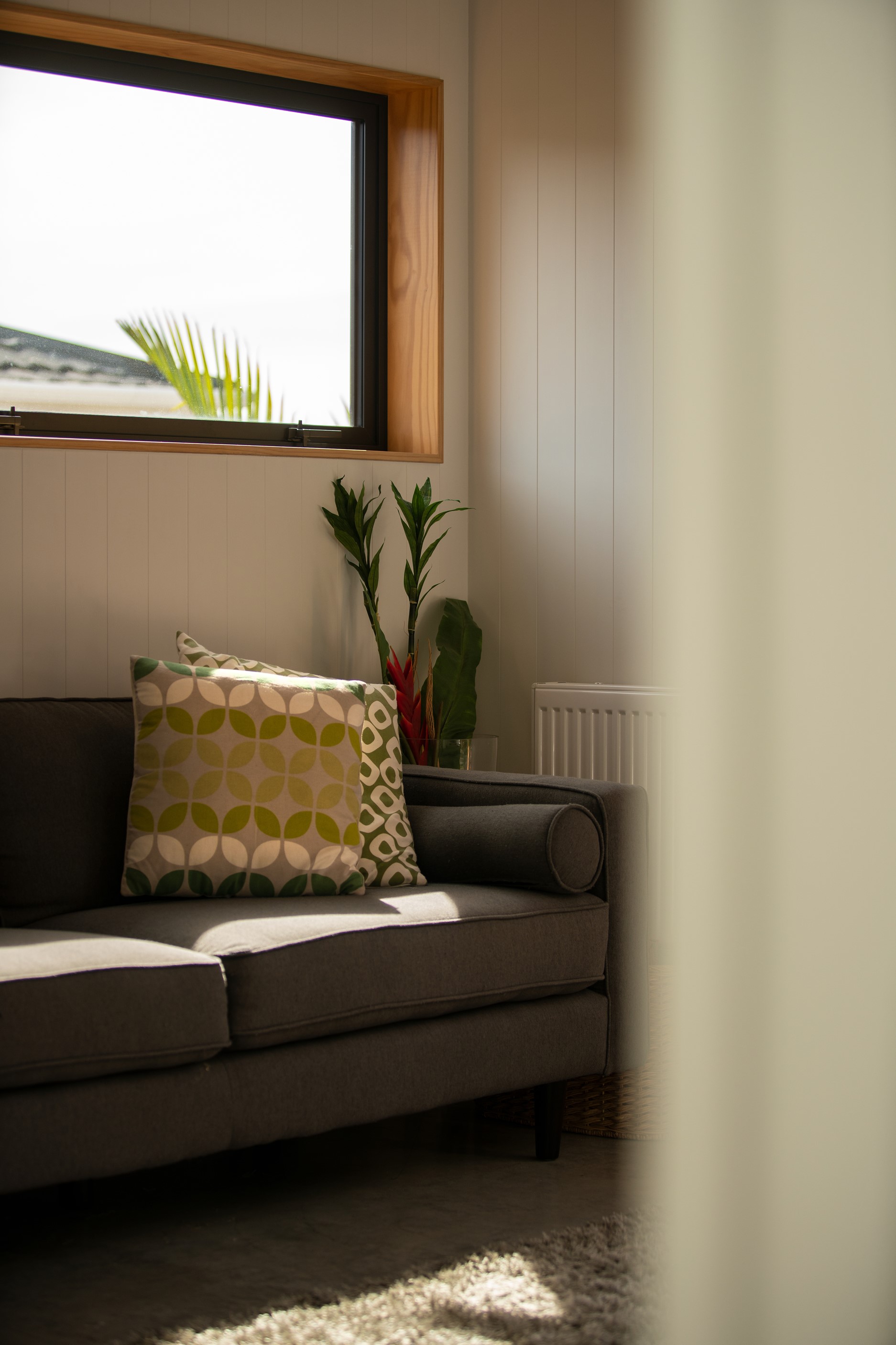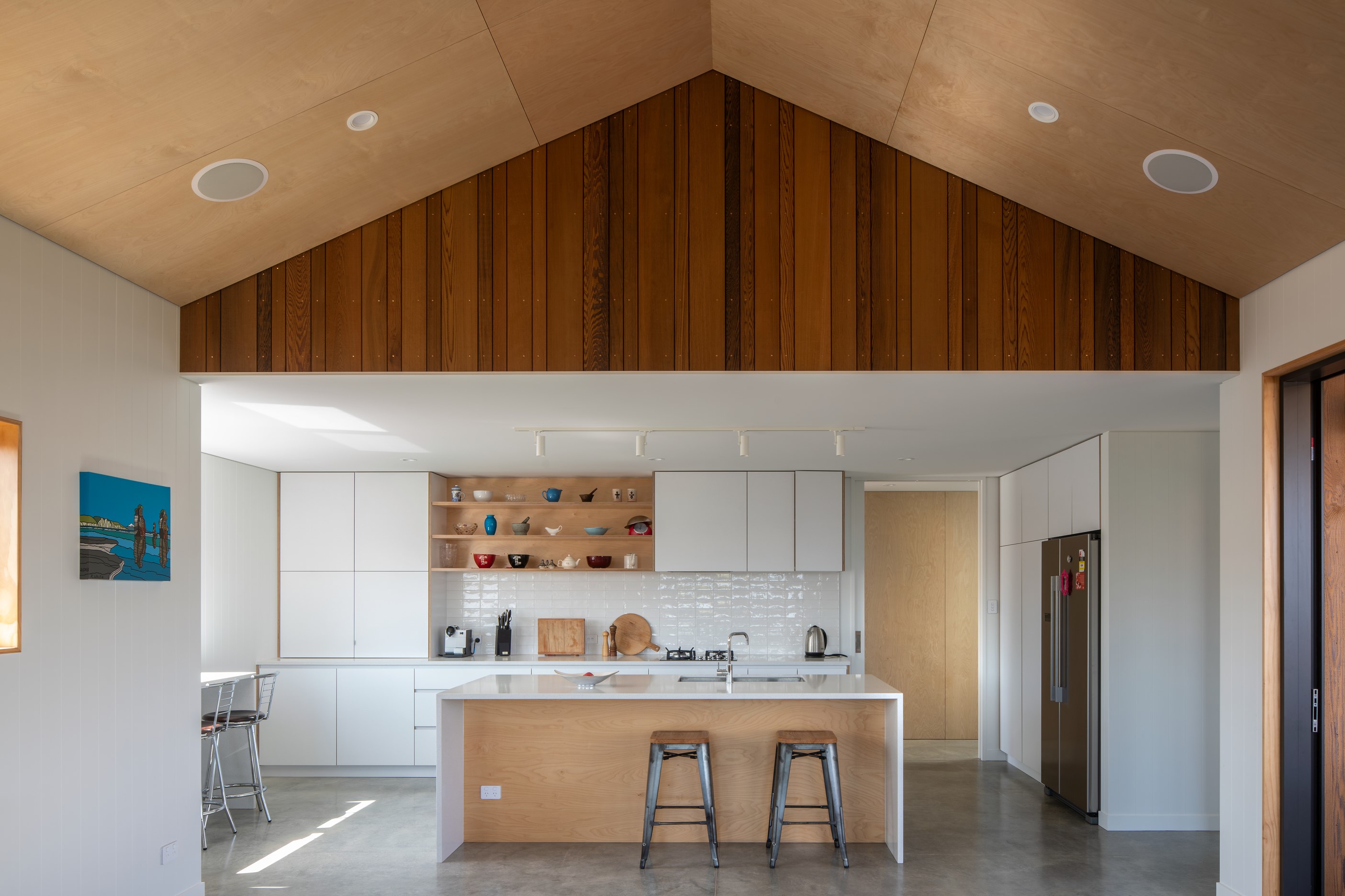 Other impressive features include grooved plywood linings, birch plywood ceilings and built-in joinery. There’s even an aluminium ladder which leads to the mezzanine floor – perfect for those seeking some ‘me’ time. With various timber ceiling and wall surfaces combined with white kitchen cupboards and decor, the aesthetic is light and fresh. Concrete floors are durable and easy to clean. After a busy day, wind down on the window seat which opens out through bifold windows, or in the outdoor living area that’s also perfect for entertaining. As the beach is just a five-minute walk away, the outdoor shower is the ideal addition for washing off sandy feet.