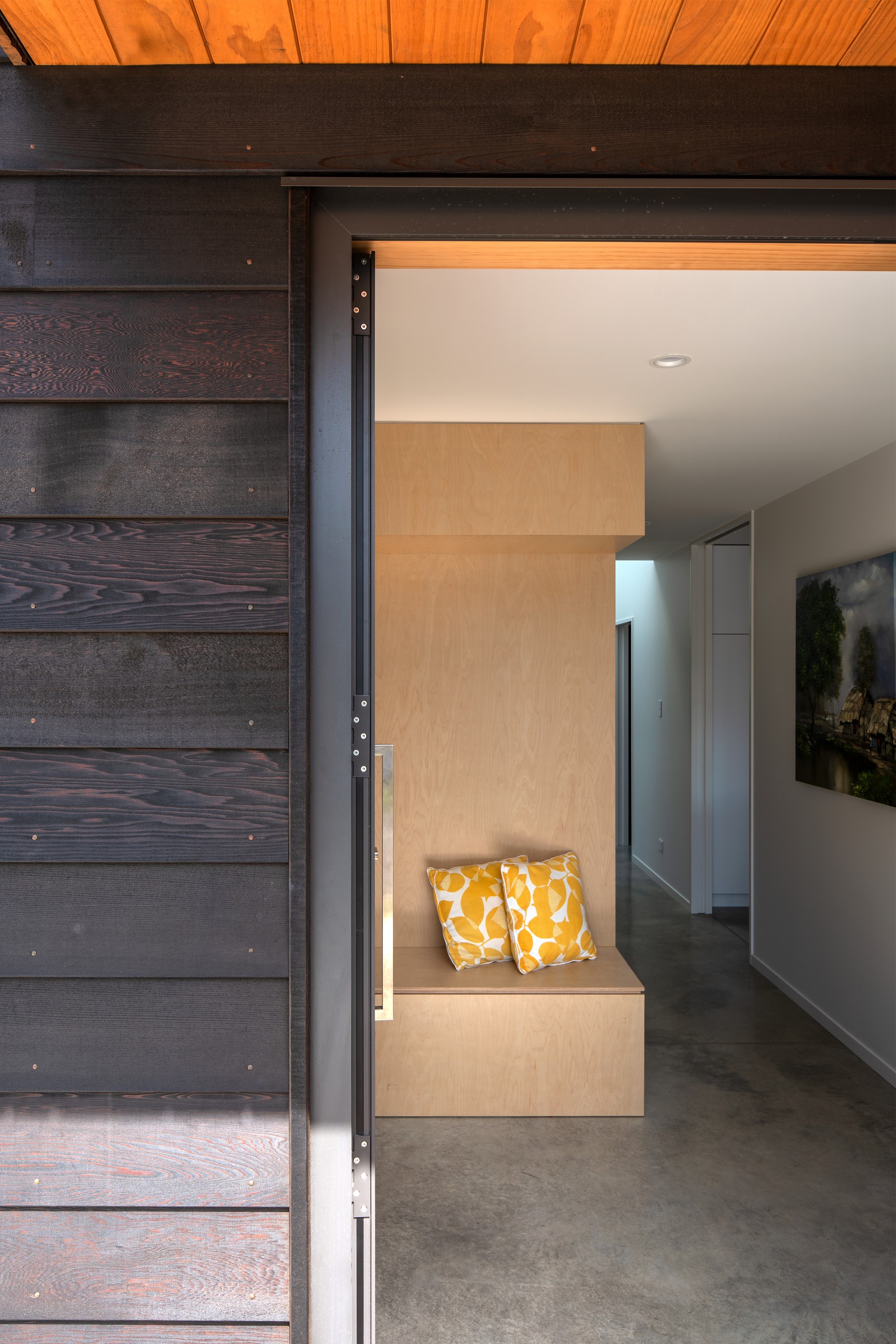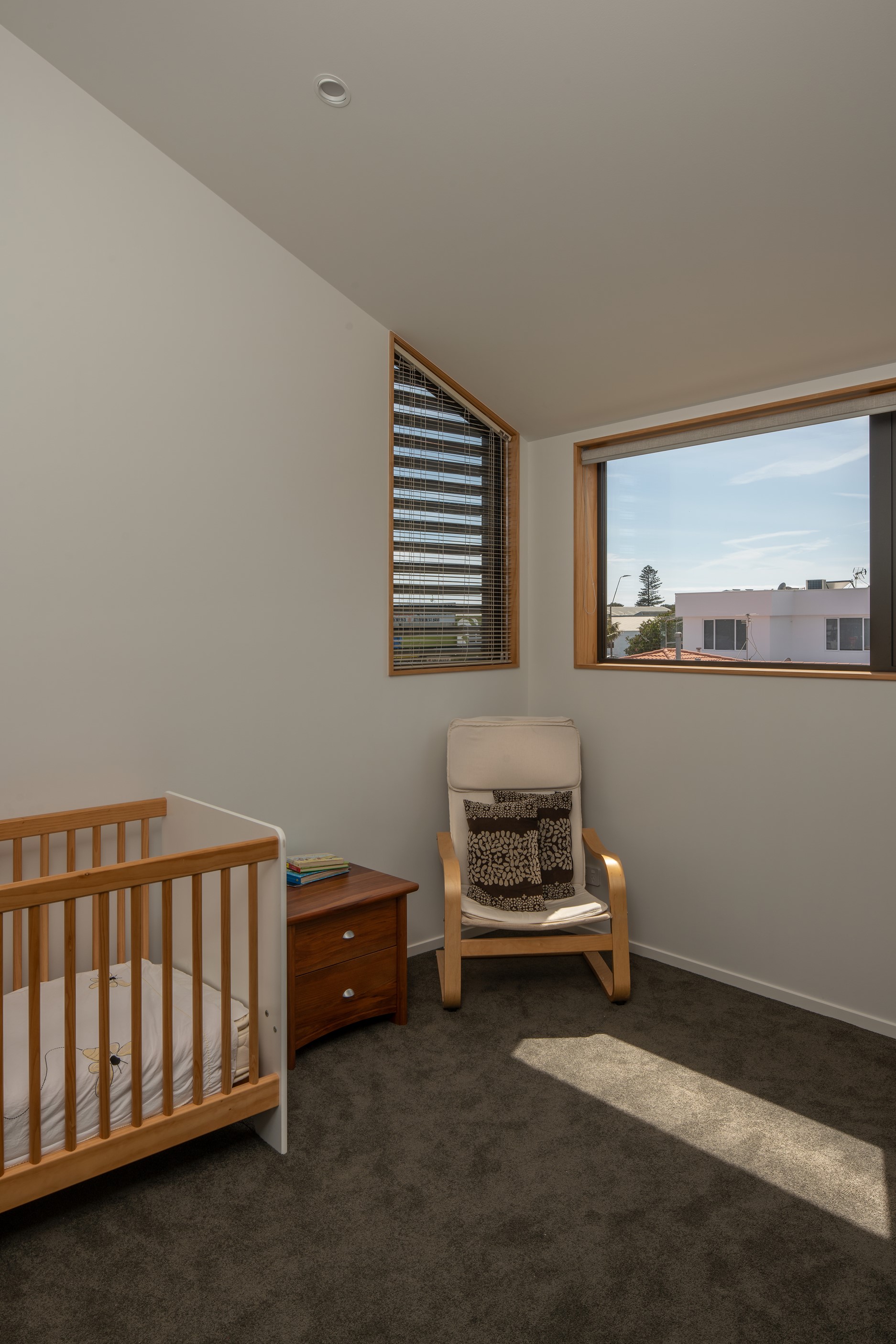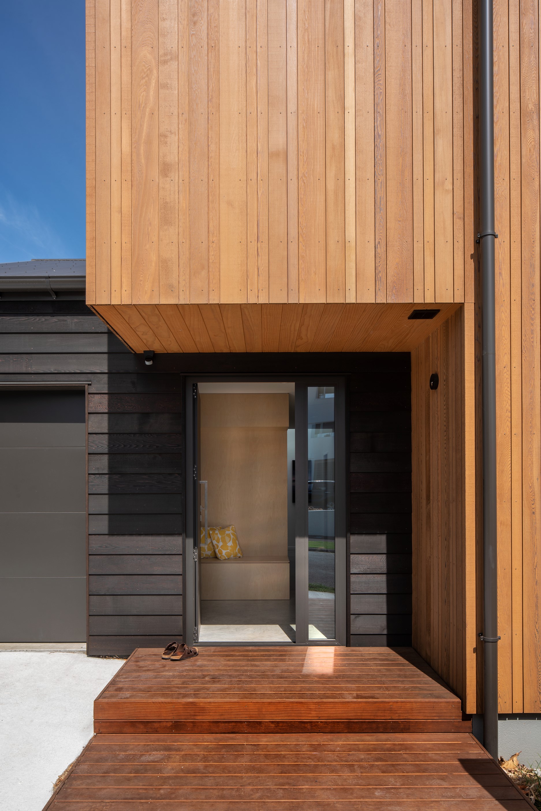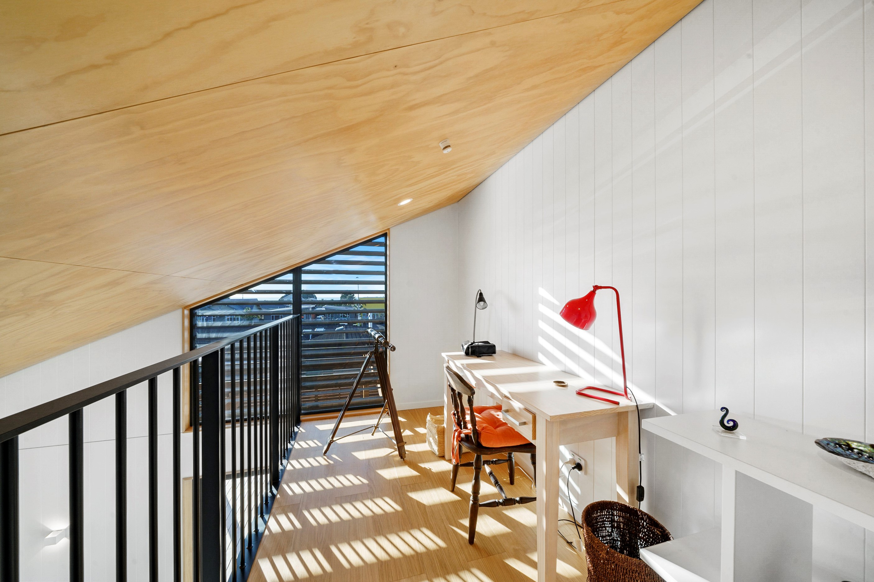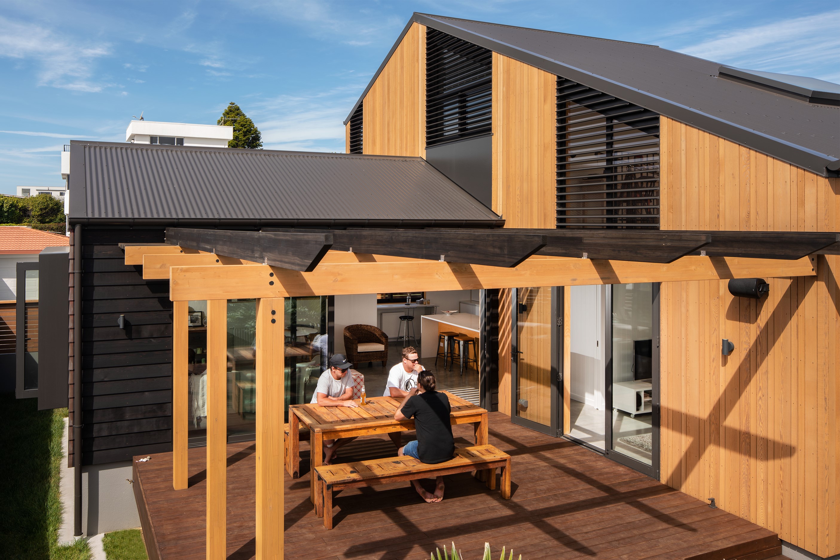 Other impressive features include grooved plywood linings, birch plywood ceilings and built-in joinery. There’s even an aluminium ladder which leads to the mezzanine floor – perfect for those seeking some ‘me’ time. With various timber ceiling and wall surfaces combined with white kitchen cupboards and decor, the aesthetic is light and fresh. Concrete floors are durable and easy to clean. After a busy day, wind down on the window seat which opens out through bifold windows, or in the outdoor living area that’s also perfect for entertaining. As the beach is just a five-minute walk away, the outdoor shower is the ideal addition for washing off sandy feet.