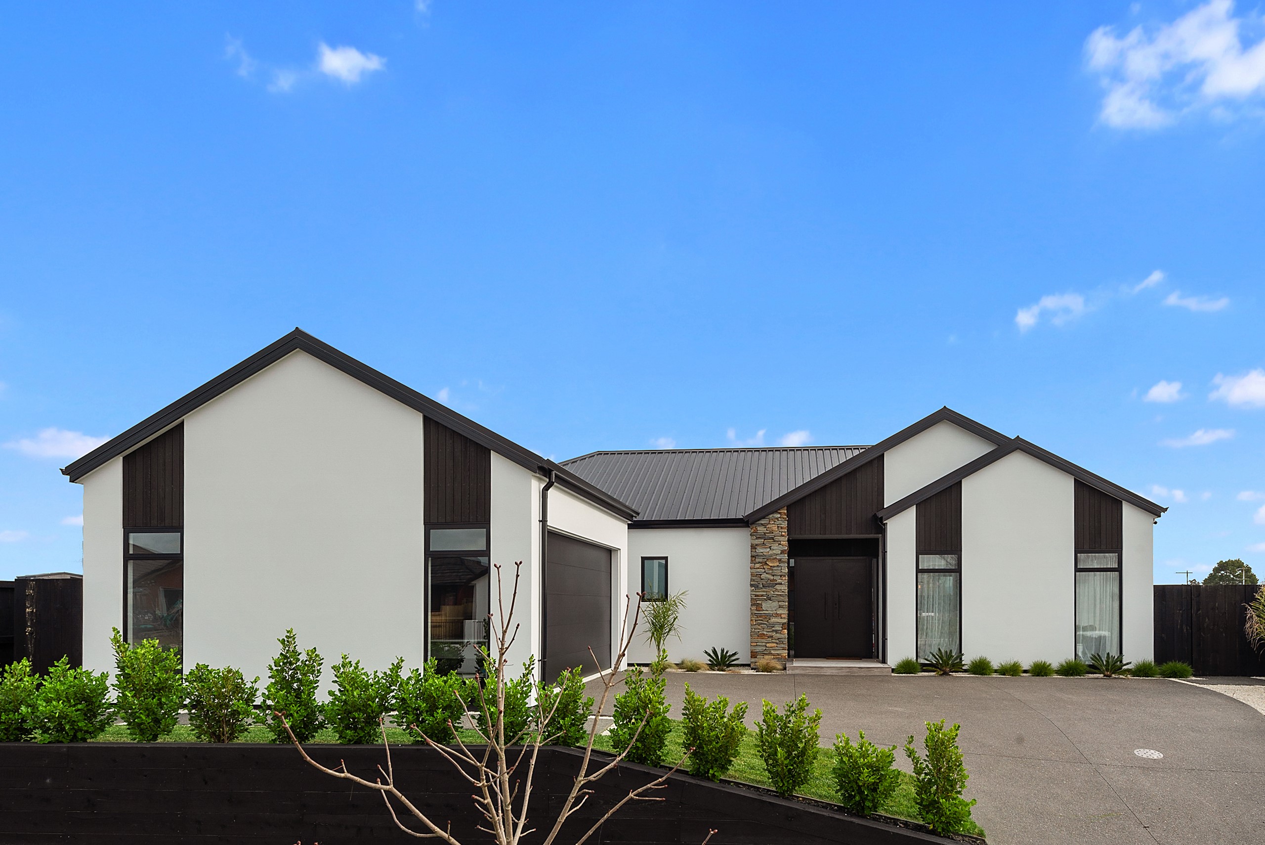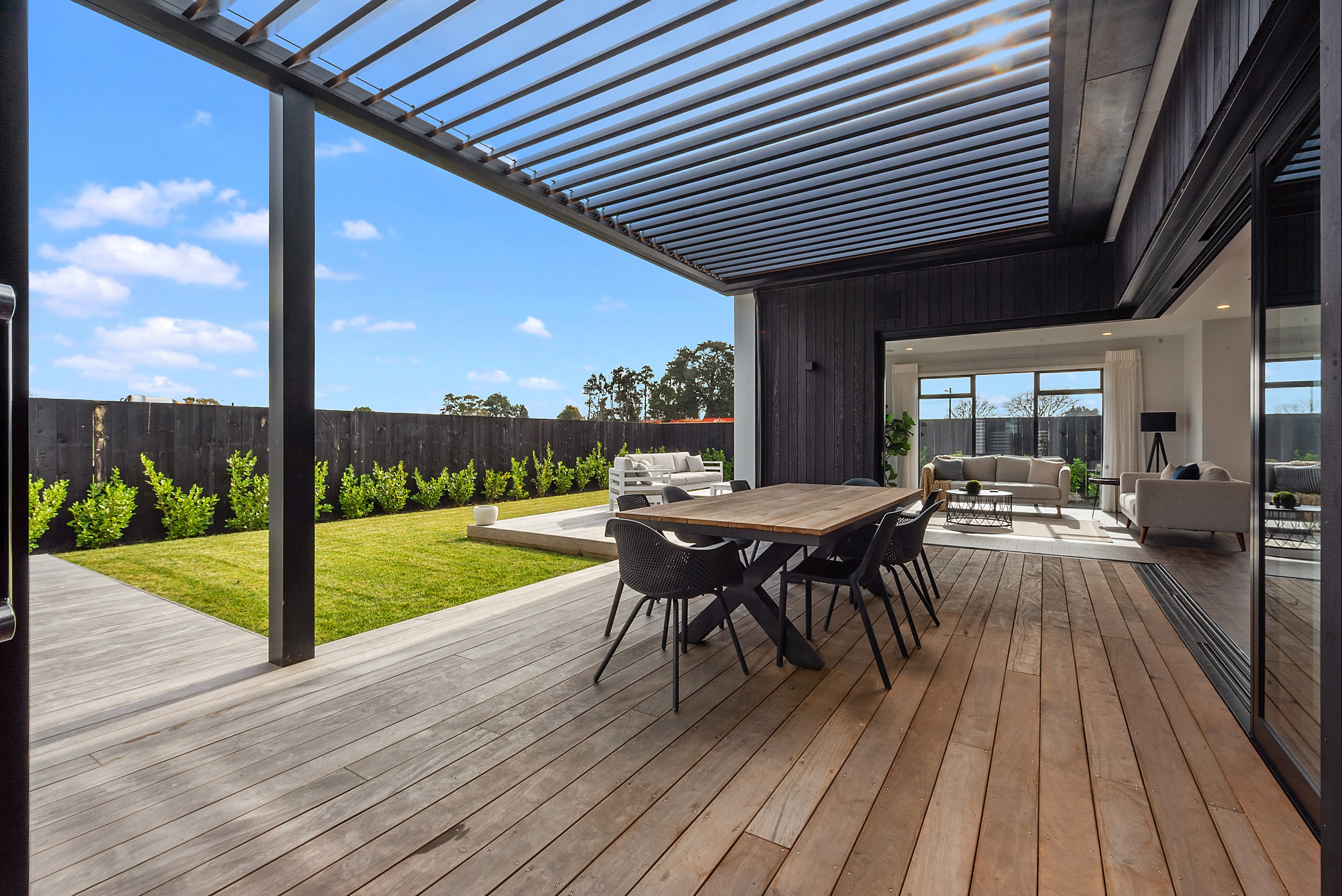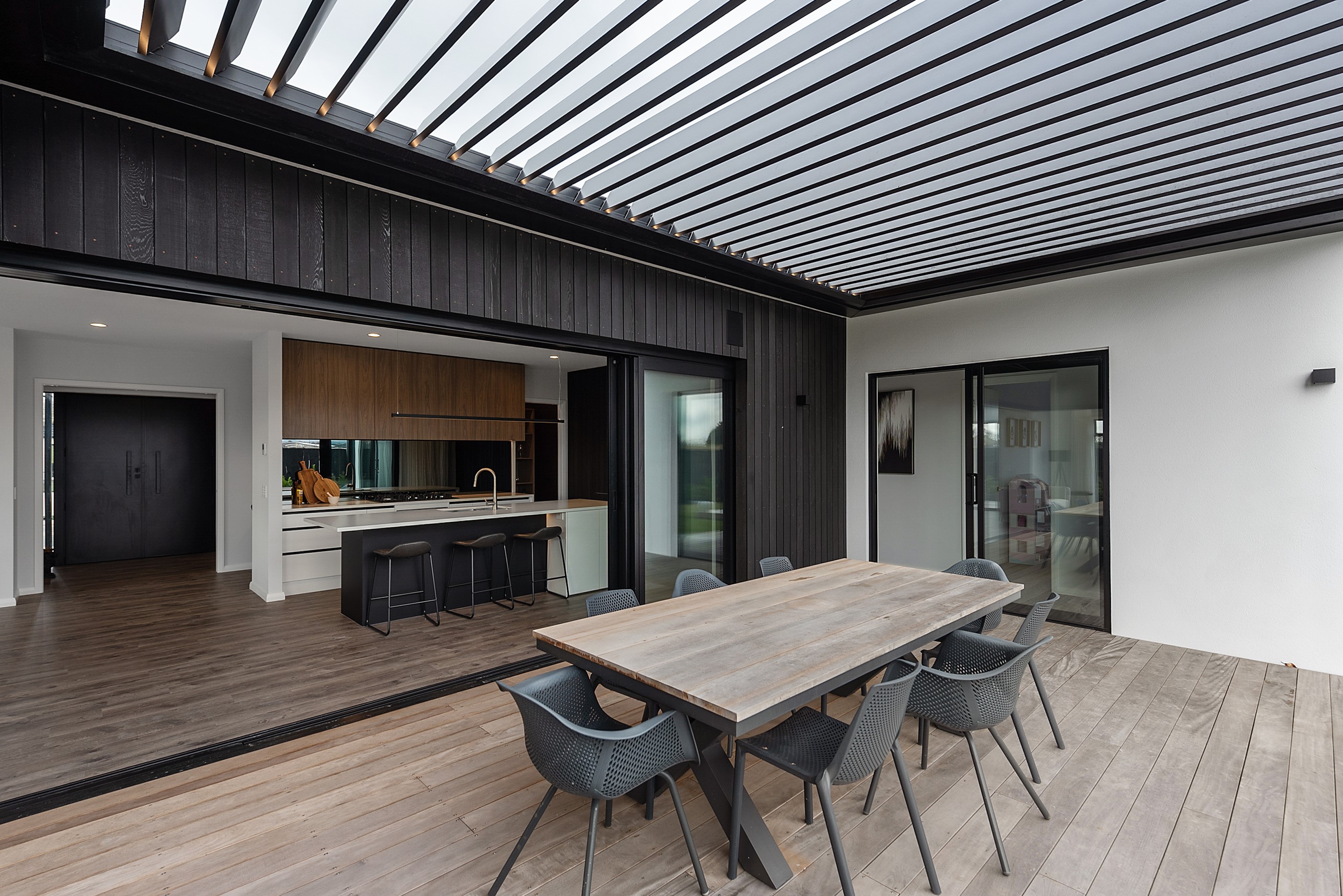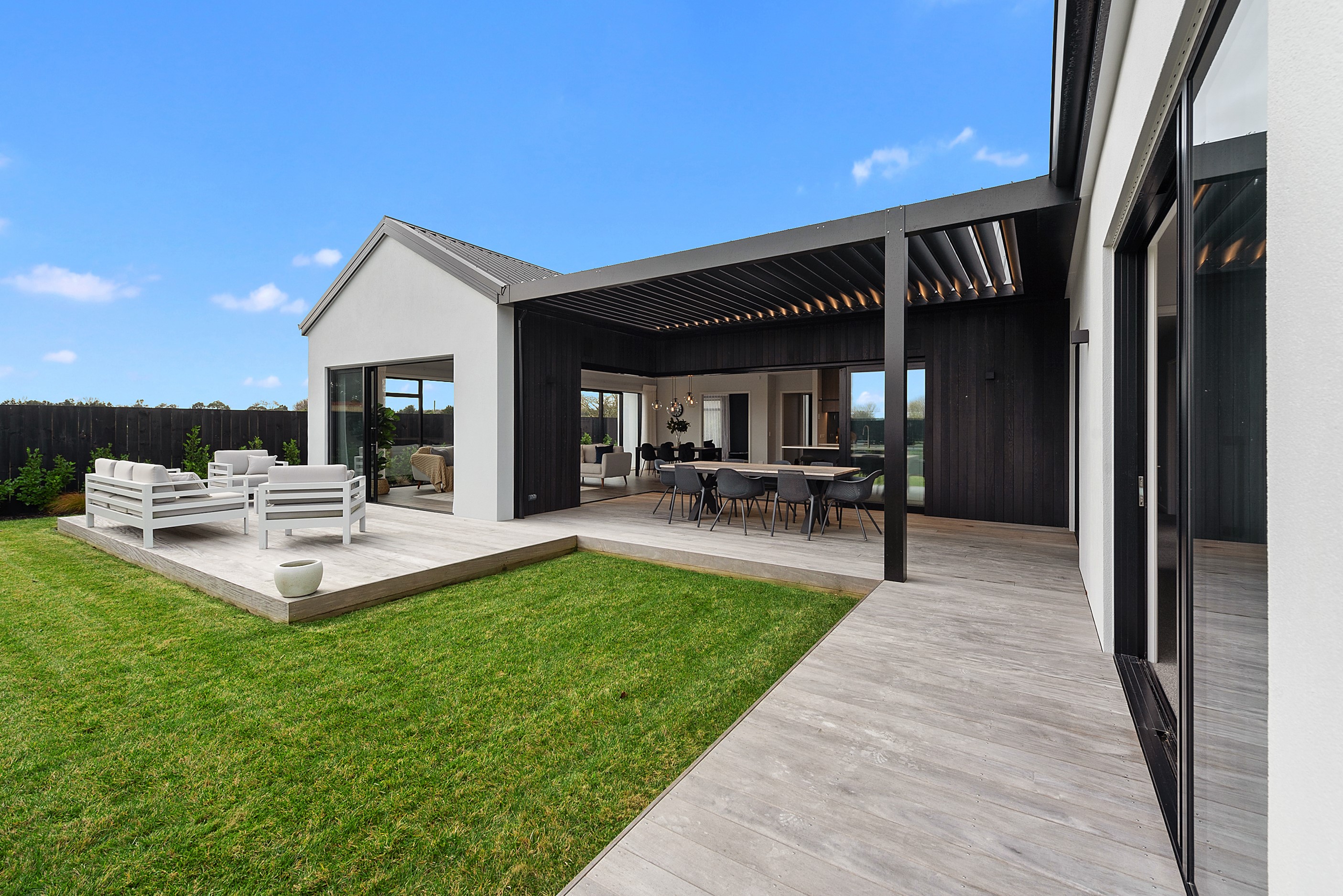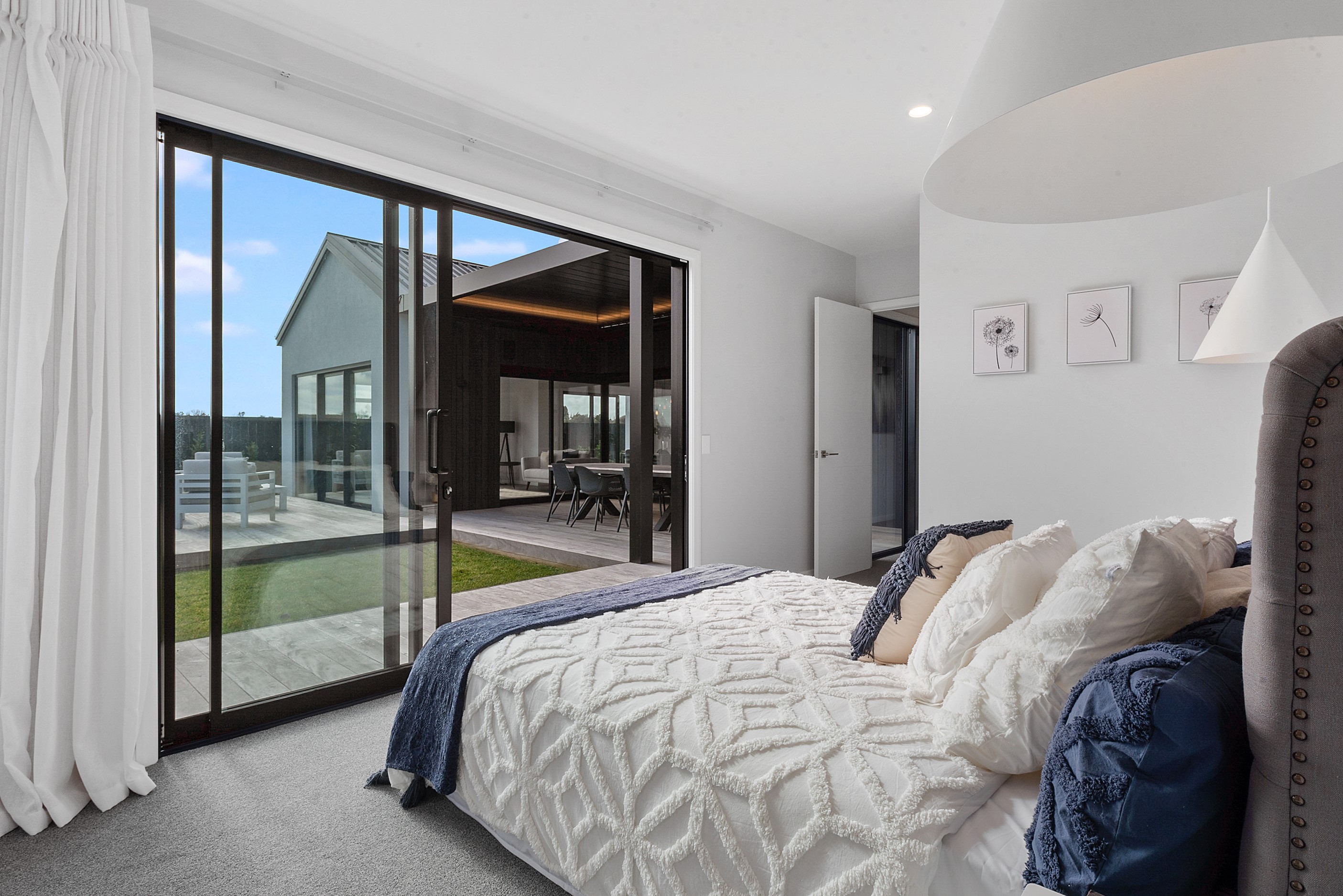 This modern four-bedroom, two-bathroom home was designed as an entertainer’s dream. A fresh take on the classic pavilion-style layout, visitors are greeted by an Otago stone schist wall and large double door that connects to an open-plan living area. Start the morning with a coffee at the breakfast bar, or out on the deck with louvres that can be closed to make it an all-weather space. This west-facing spot is also a relaxing place to enjoy sunny afternoons.