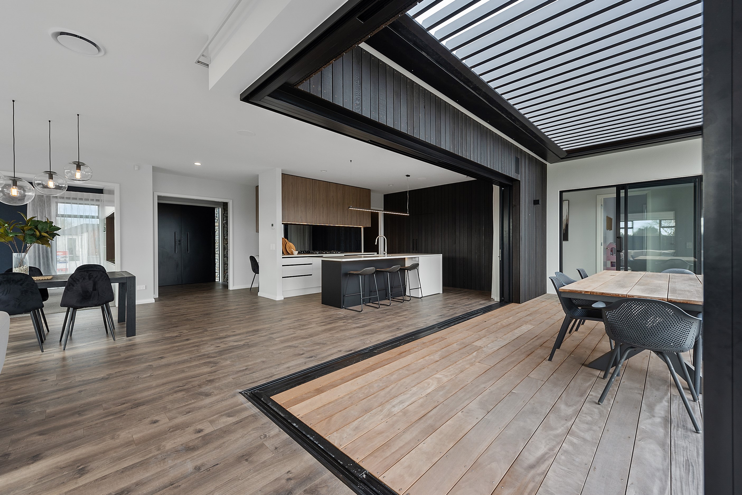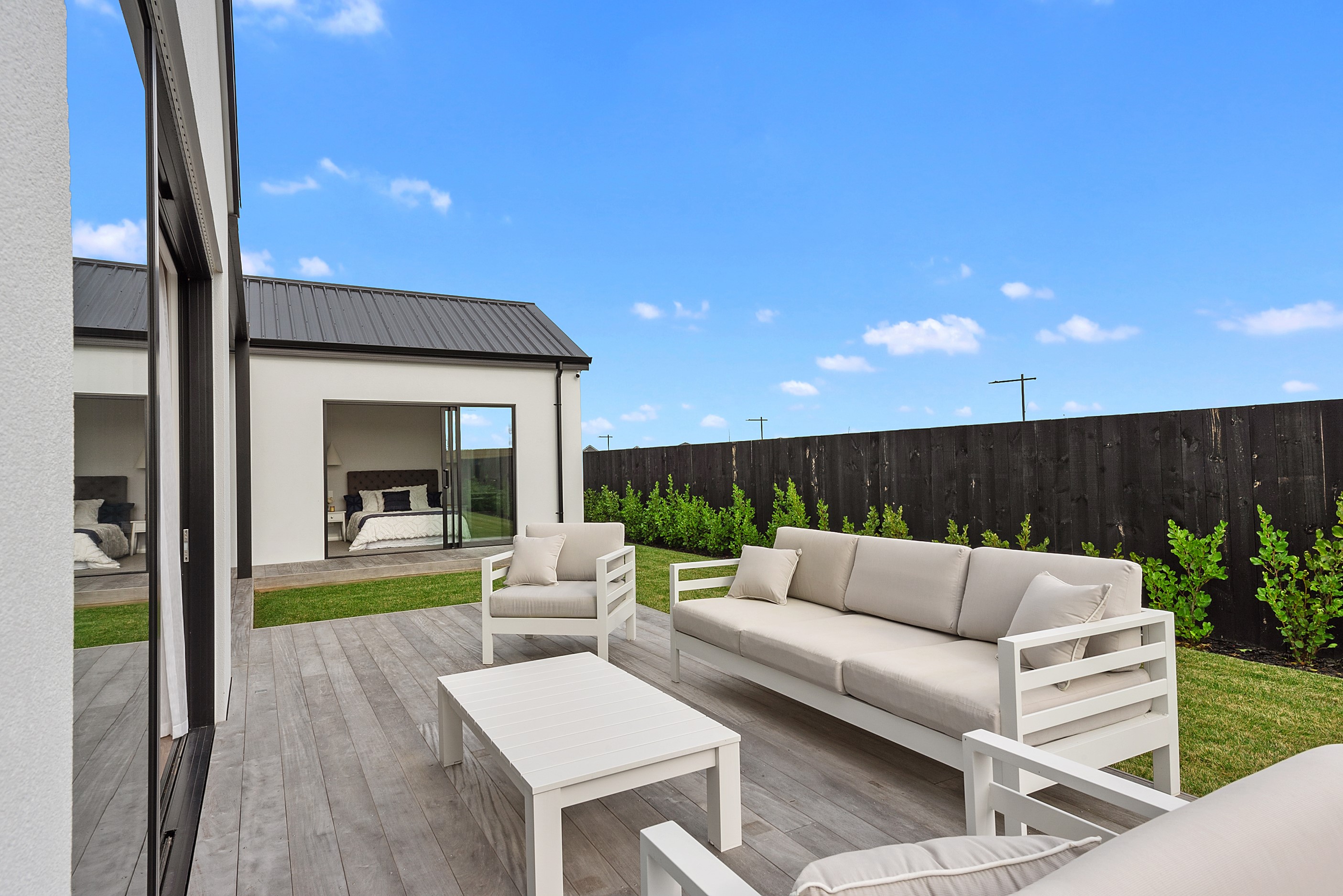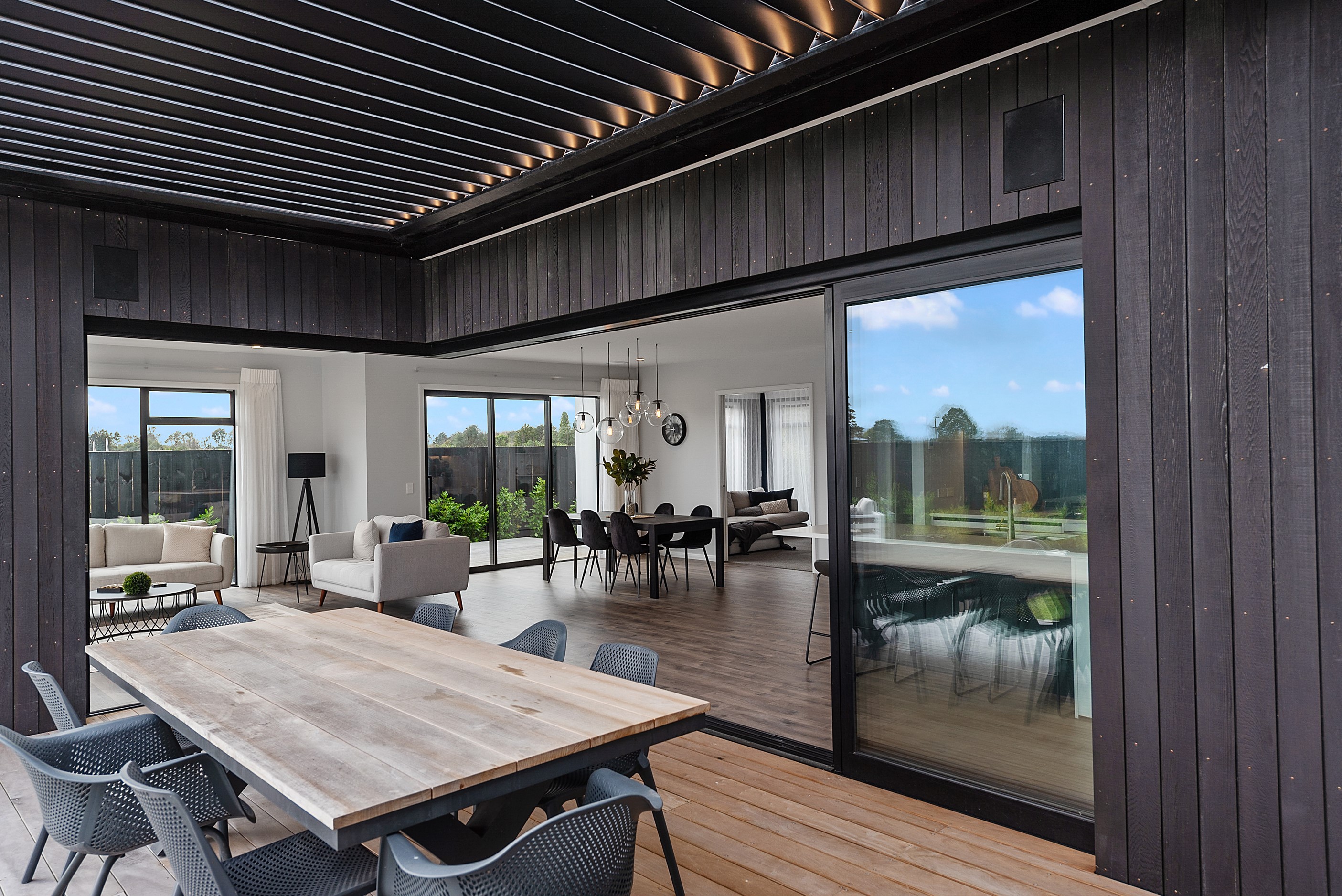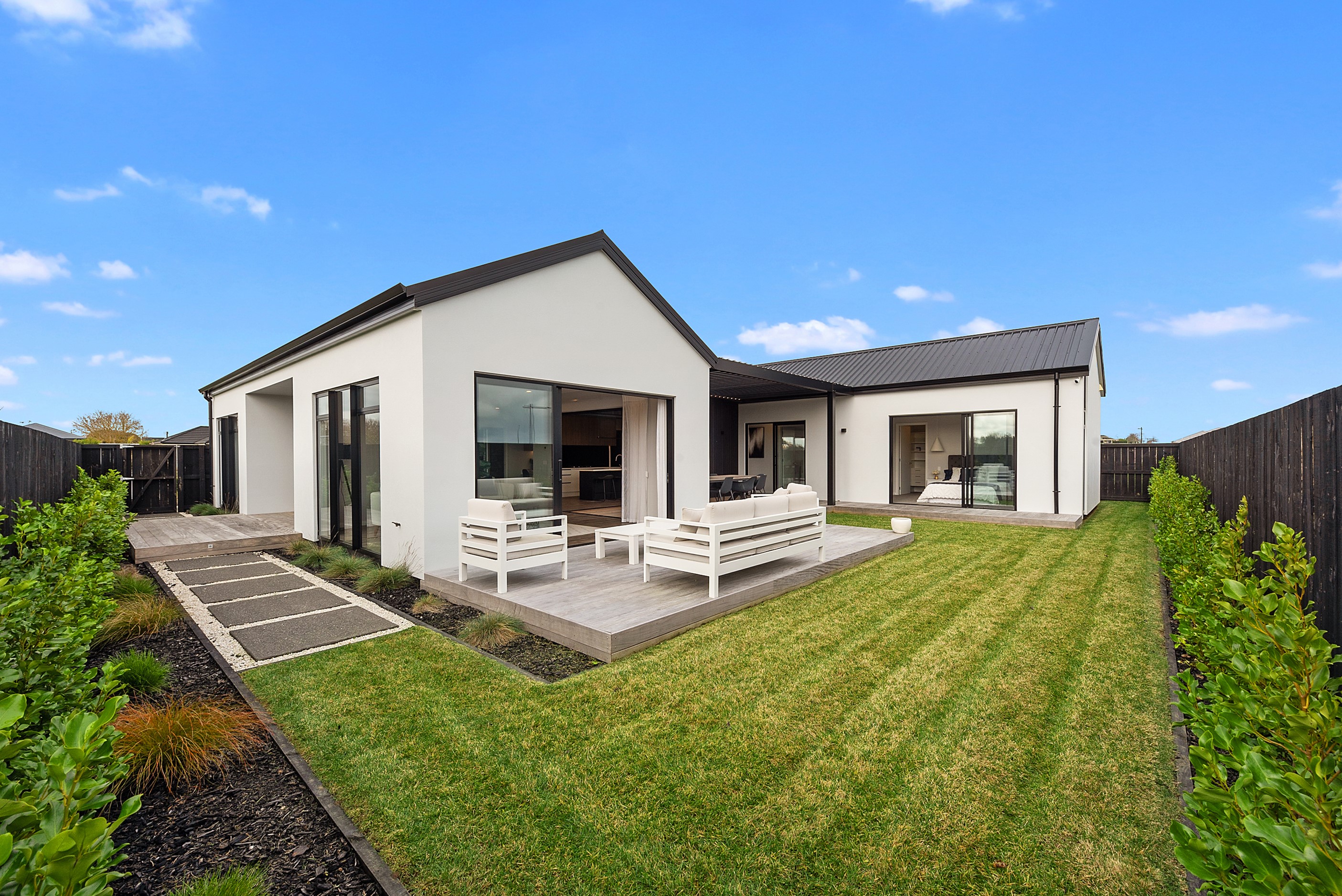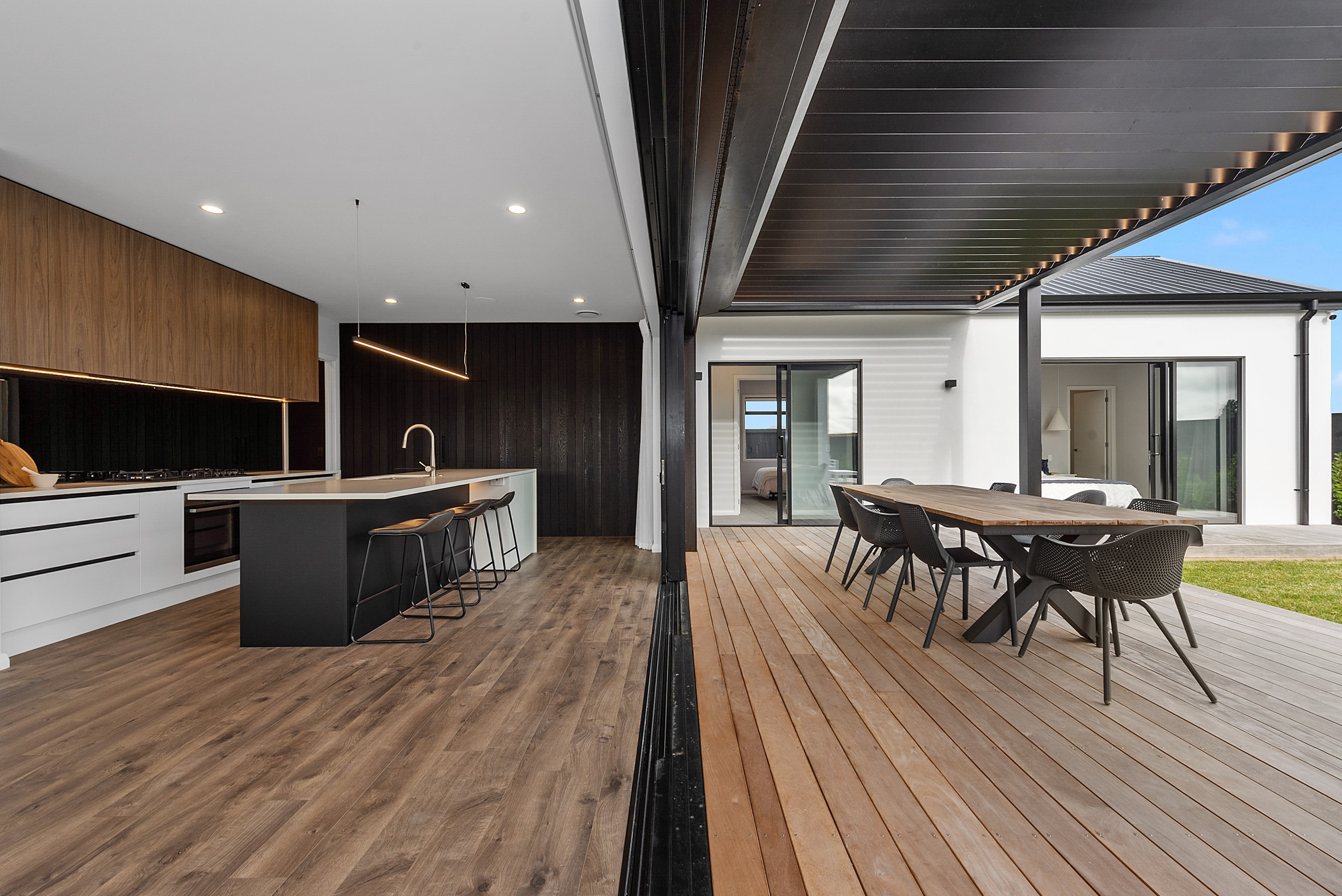 This modern four-bedroom, two-bathroom home was designed as an entertainer’s dream. A fresh take on the classic pavilion-style layout, visitors are greeted by an Otago stone schist wall and large double door that connects to an open-plan living area. Start the morning with a coffee at the breakfast bar, or out on the deck with louvres that can be closed to make it an all-weather space. This west-facing spot is also a relaxing place to enjoy sunny afternoons.