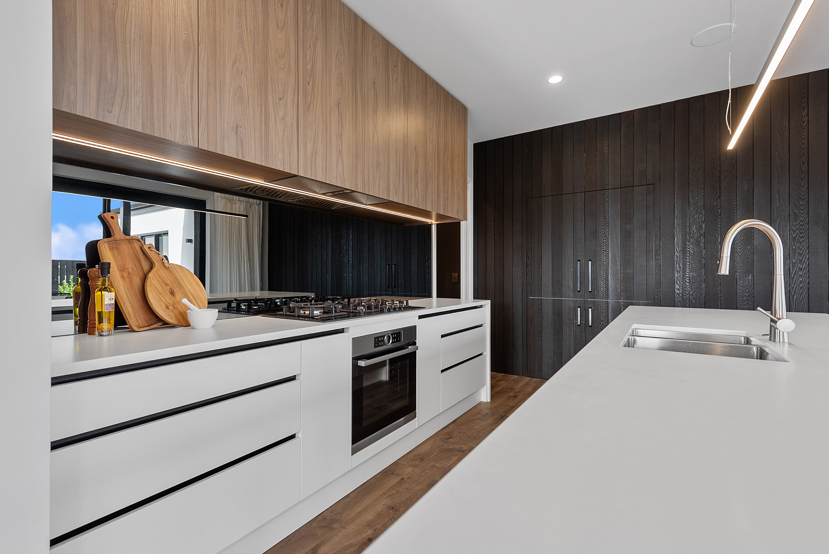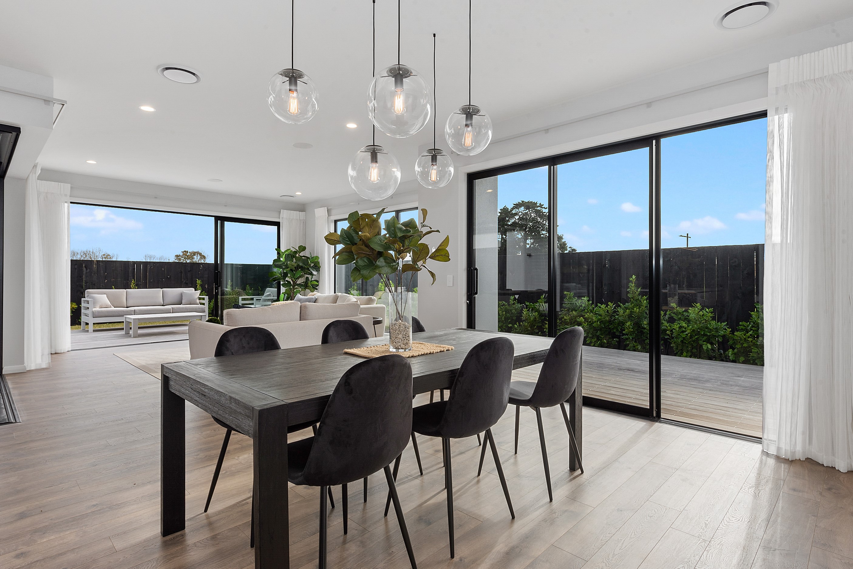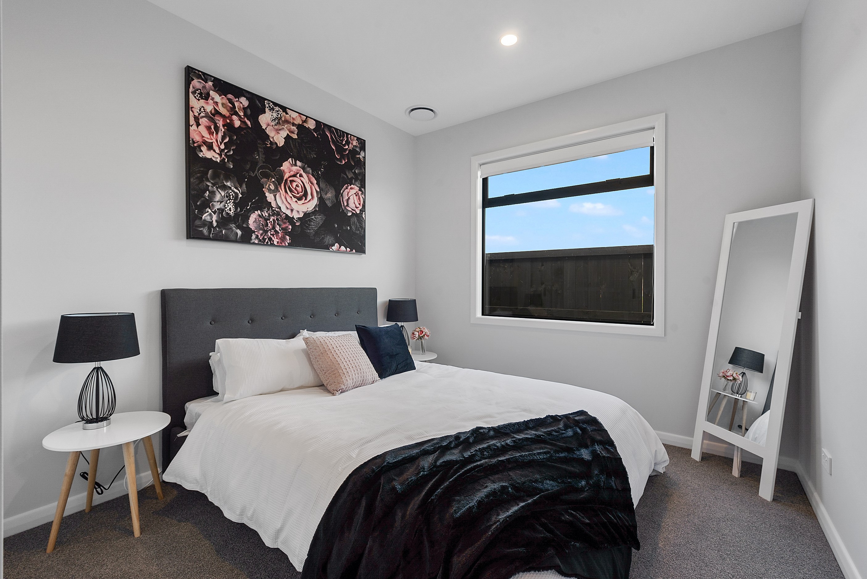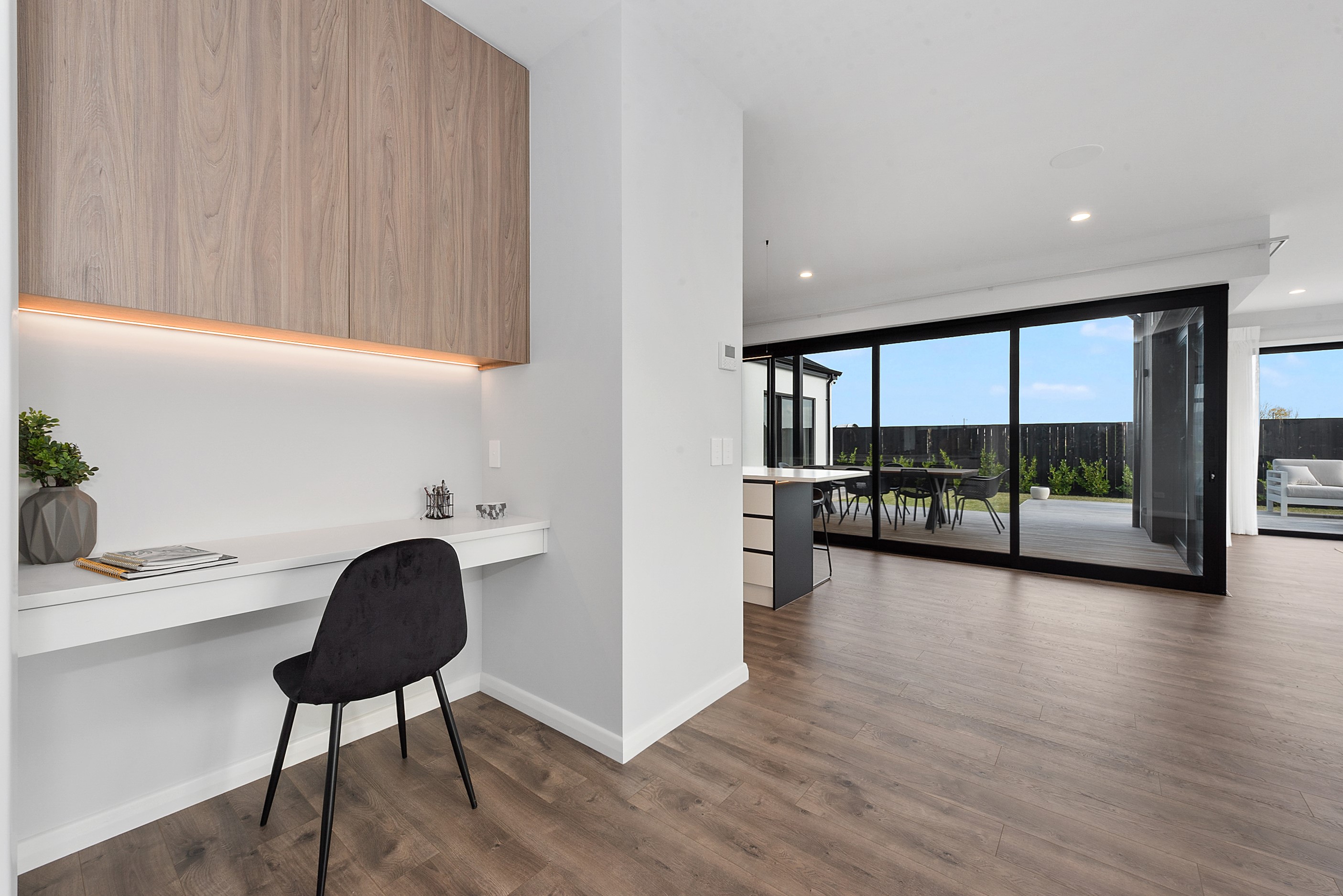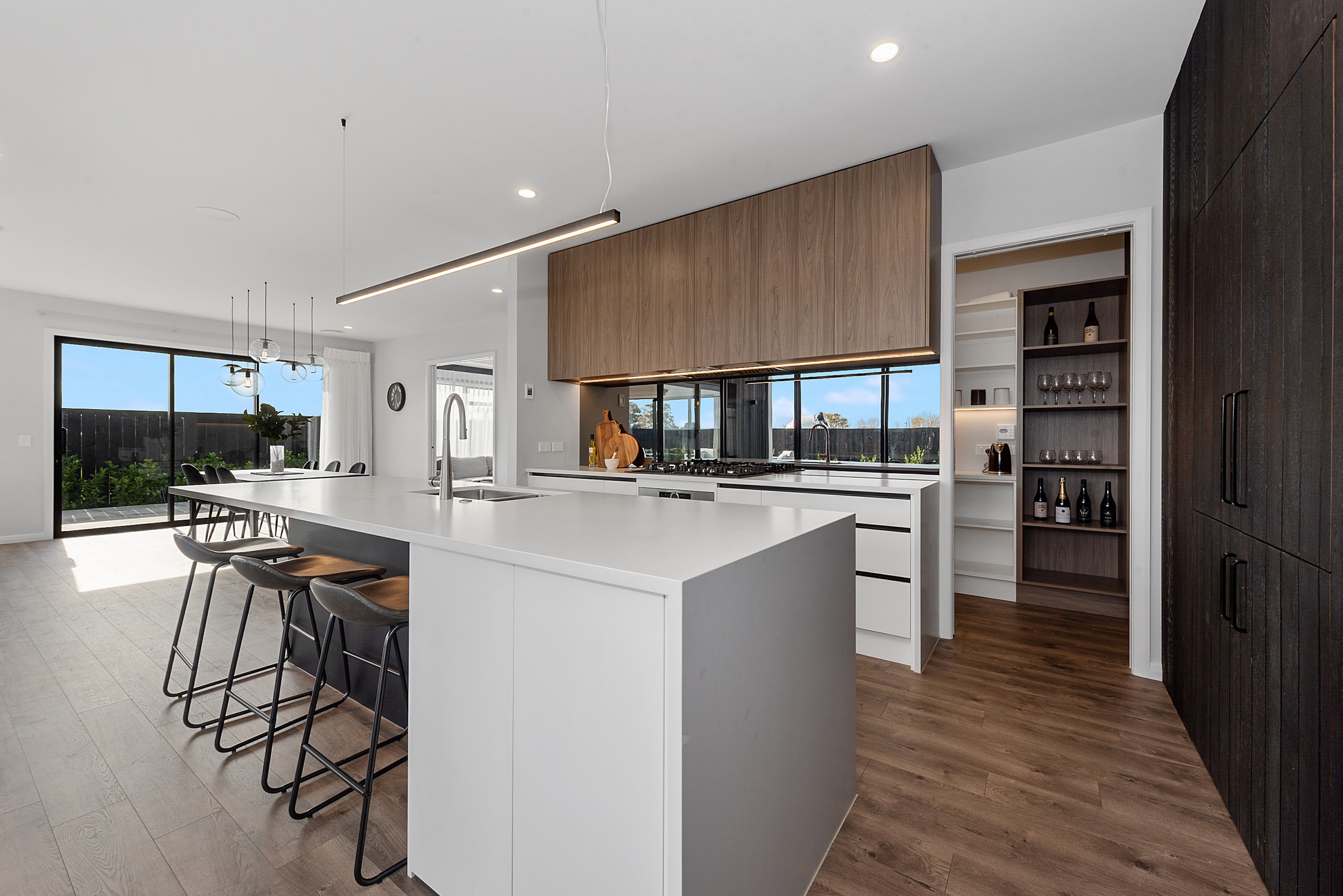 This modern four-bedroom, two-bathroom home was designed as an entertainer’s dream. A fresh take on the classic pavilion-style layout, visitors are greeted by an Otago stone schist wall and large double door that connects to an open-plan living area. Start the morning with a coffee at the breakfast bar, or out on the deck with louvres that can be closed to make it an all-weather space. This west-facing spot is also a relaxing place to enjoy sunny afternoons.