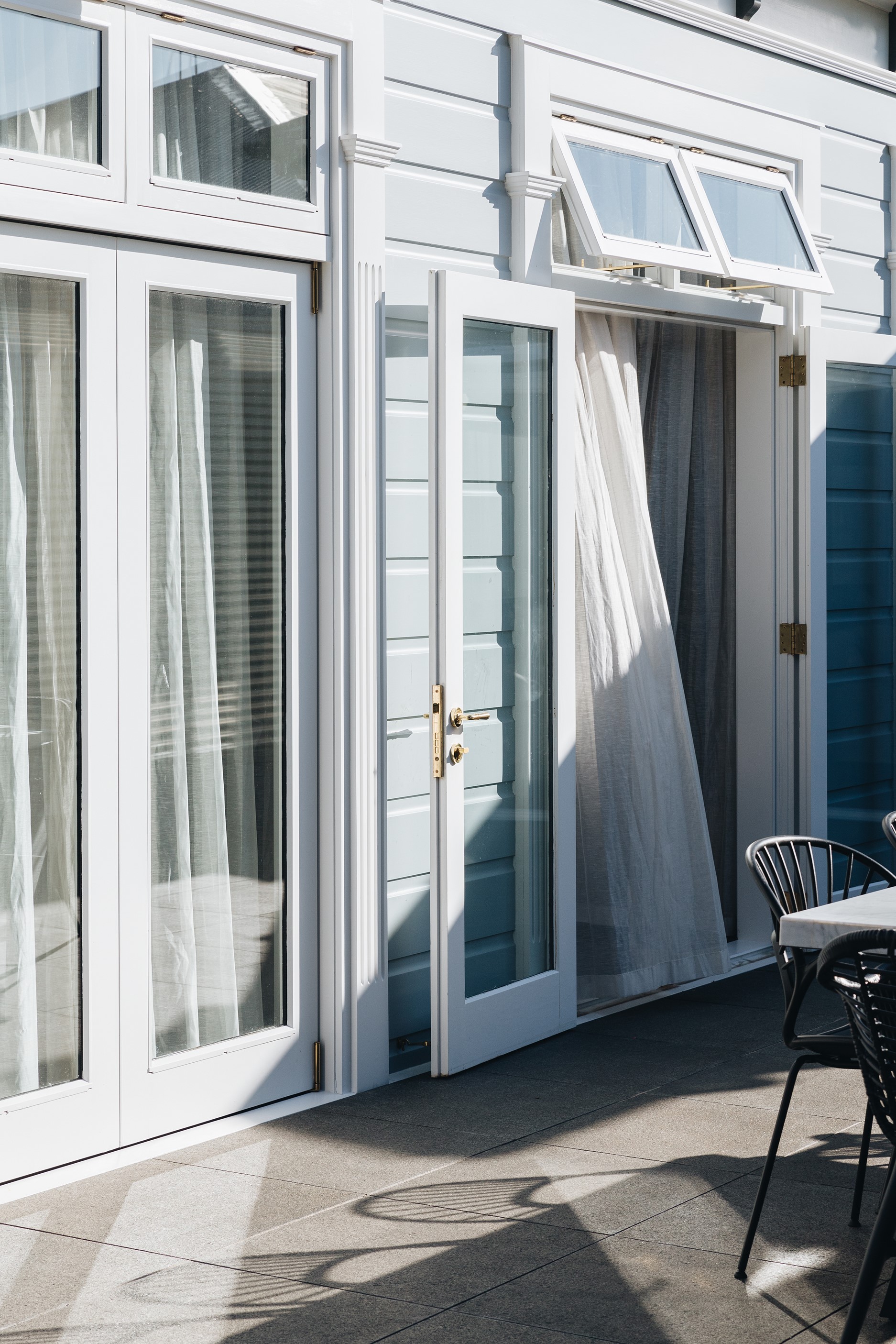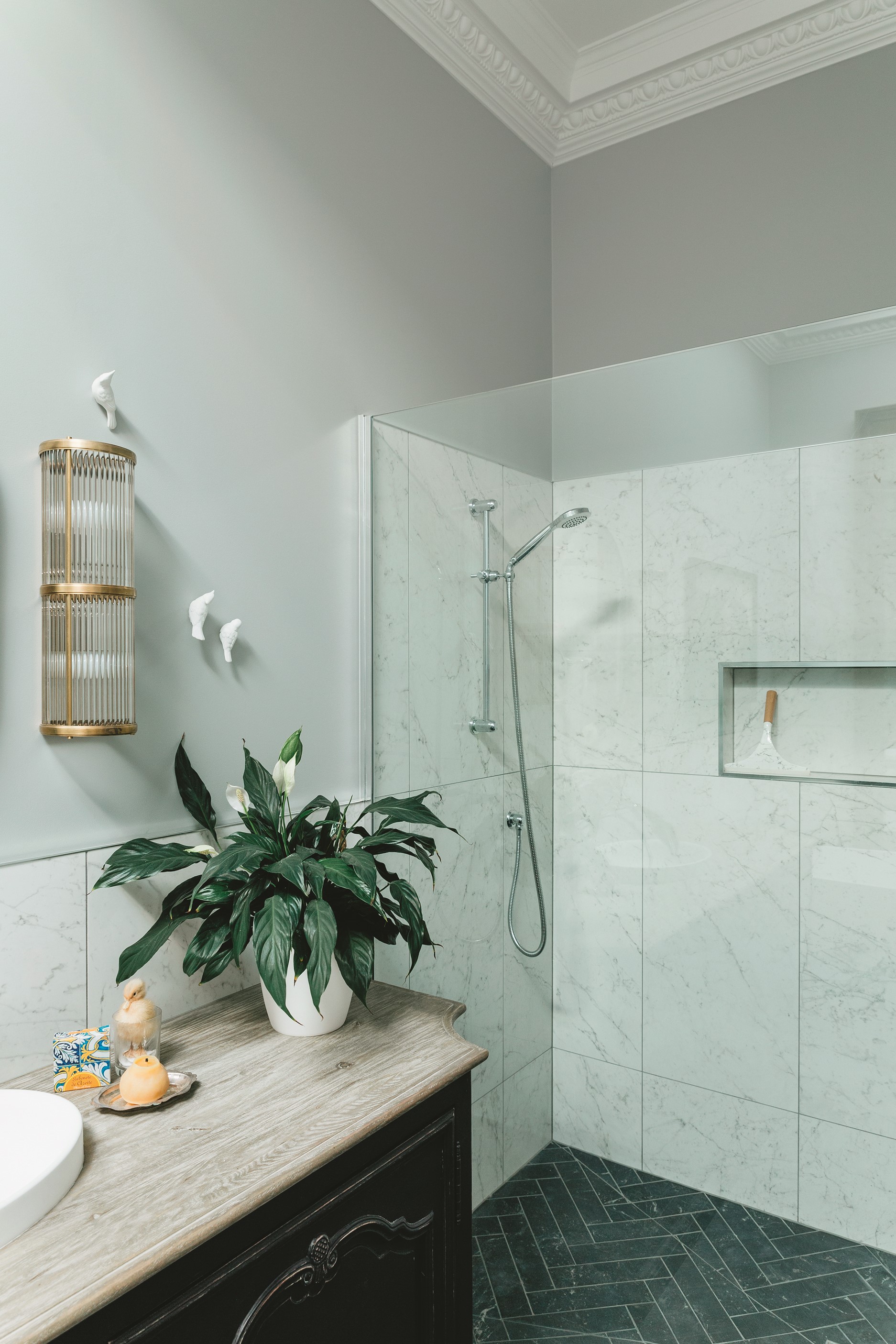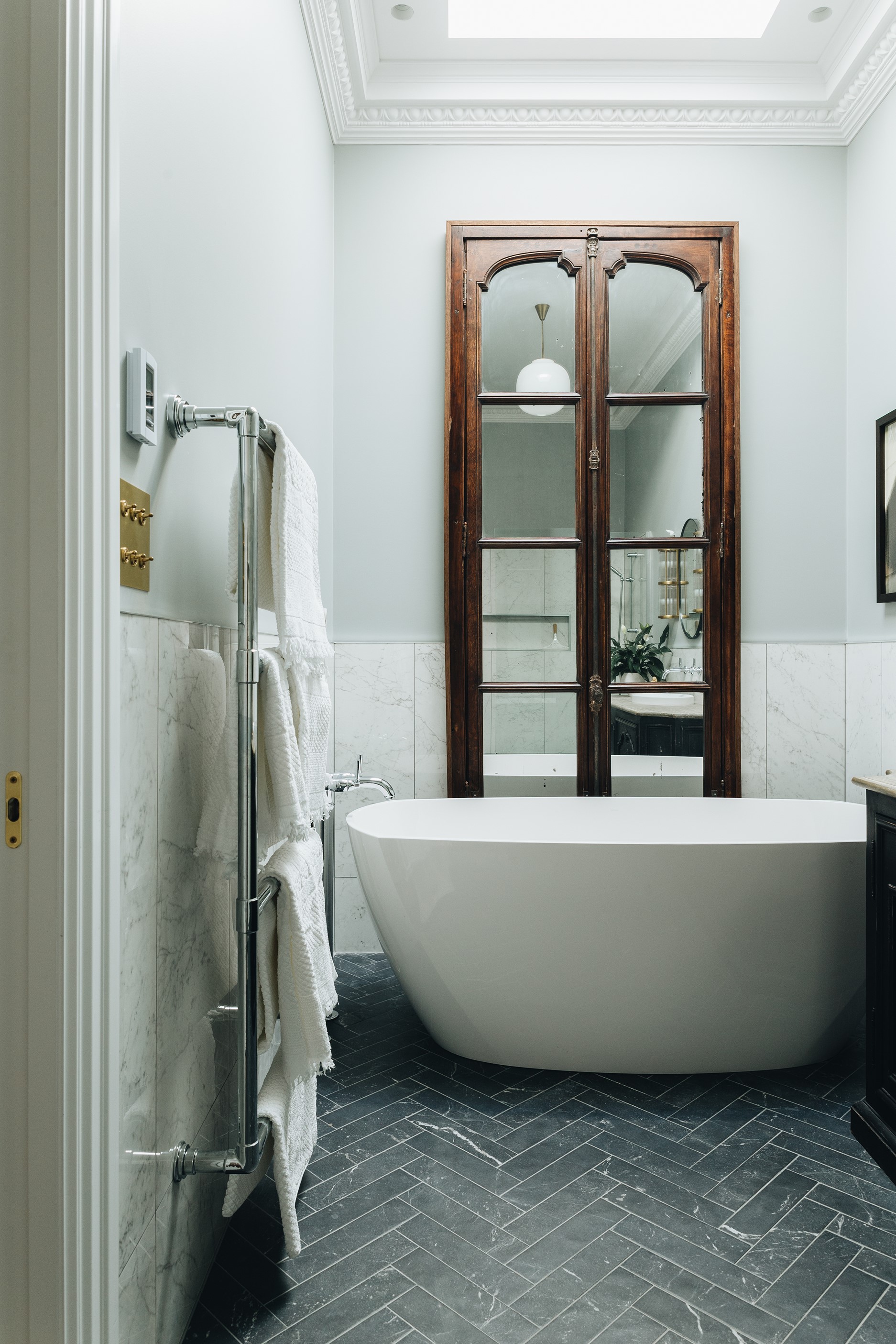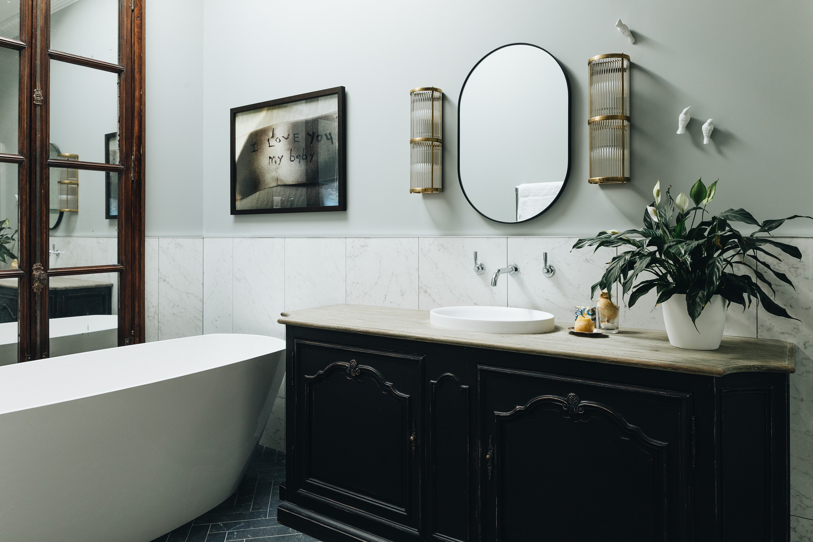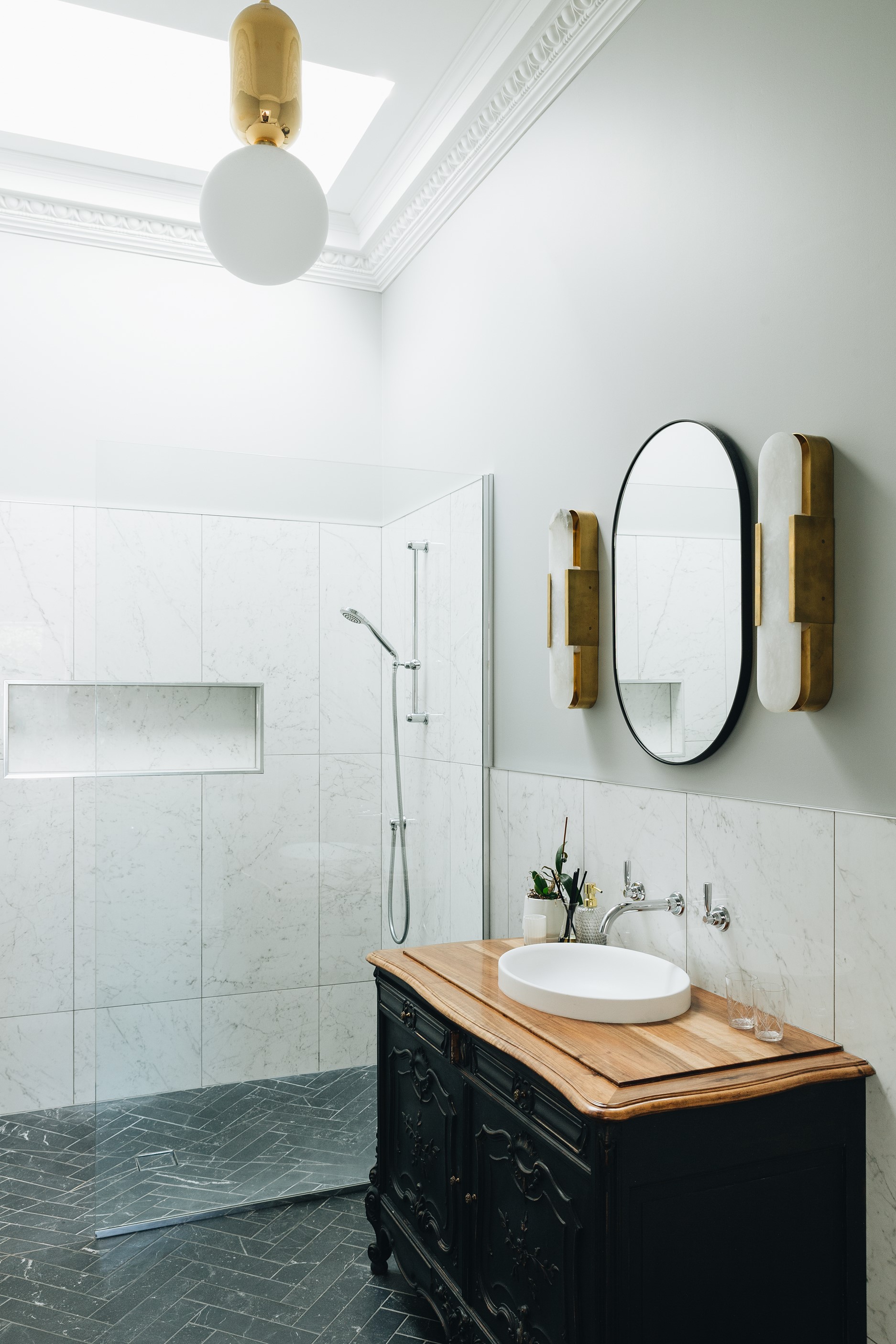 The high-performance Skylit kitchen has a deliberate vintage French feel. It repeats the panelling of the hallway for cohesion, while the sleek, white Corian benchtop, butler’s pantry, integrated appliances and marble tiles work together to make a space in which most people would be thrilled to cook a Sunday roast. The same sympathetic renovation can be seen in the bathrooms. Large, marble-look tiles line the lower half of the walls and are juxtaposed alongside dark herringbone floor tiles. The antique sideboard was sourced from France and transformed into a bespoke vanity. If it didn’t already have it, this villa now has that je ne sais quoi.