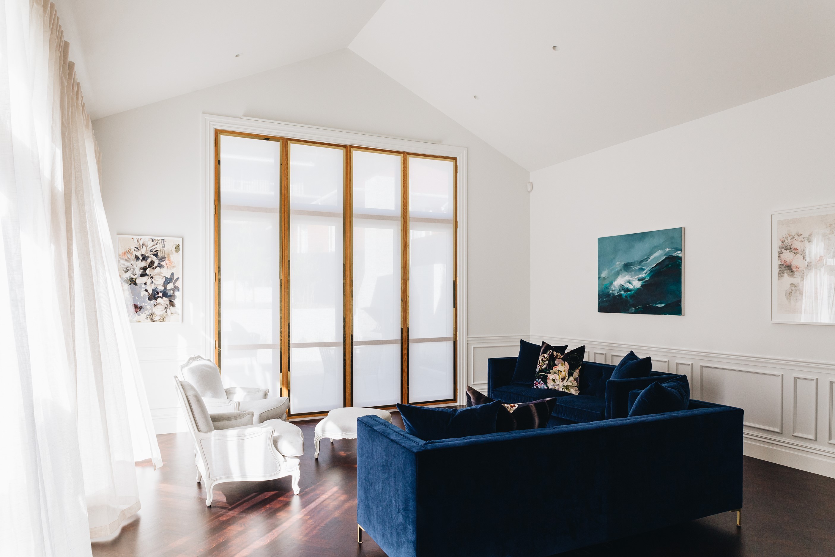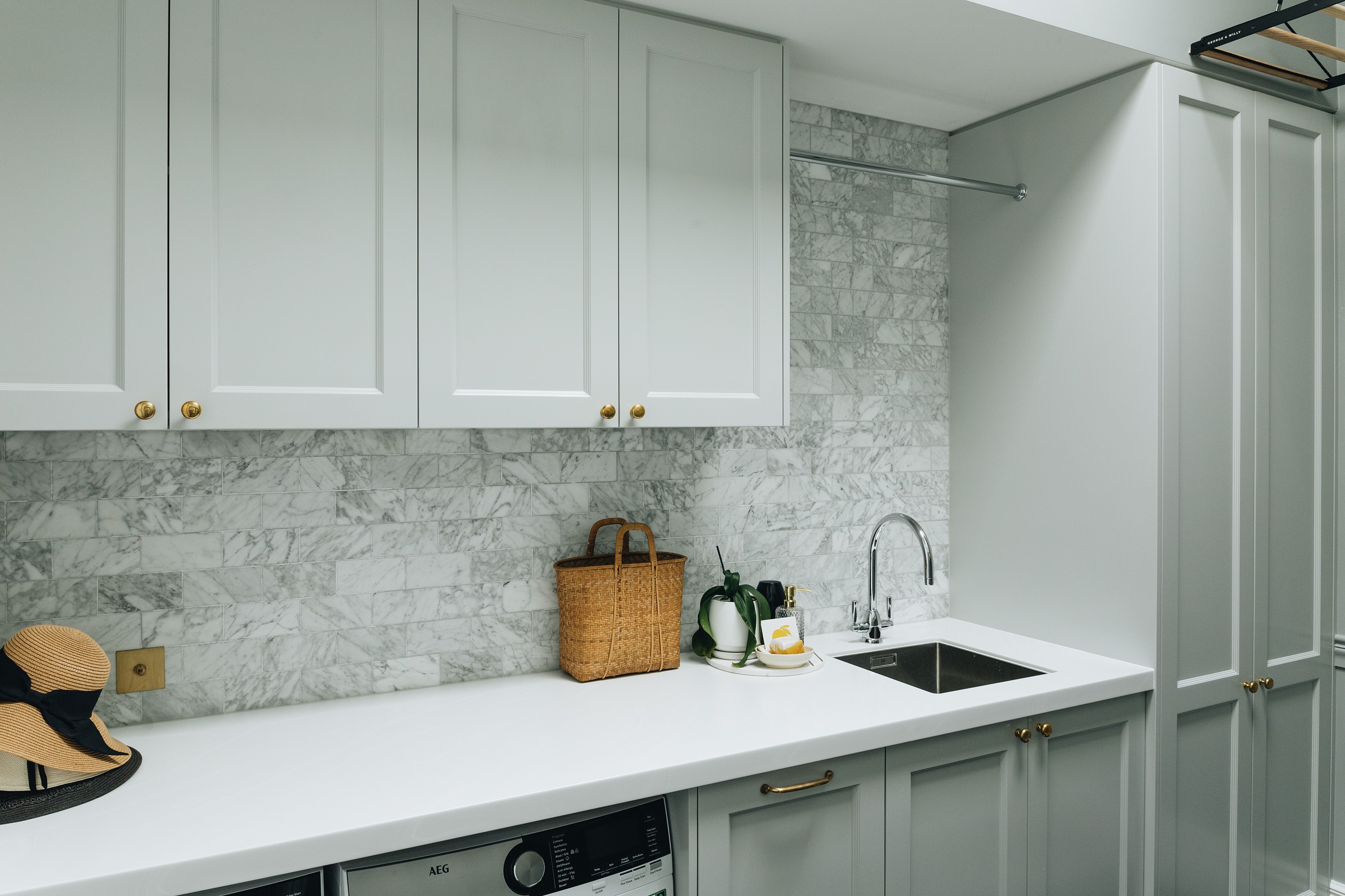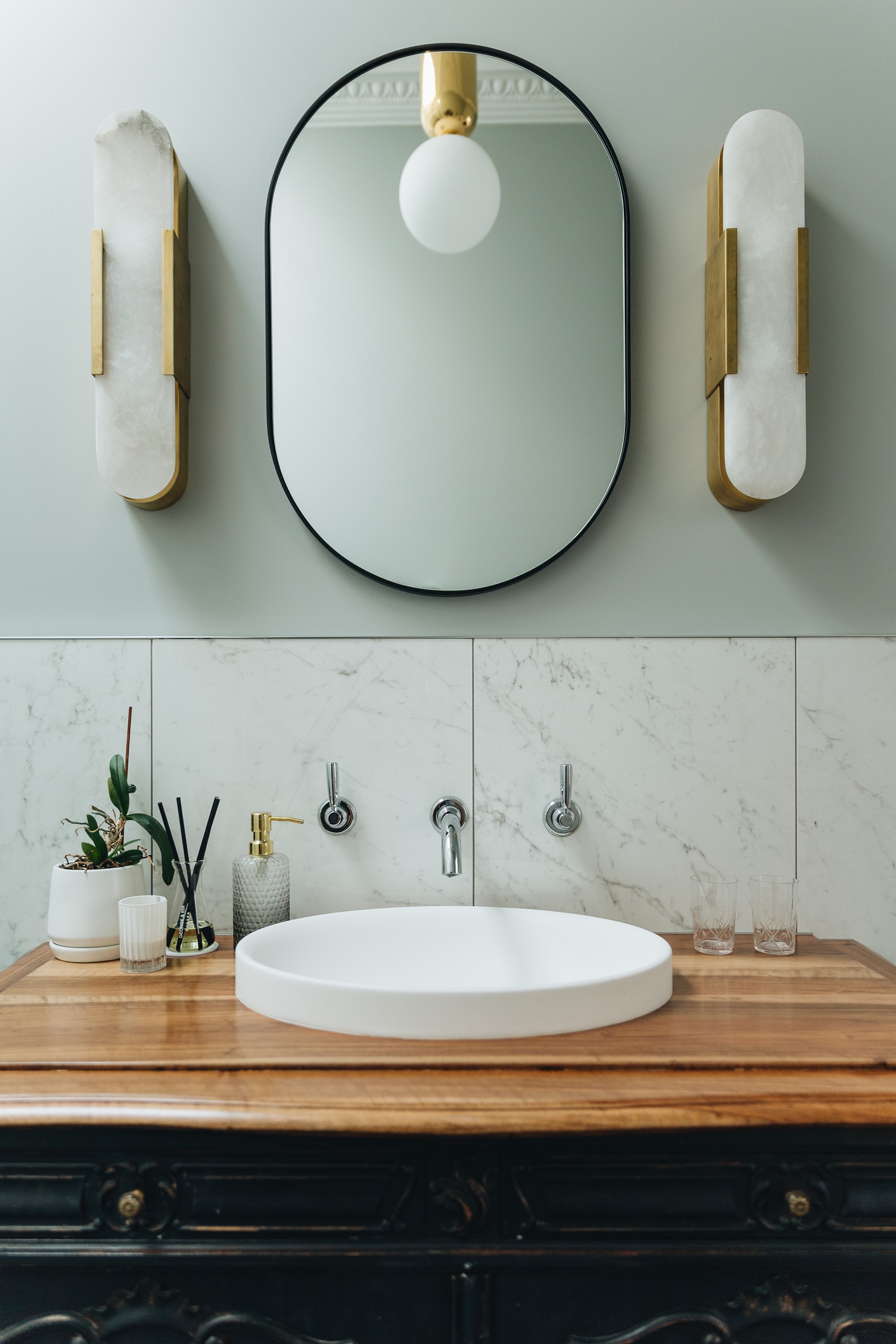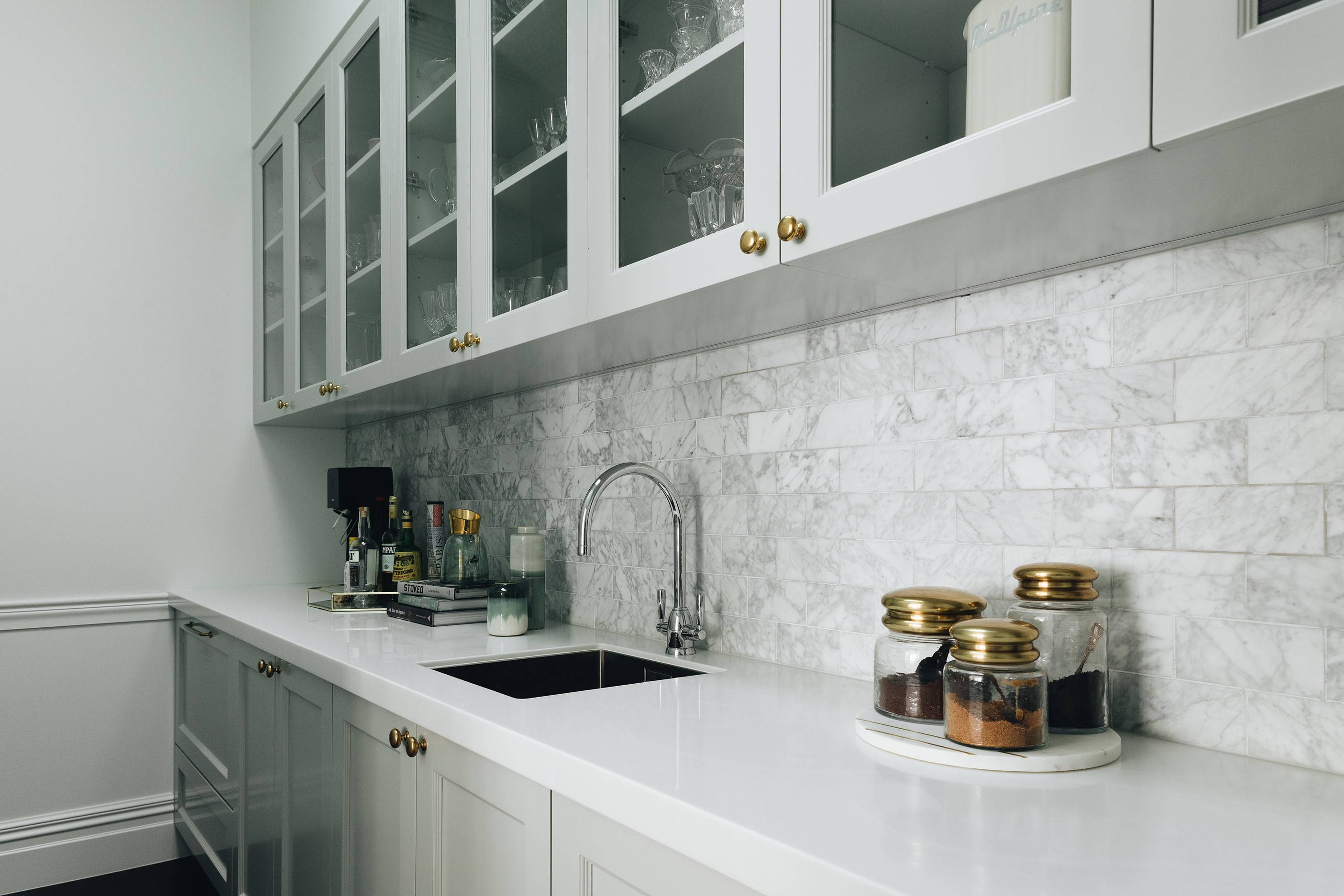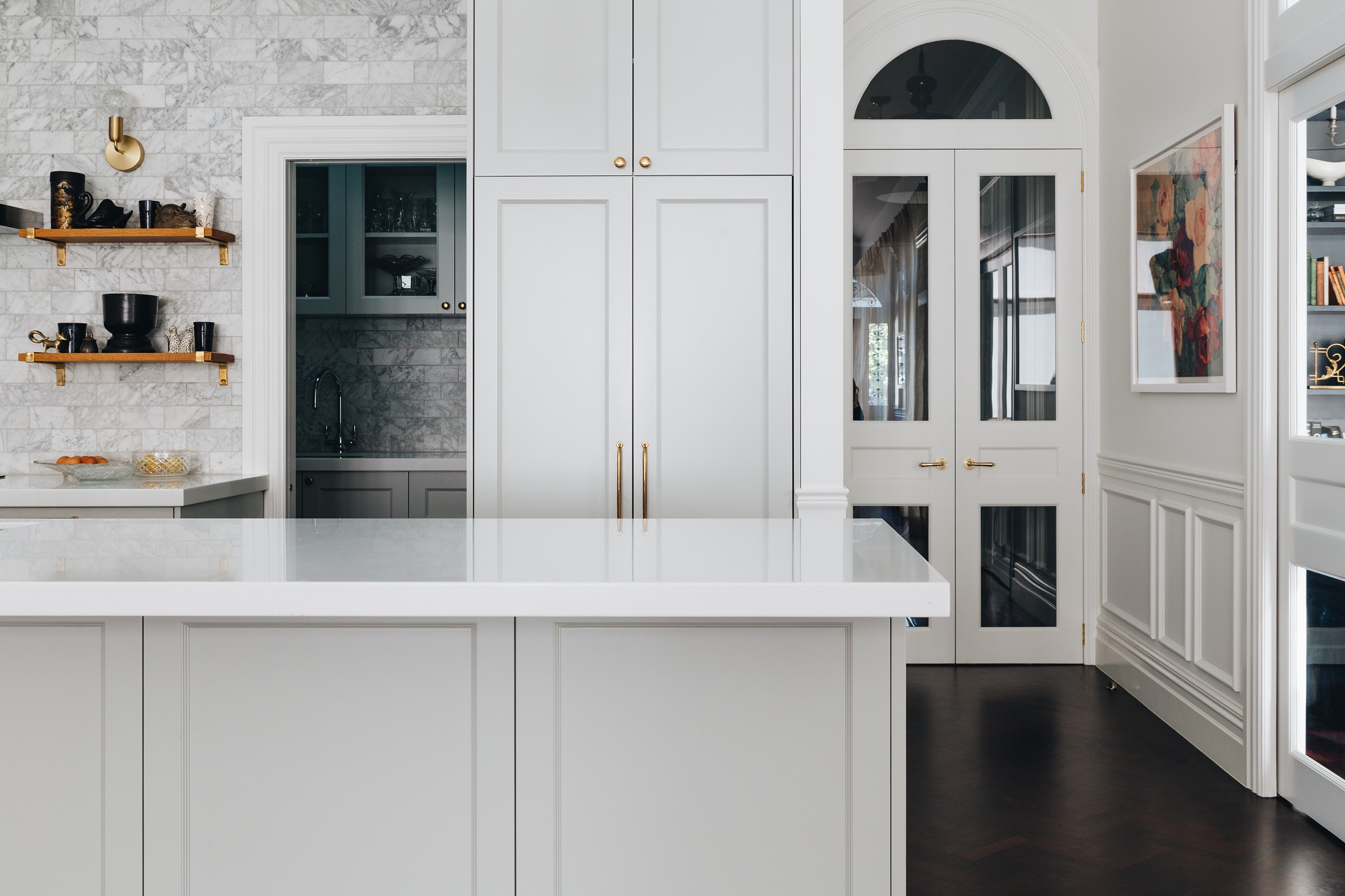 The high-performance Skylit kitchen has a deliberate vintage French feel. It repeats the panelling of the hallway for cohesion, while the sleek, white Corian benchtop, butler’s pantry, integrated appliances and marble tiles work together to make a space in which most people would be thrilled to cook a Sunday roast. The same sympathetic renovation can be seen in the bathrooms. Large, marble-look tiles line the lower half of the walls and are juxtaposed alongside dark herringbone floor tiles. The antique sideboard was sourced from France and transformed into a bespoke vanity. If it didn’t already have it, this villa now has that je ne sais quoi.