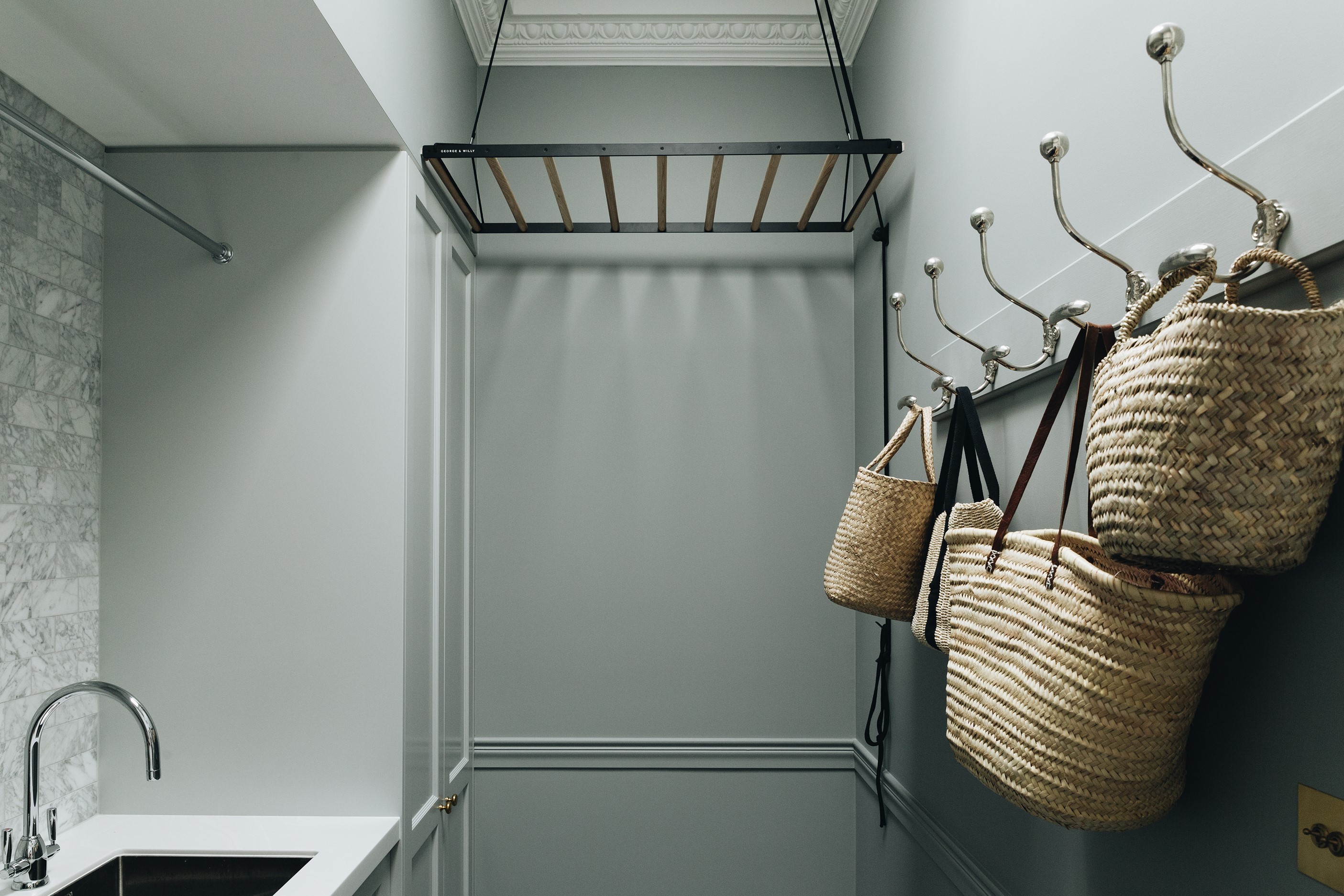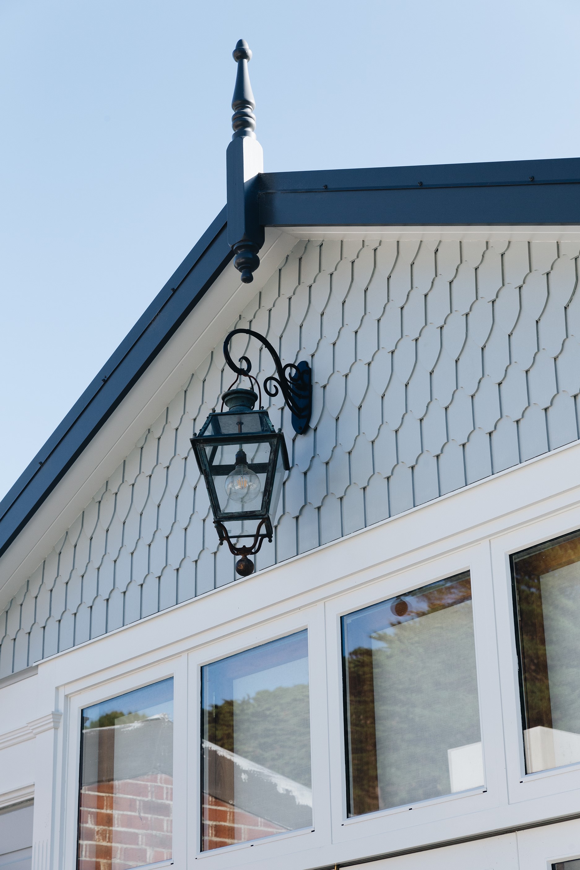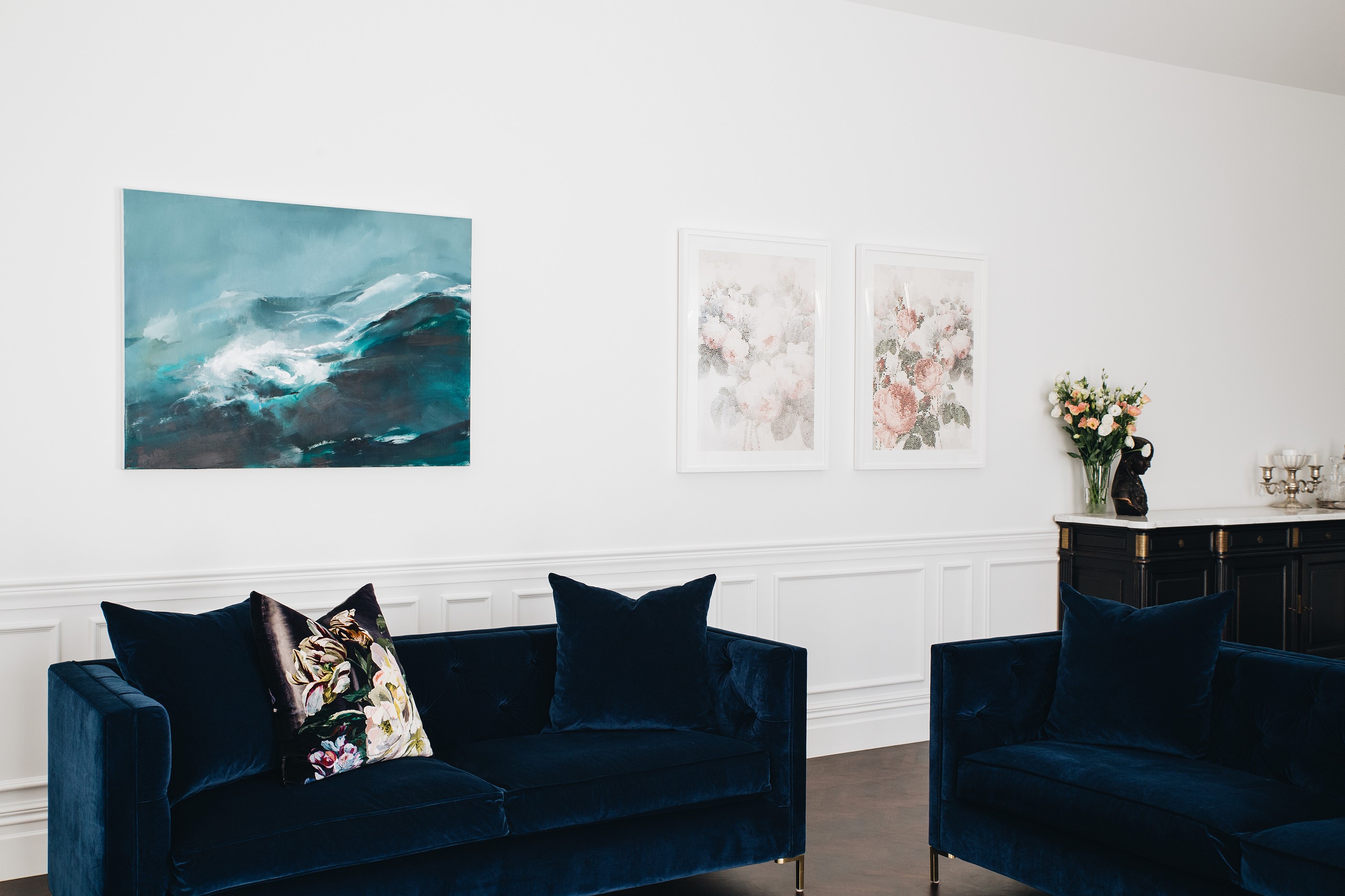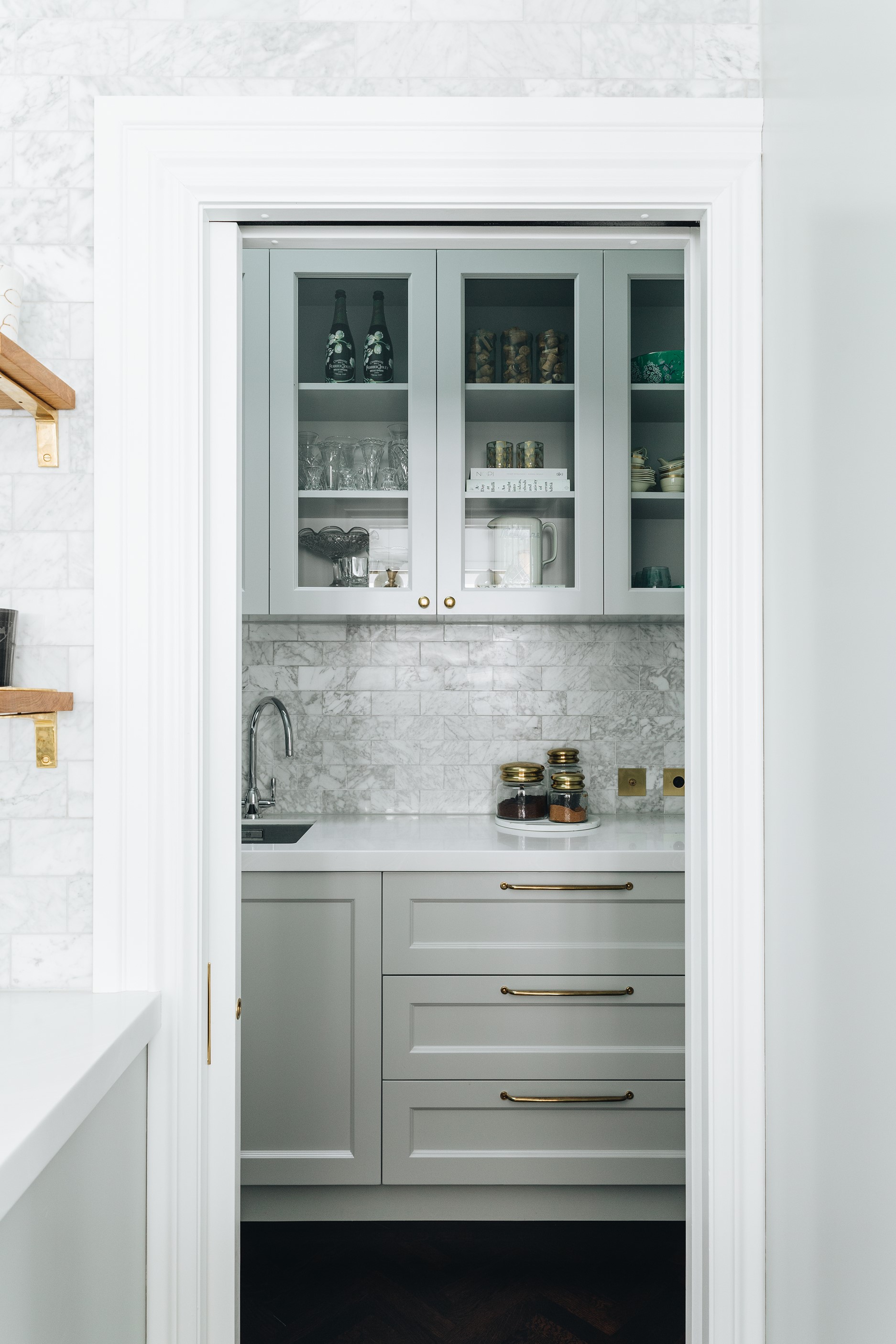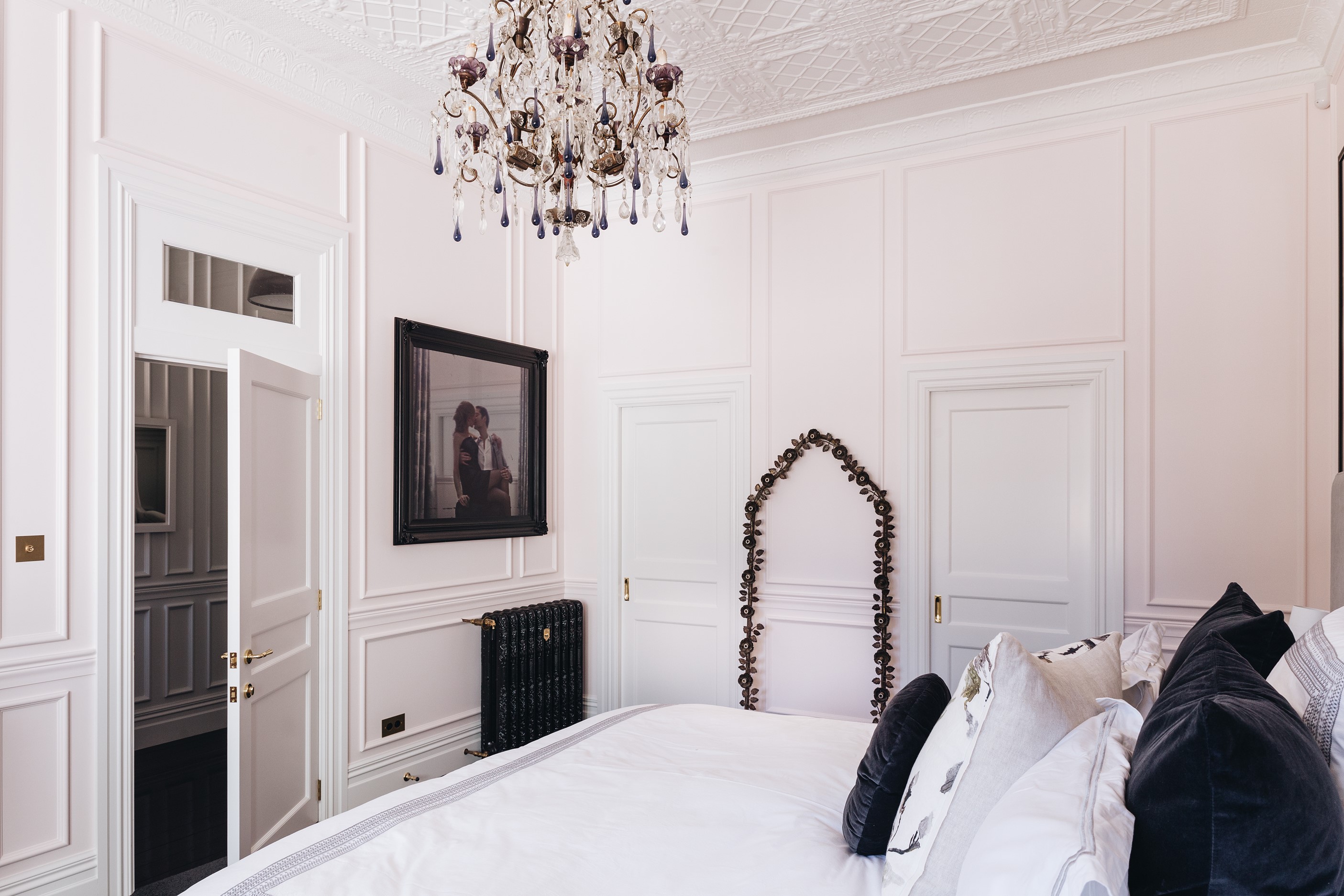 The high-performance Skylit kitchen has a deliberate vintage French feel. It repeats the panelling of the hallway for cohesion, while the sleek, white Corian benchtop, butler’s pantry, integrated appliances and marble tiles work together to make a space in which most people would be thrilled to cook a Sunday roast. The same sympathetic renovation can be seen in the bathrooms. Large, marble-look tiles line the lower half of the walls and are juxtaposed alongside dark herringbone floor tiles. The antique sideboard was sourced from France and transformed into a bespoke vanity. If it didn’t already have it, this villa now has that je ne sais quoi.