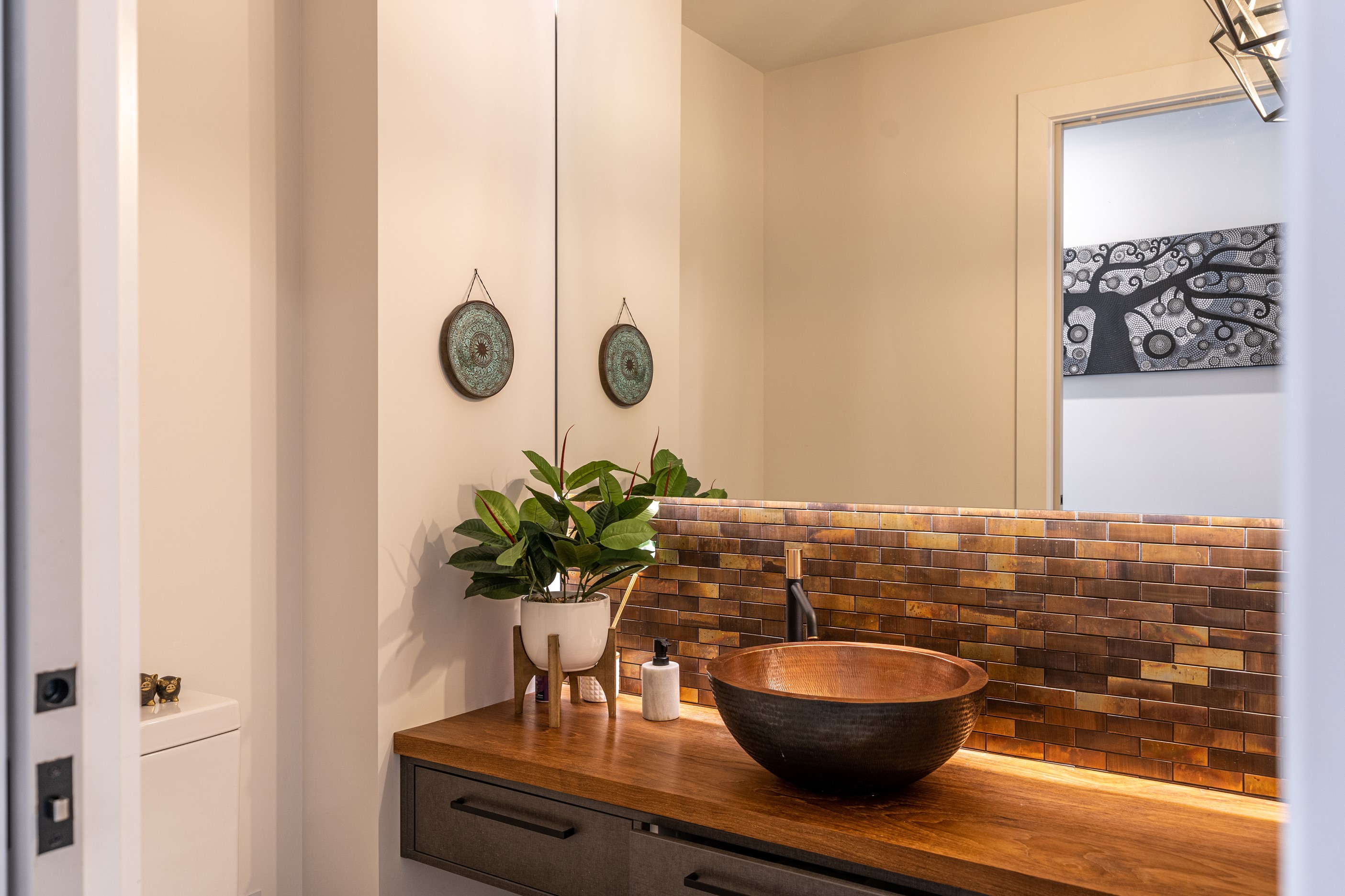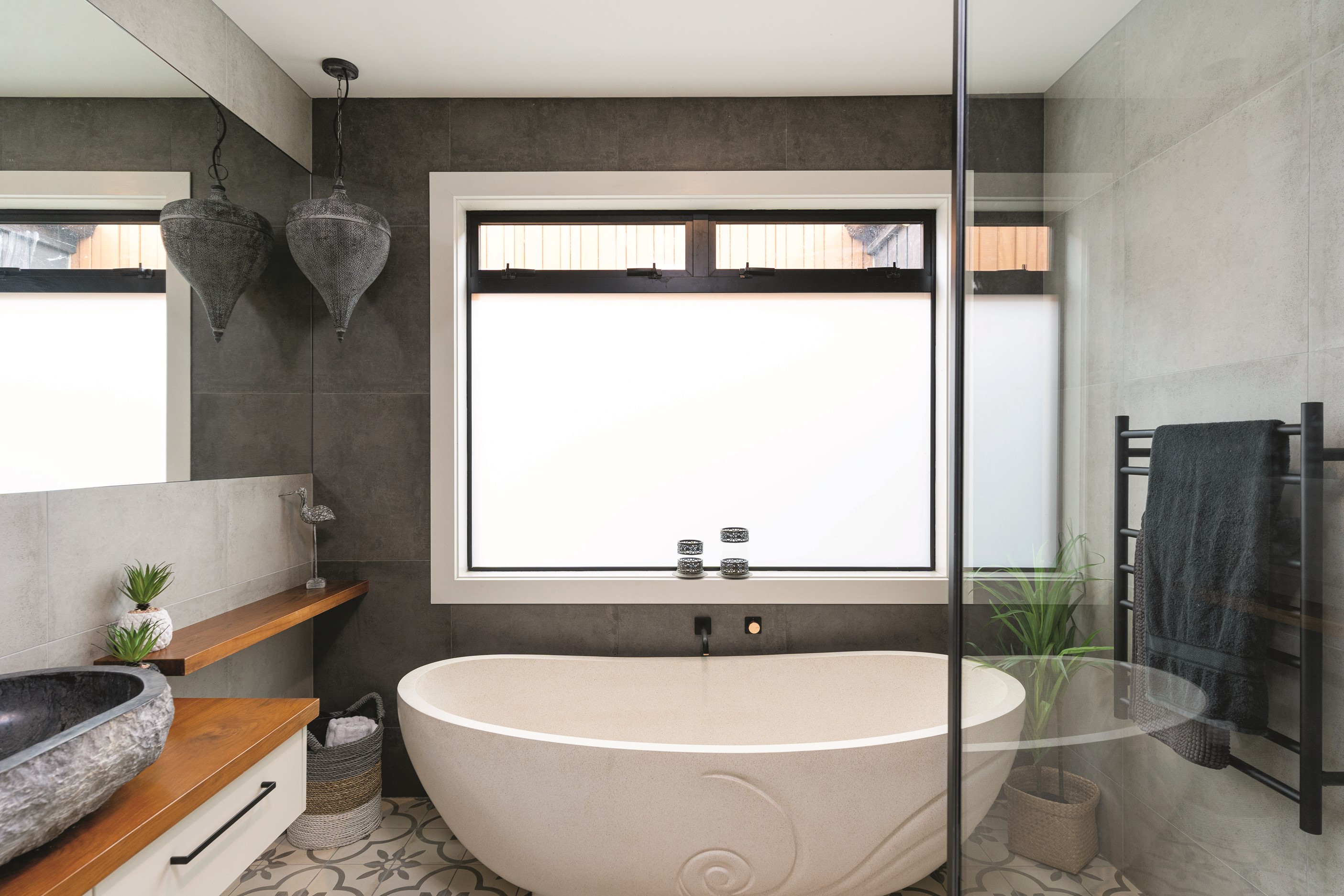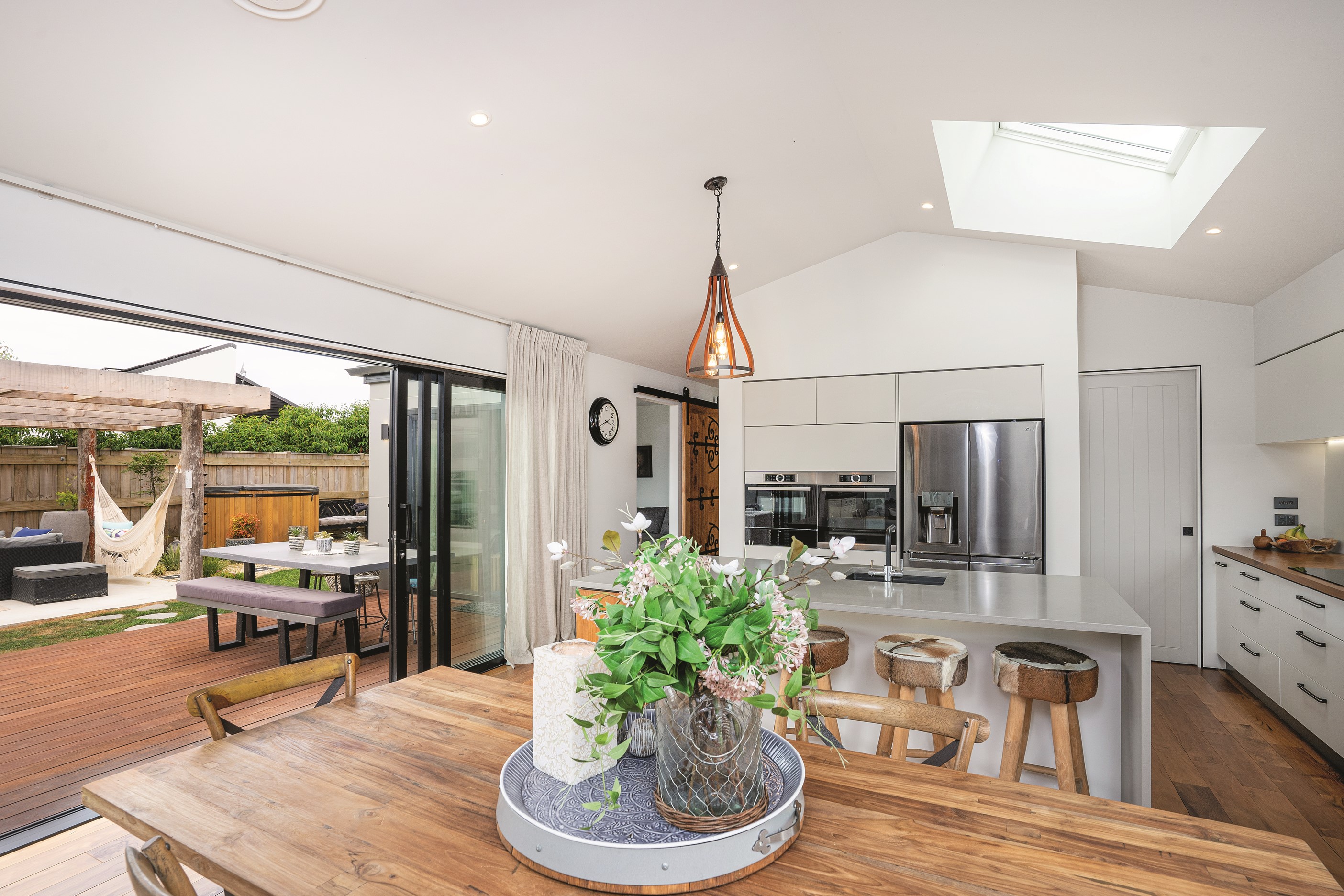 A modern Euro-style kitchen with the latest appliances, gas hot water and tempered glass splashback reward the efforts of the cooks. Skylights offer natural illumination together with full-length stackers that encourage indoor-outdoor flow. Wet-floor bathrooms with handmade tiles, full-height glass panels in the showers, tiled niches and bespoke vanities and basins make the bathrooms a pleasure to be in – just like the rest of the home.