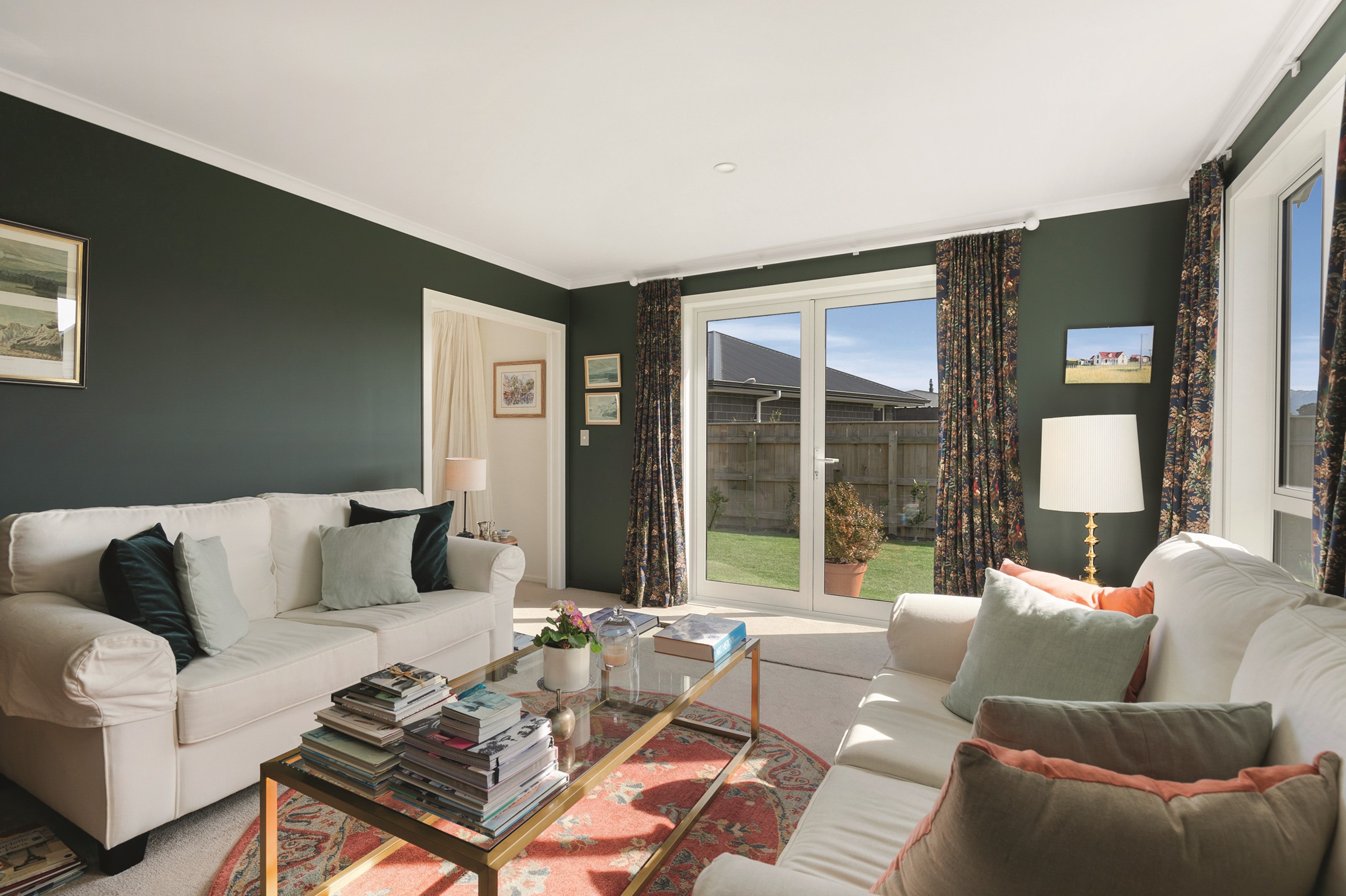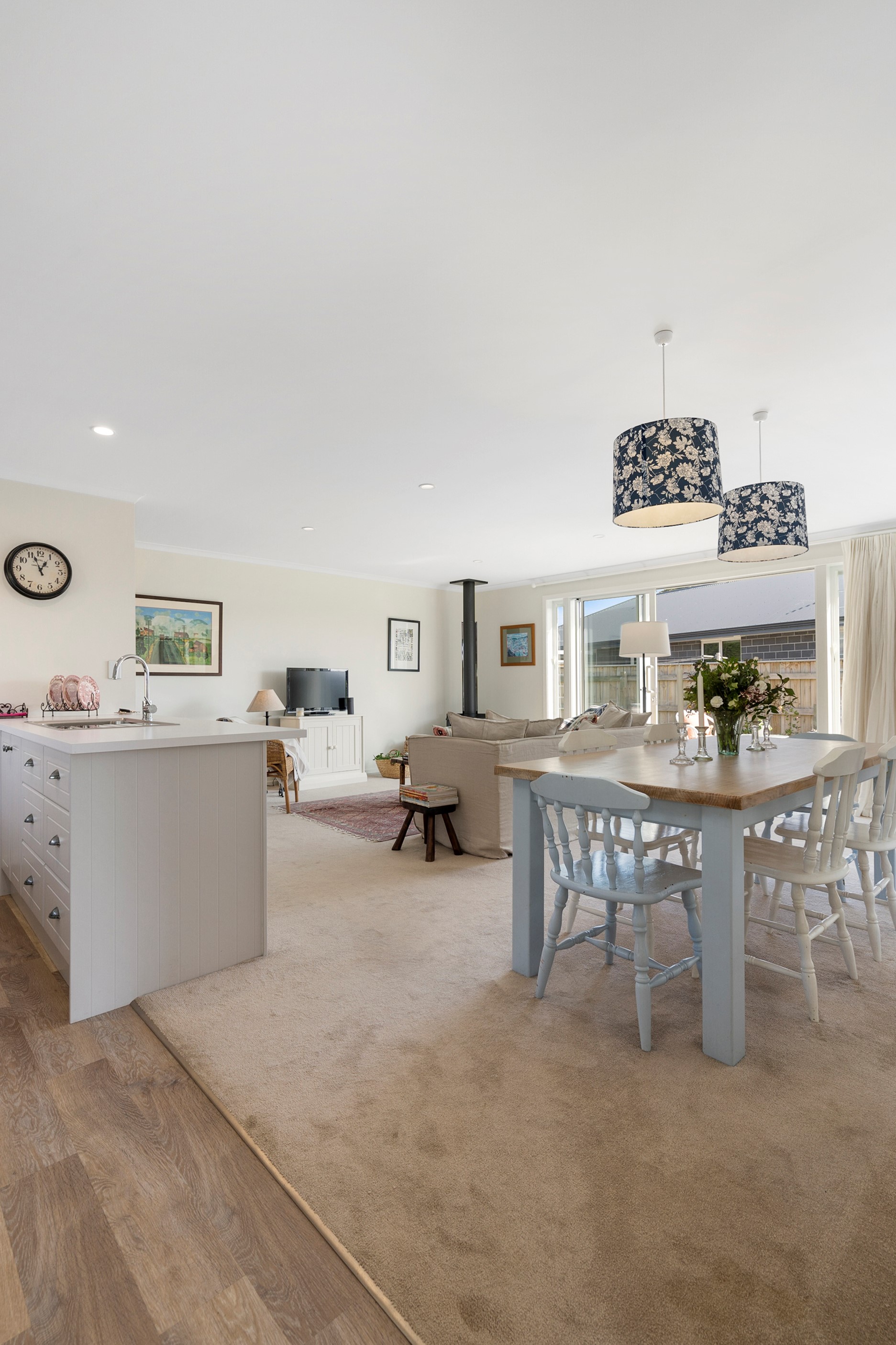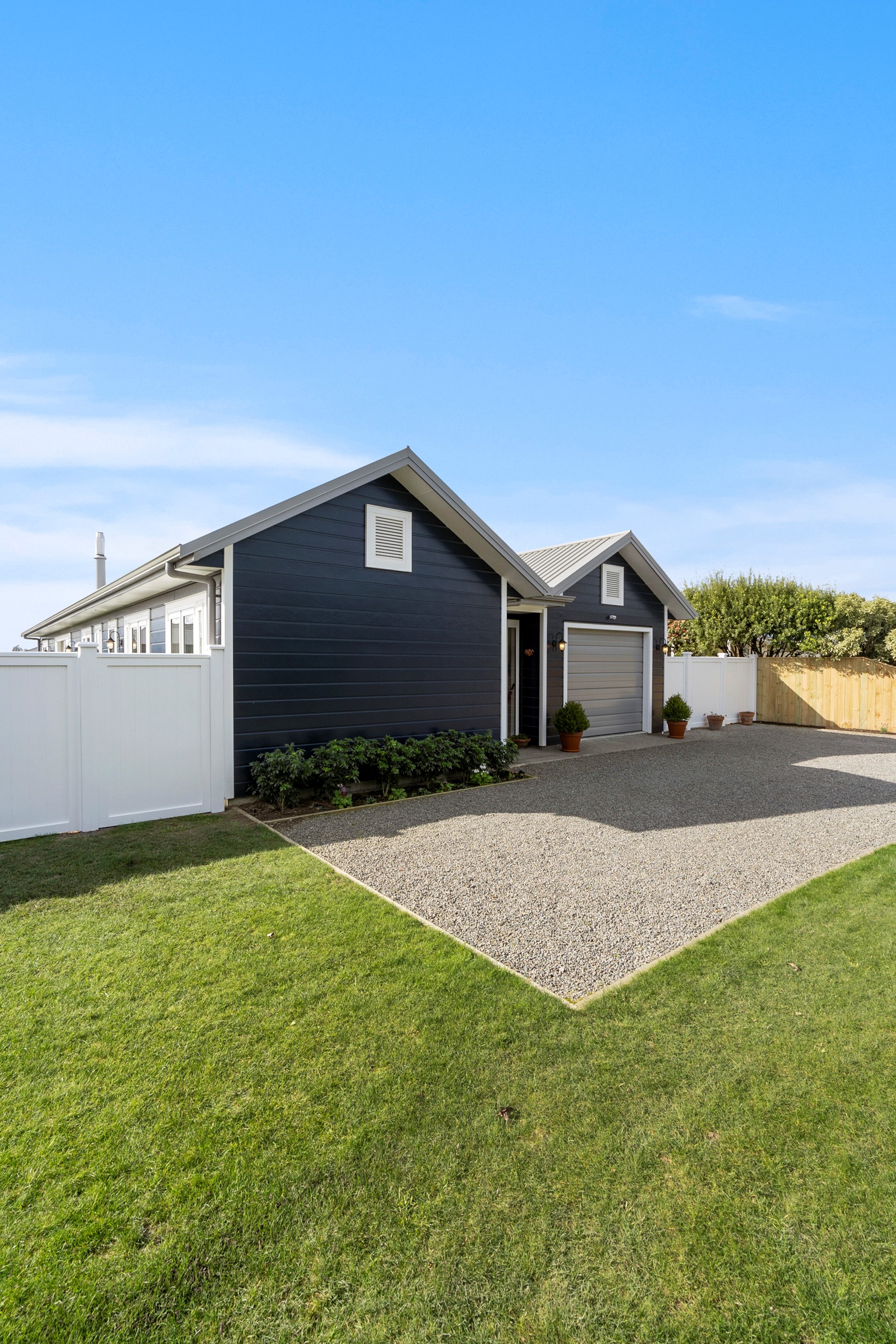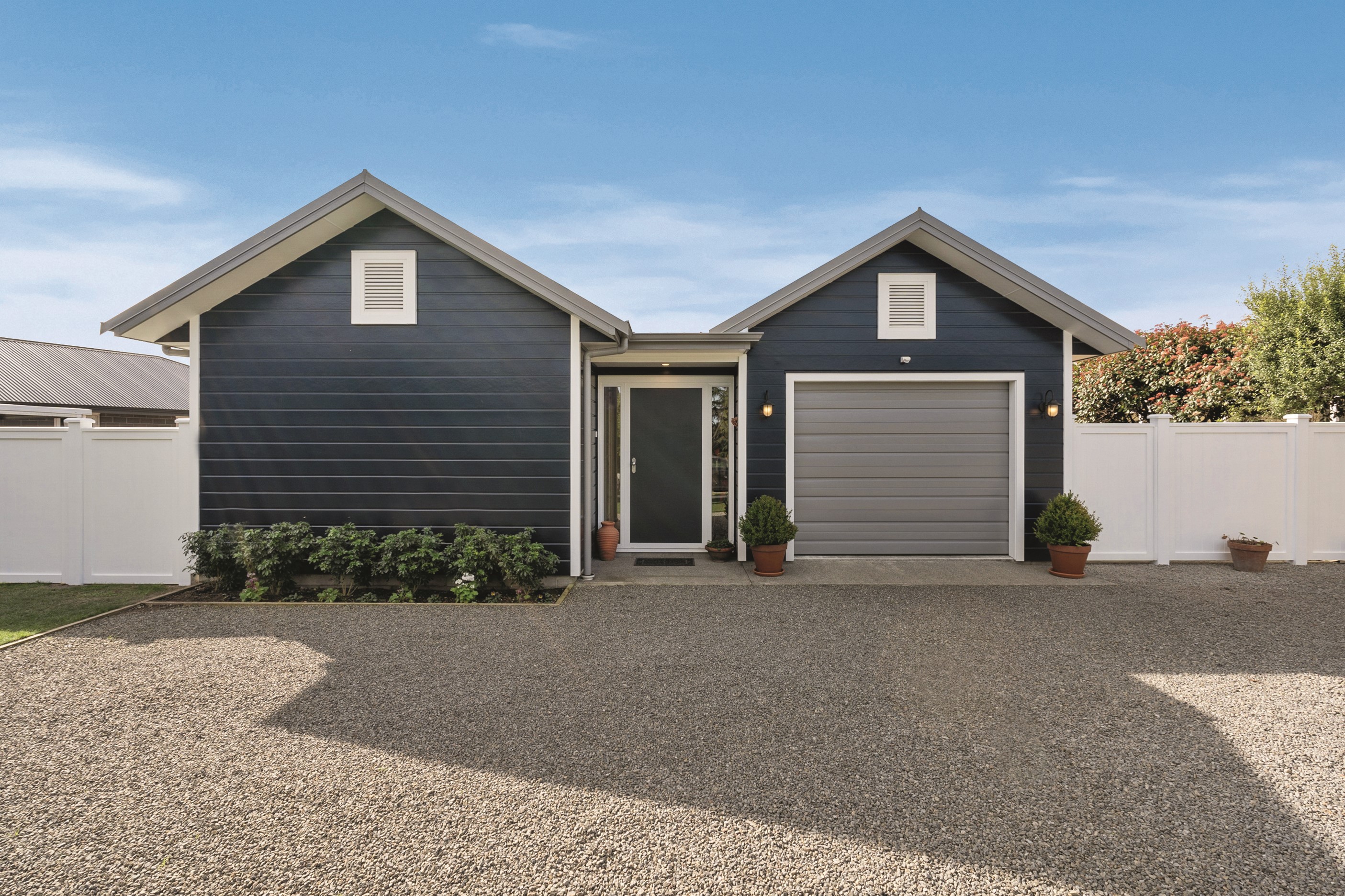 A touch of country charm with comfortable modern details, this Masterton new build represents two styles that really make the heart sing. From its inviting entryway between two gabled peaks, a wide hall continues past all three bedrooms and two bathrooms, entering into a bright, open-plan living and kitchen area. Thermal-wrapped kitchen cabinetry brings its Shaker style into the kitchen, tying in with the home’s tongue-and-groove panelling.