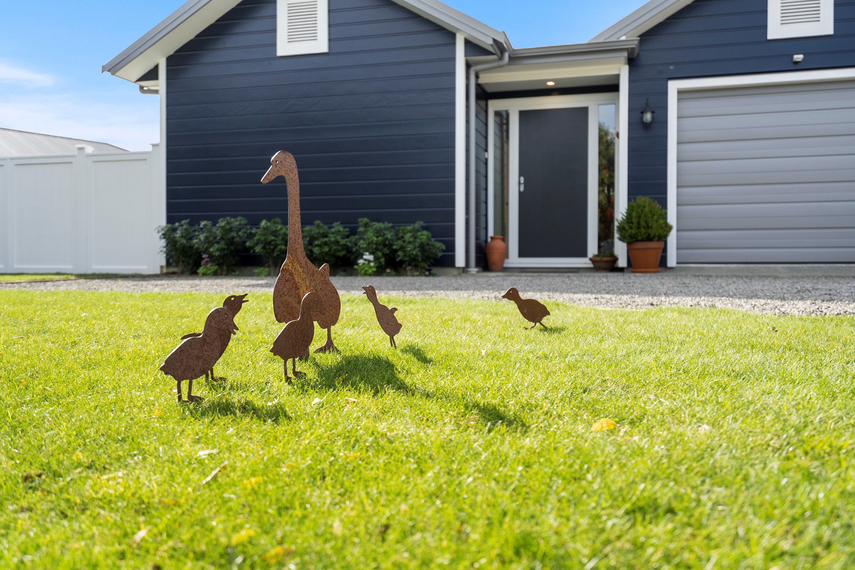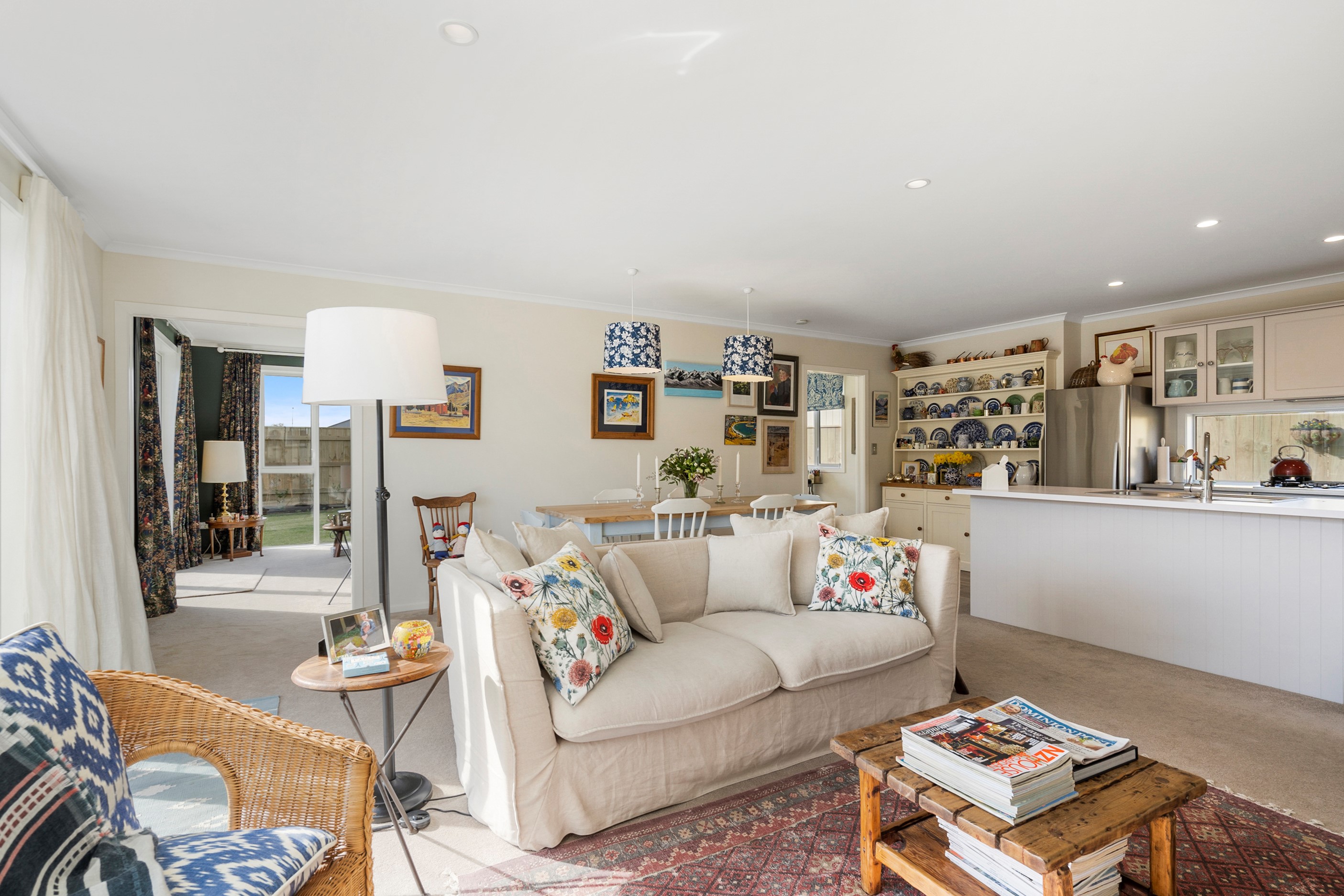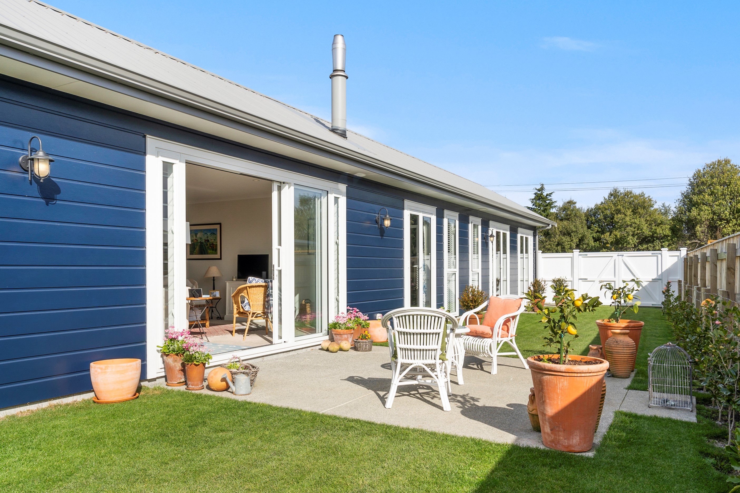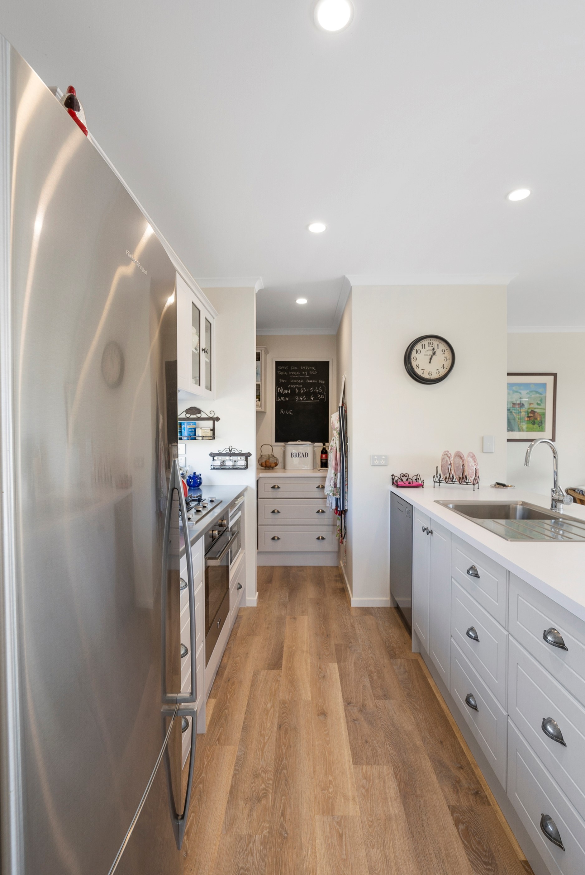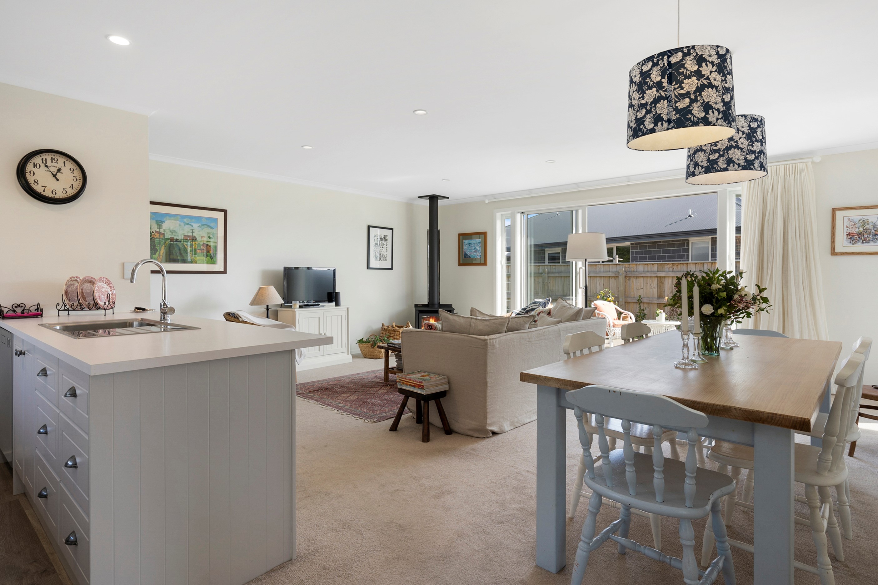 A touch of country charm with comfortable modern details, this Masterton new build represents two styles that really make the heart sing. From its inviting entryway between two gabled peaks, a wide hall continues past all three bedrooms and two bathrooms, entering into a bright, open-plan living and kitchen area. Thermal-wrapped kitchen cabinetry brings its Shaker style into the kitchen, tying in with the home’s tongue-and-groove panelling.
