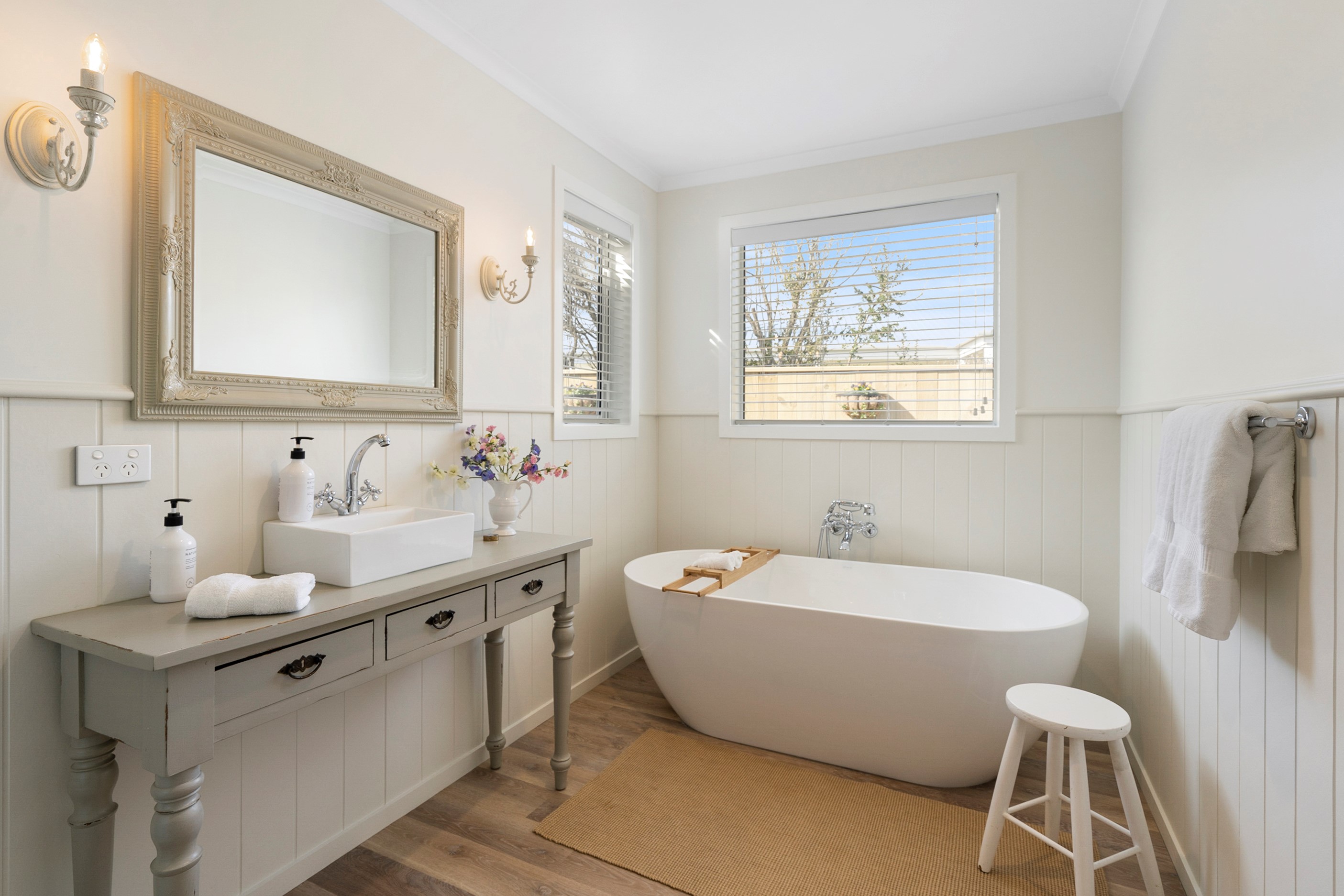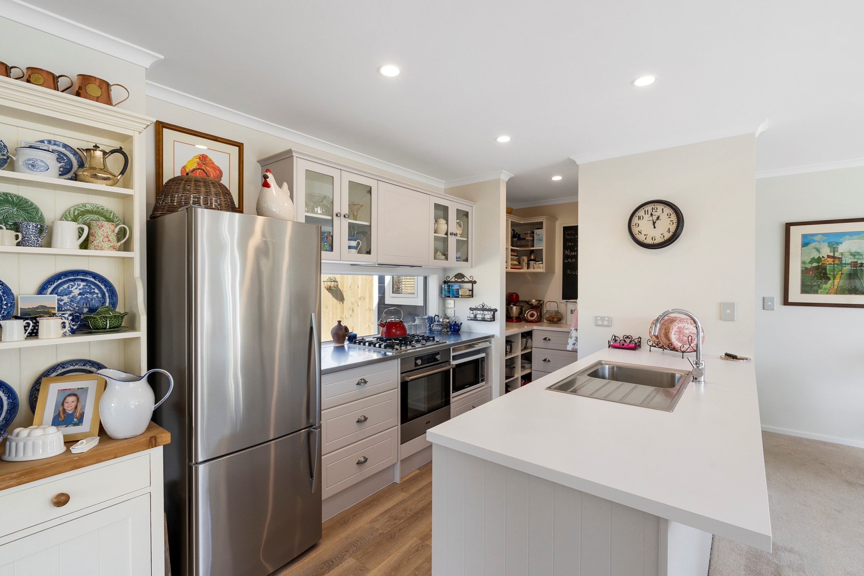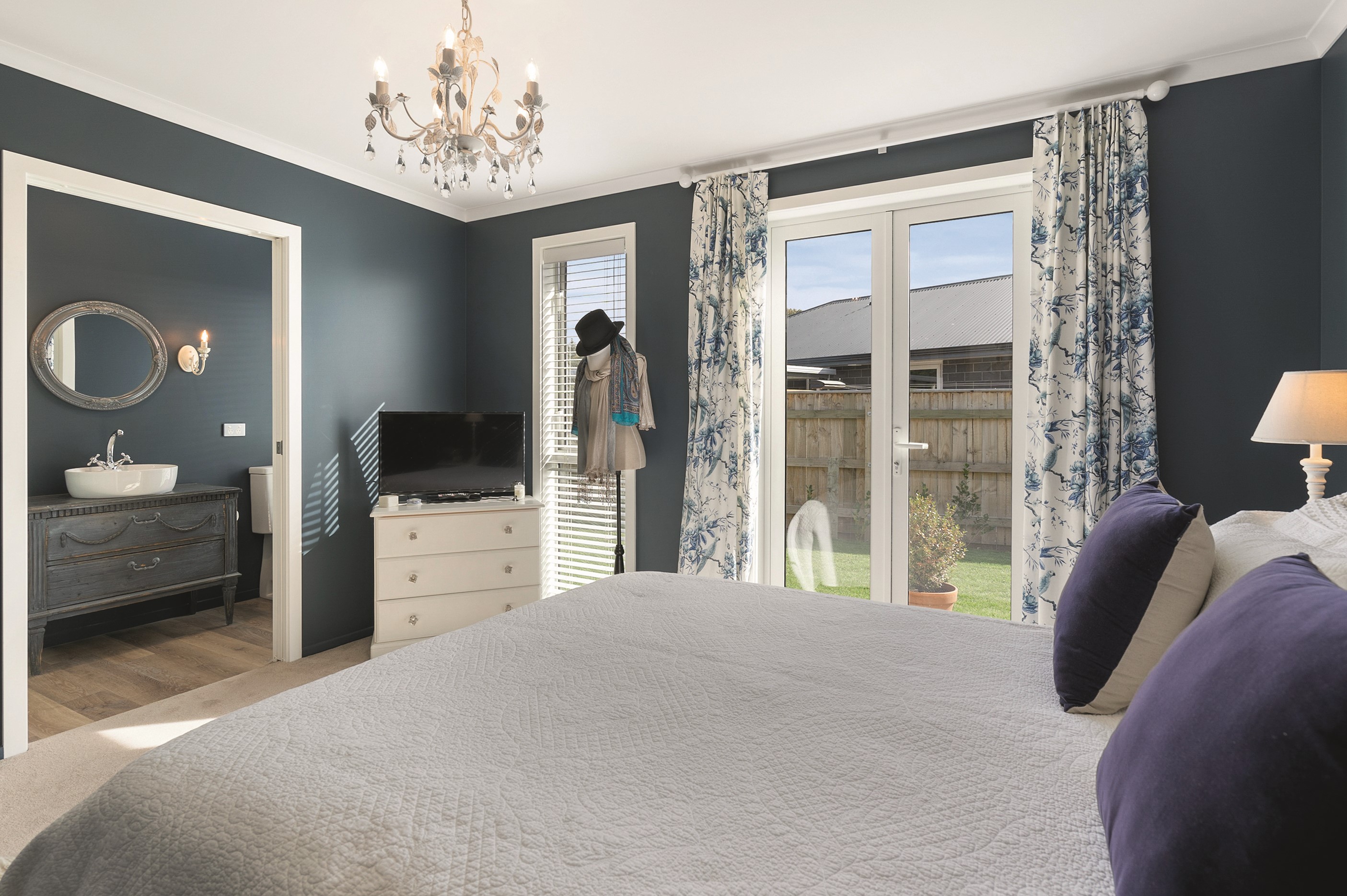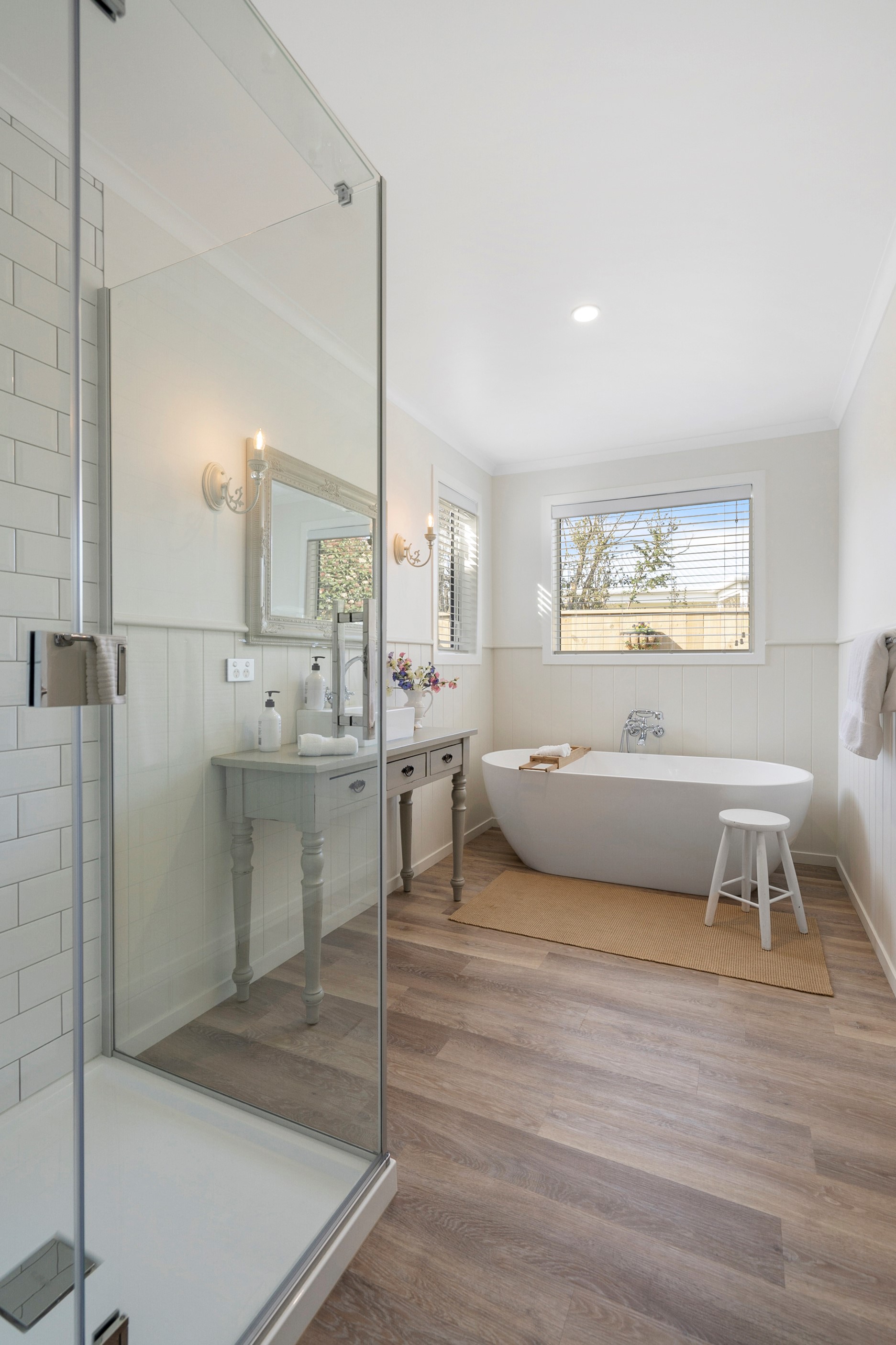 Beyond the living area, the ‘whisky lounge’ and office-come-art studio are fun creative spaces. French doors open from the bedrooms onto concrete pads – perfect for enjoying a coffee in the sunshine. Tongue-and-groove wall panelling and window blinds bring charm to the main bathroom. The Athena Cassini bath, tiled shower, unique vanity, ornate mirror and light fittings, and colonial-style tapware also make this space shine. Soothing, country-inspired wall colours allow the interior to feel homely. With its soft palette and modern fittings, this dwelling brings a traditional style into the present day.