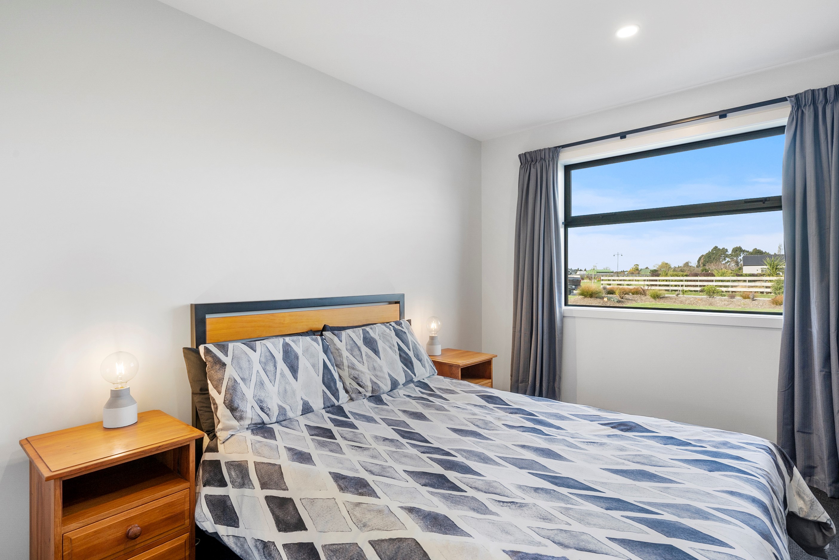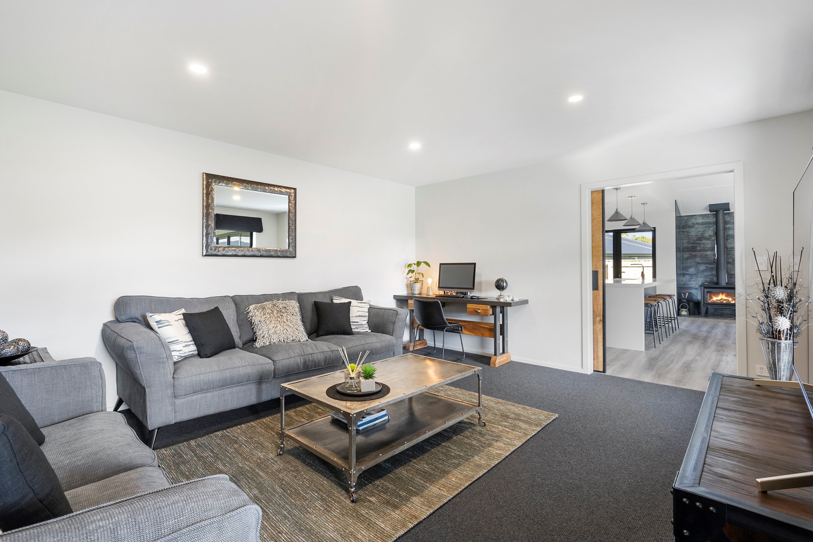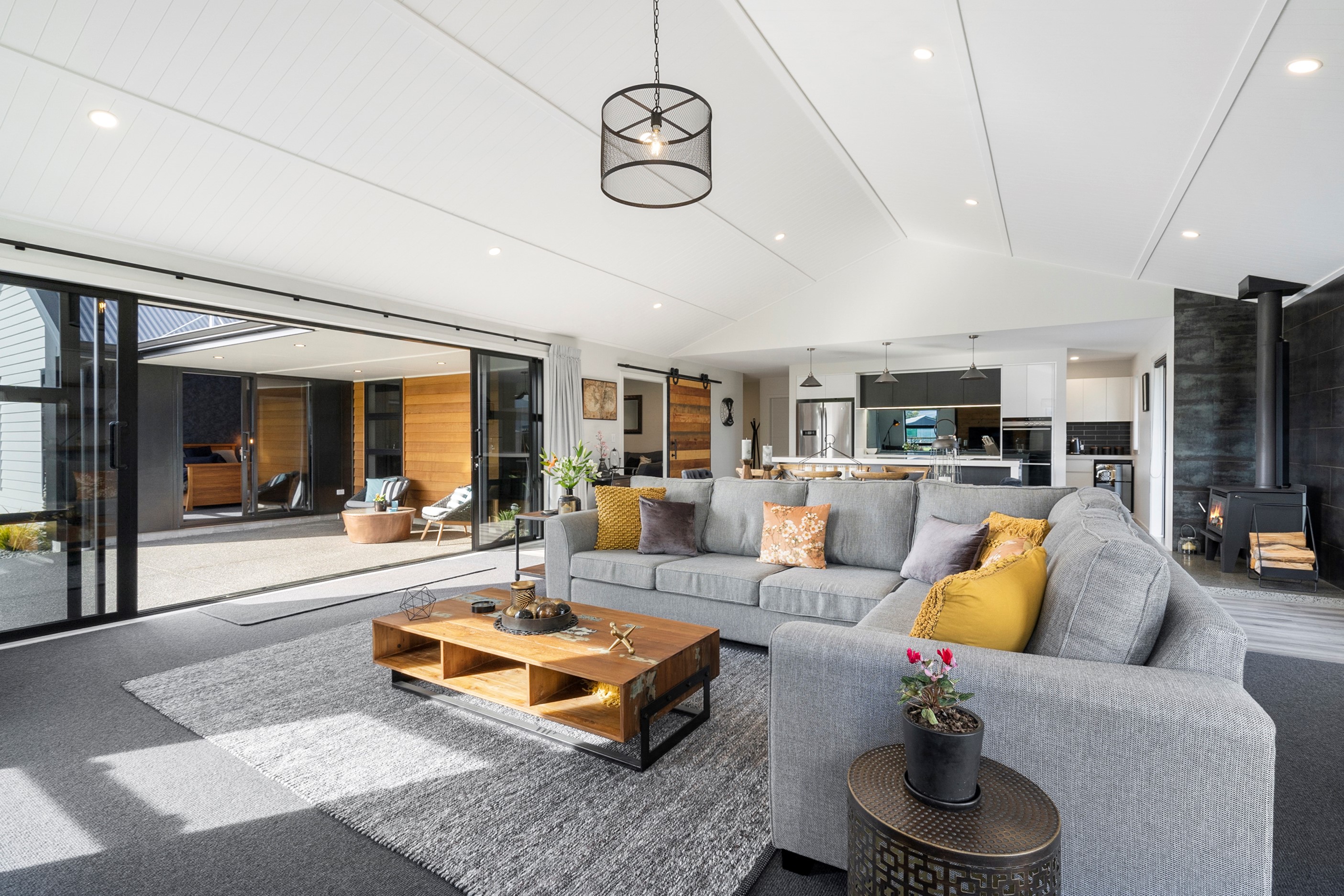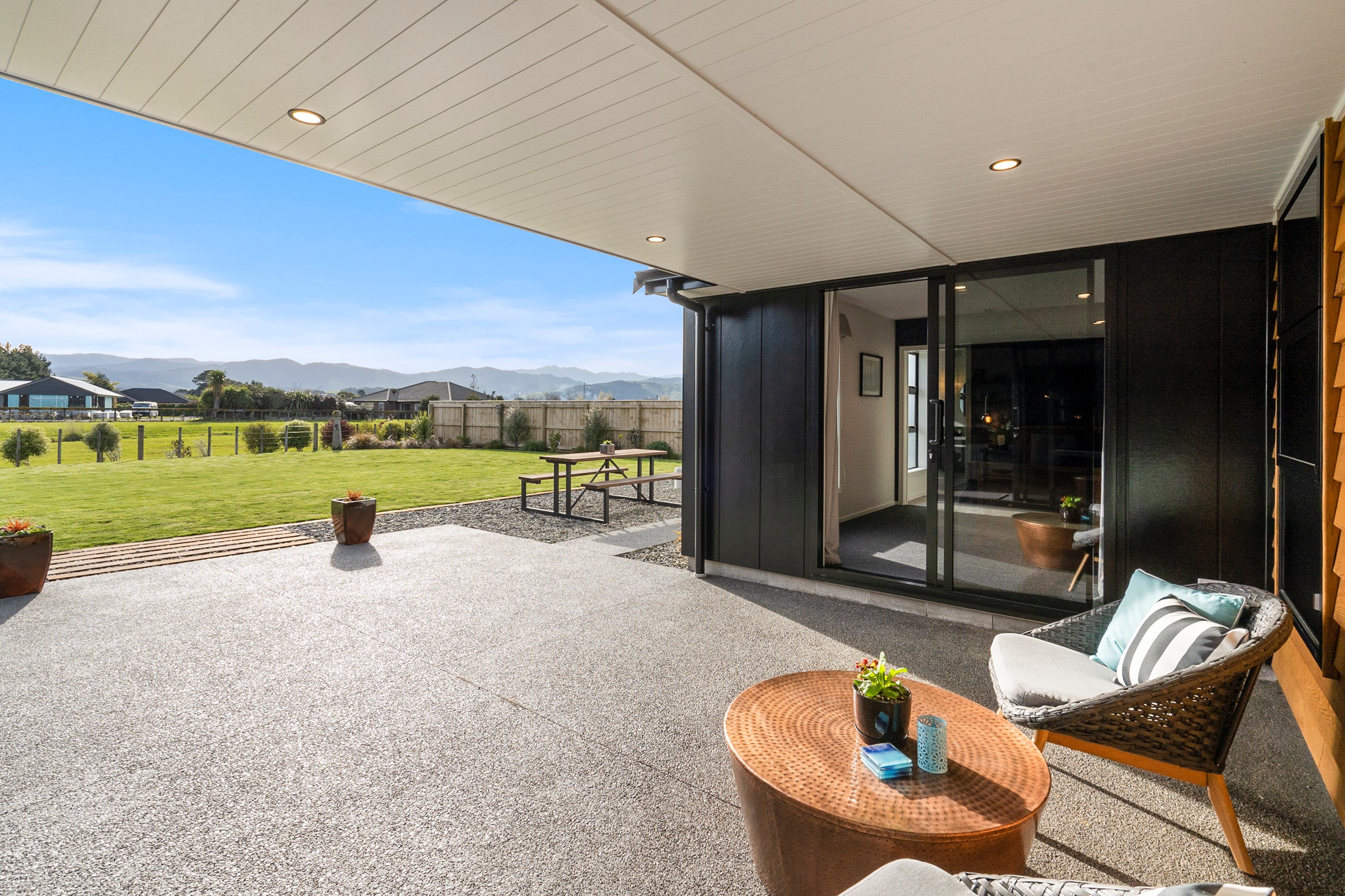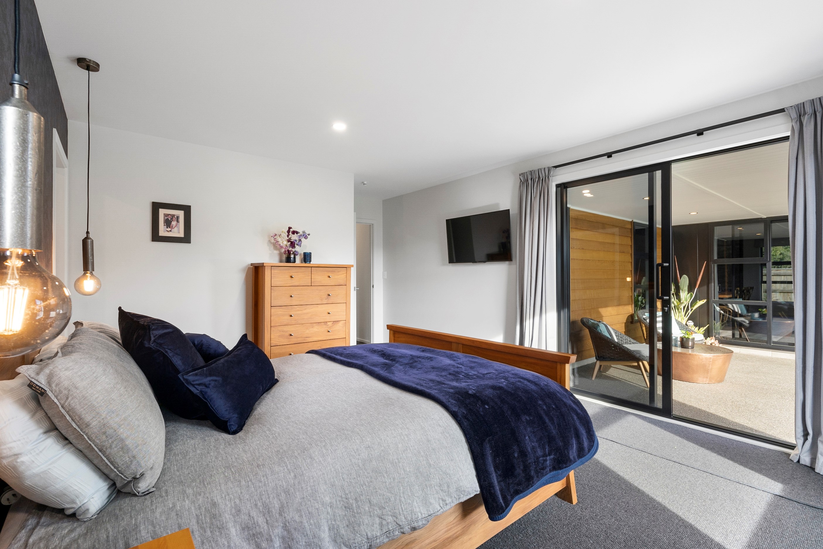 In the kitchen you’ll find an engineered stone benchtop, mirrored glass splashback and glossy cabinetry with high-tech hardware. A cathedral ceiling in the main living room and large sliding doors to the outdoor living area give a sense of grandeur and space. Once you’re outside, the feeling is just as good. There’s a seamless indoor-outdoor flow from the living area and views of the Tararua Range.