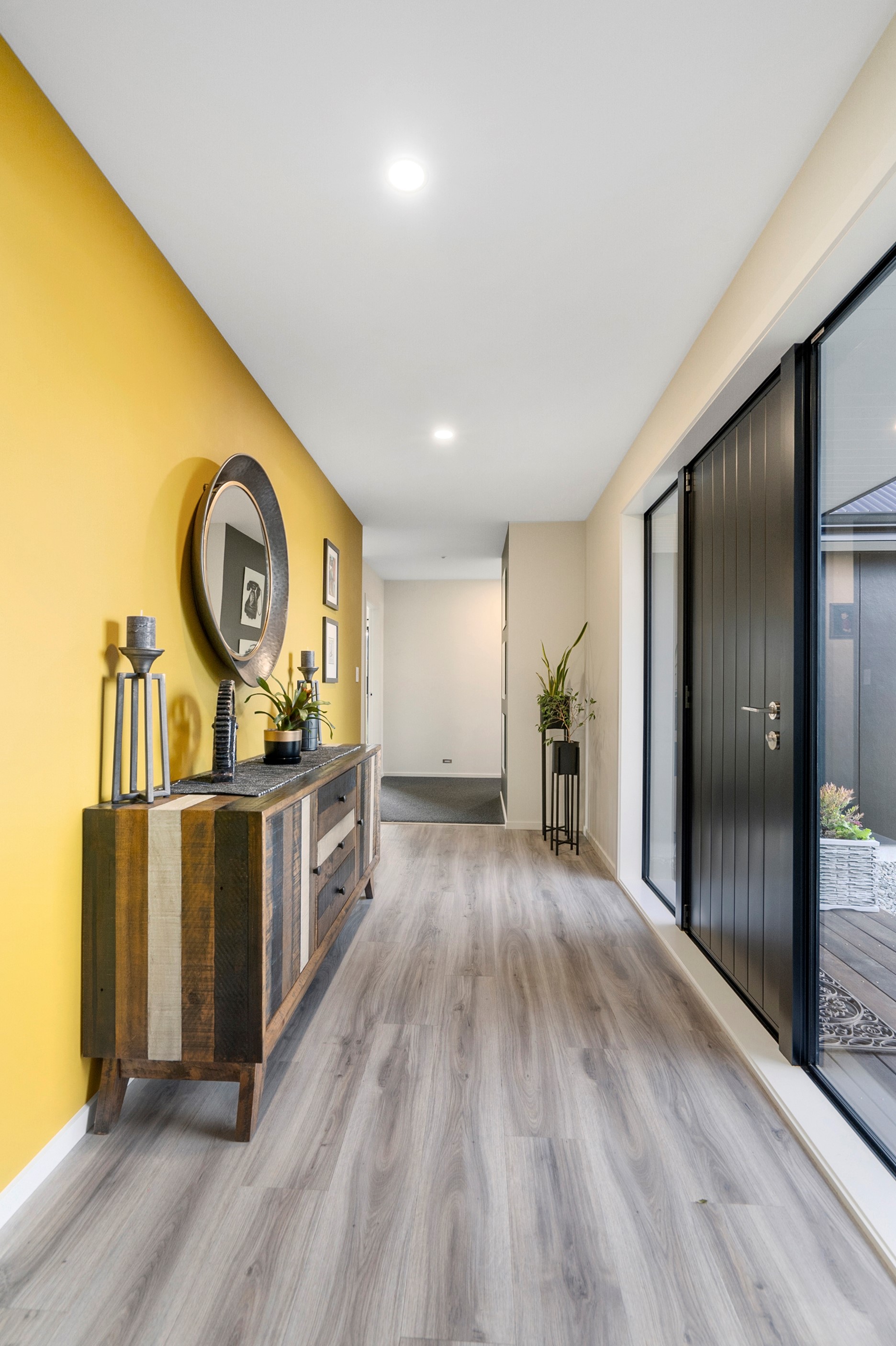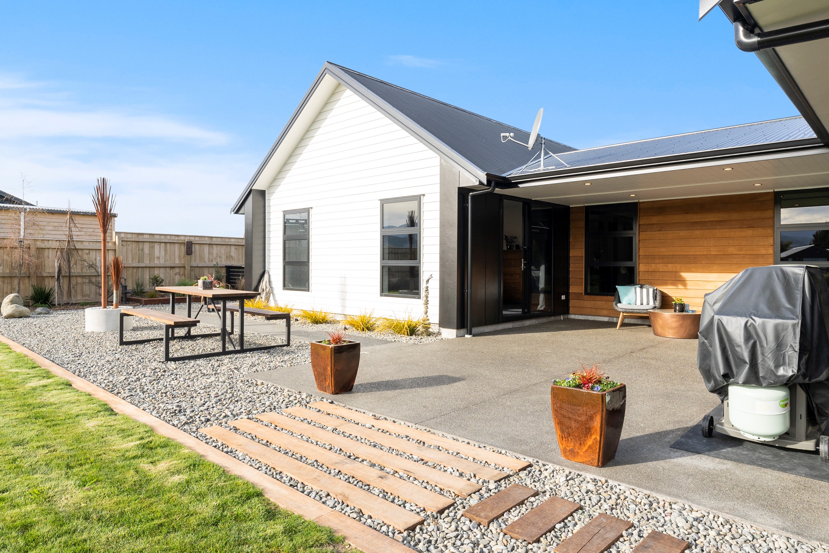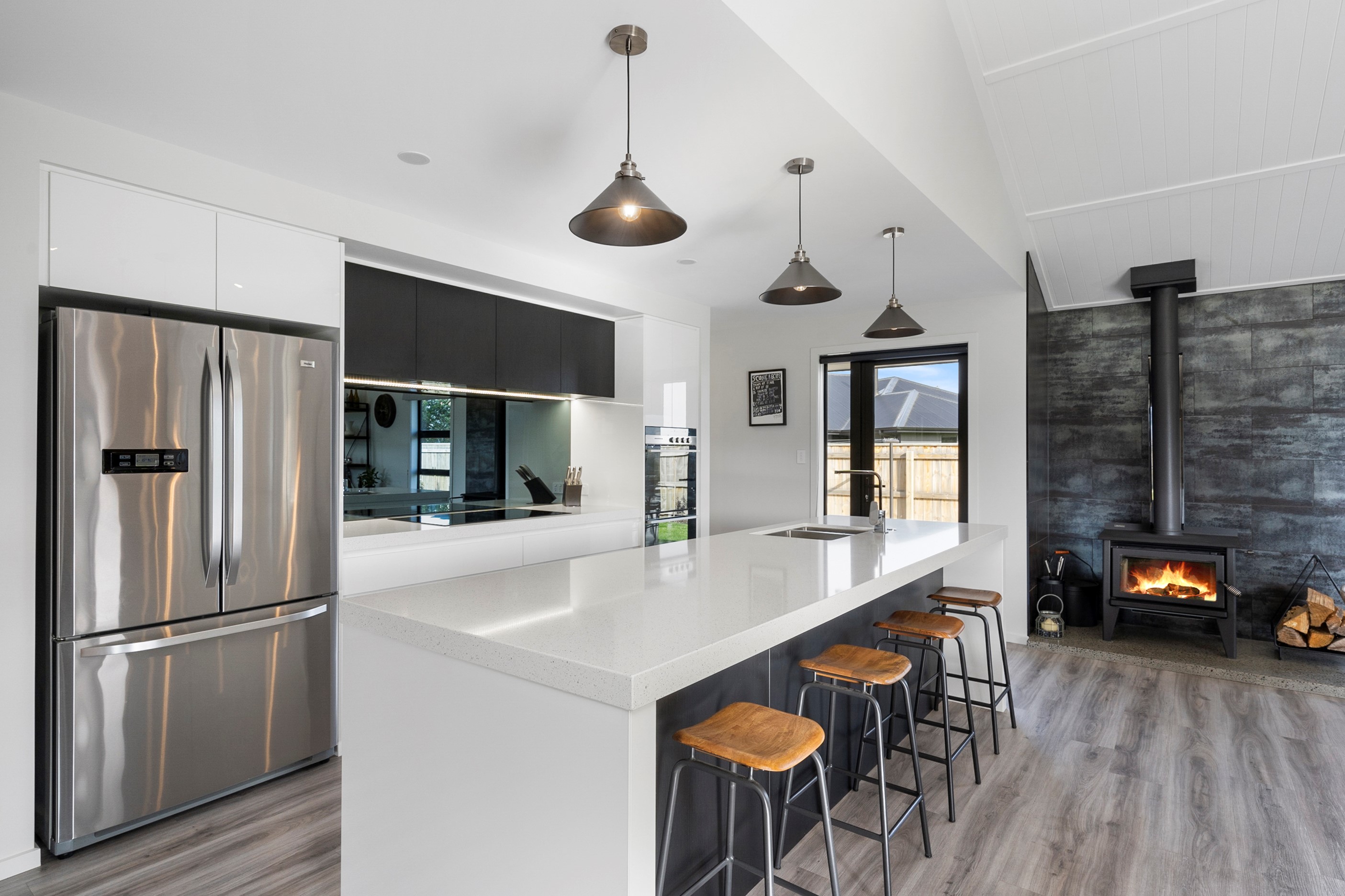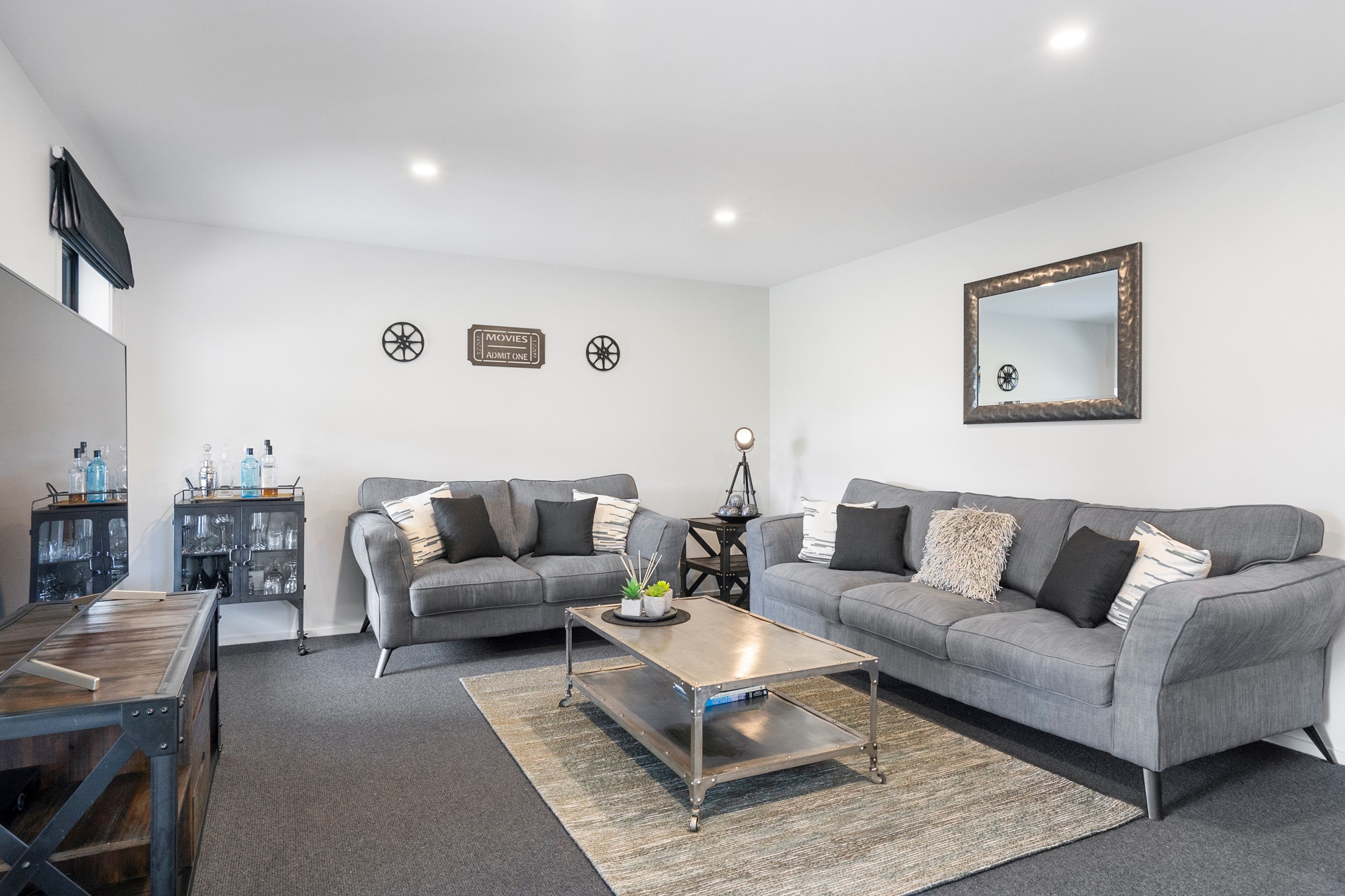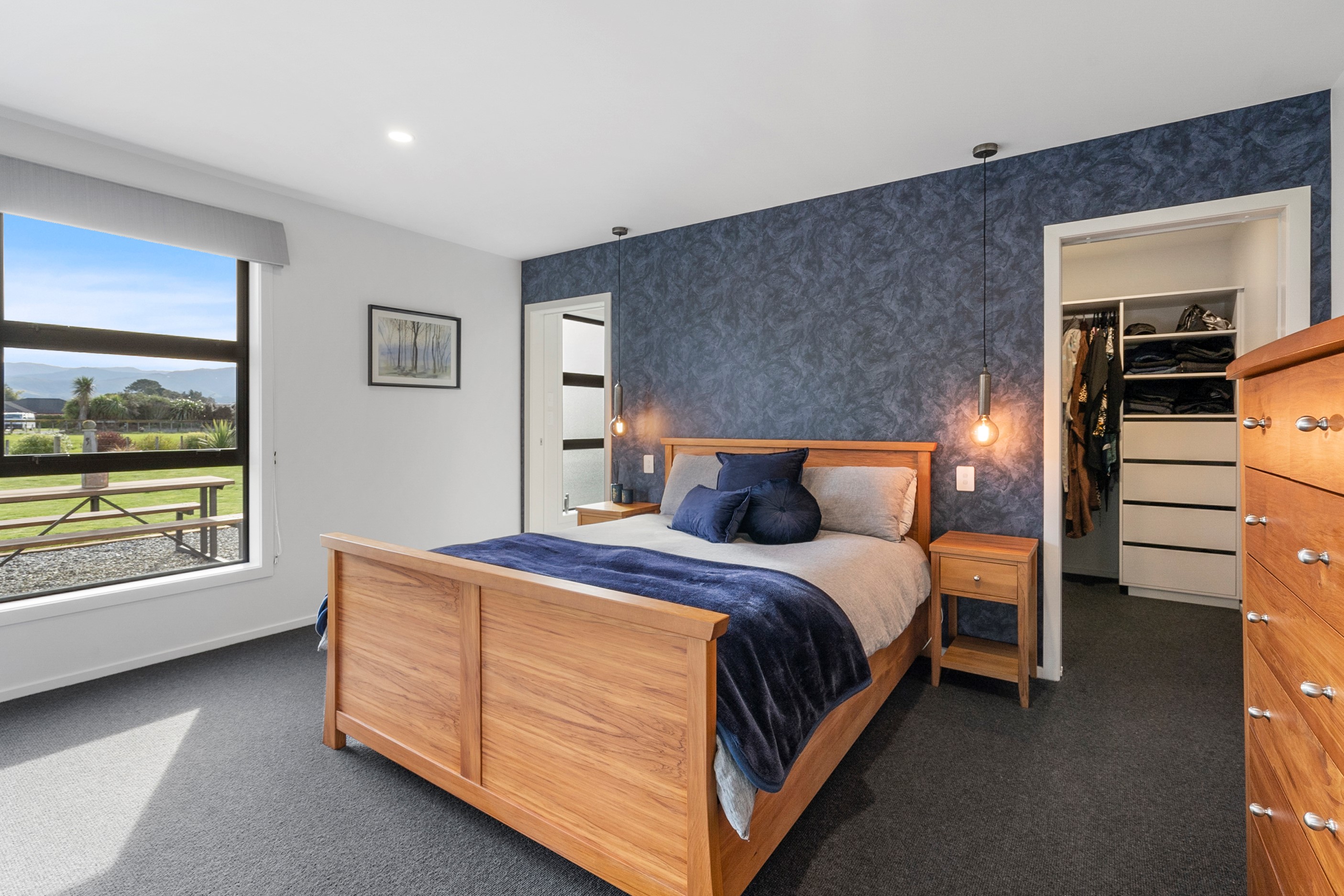 In the kitchen you’ll find an engineered stone benchtop, mirrored glass splashback and glossy cabinetry with high-tech hardware. A cathedral ceiling in the main living room and large sliding doors to the outdoor living area give a sense of grandeur and space. Once you’re outside, the feeling is just as good. There’s a seamless indoor-outdoor flow from the living area and views of the Tararua Range.