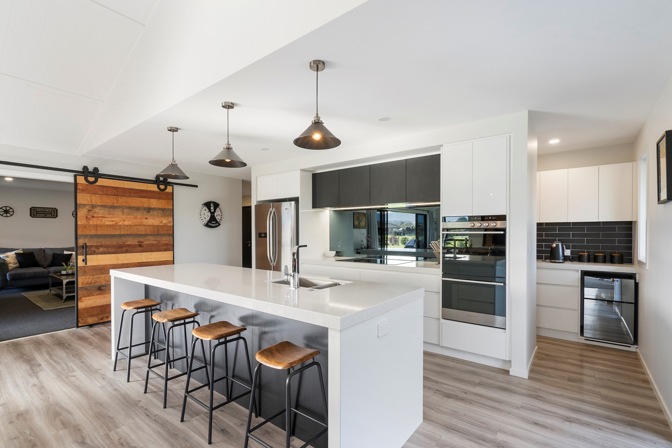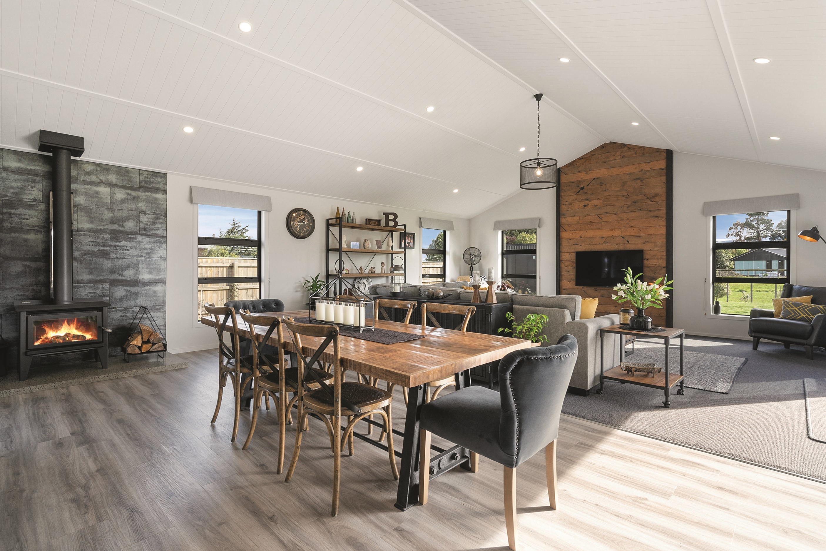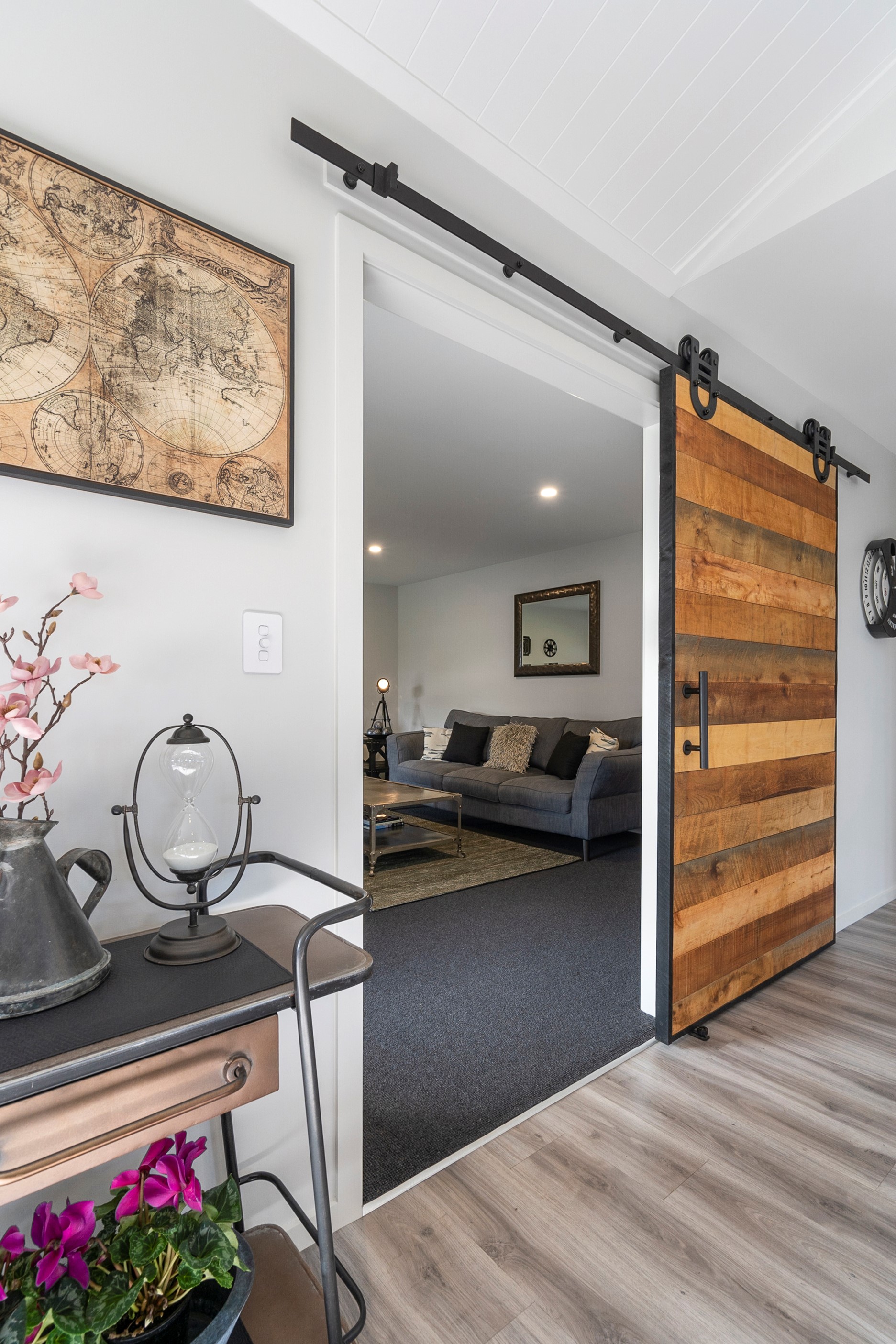 Modern living meets industrial style in this Wairarapa home. Add a measure of rustic flair, and you end up with this outstanding property. Cedar cladding on the interior makes a statement as you enter the 264sqm house. The rough-sawn timber is repeated in a feature wall in the living area and in the barn-style door of the media room.