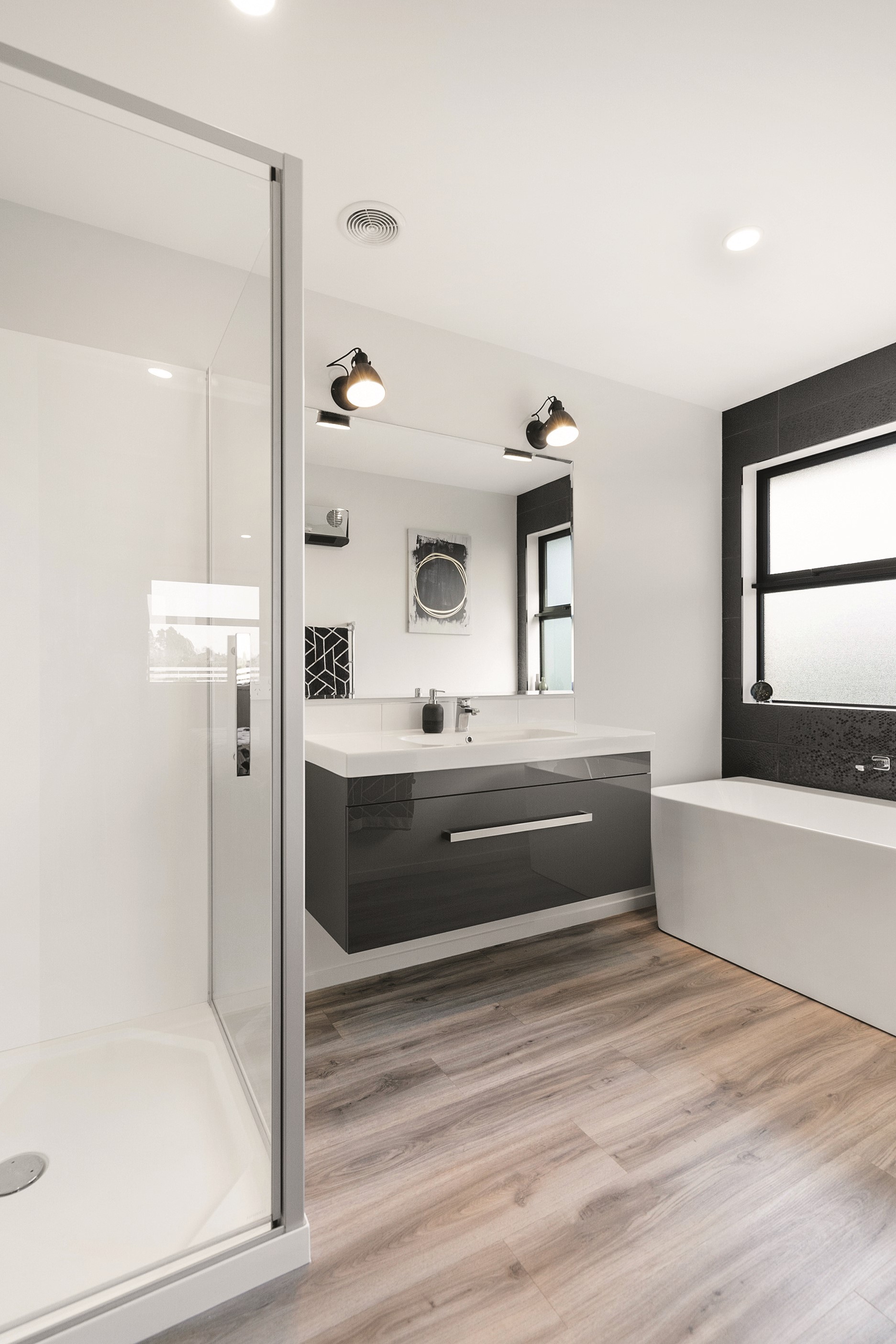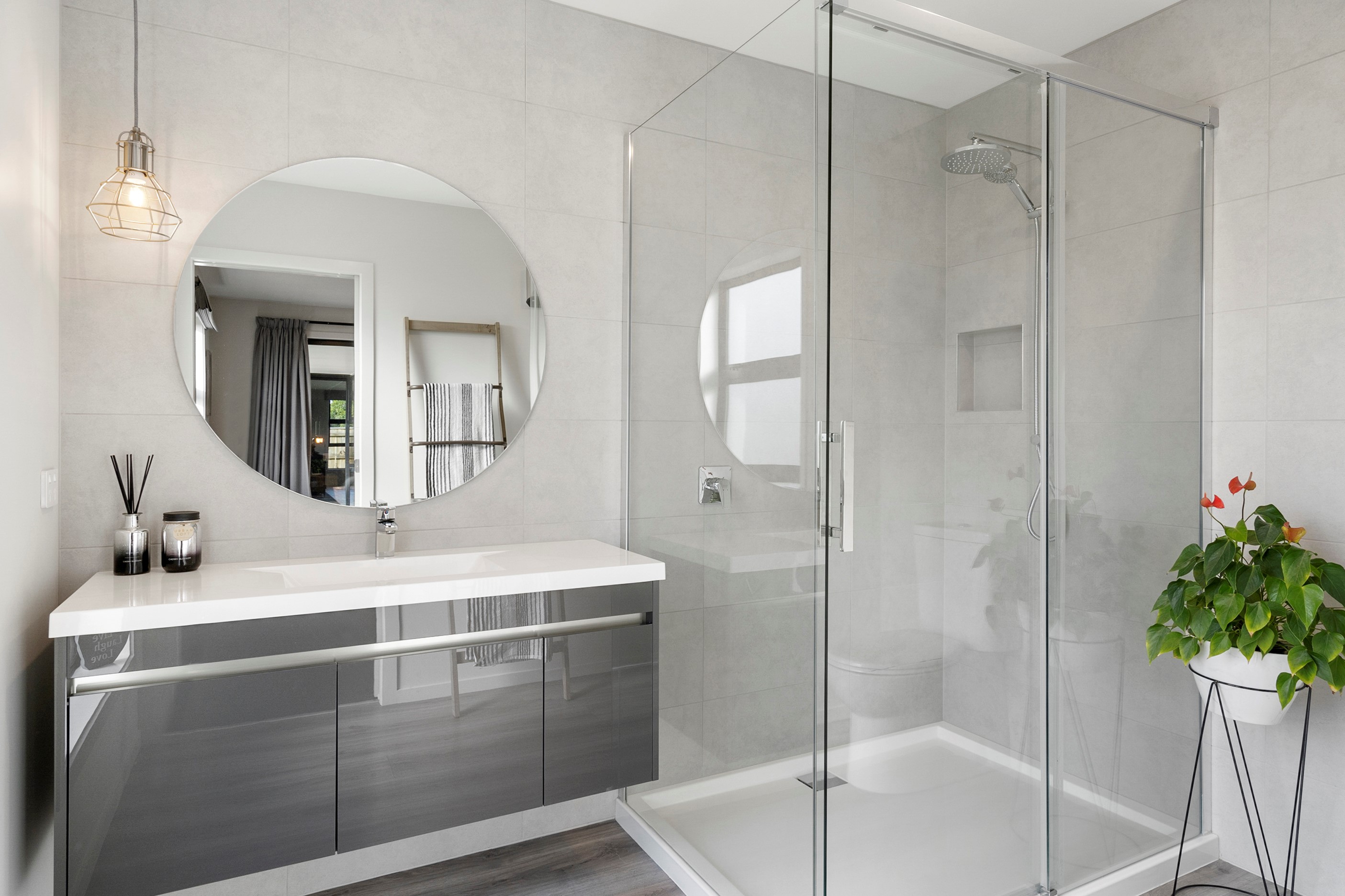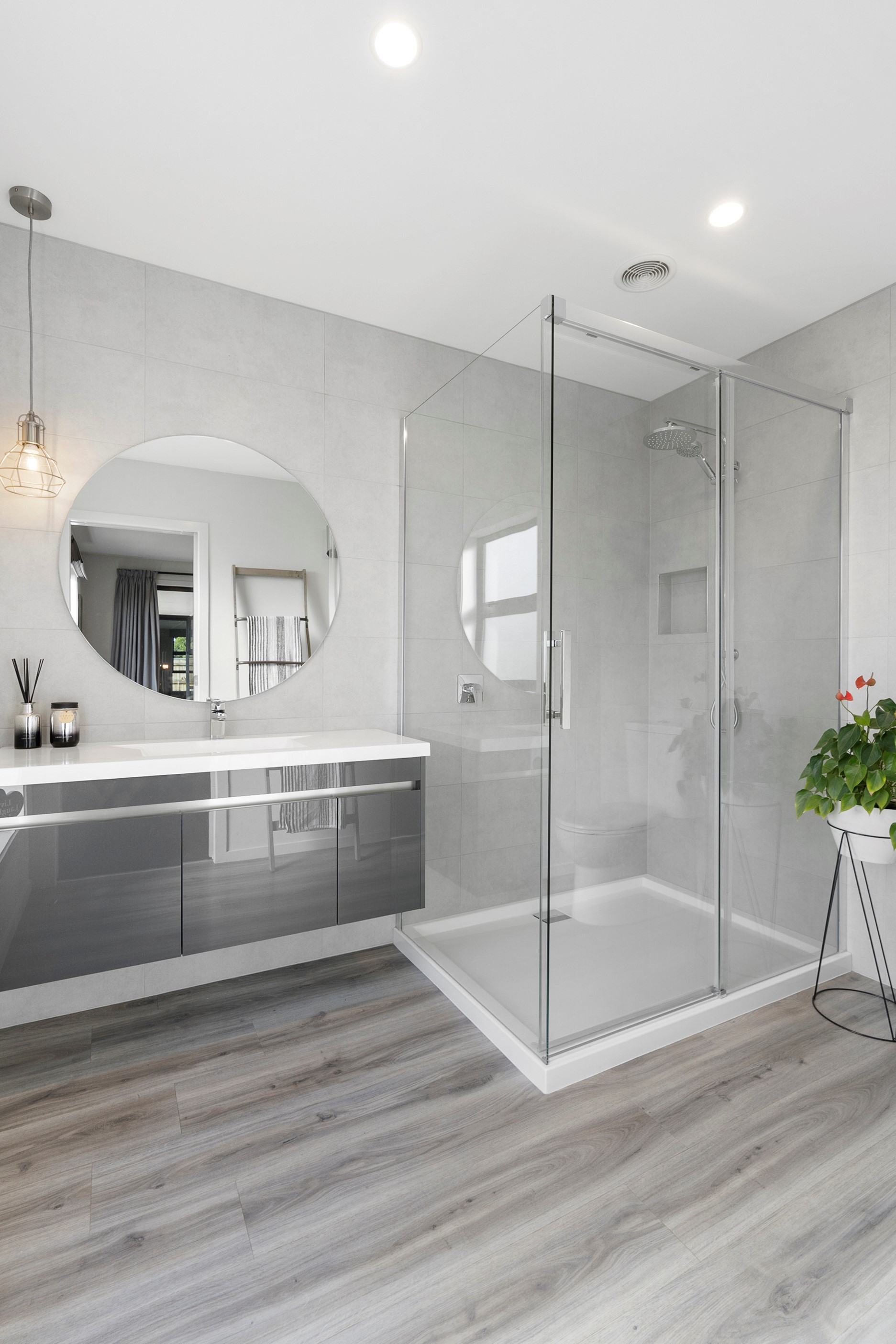 The bedroom wing consists of four bedrooms and two bathrooms. The latter are in keeping with the modern-industrial theme throughout the home. Tiles on the walls, Athena Motio showers, Athena Sirocco vanities in black gloss and large, round mirrors do the trick.