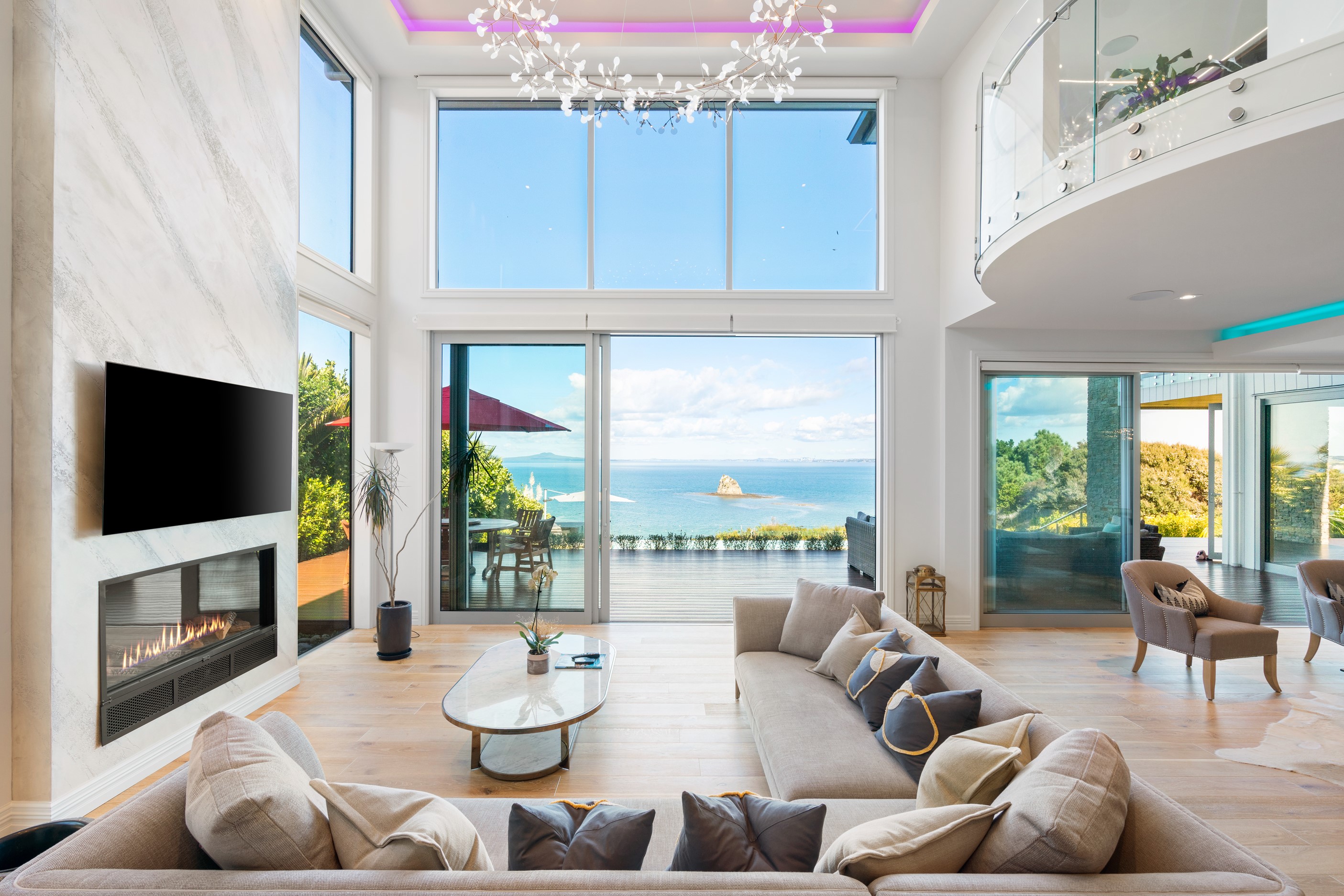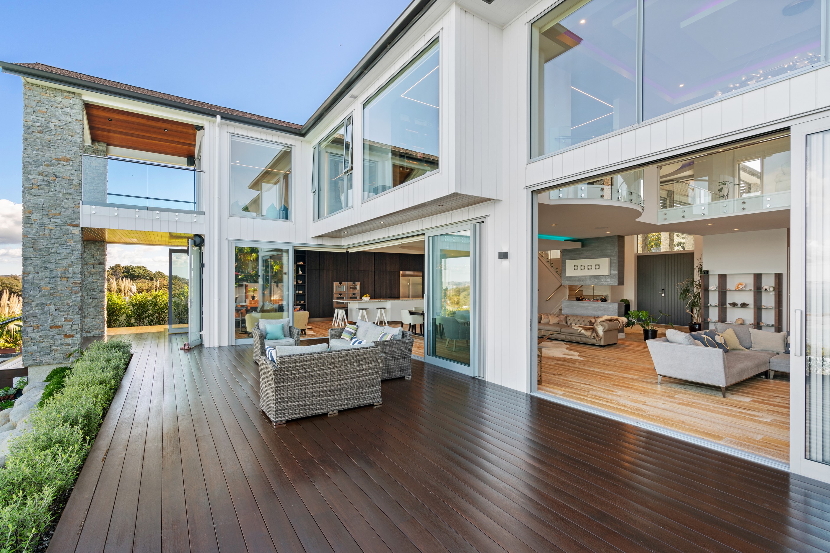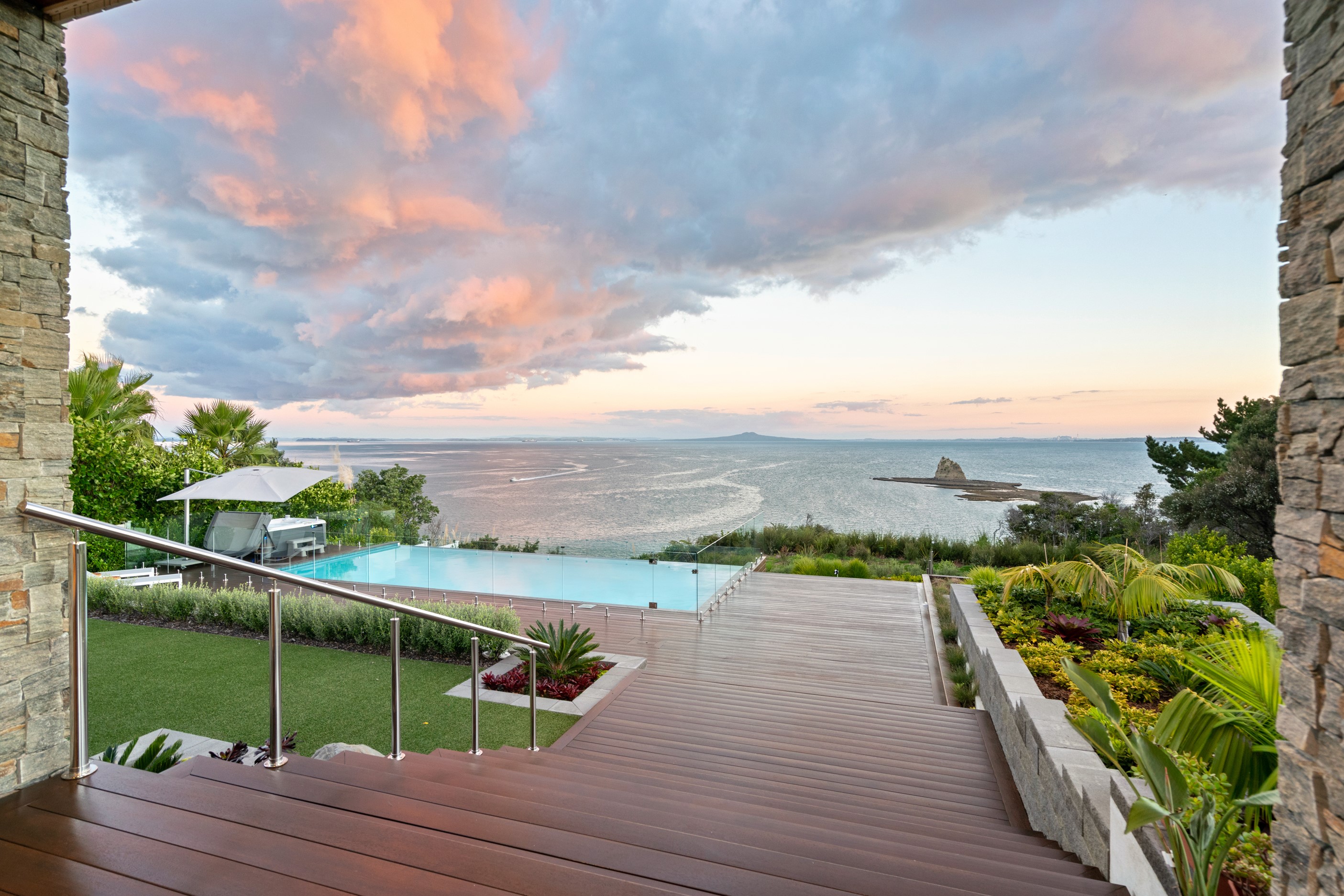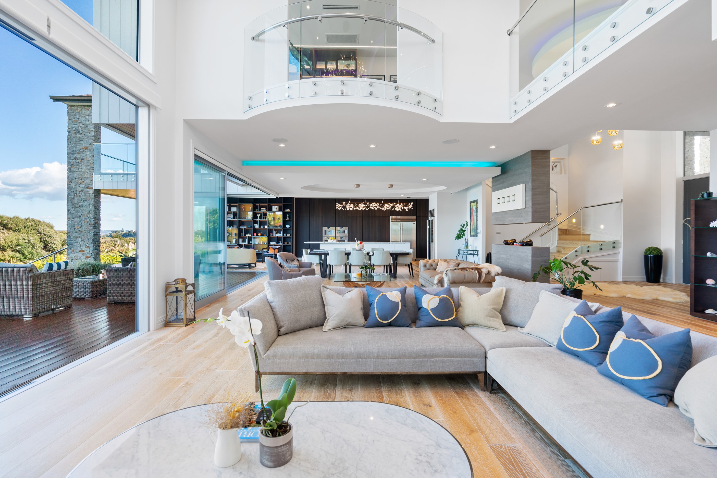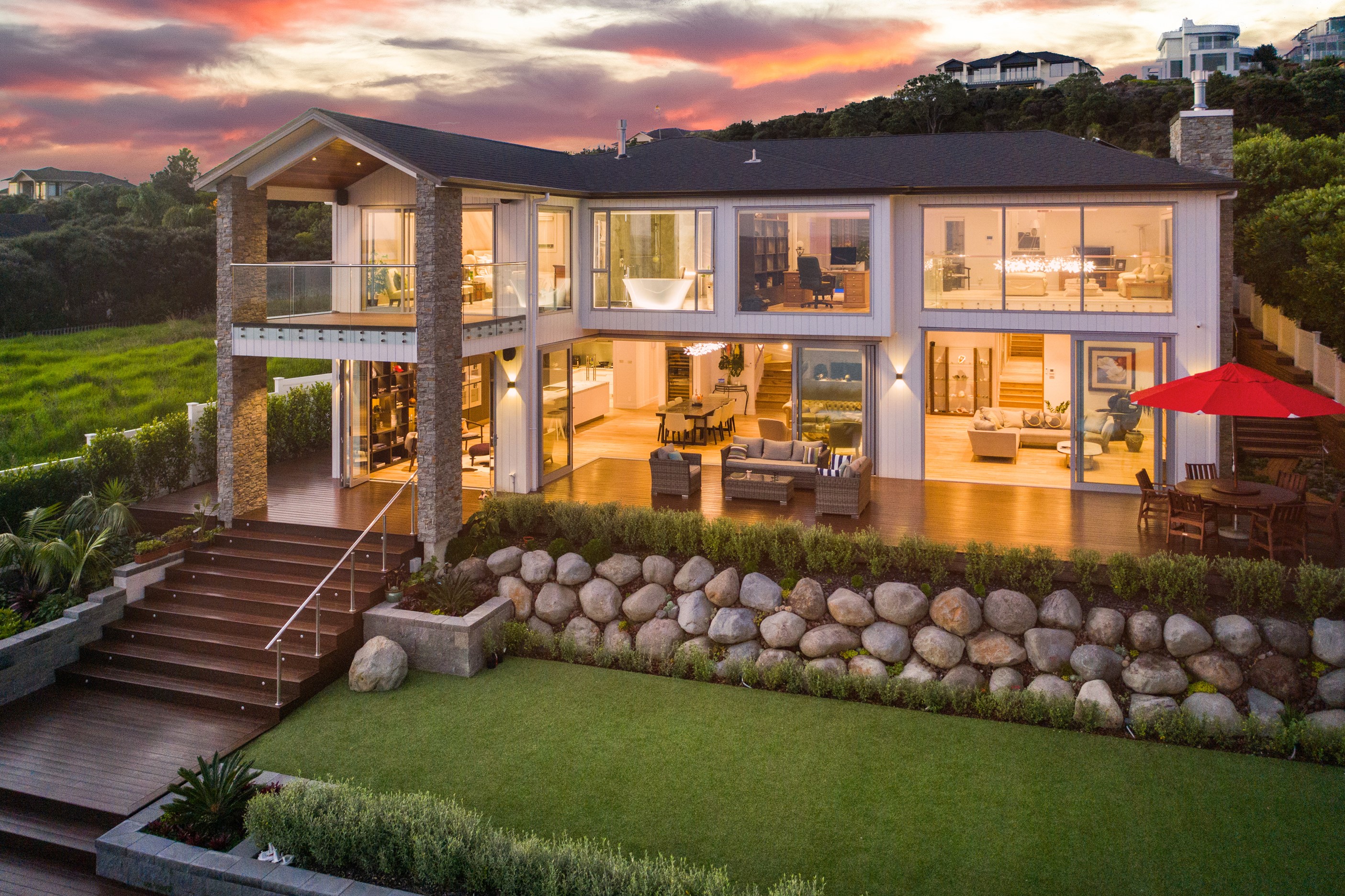 Here’s a builder’s home that’s a big deal. The 574sqm house sits on a 1749sqm Whangaparāoa Peninsula site that takes in sweeping views of the Hauraki Gulf. They’re not the only aspects of the property that are next-level. Luxury, opulence and top-notch craftsmanship are evident everywhere in this coastal estate. The sense of grandeur starts at the gate and carries on through the house with its four bedrooms, four-and-a-half bathrooms and five lounges. It continues out to spacious decks and an infinity pool with those vistas. The covered walkway to the entrance has a shiplap cedar ceiling and schist-clad columns. It’s a combination that’s repeated around the property and provides cohesion. Inside, special touches abound: designer lighting, a home cinema, marble-tile bathrooms, a soaring atrium with mezzanine and a walk-in wardrobe you could lose yourself in. Not to forget the mini-putting course between the house and pool. The undisputed stars, however, are the views – and this house has been cleverly designed to frame them from as many rooms as possible. You could say the builders have achieved a grand slam.