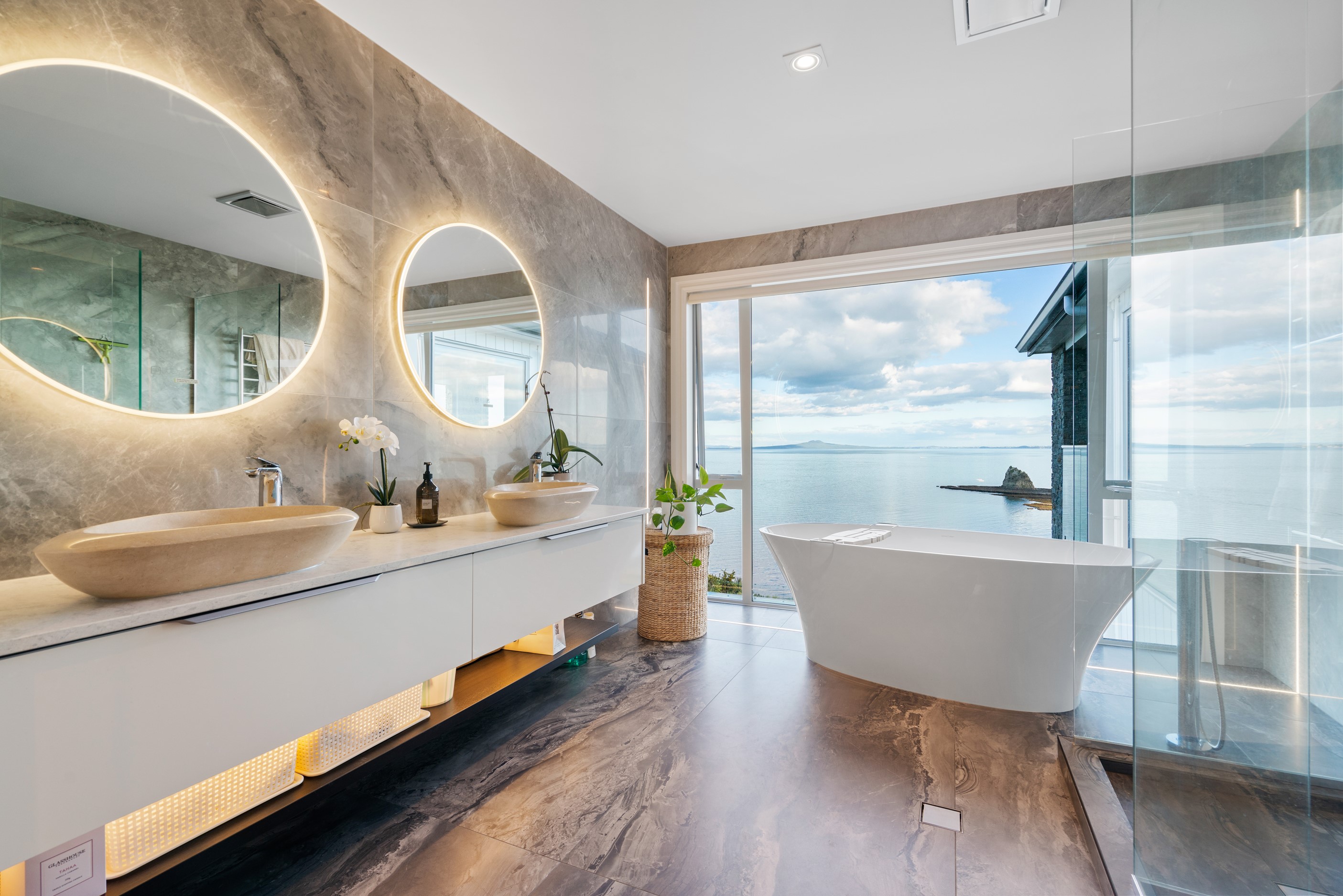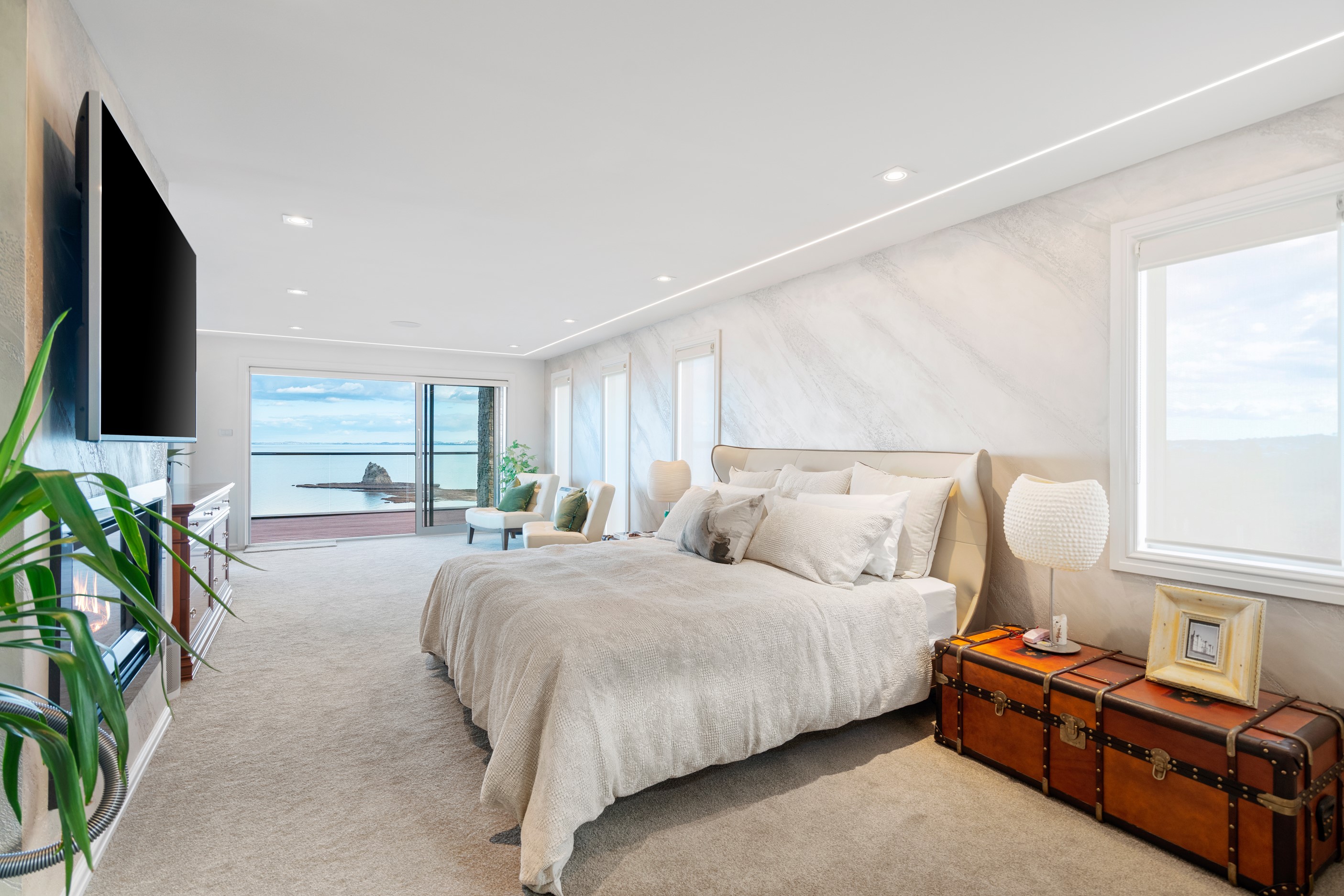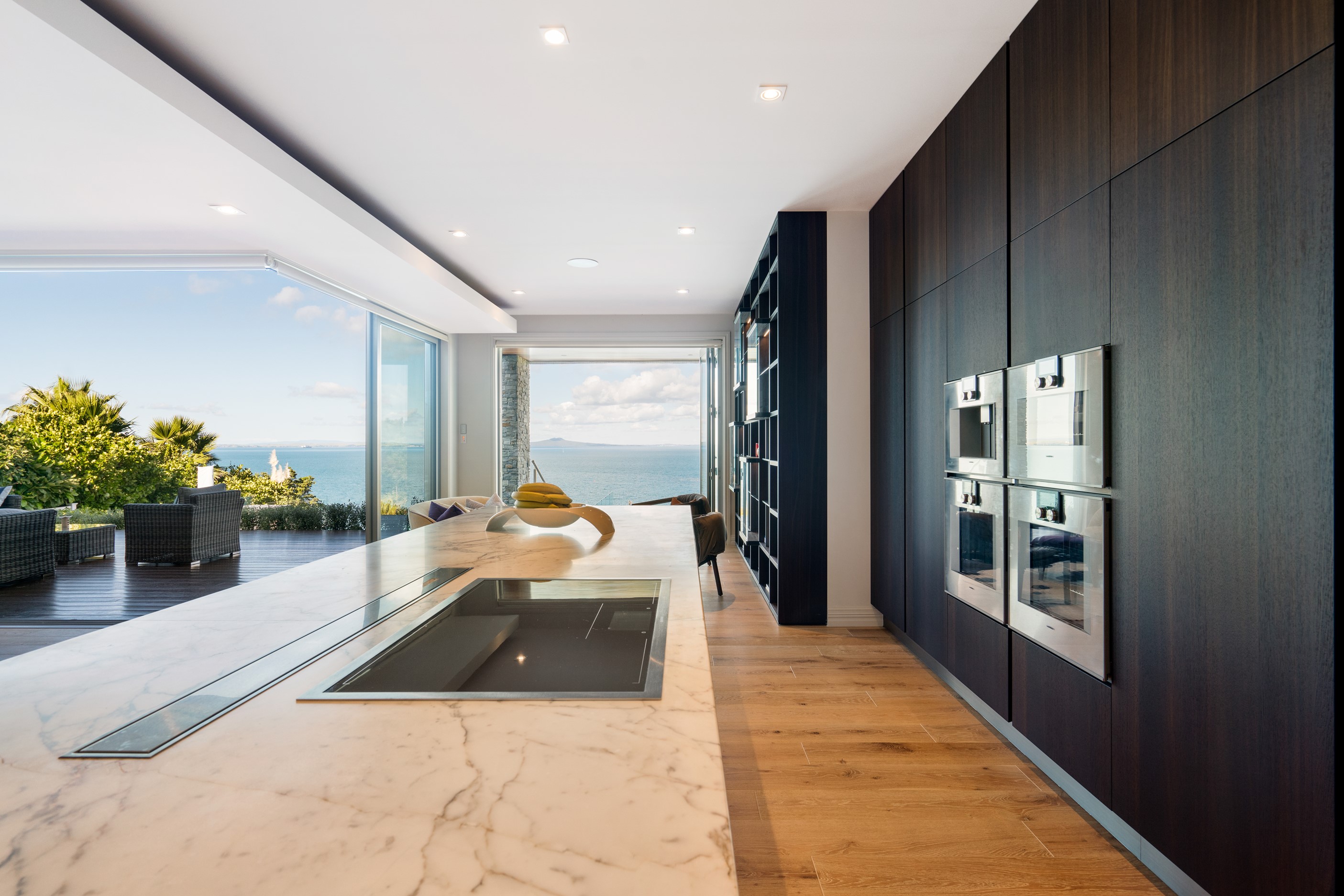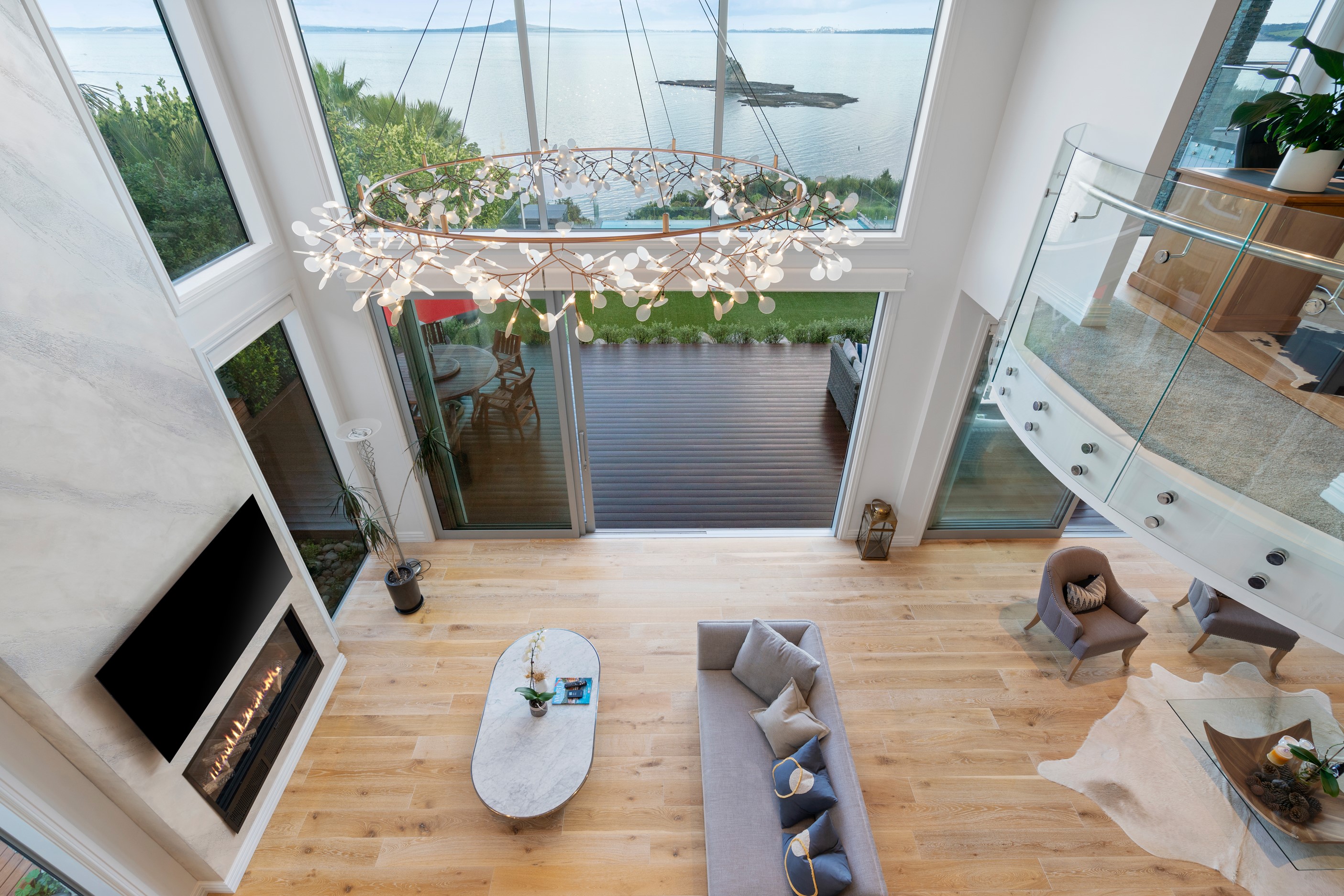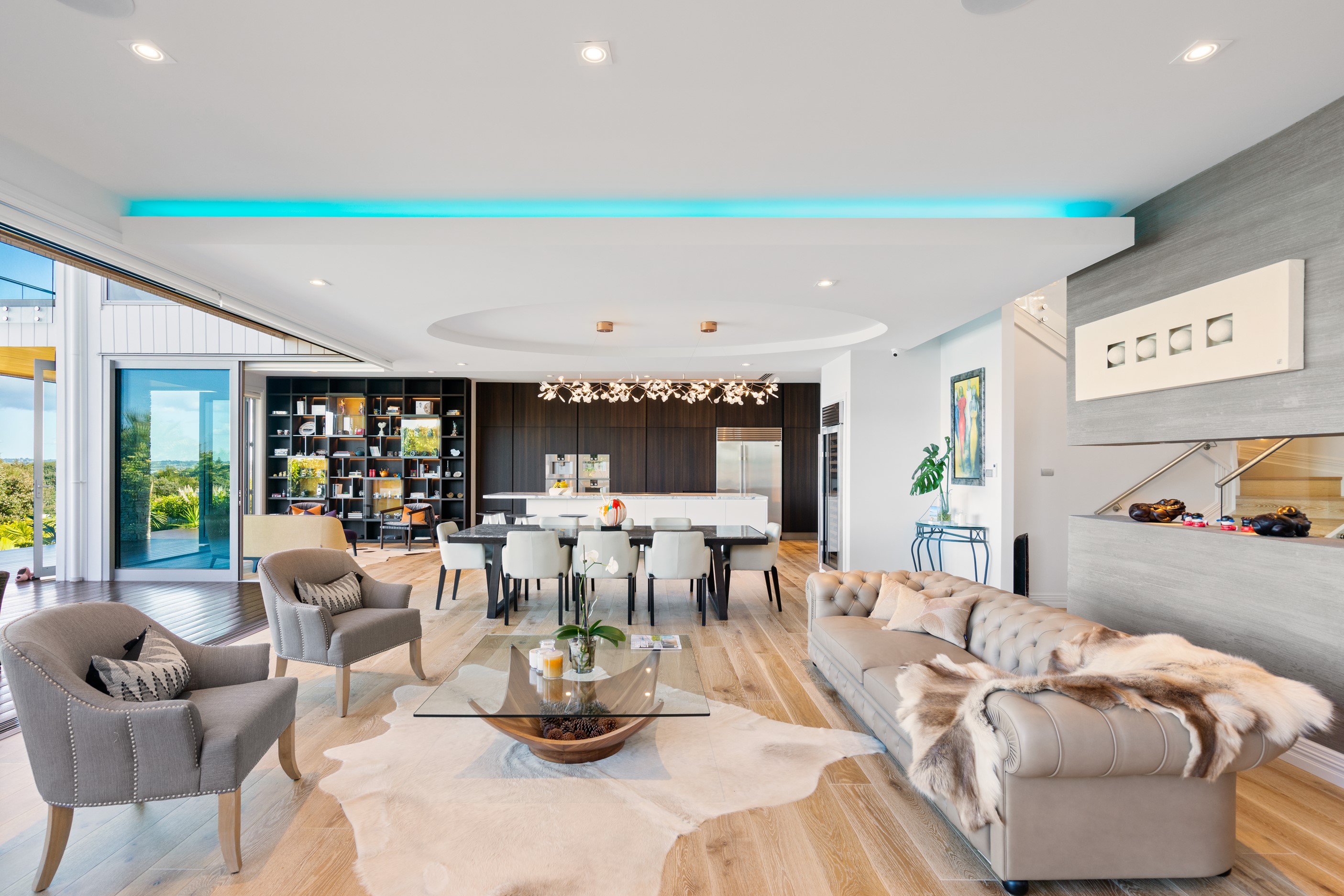 Here’s a builder’s home that’s a big deal. The 574sqm house sits on a 1749sqm Whangaparāoa Peninsula site that takes in sweeping views of the Hauraki Gulf. They’re not the only aspects of the property that are next-level. Luxury, opulence and top-notch craftsmanship are evident everywhere in this coastal estate. The sense of grandeur starts at the gate and carries on through the house with its four bedrooms, four-and-a-half bathrooms and five lounges. It continues out to spacious decks and an infinity pool with those vistas. The covered walkway to the entrance has a shiplap cedar ceiling and schist-clad columns. It’s a combination that’s repeated around the property and provides cohesion. Inside, special touches abound: designer lighting, a home cinema, marble-tile bathrooms, a soaring atrium with mezzanine and a walk-in wardrobe you could lose yourself in. Not to forget the mini-putting course between the house and pool. The undisputed stars, however, are the views – and this house has been cleverly designed to frame them from as many rooms as possible. You could say the builders have achieved a grand slam.